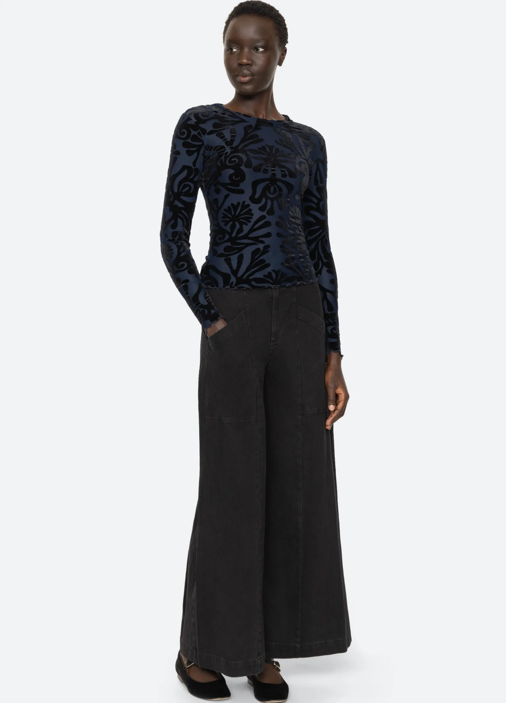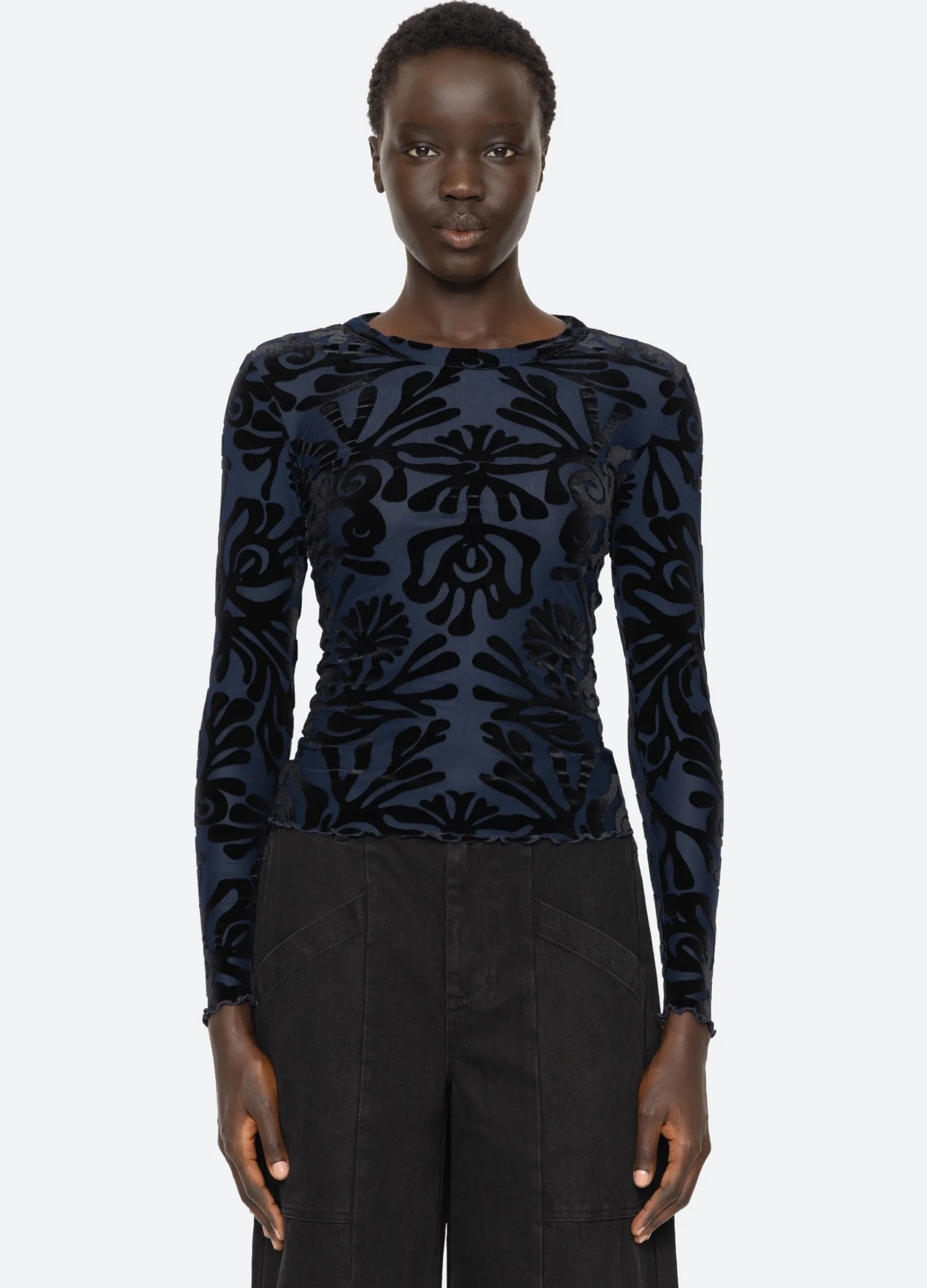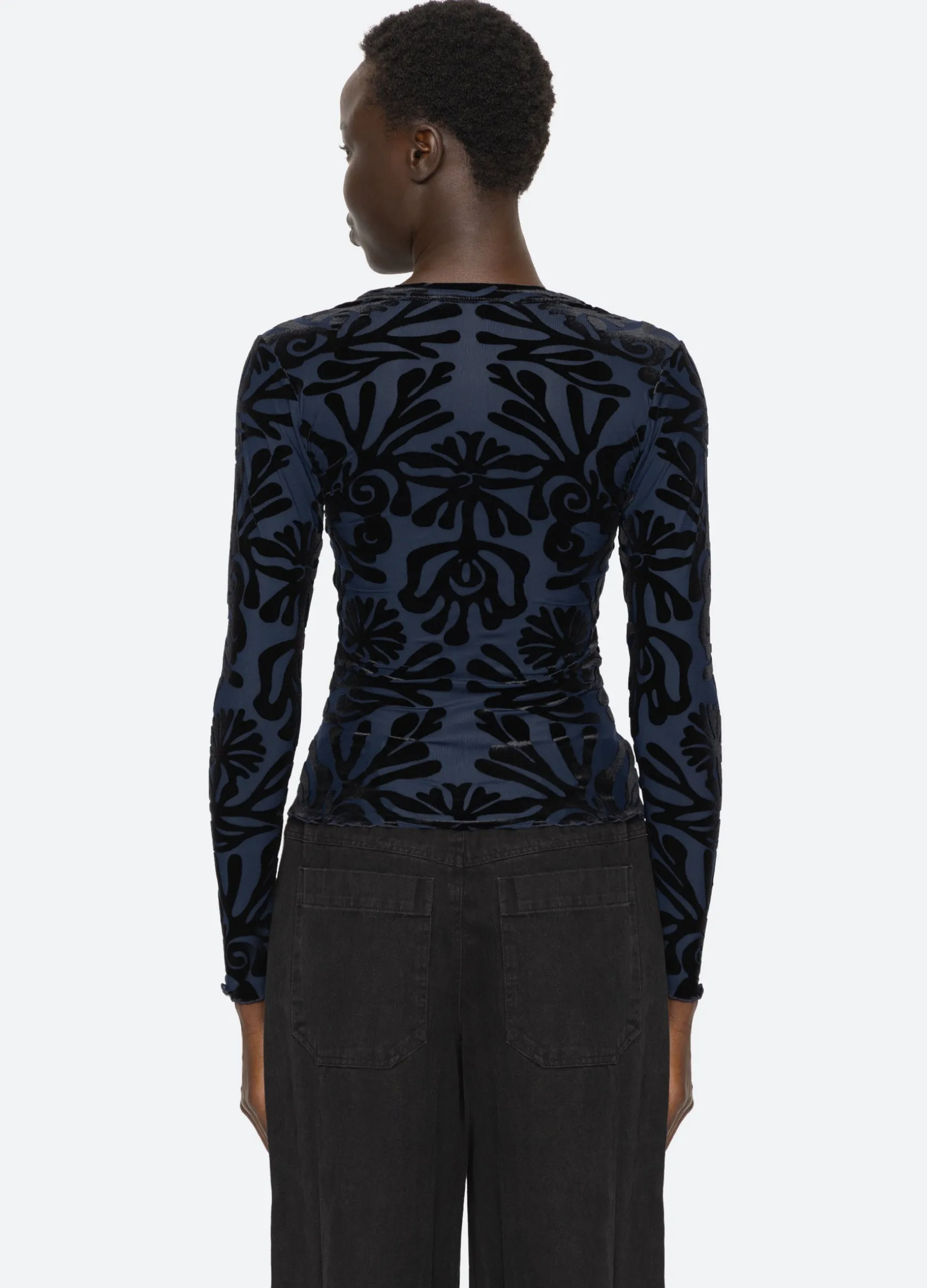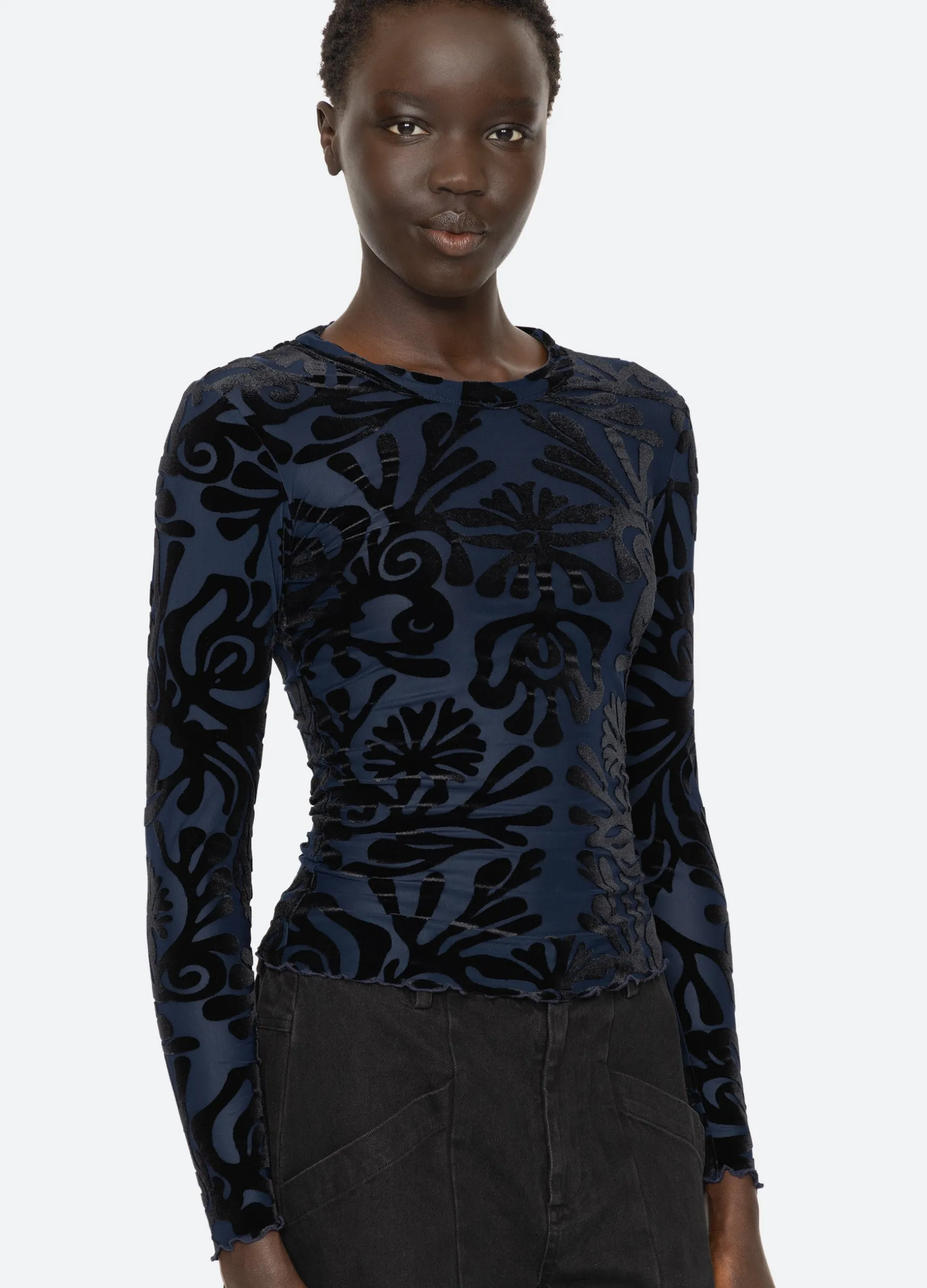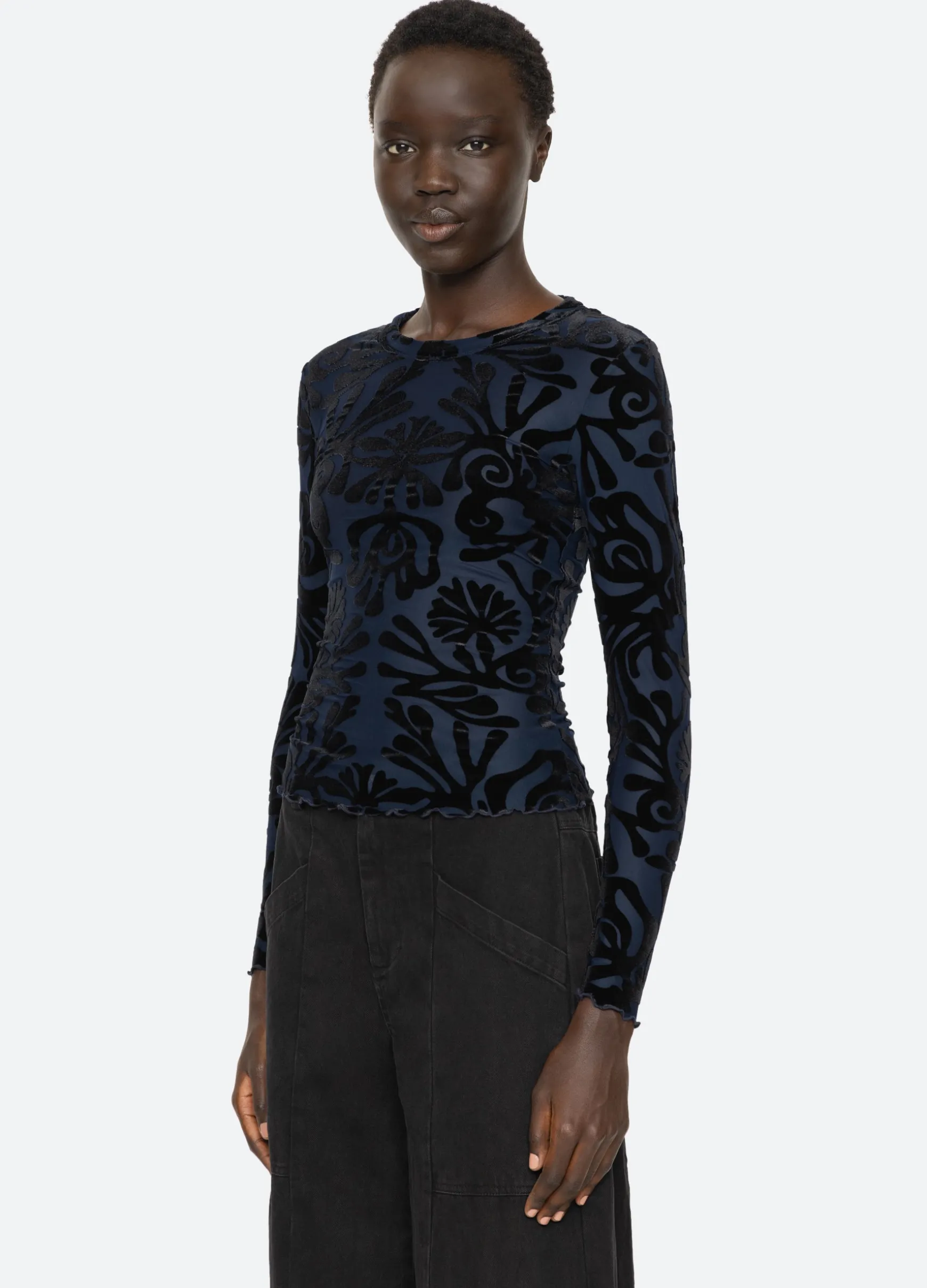 The Alia stretch velvet burnout long sleeve top features a slim fit and geometric design.