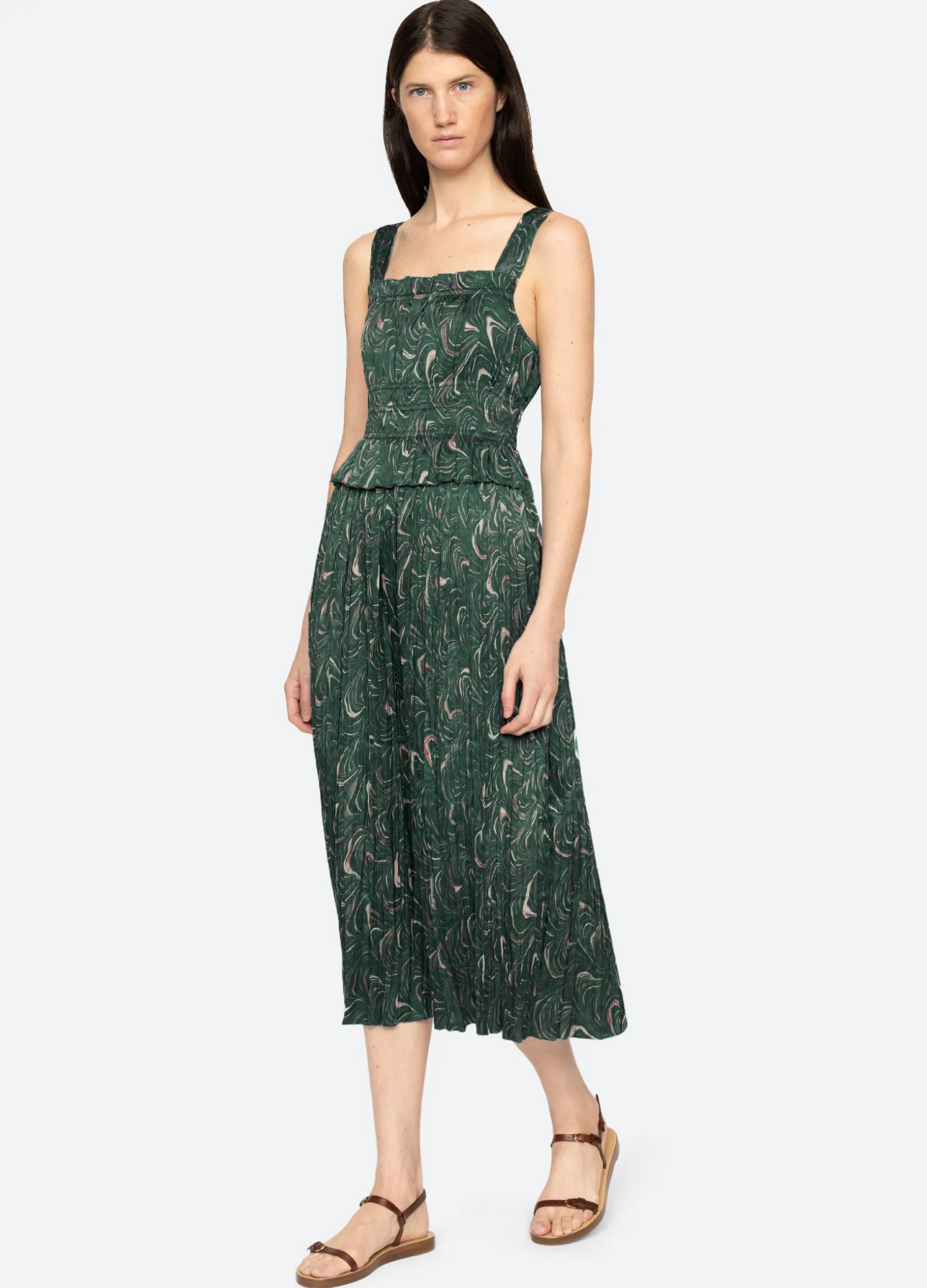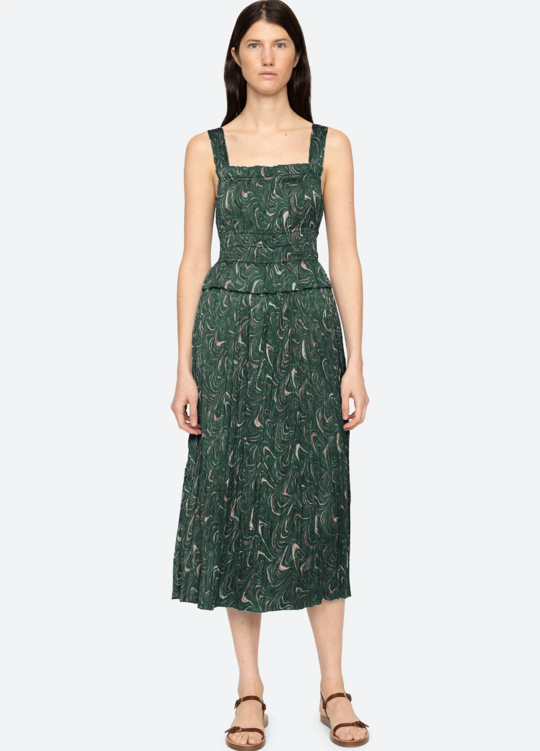 The Amara marble print ruched dress features a ruched bodice and a midi silhouette.
