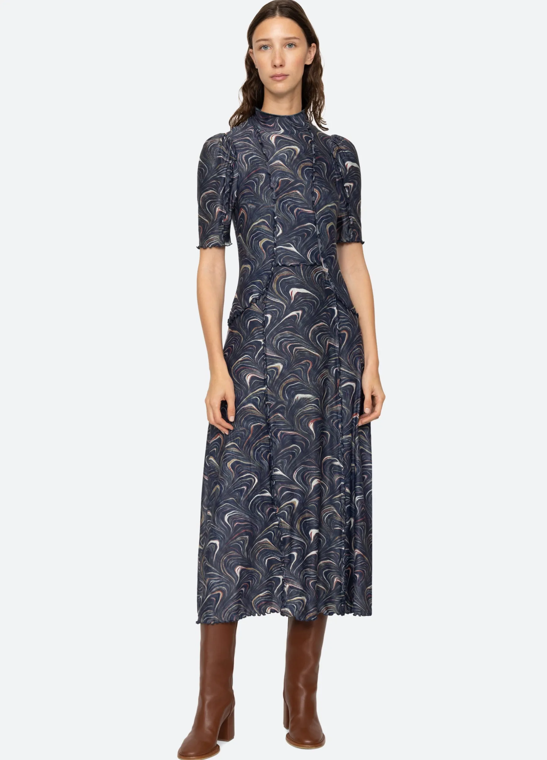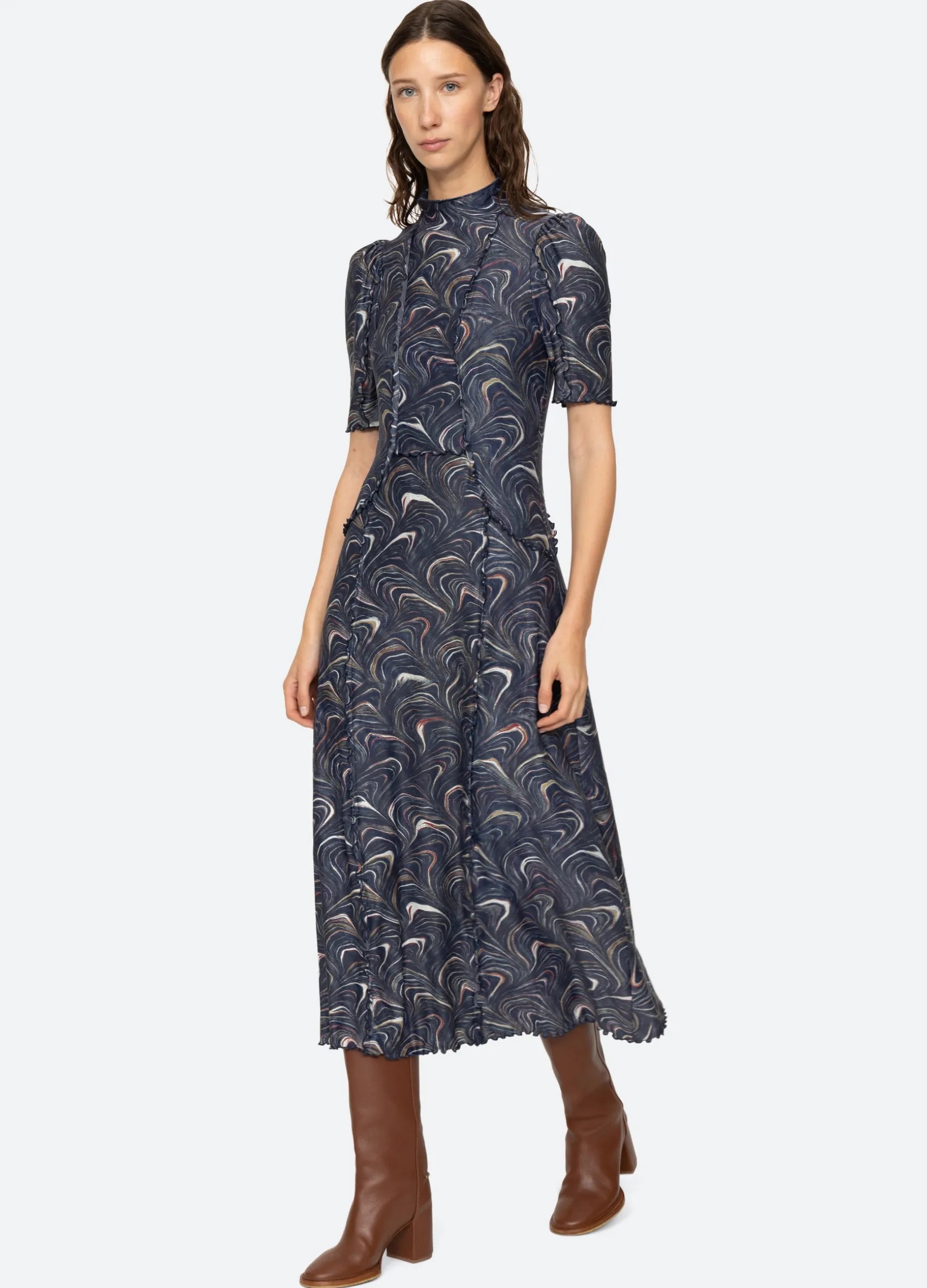 The Amara marble print short sleeve dress features ruffle detailing and midi silhouette.