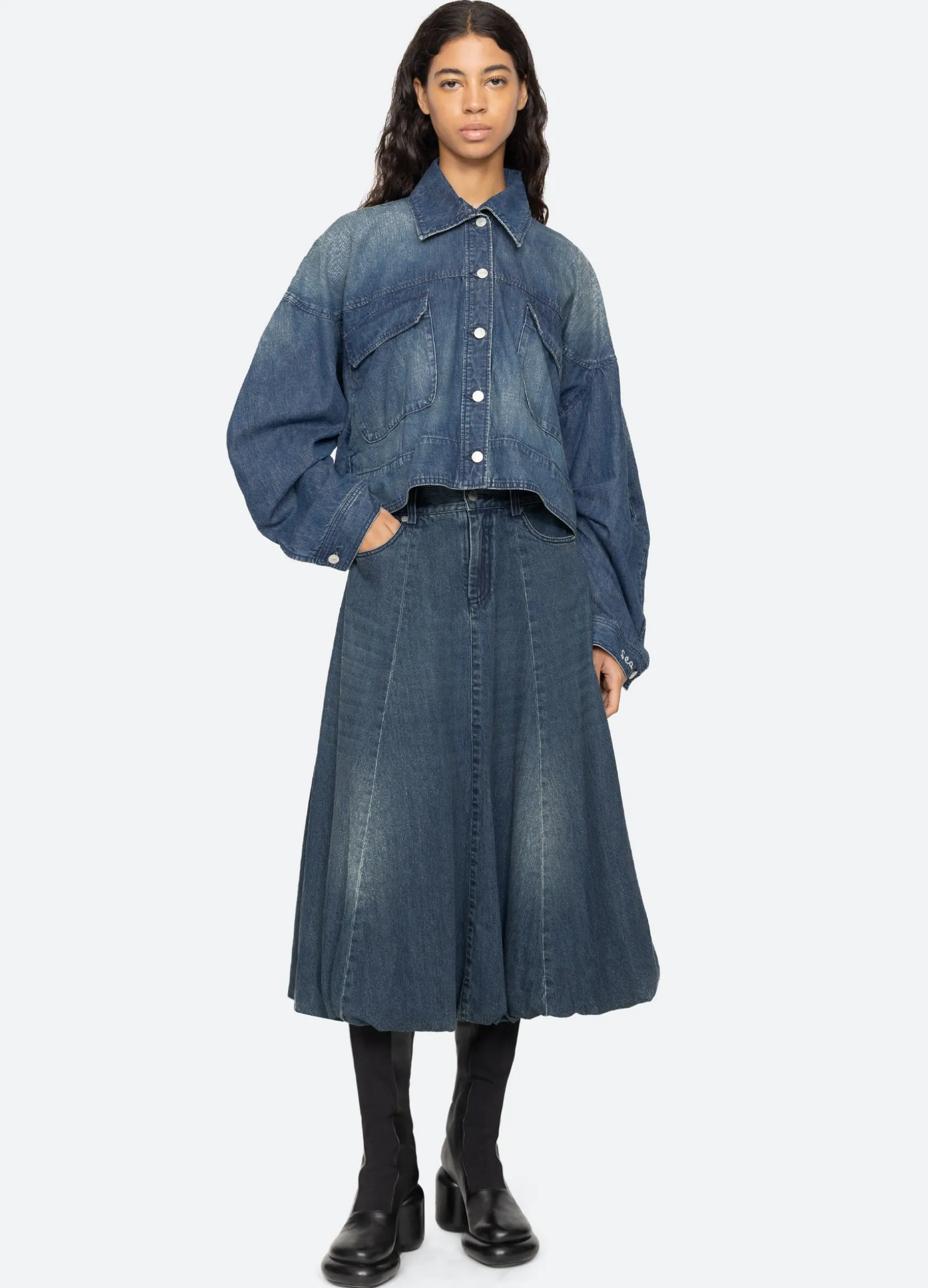 The Amari denim bubble skirt features a voluminous bubble hem, elasticized back and embroidered ‘Sea logo’ on the back pocket.