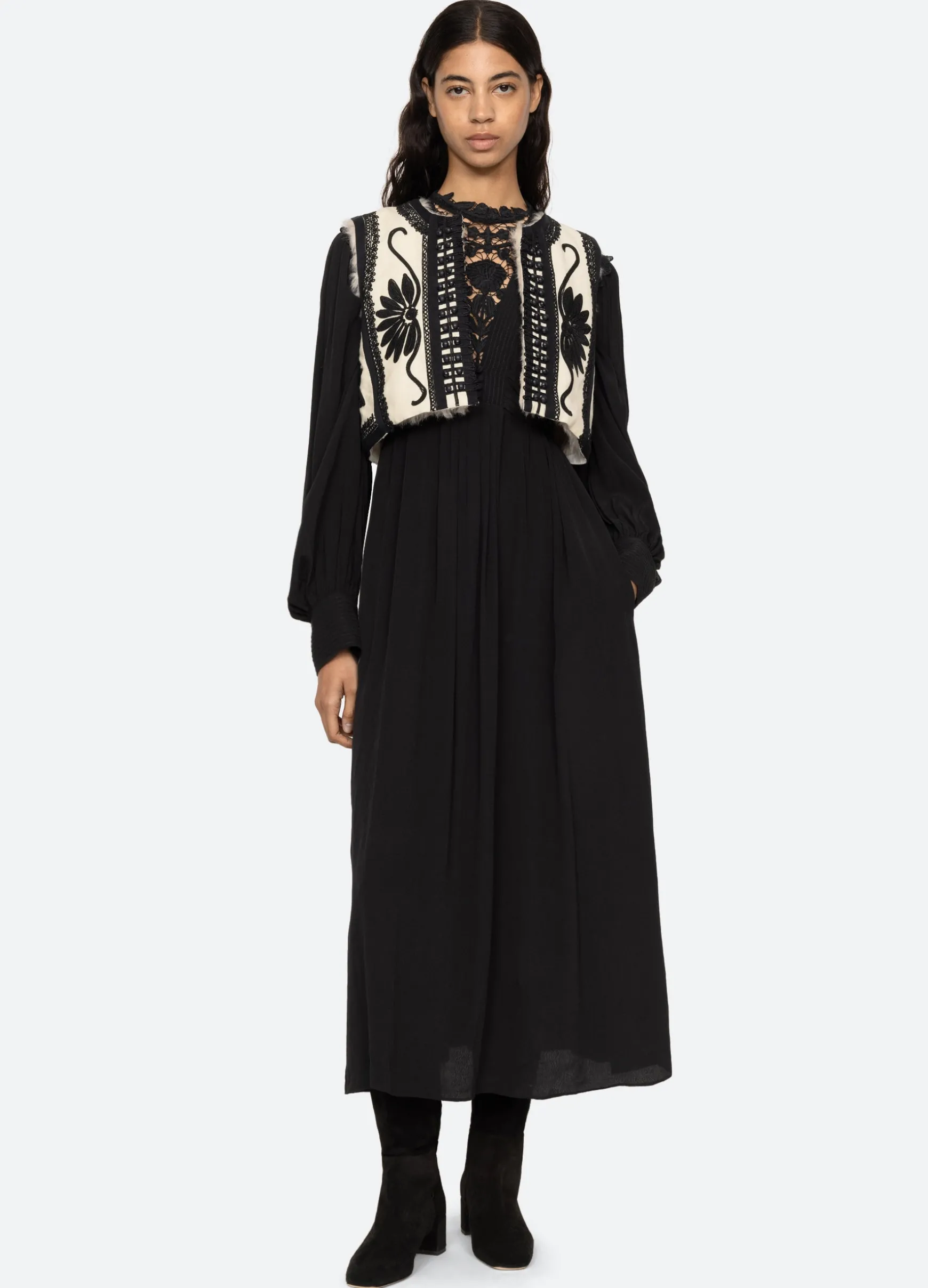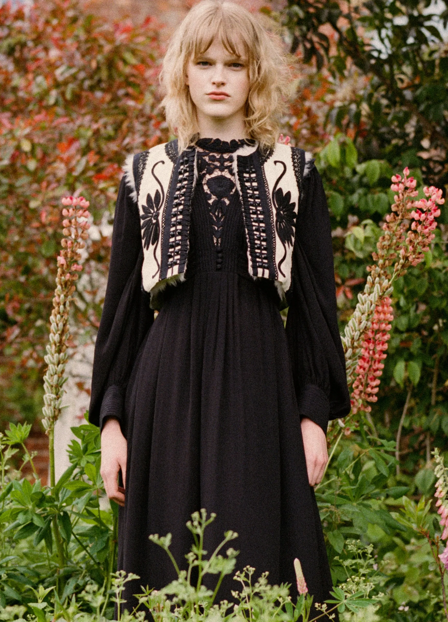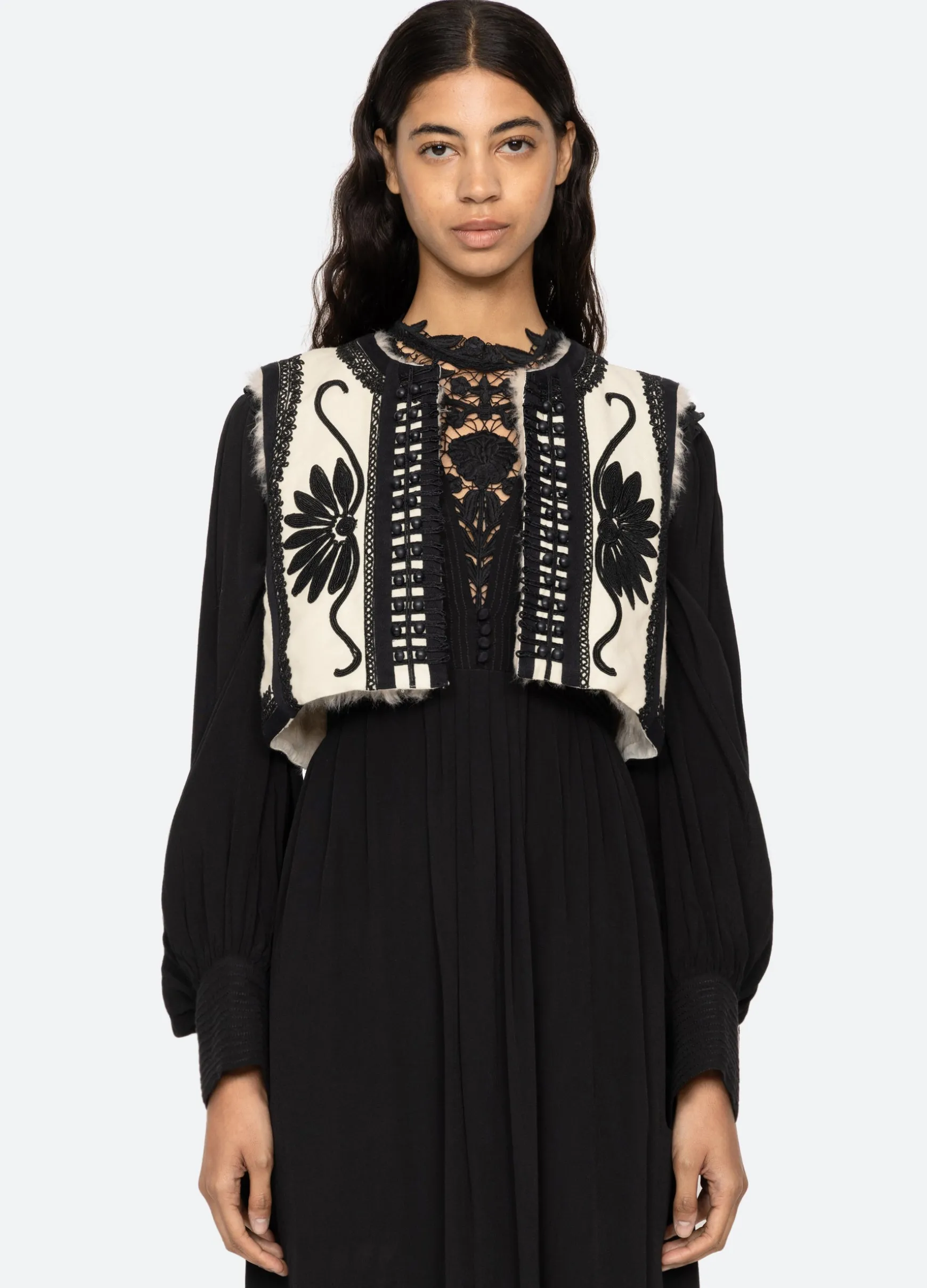 The Ambrose soutache vest features detailed embroidery throughout, cropped silhouette, and faux fur lining.