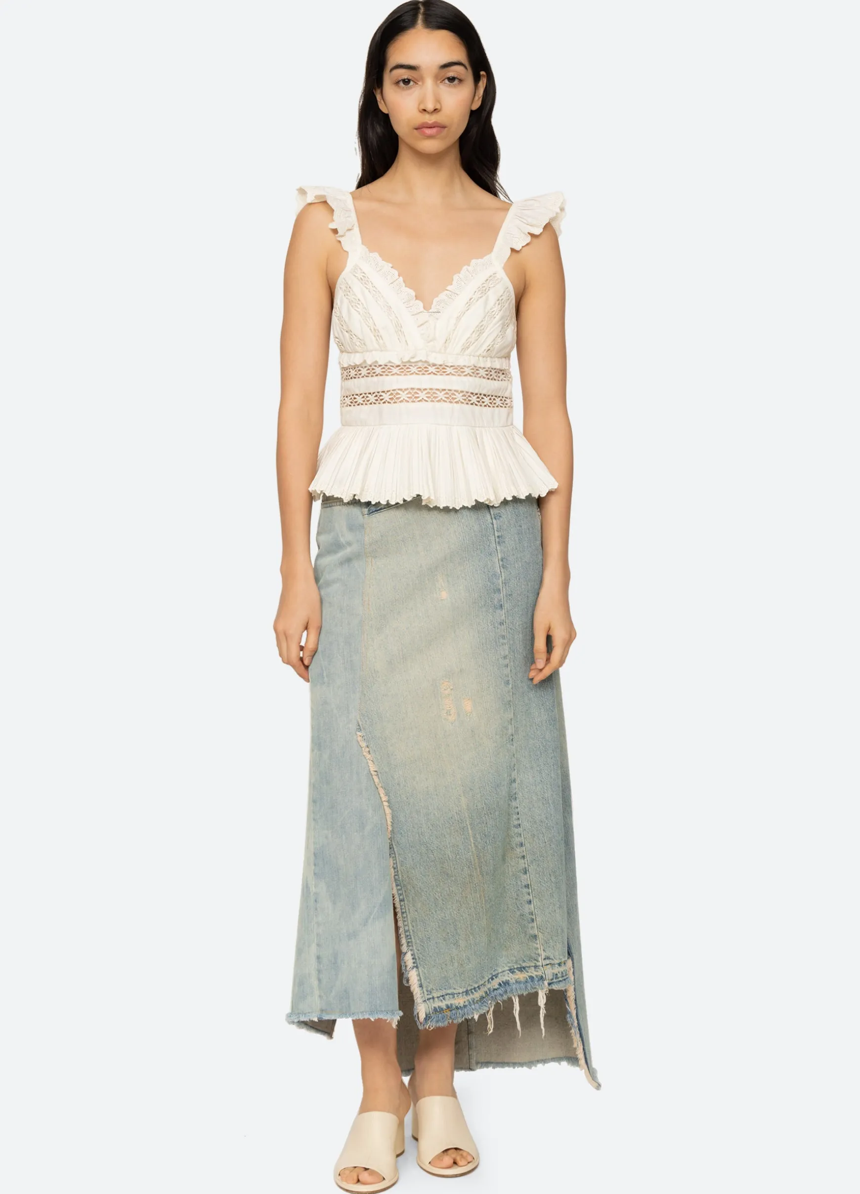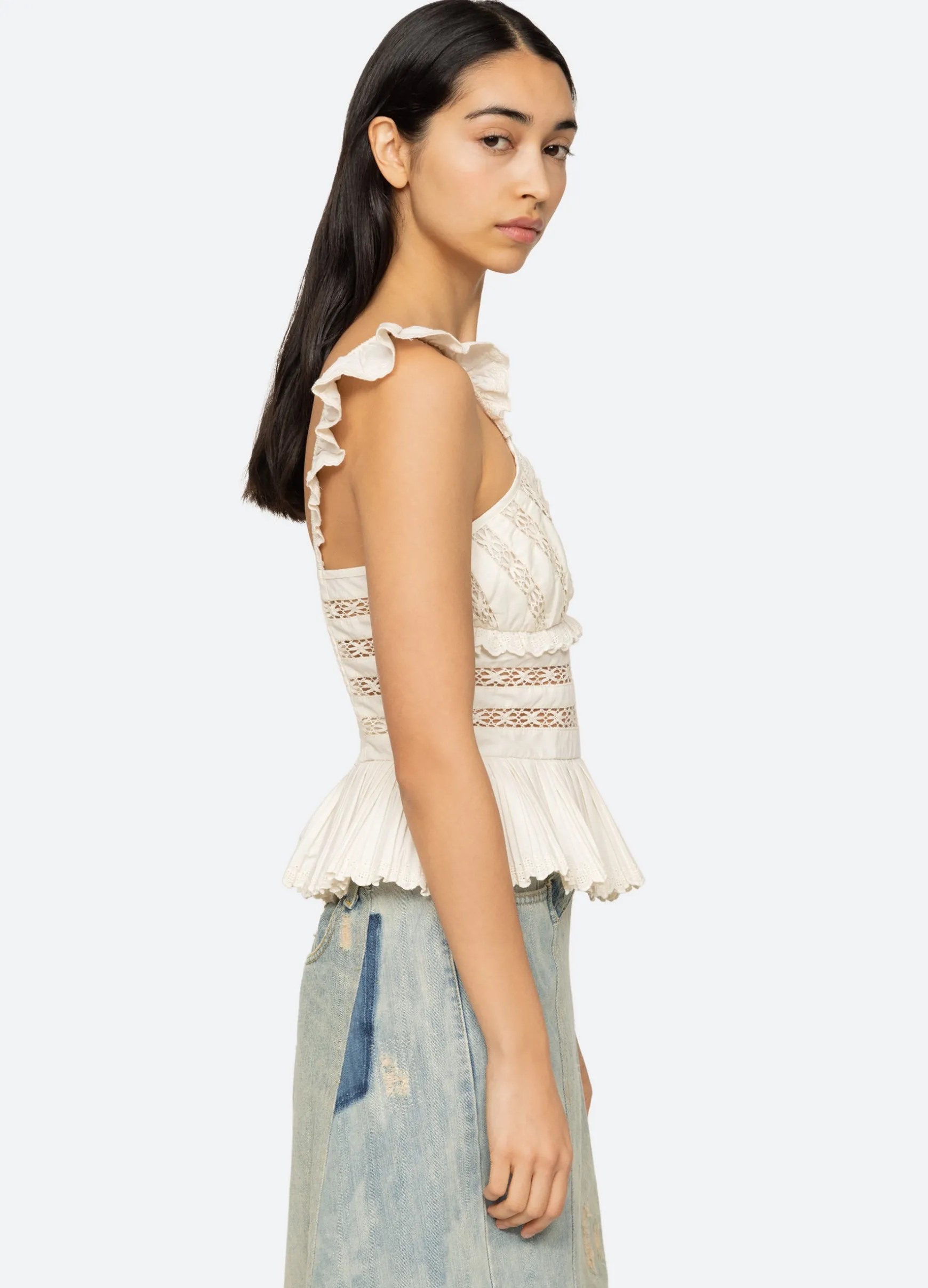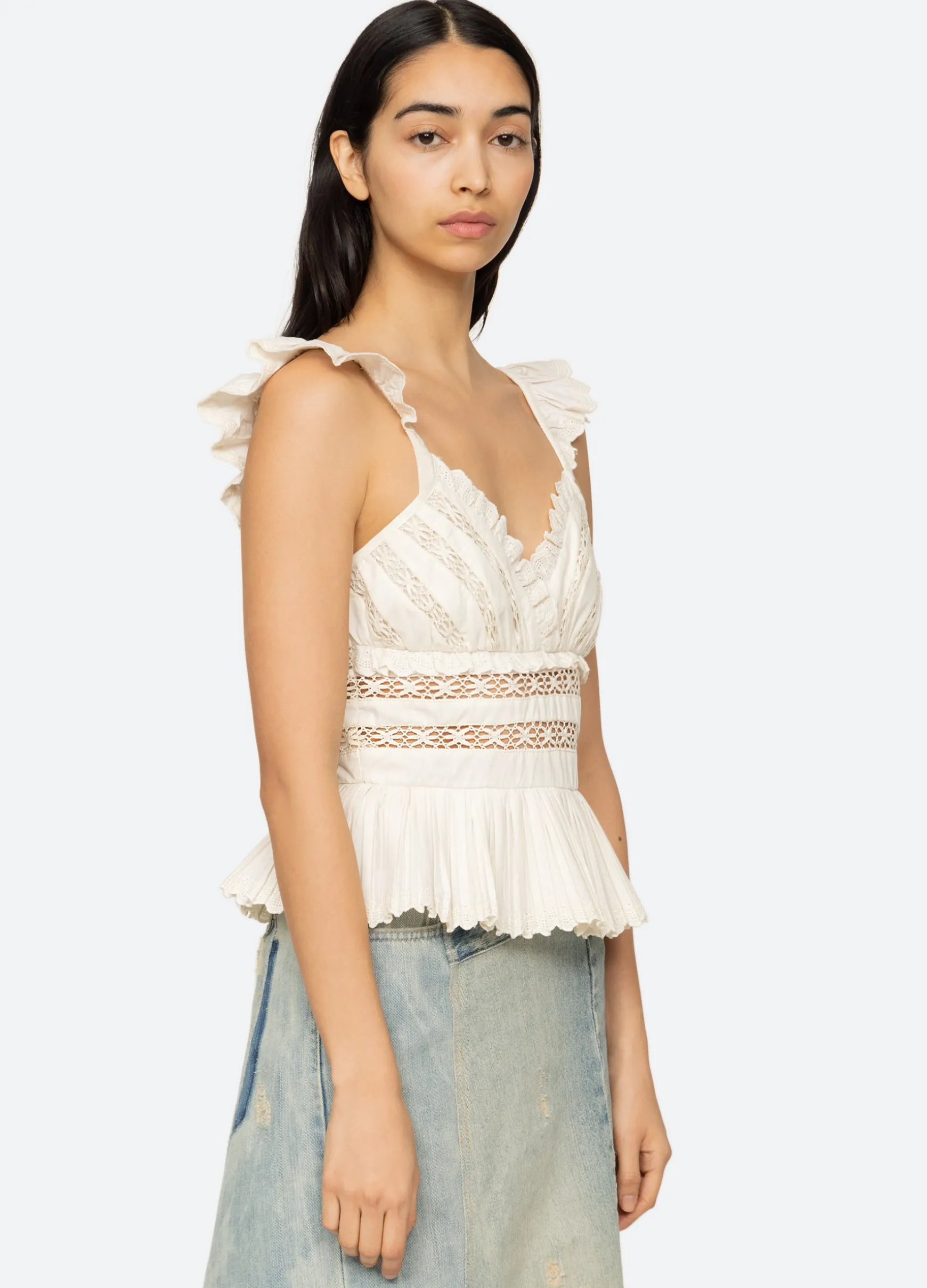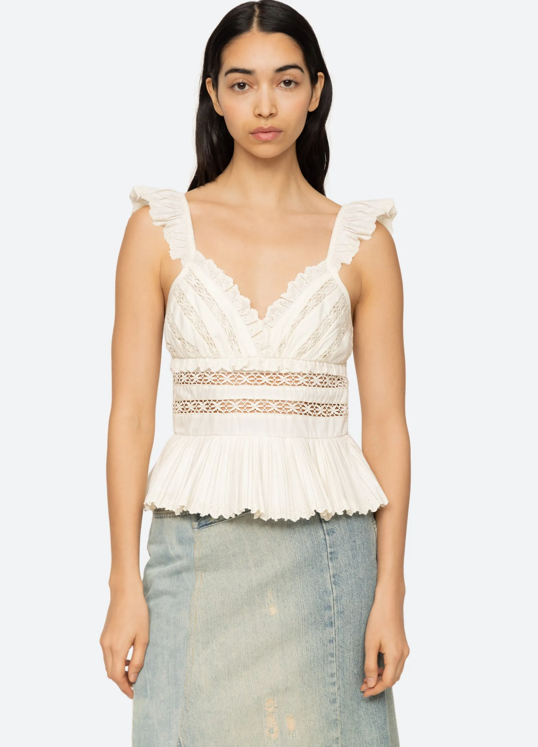 TheAntonina tank top features flutter sleeves, lace inserts, ruffle detailing and pleated trimhem.