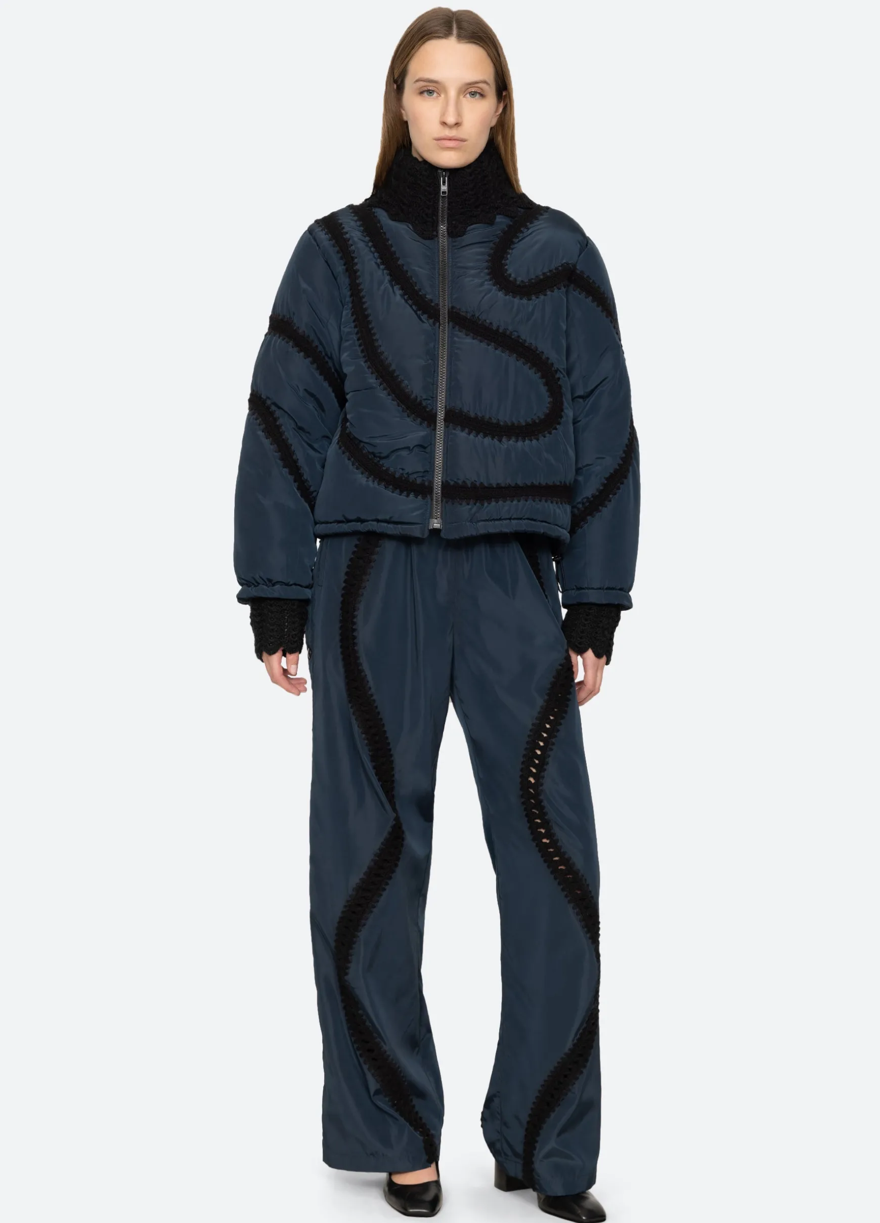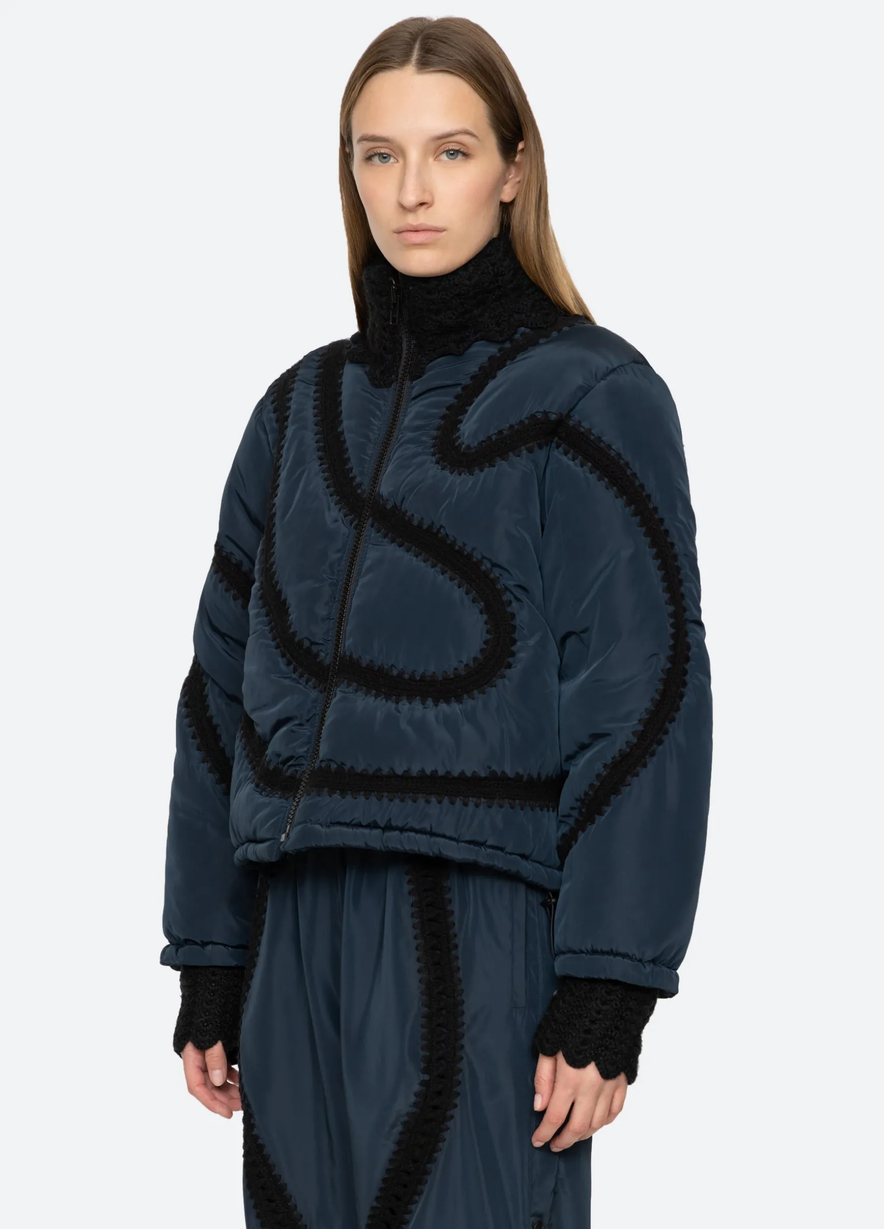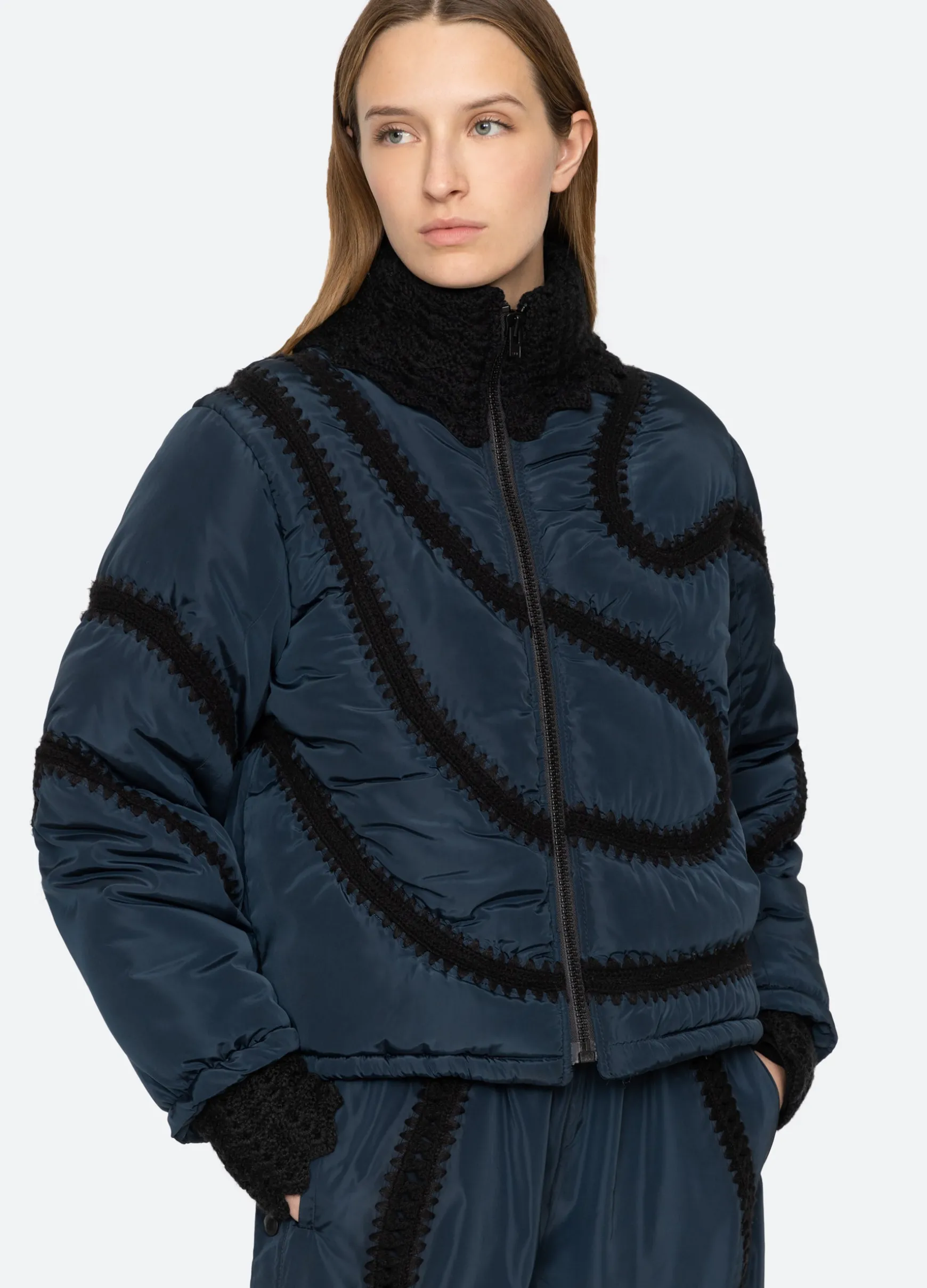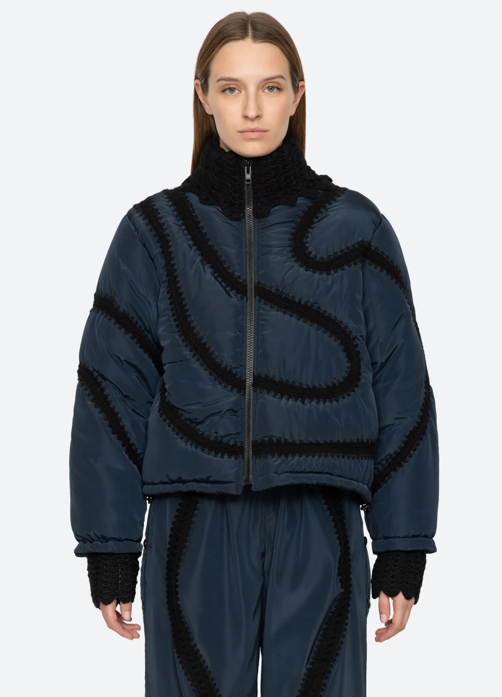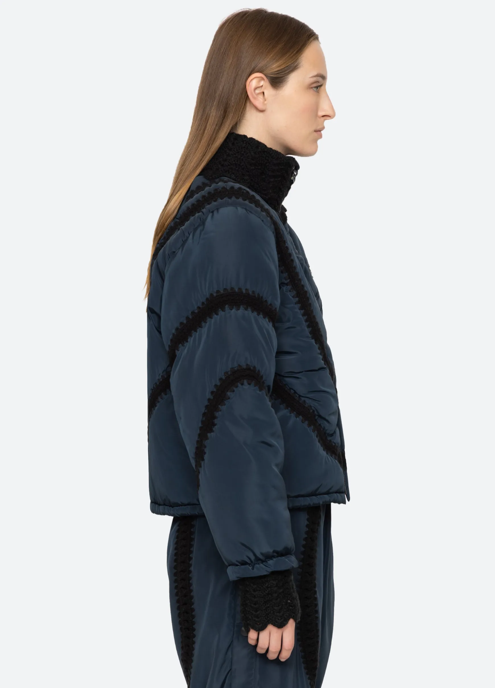 The Averie windbreaker puffer jacket features a high neckline and crochet detailing throughout.
