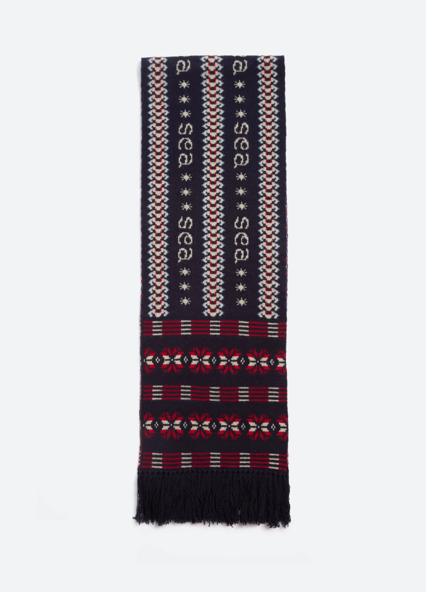 An online and in store exclusive. The Ayla scarf features a fair isle knit, fringe edges and ‘Sea’ logo.