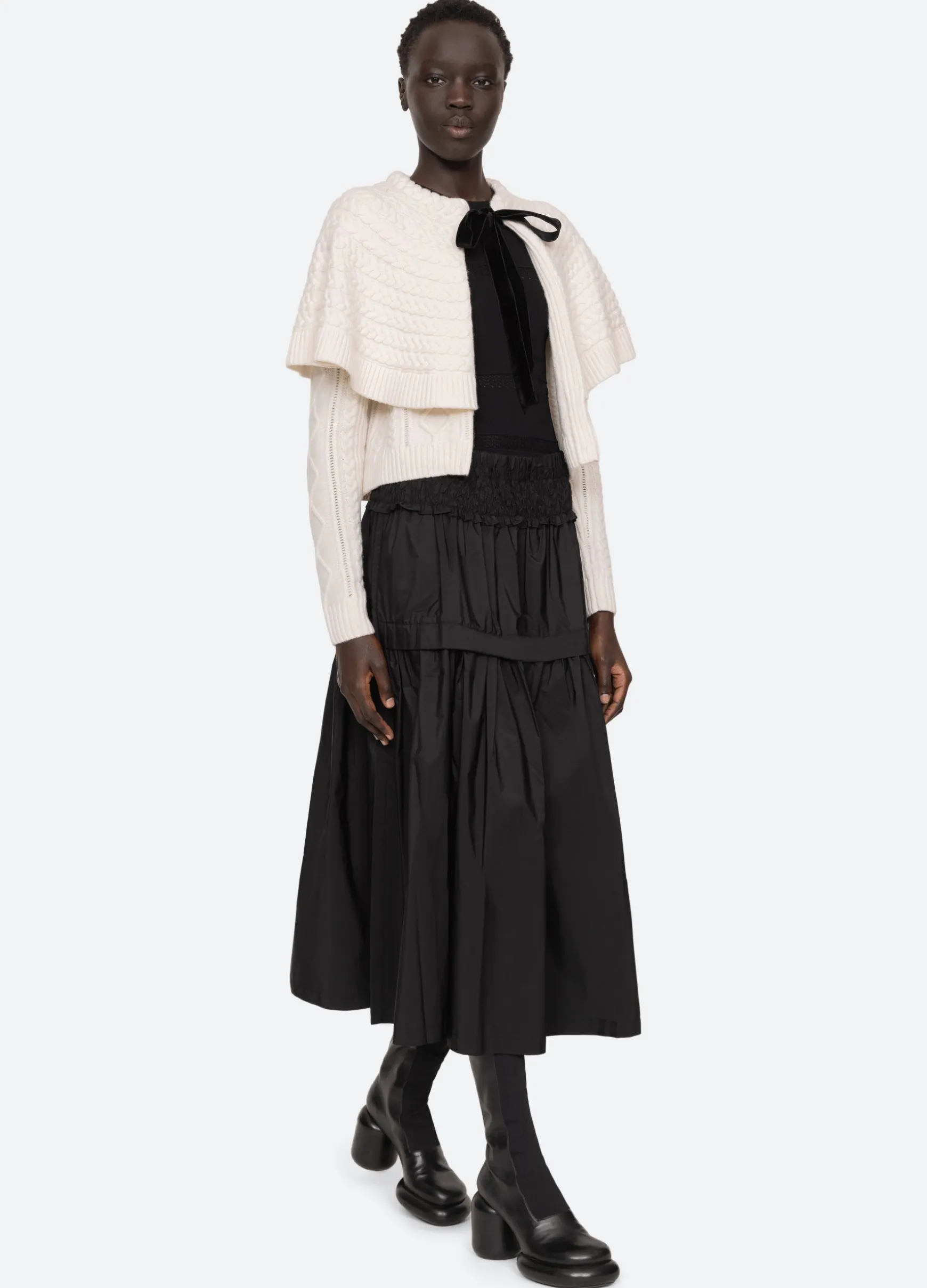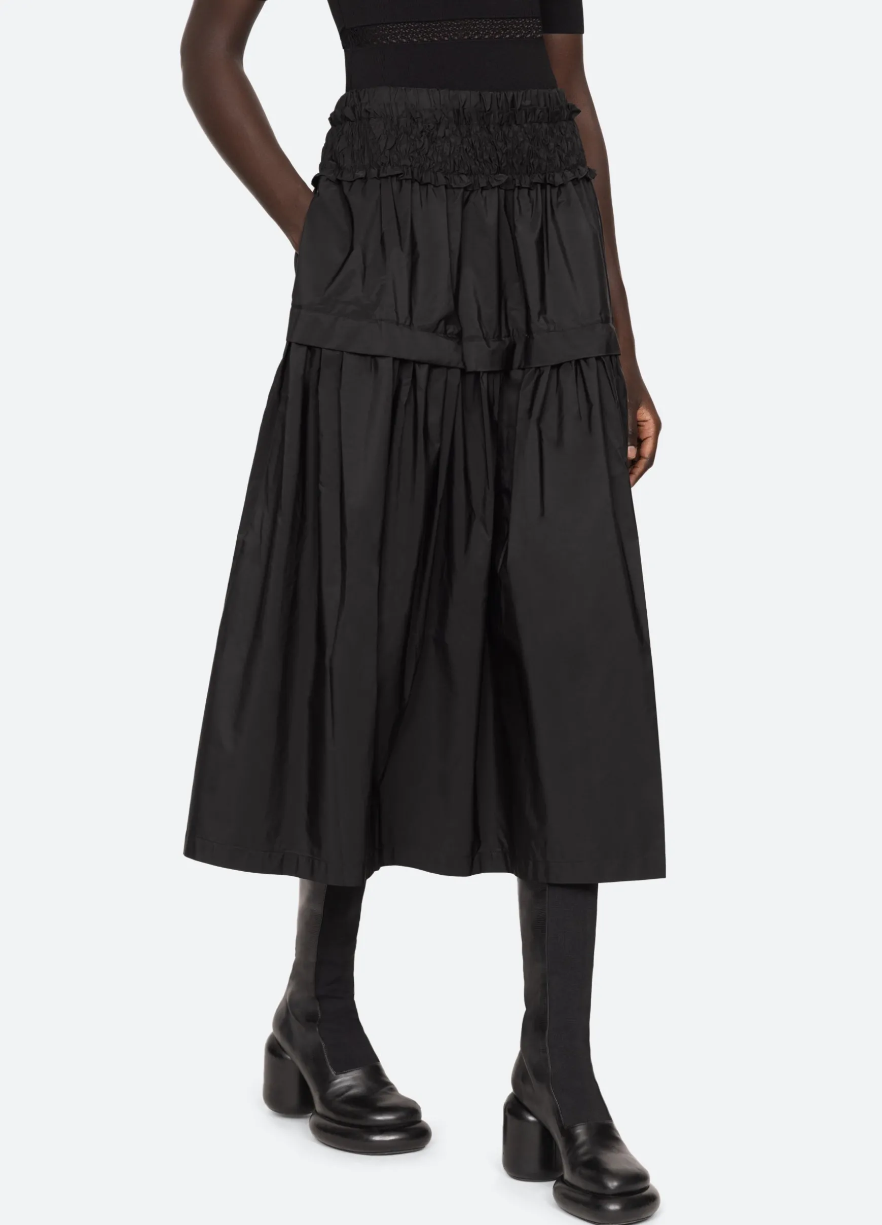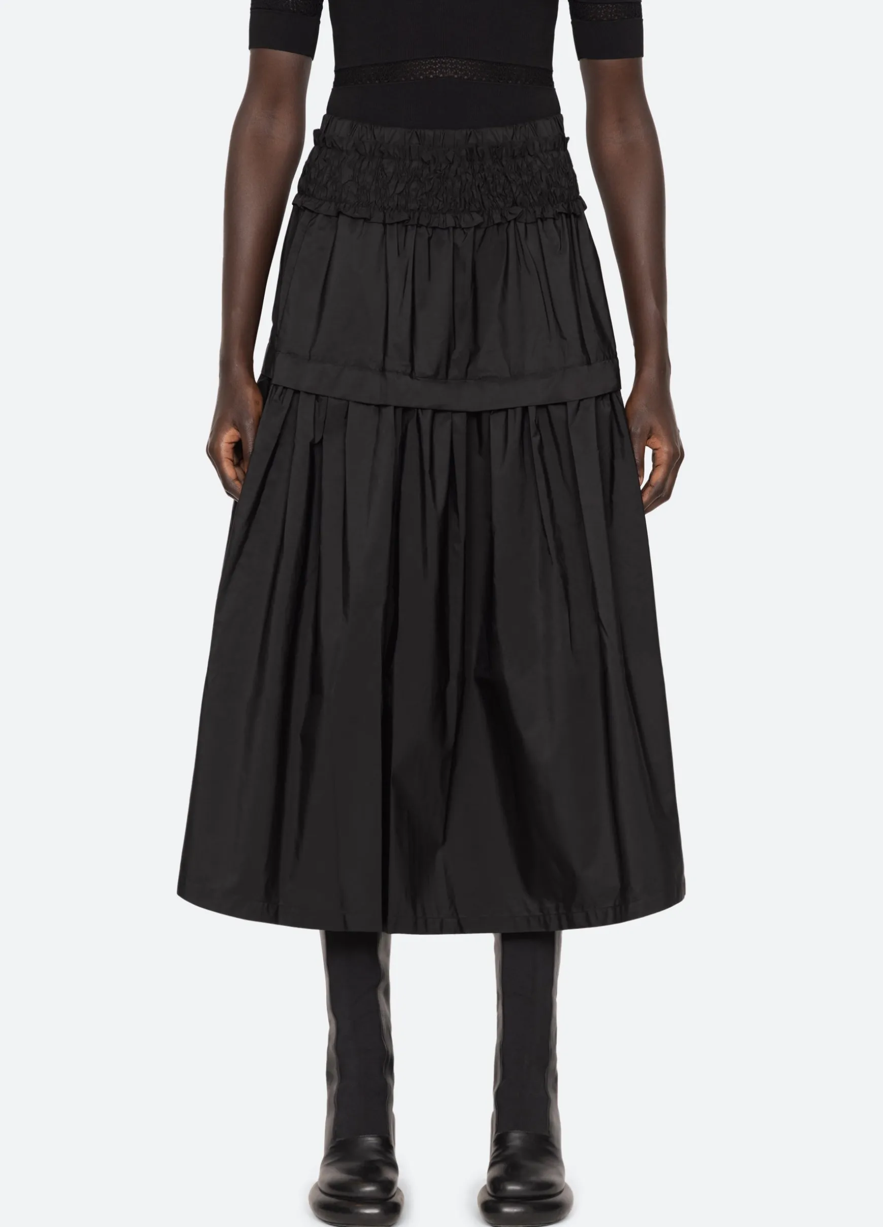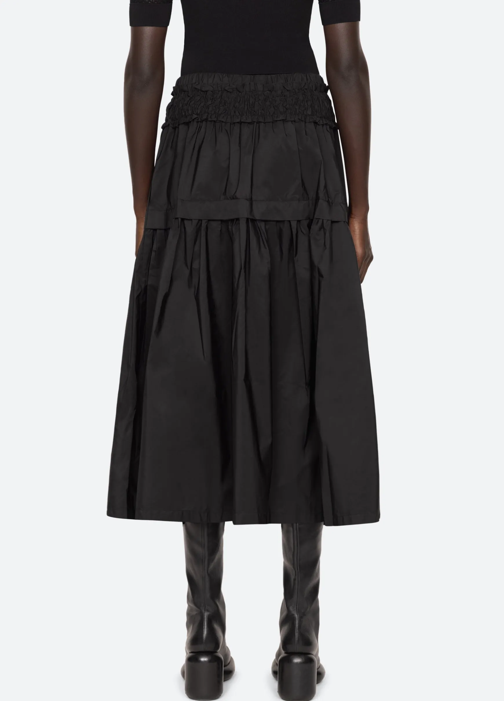 The Belen taffeta skirt features a smocked waistband and midi silhouette.