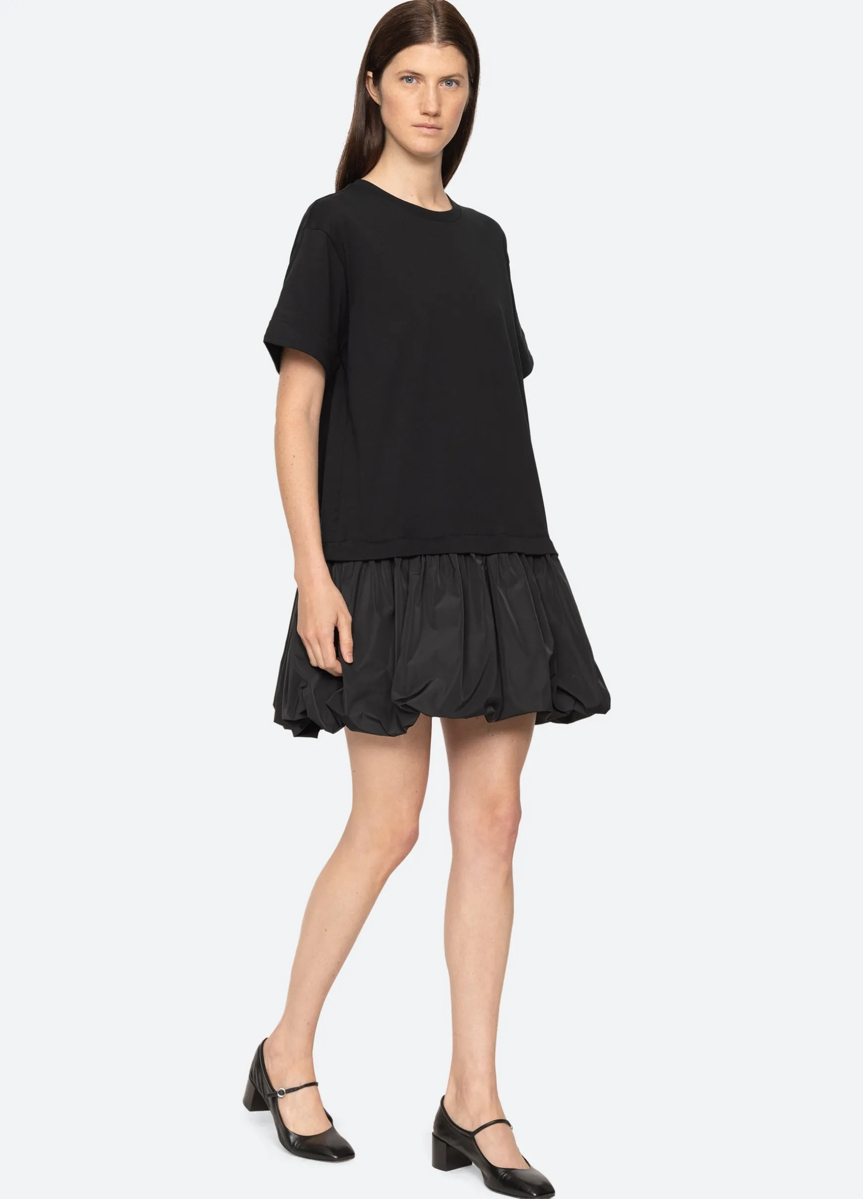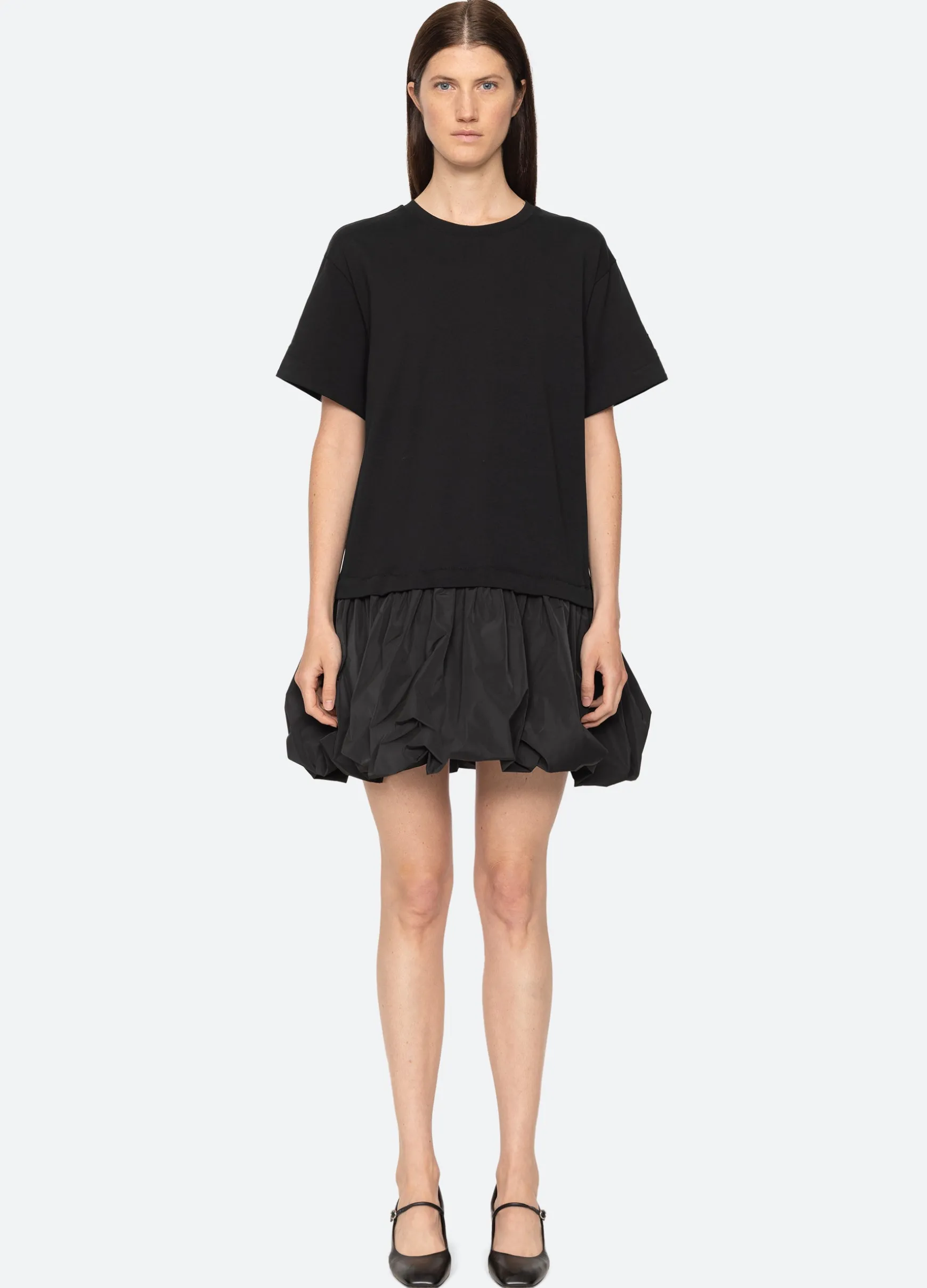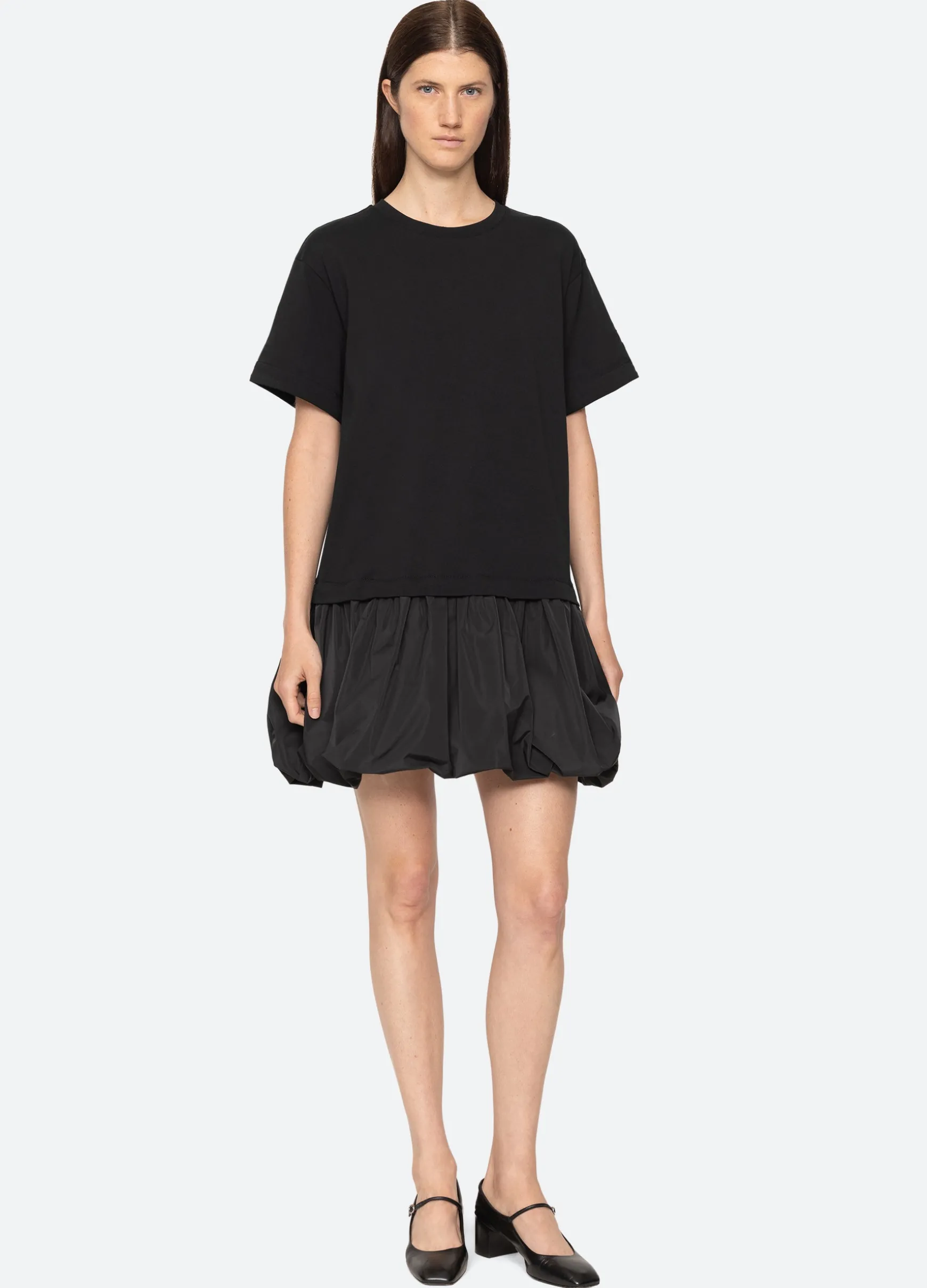 The Belen taffeta t-shirt dress features a combo black t-shirt top attached to avoluminous taffeta bubble skirt.