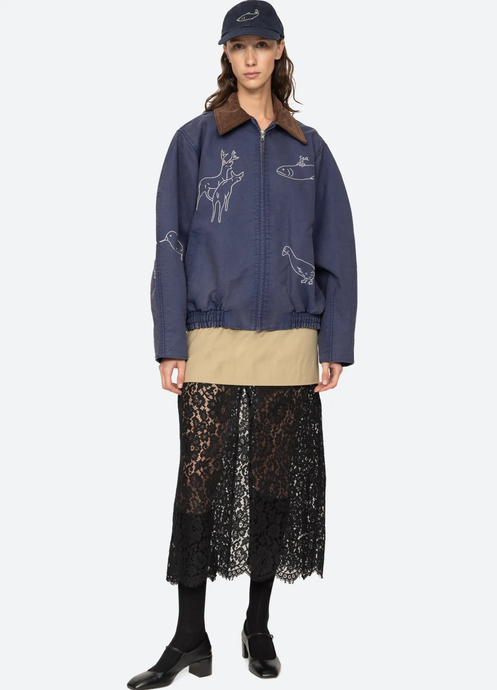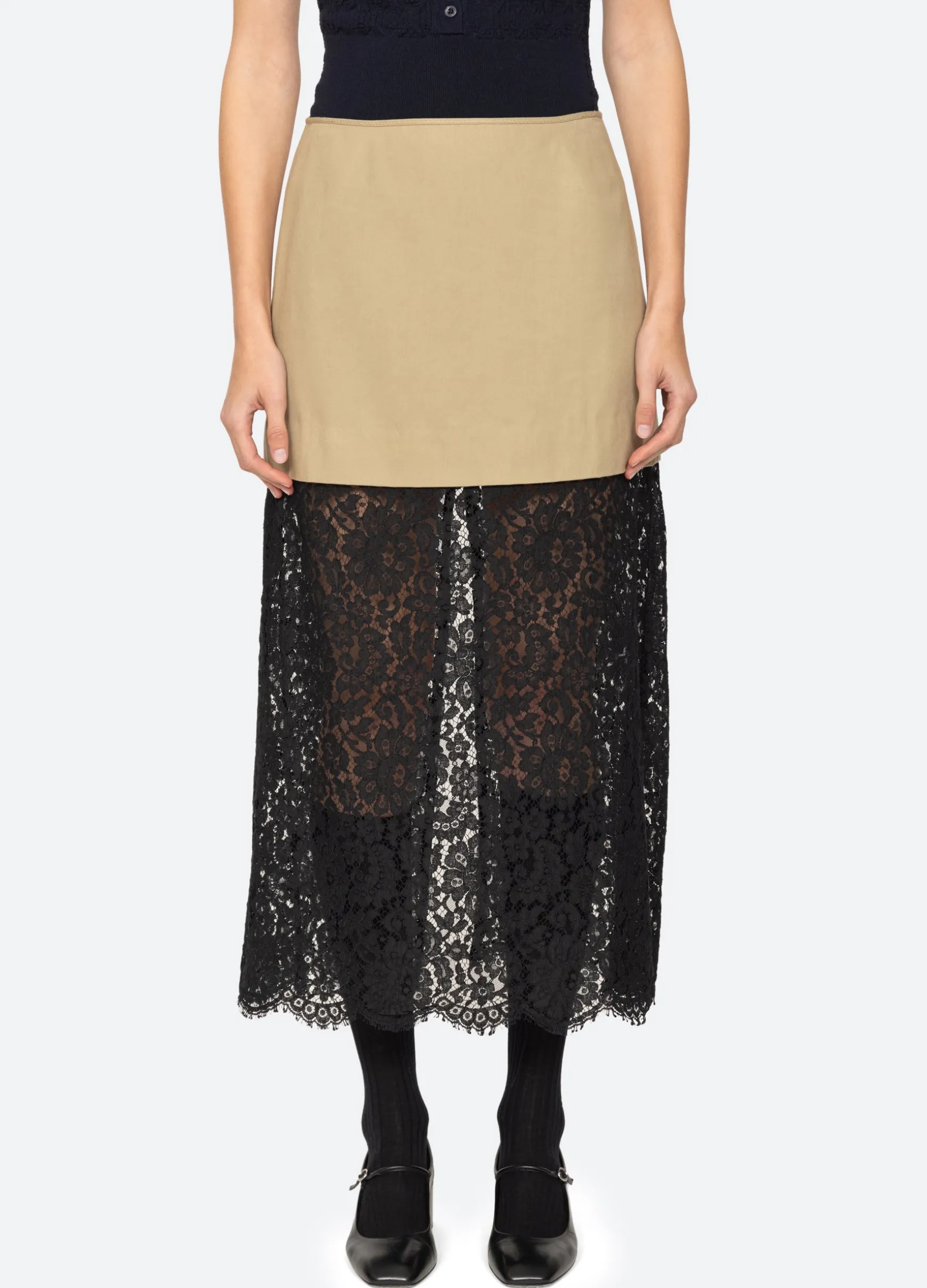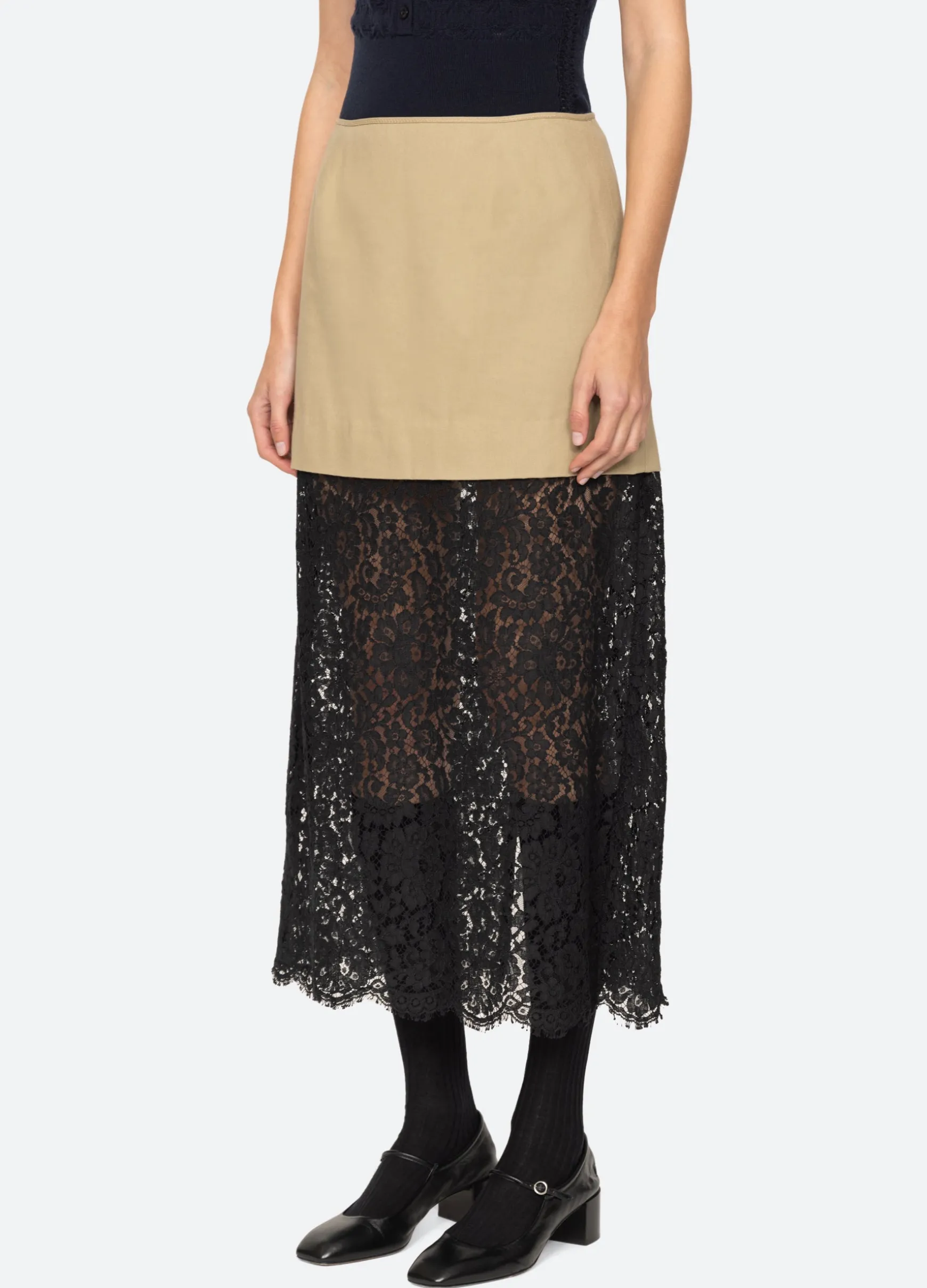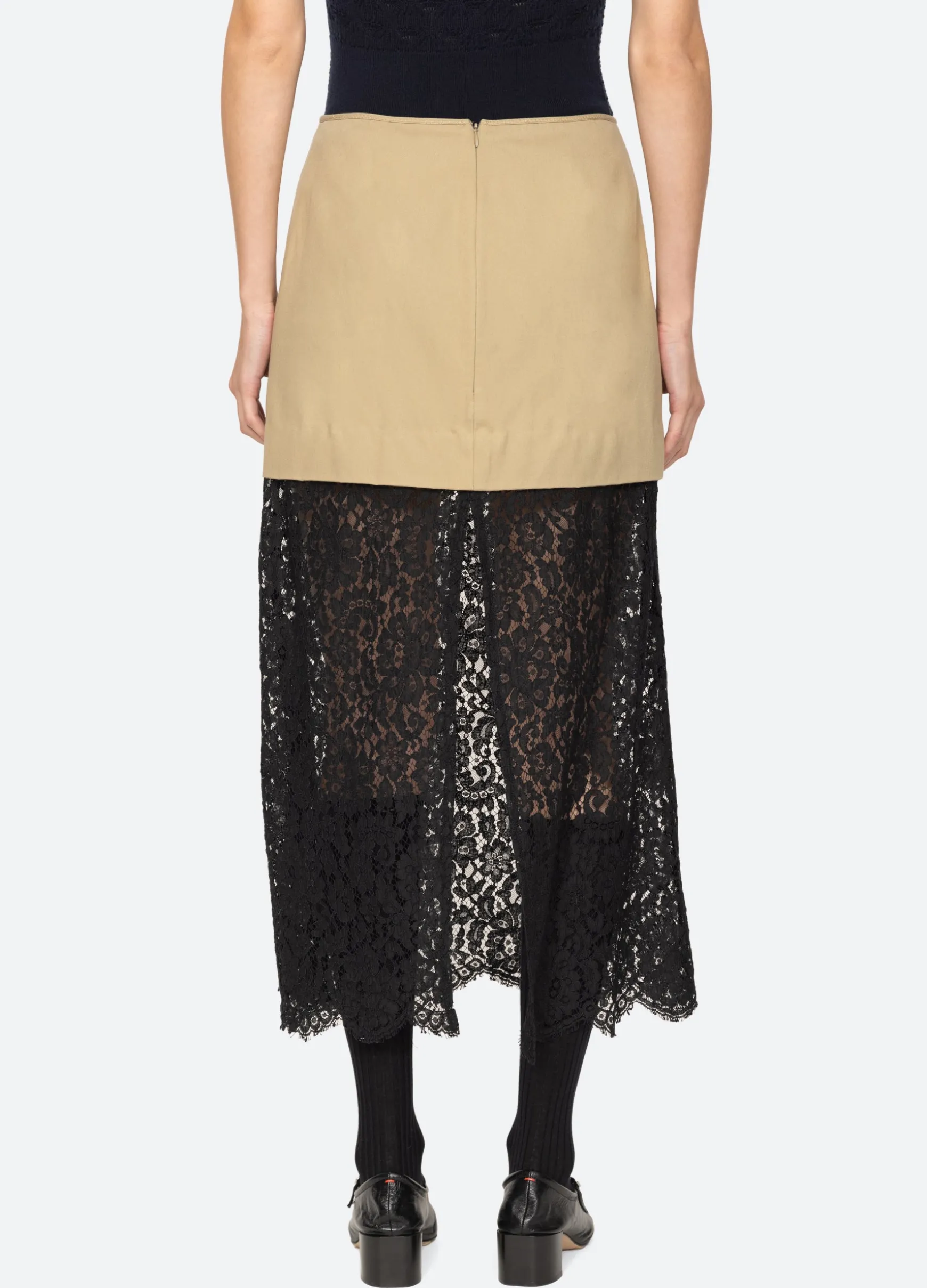 The Belle stone washed chino combo skirtfeatures a cotton mini skirt paired with sheer lace detailing.