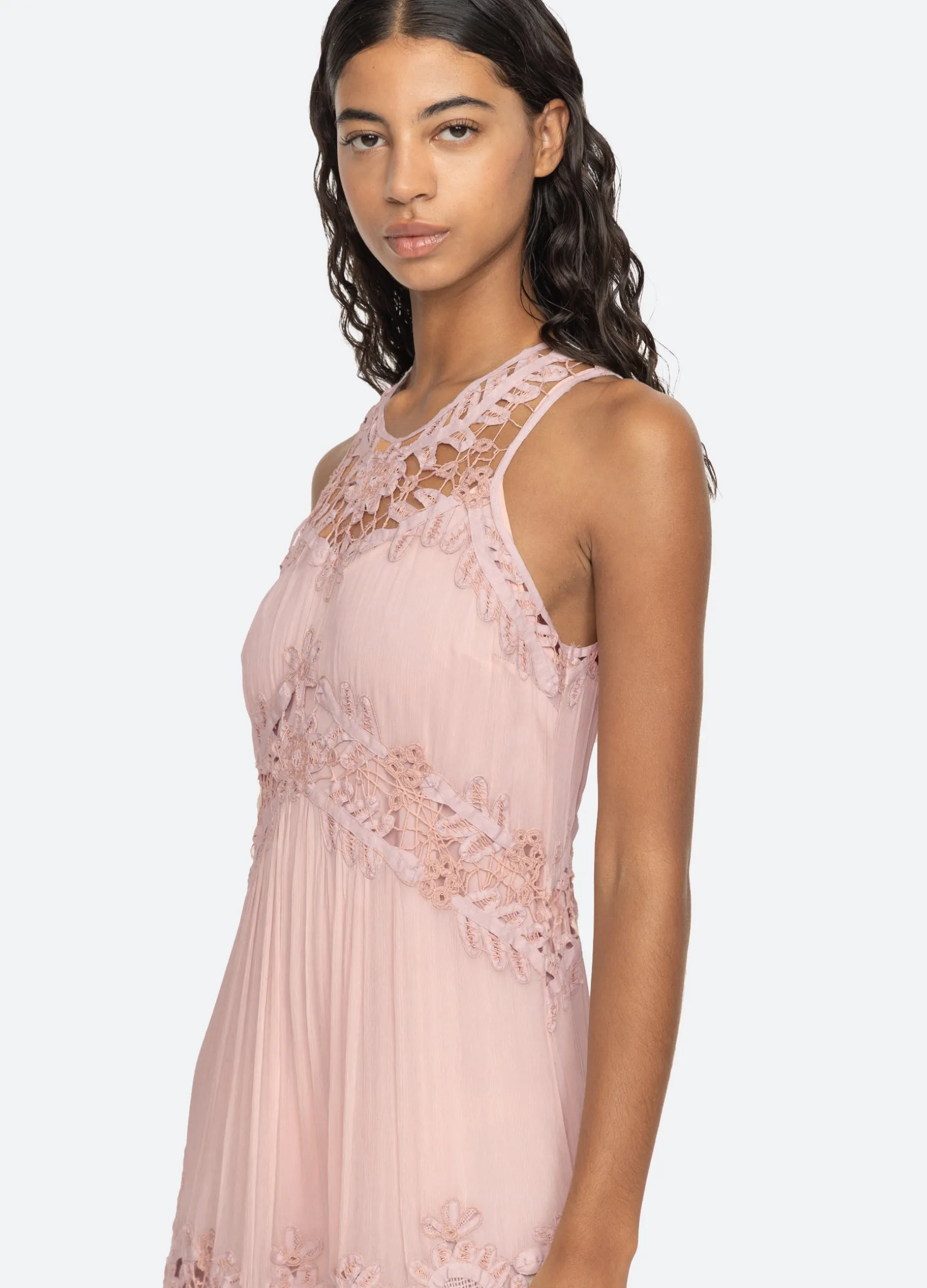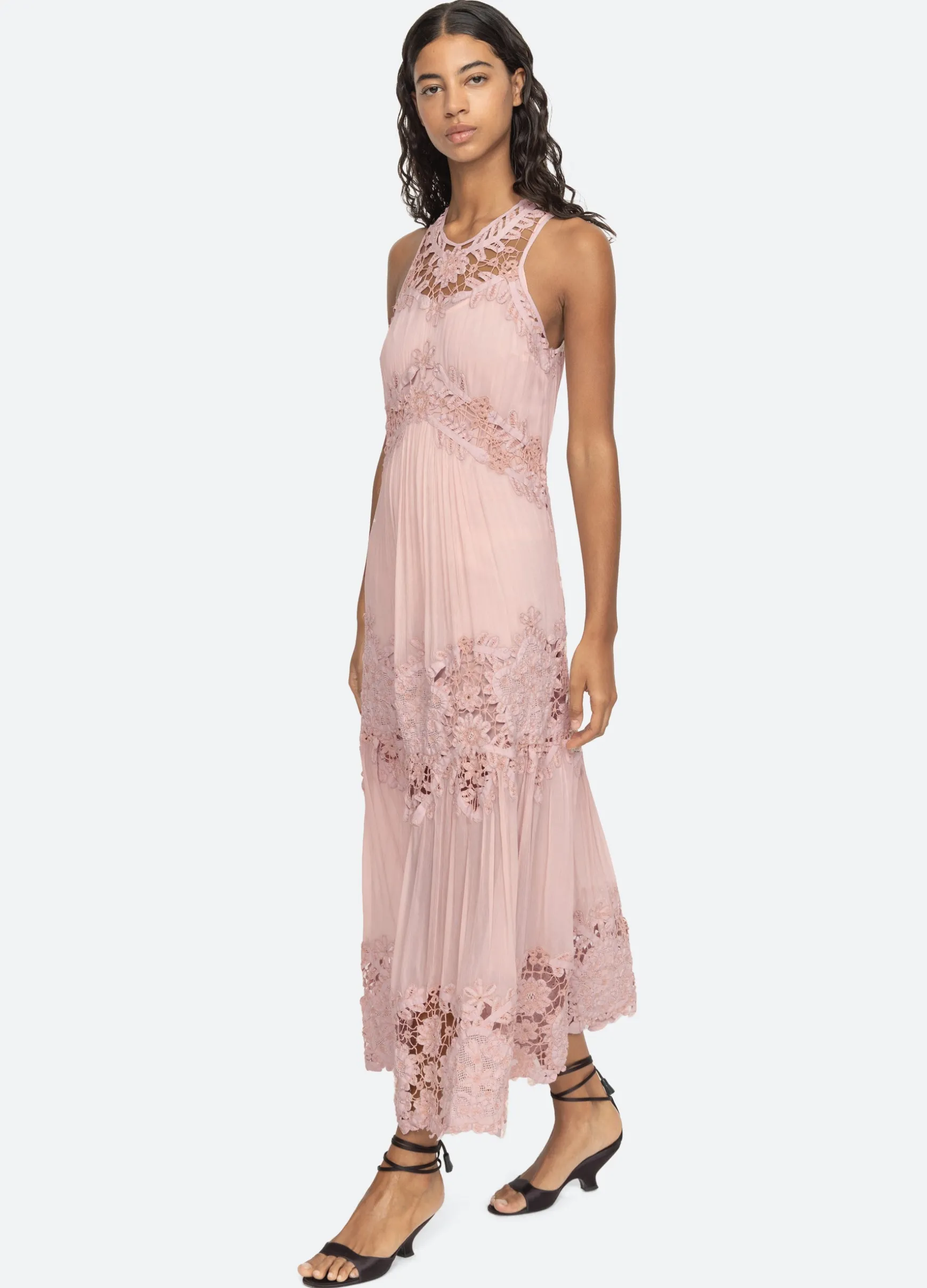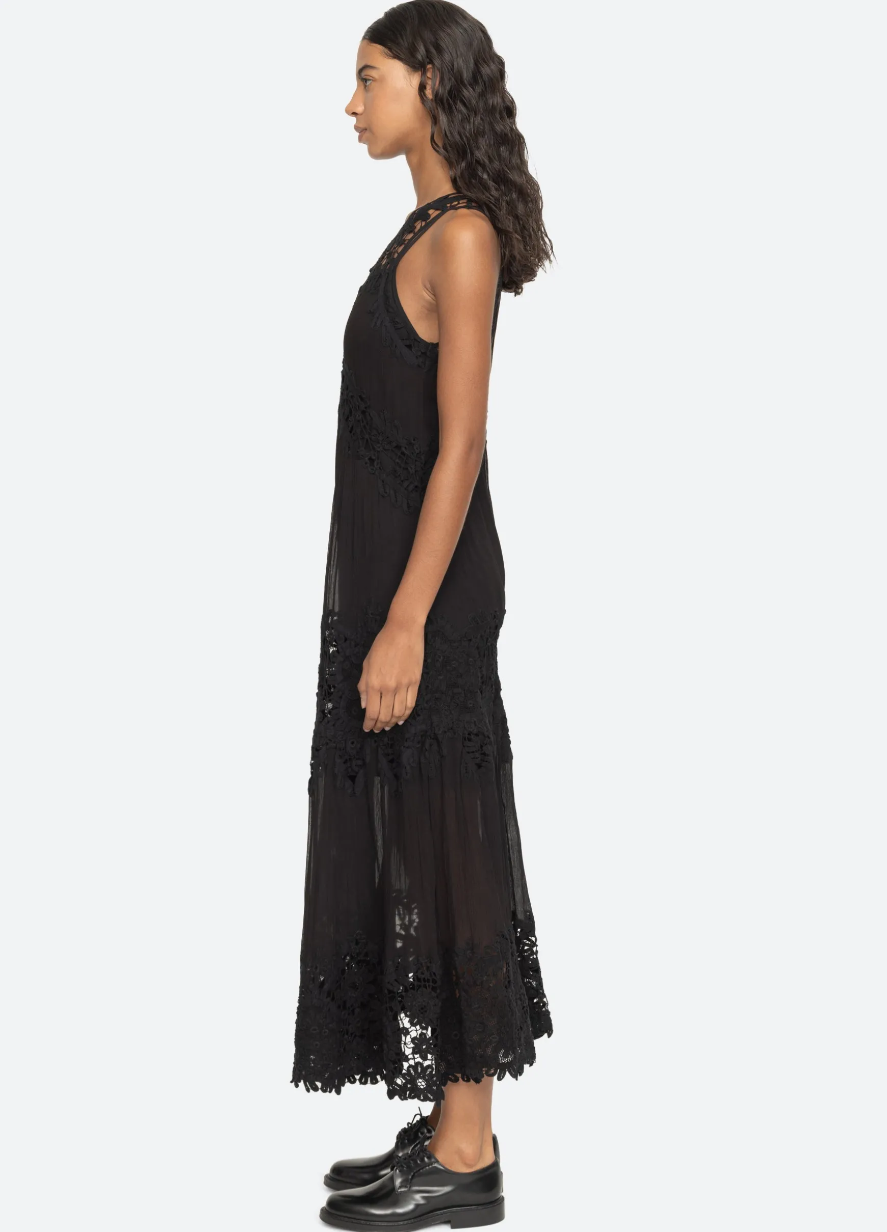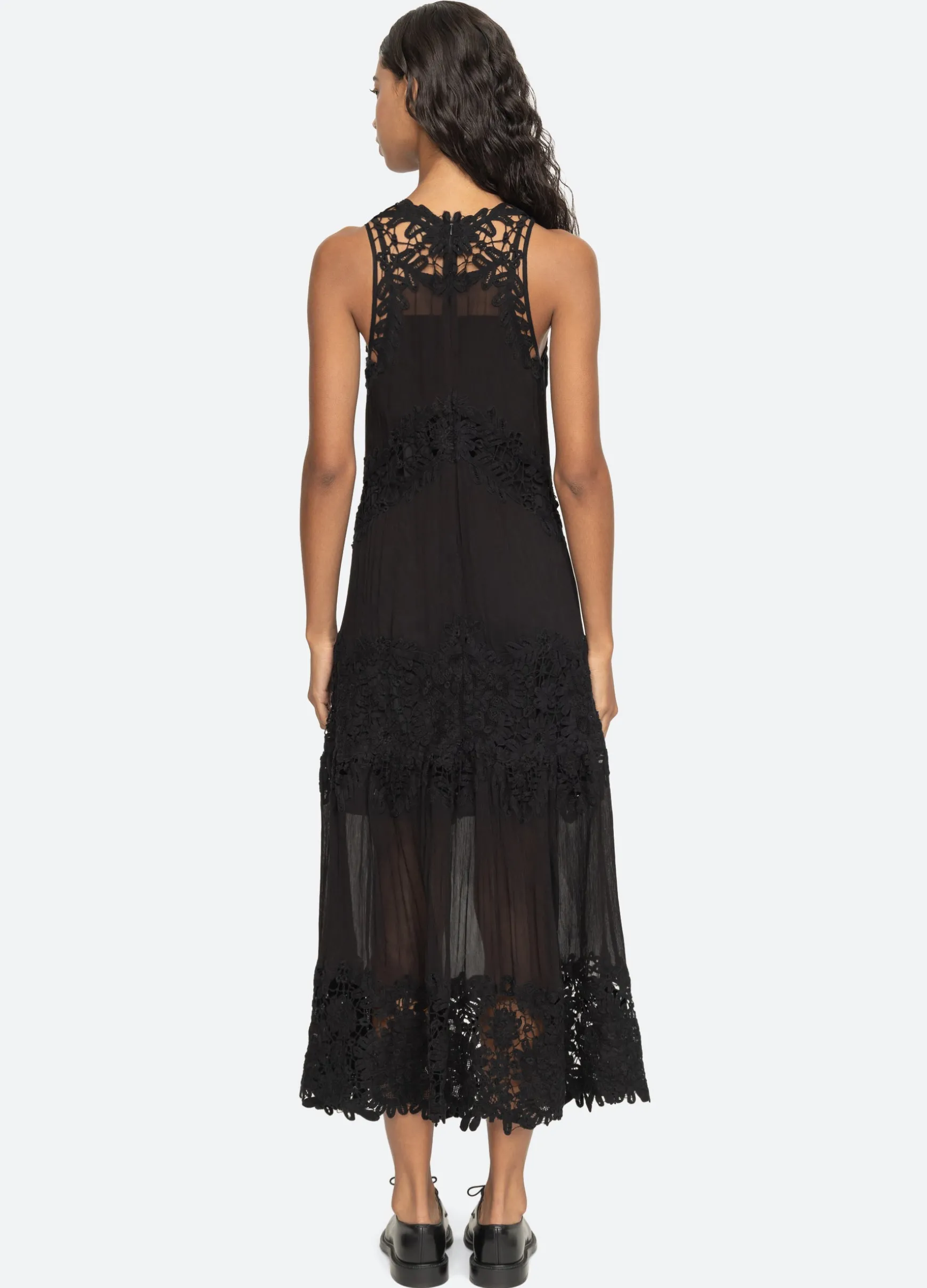 The Bente embroidered tank dress features intricate embroidered lace and sheer accents.
