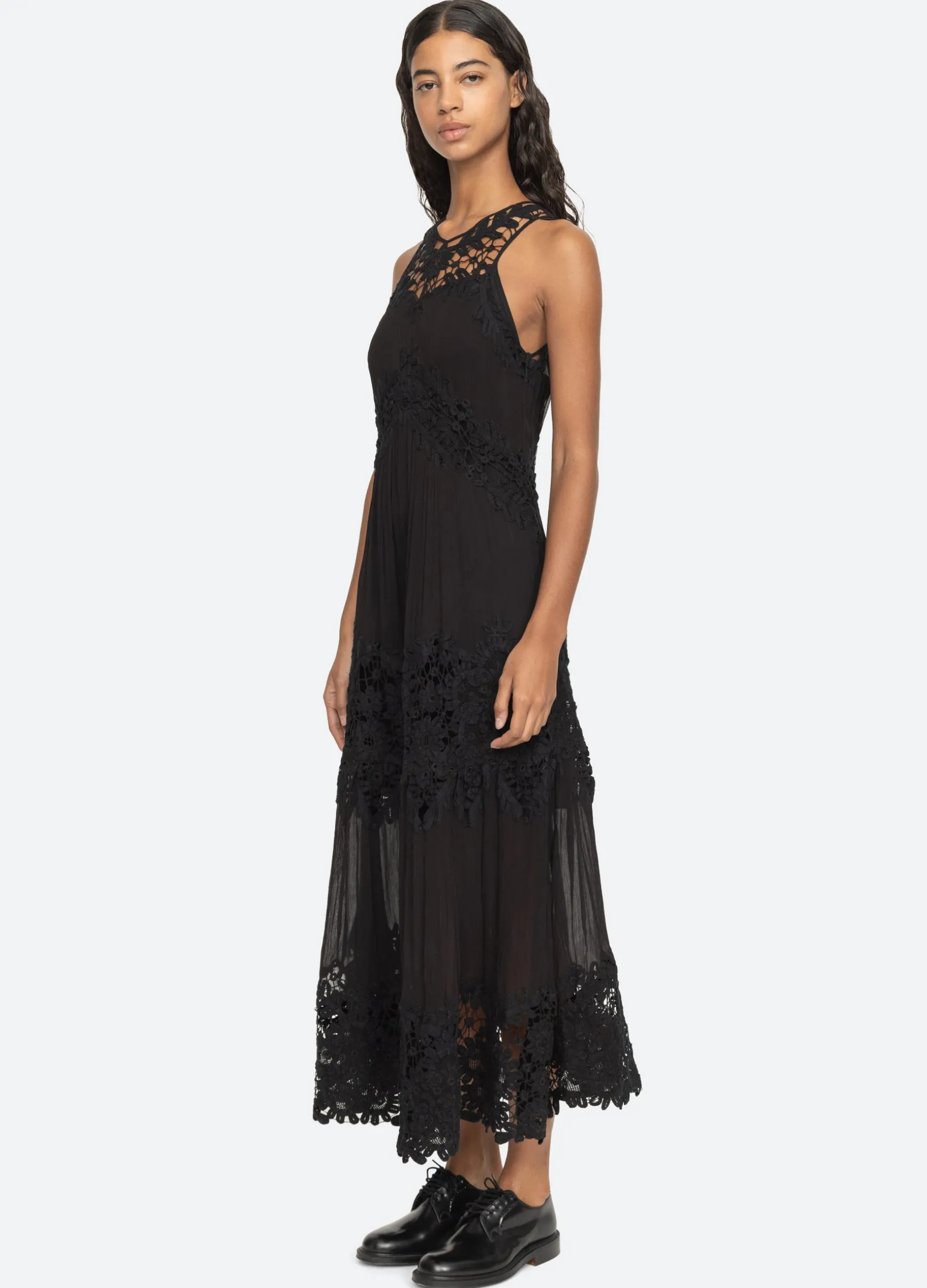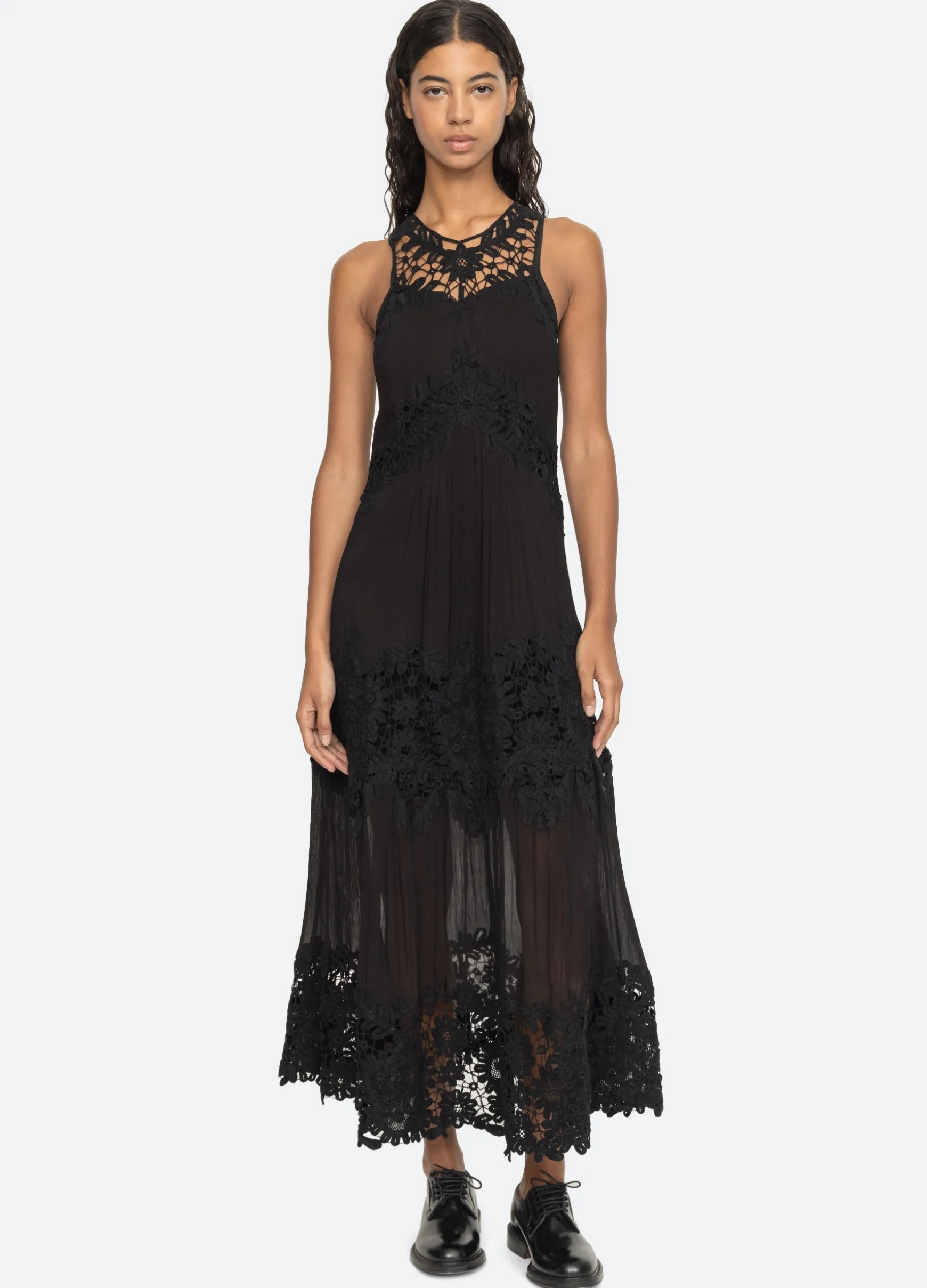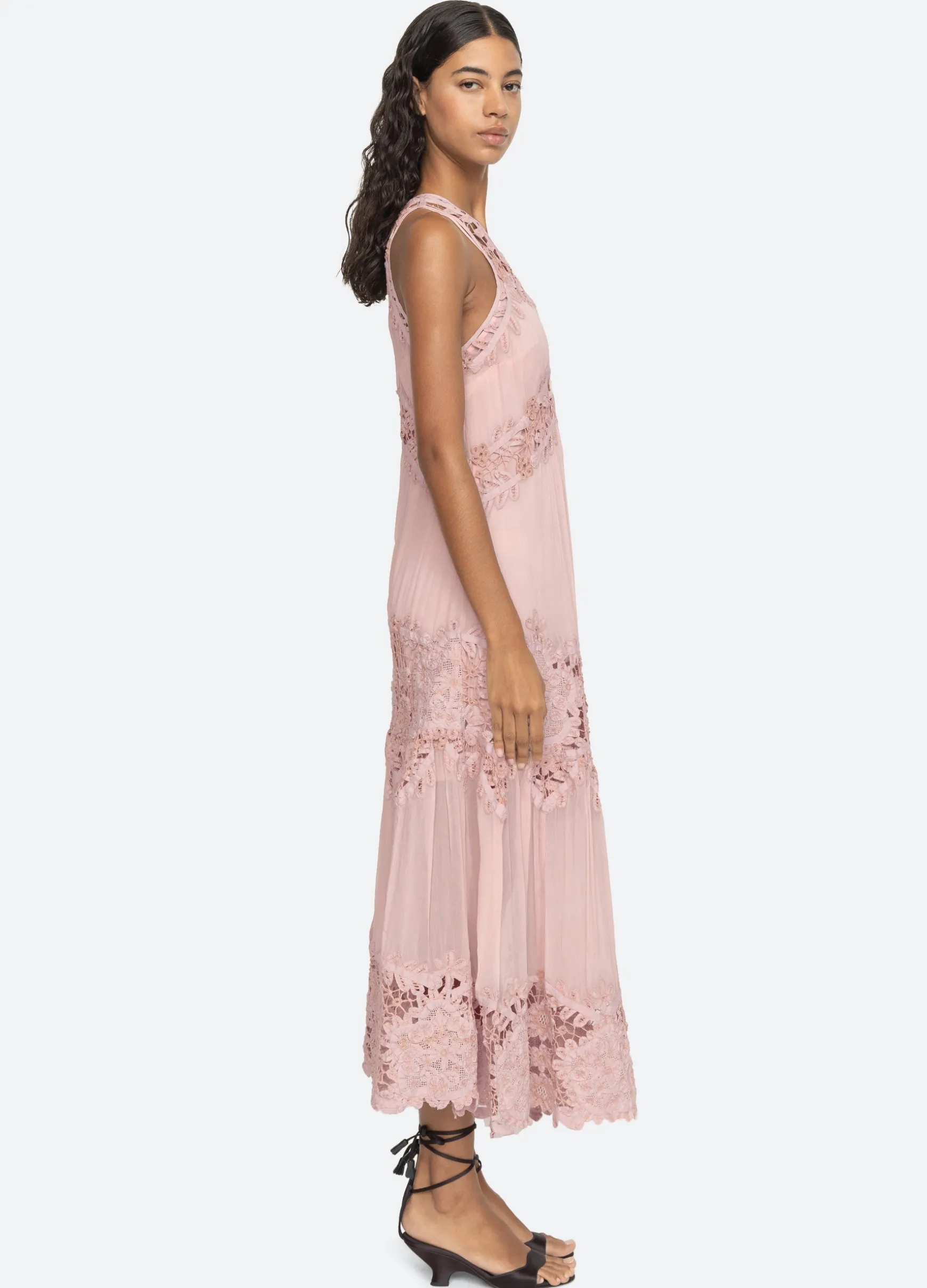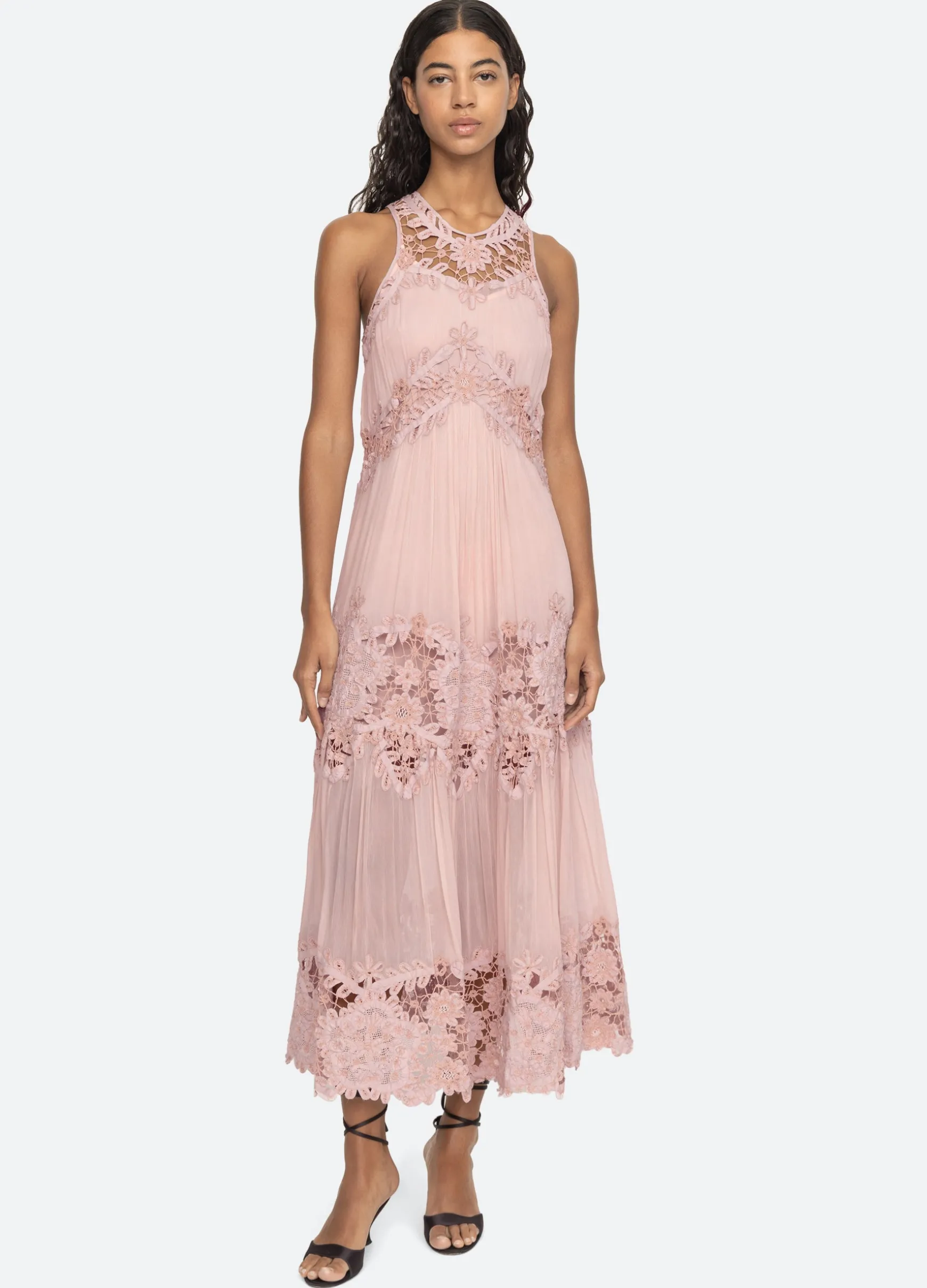 The Bente embroidered tank dress features intricate embroidered lace and sheer accents.