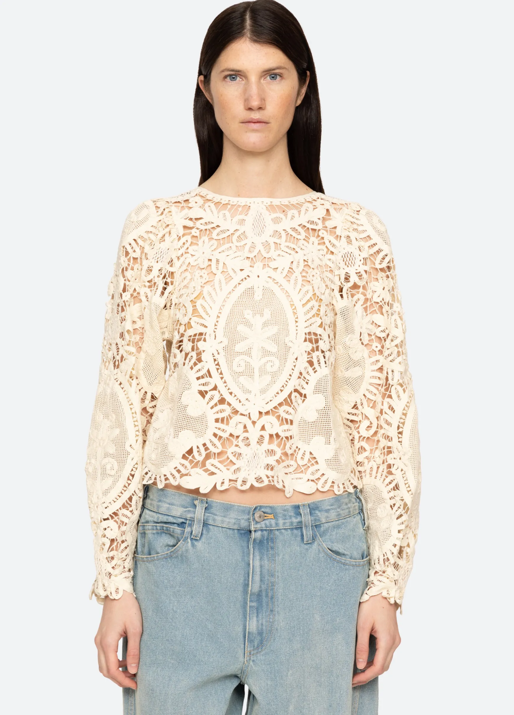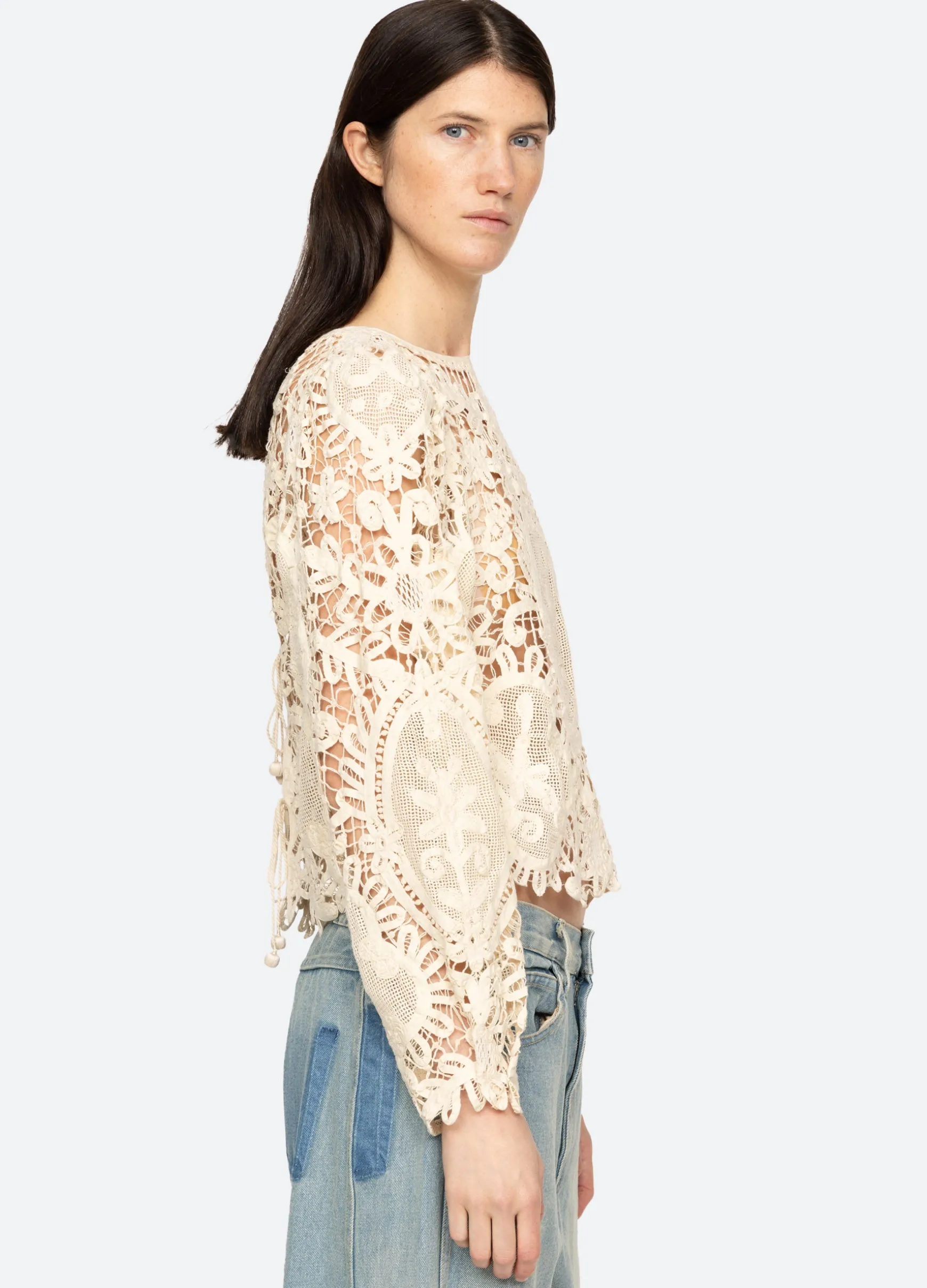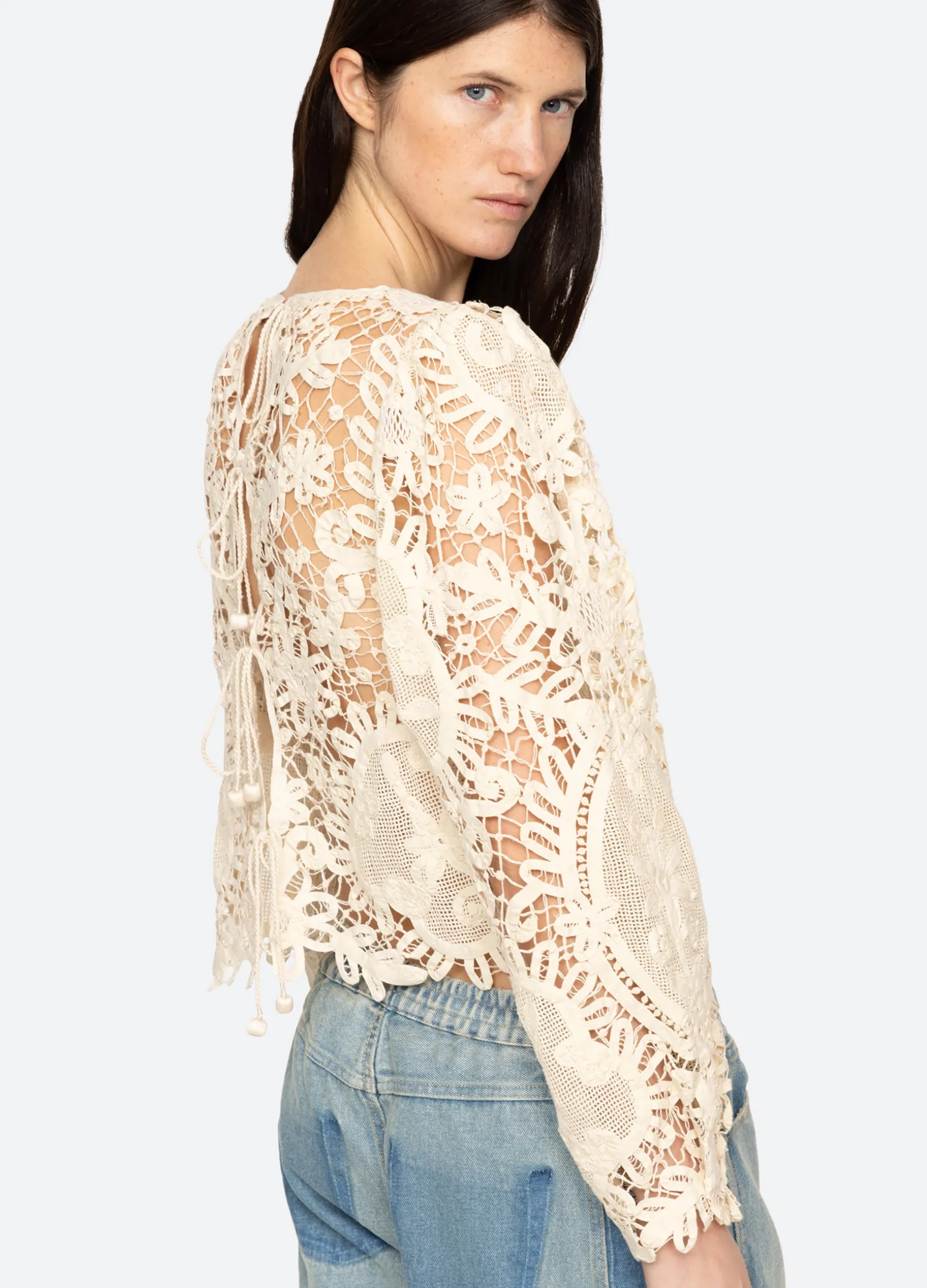 The Bente embroidered long sleeve top features intricate embroidered lace detailing throughout andtie fastening at back.