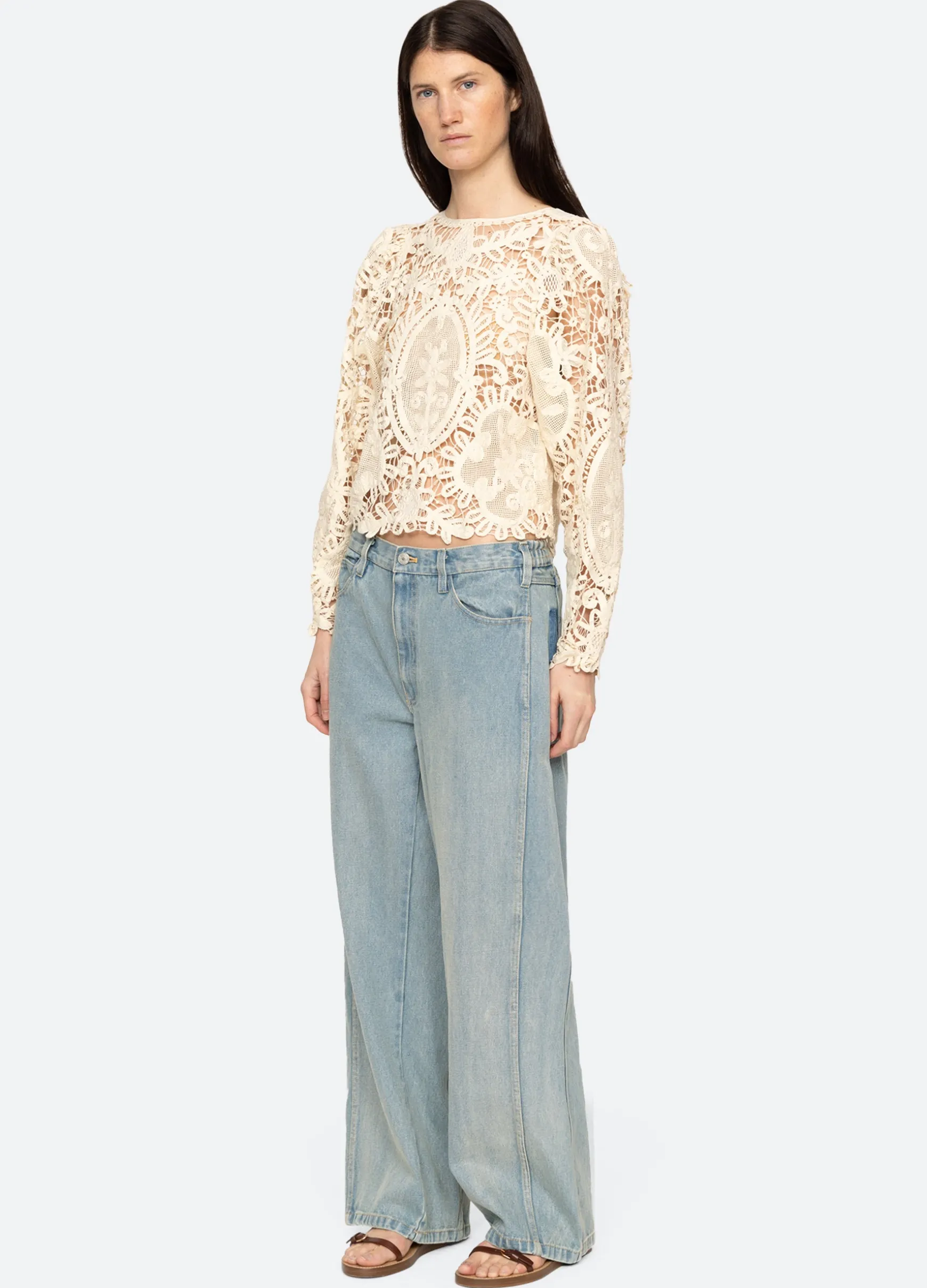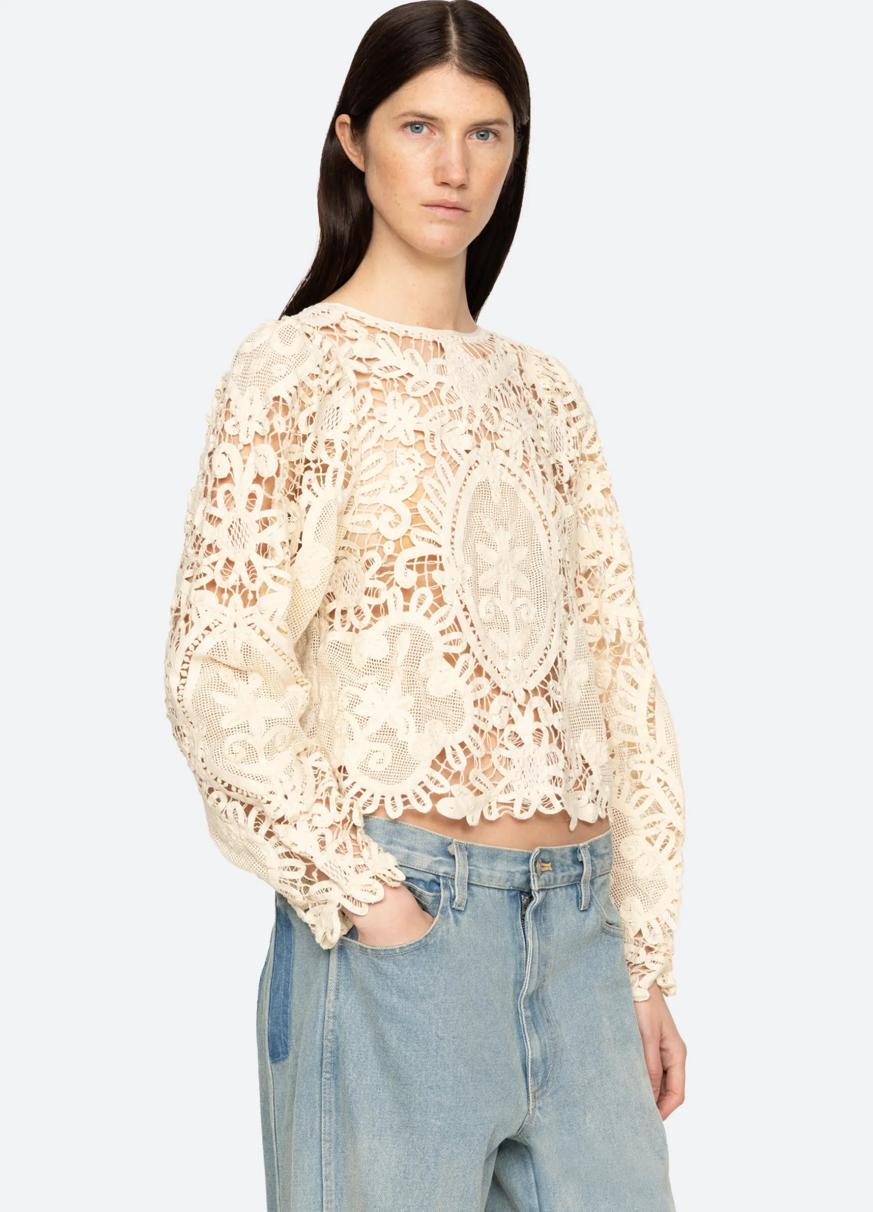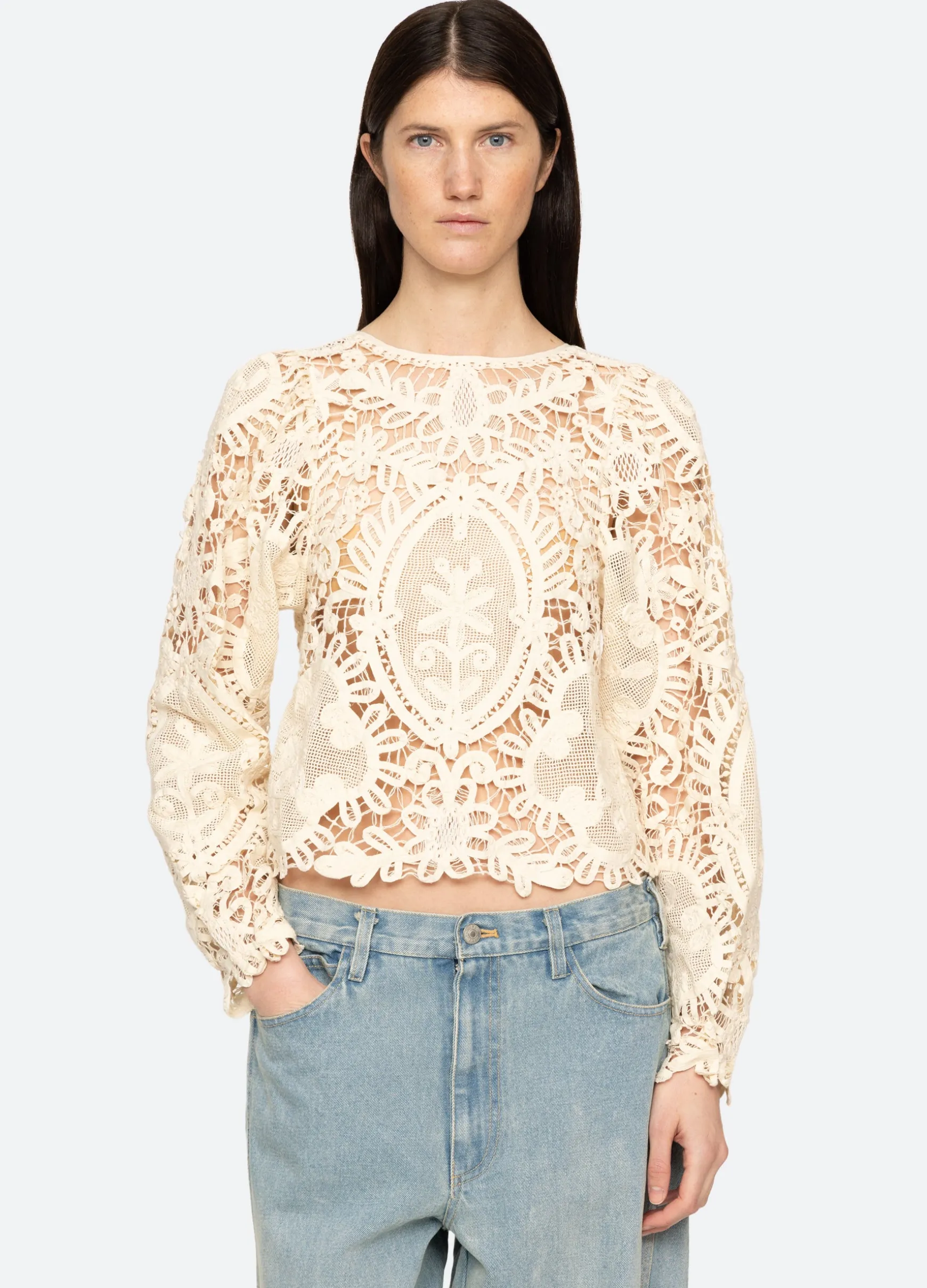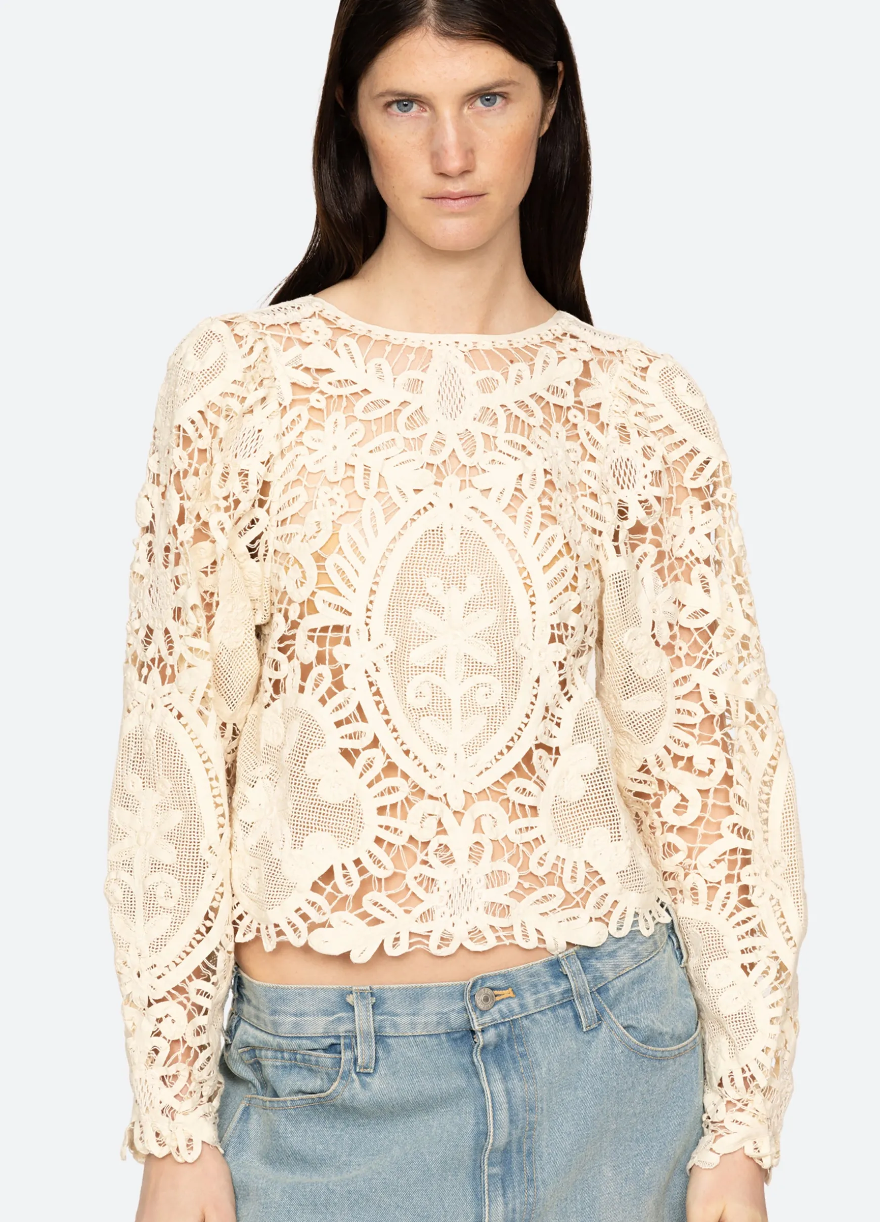 The Bente embroidered long sleeve top features intricate embroidered lace detailing throughout andtie fastening at back.