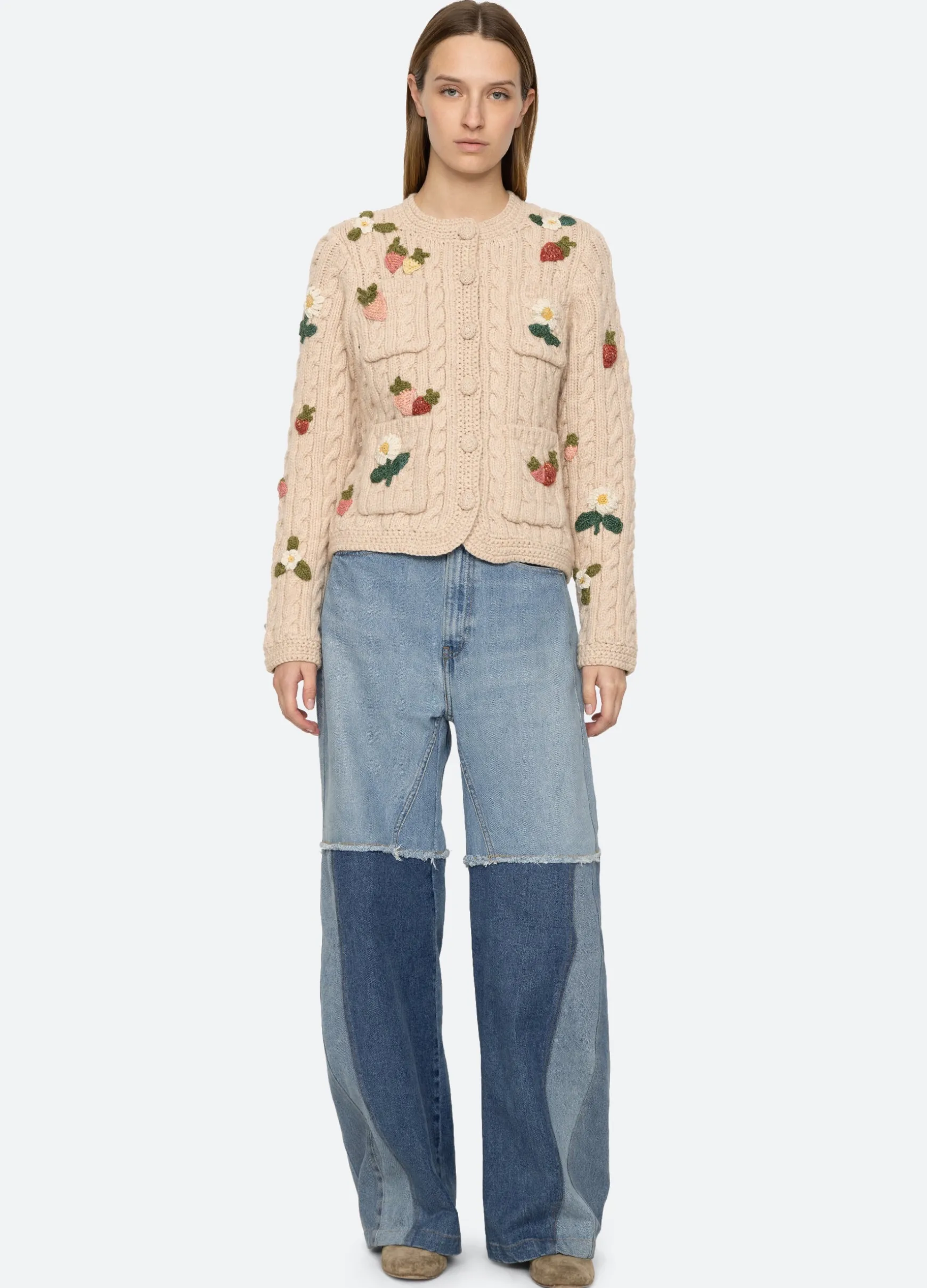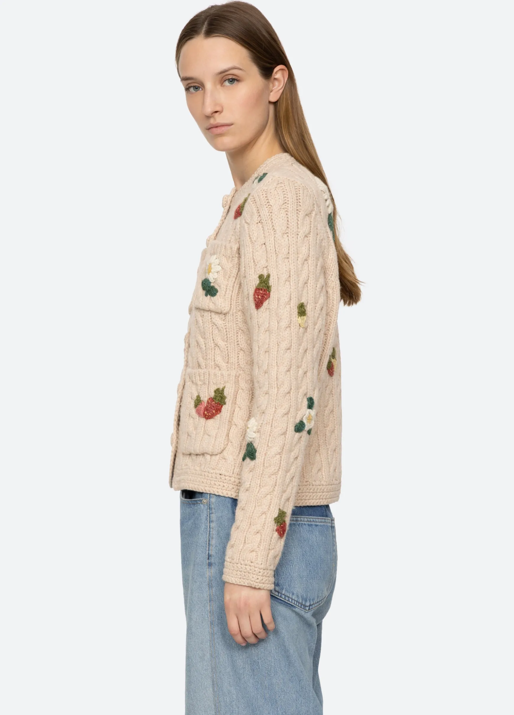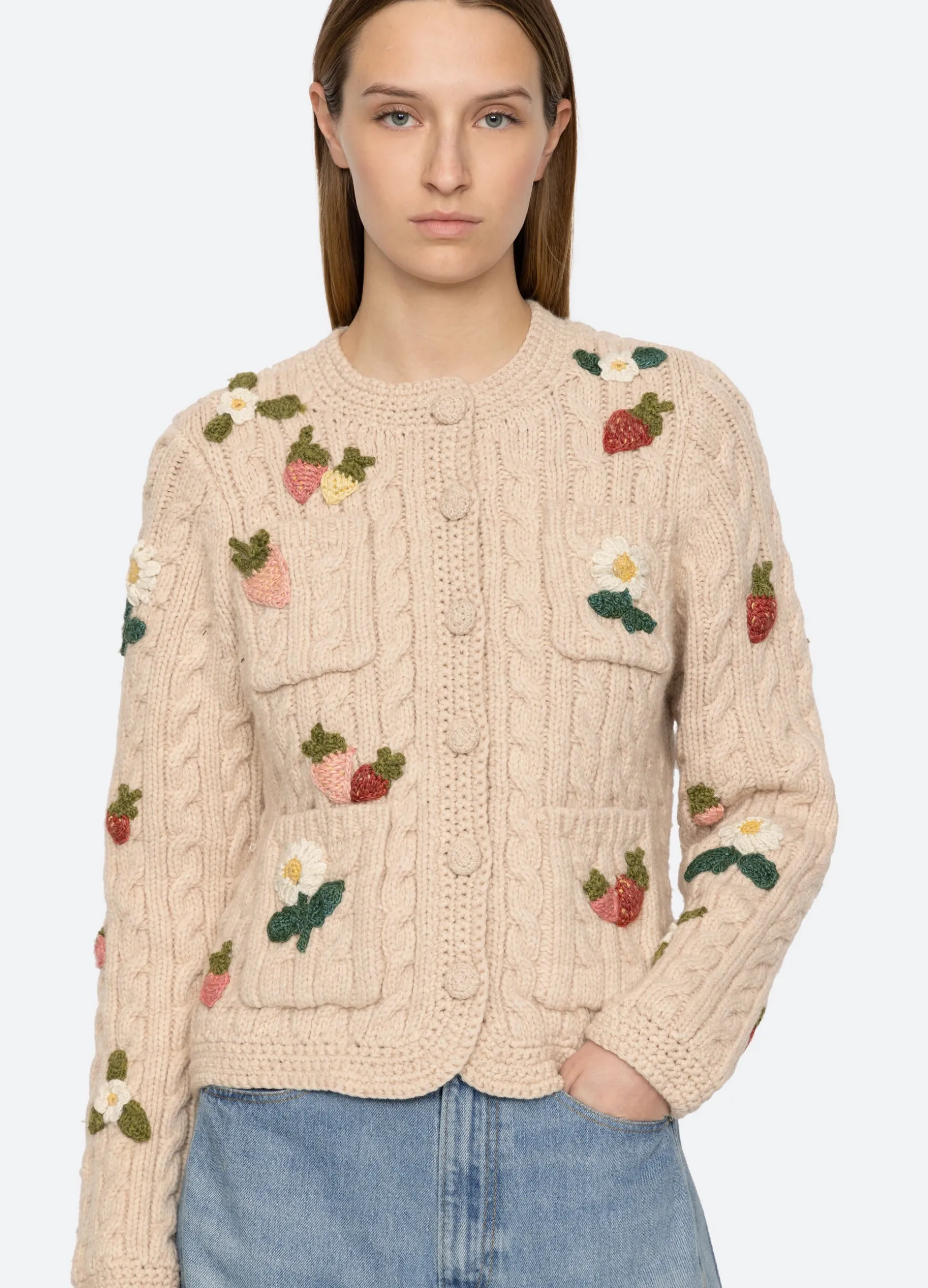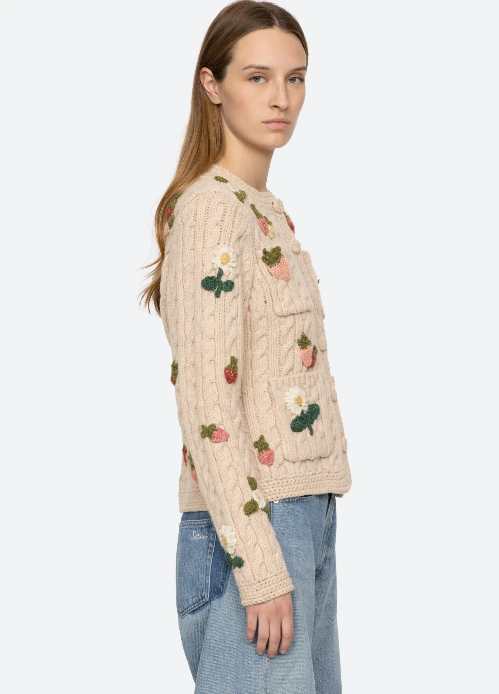 The Callie cardigan features fruit and floral crochet applique and cable knit detailing.