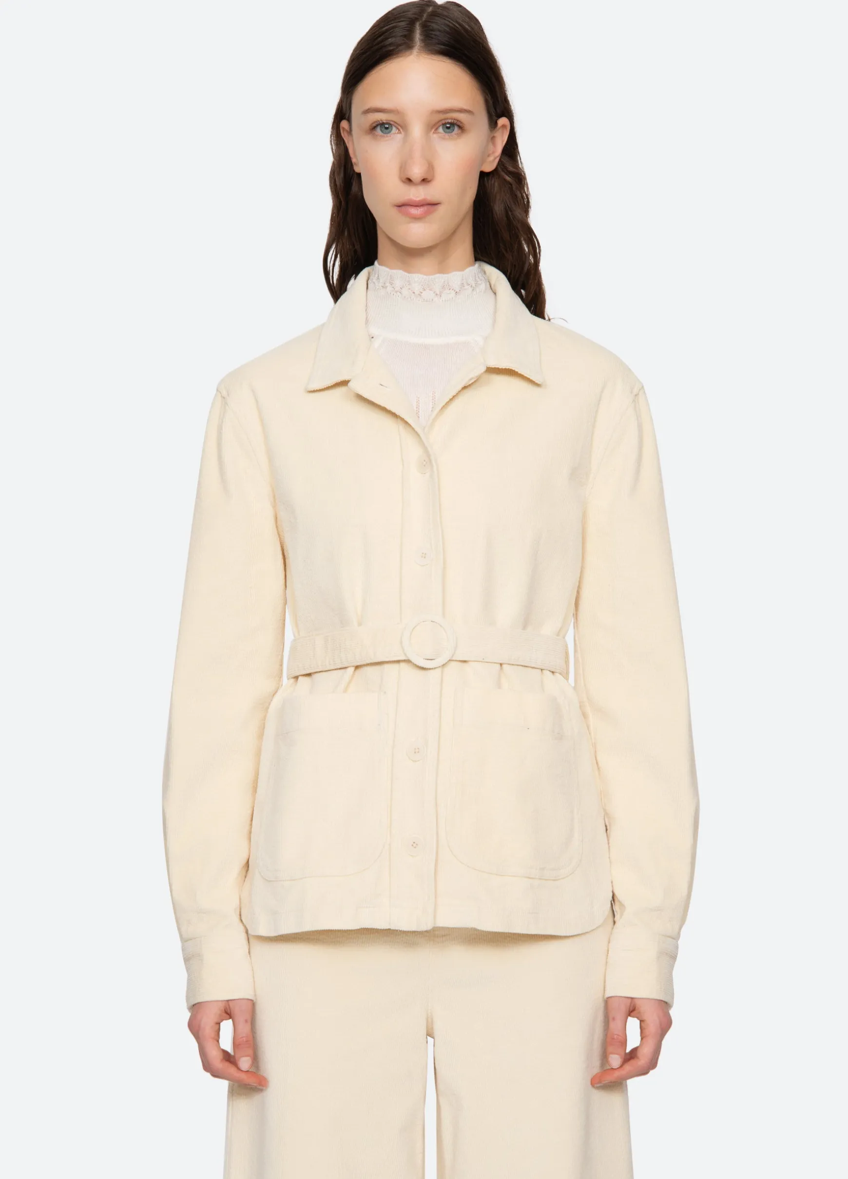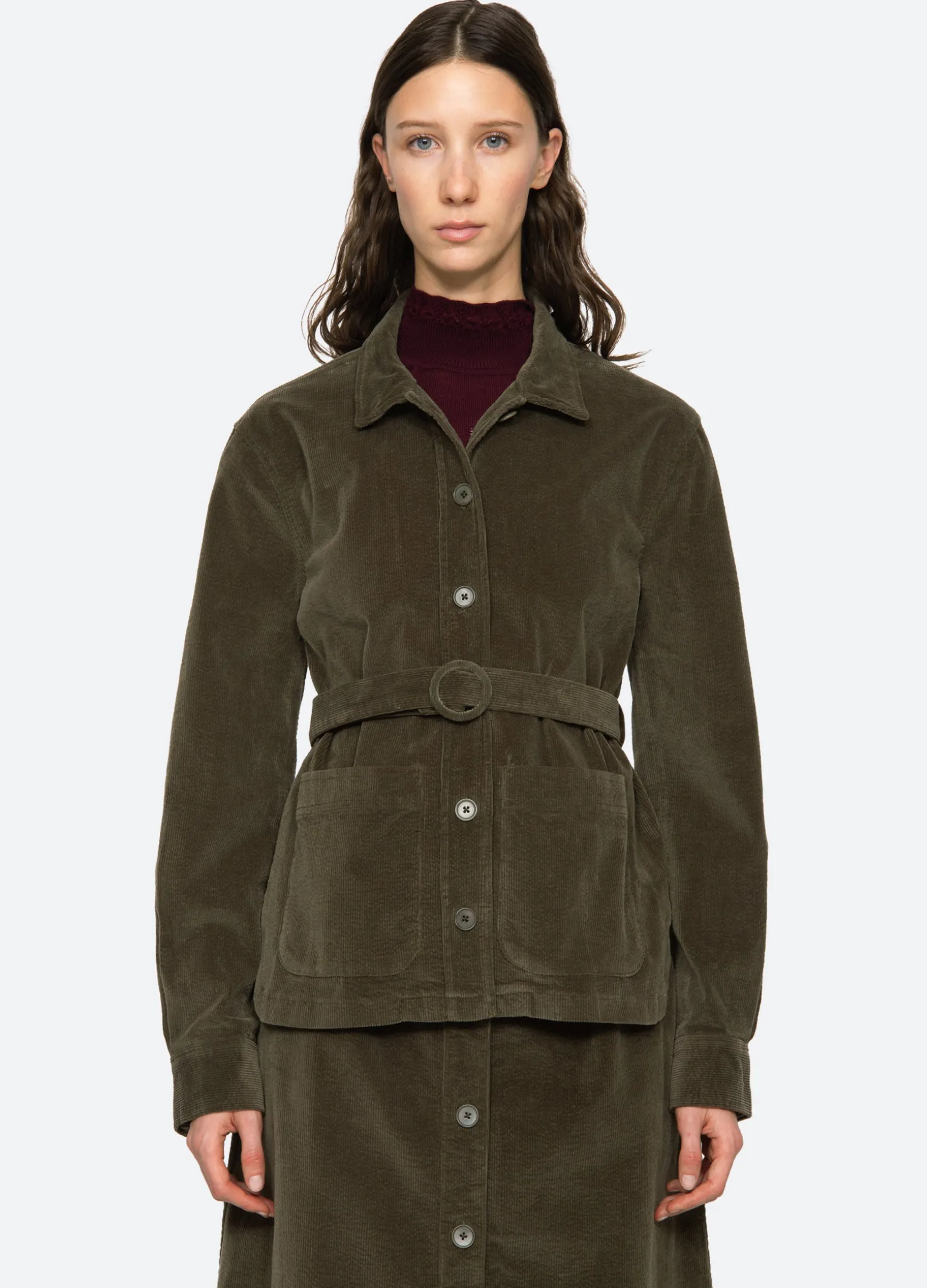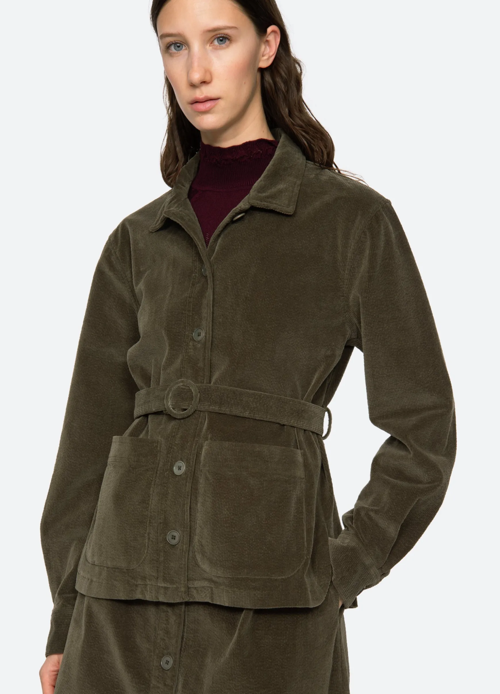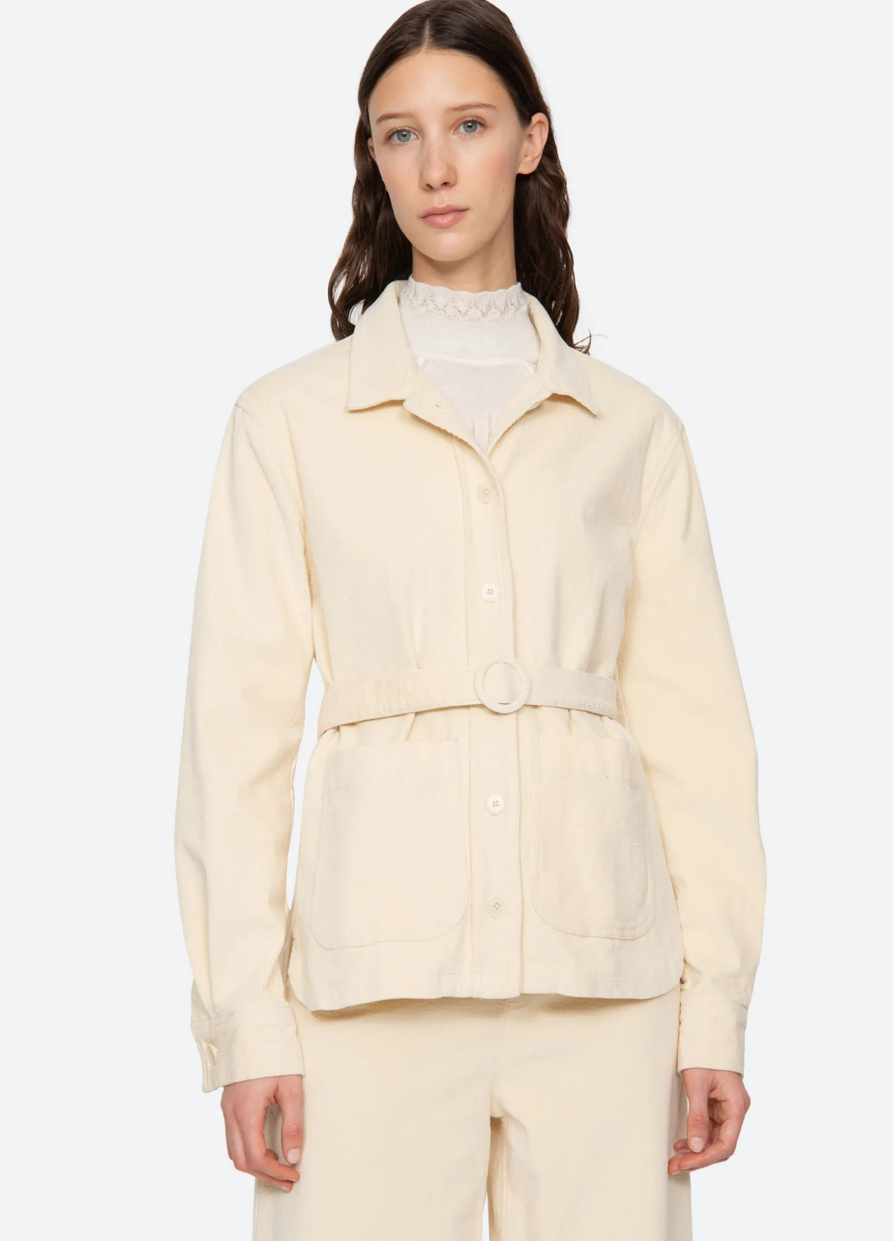 The Carine corduroy jacket features a removable belt and button front. Pairs perfectly with the Carine corduroy jeans.