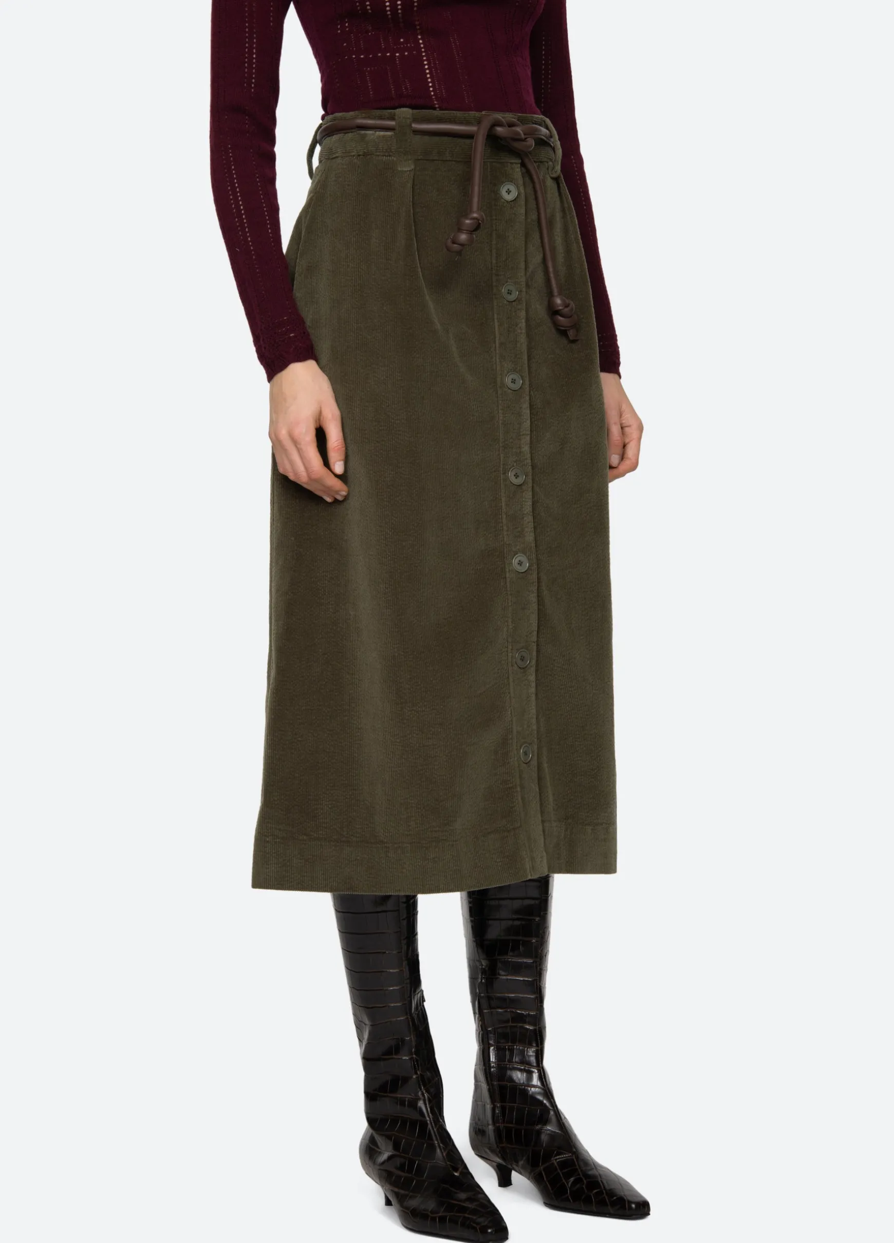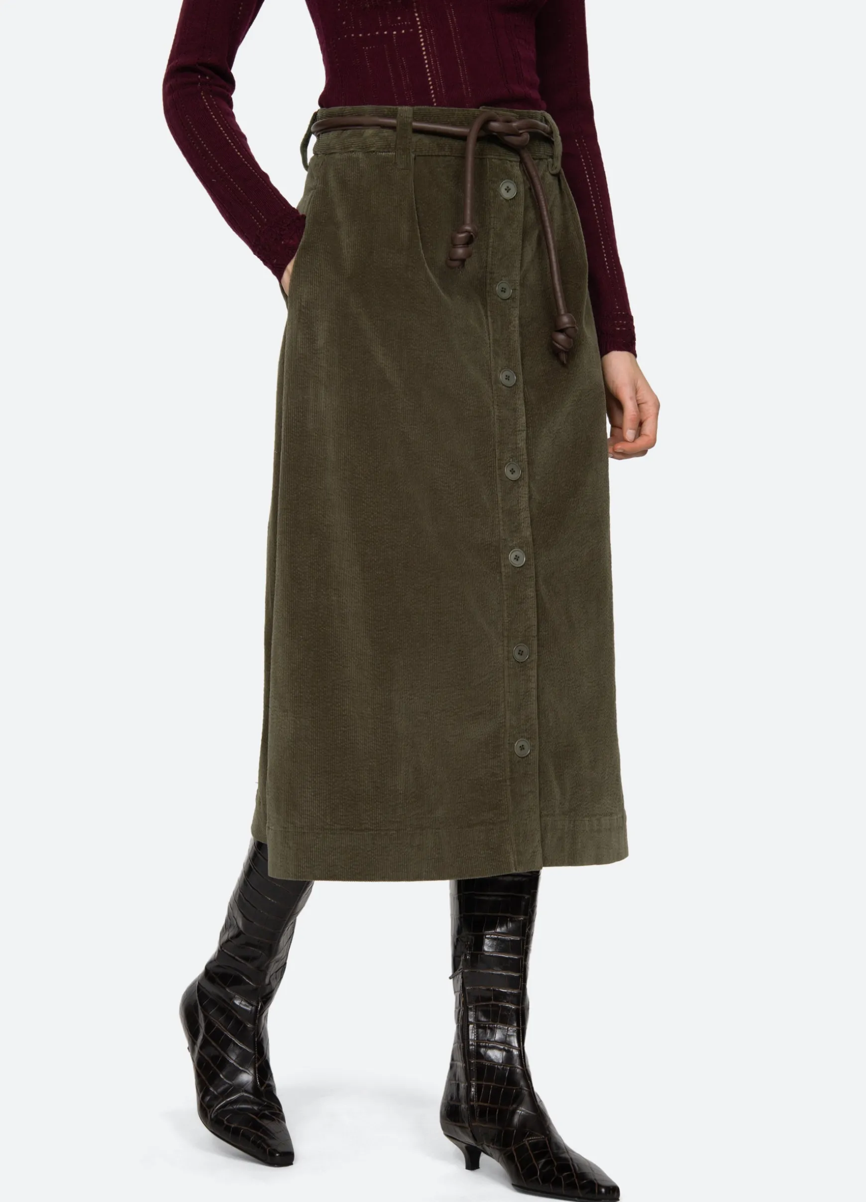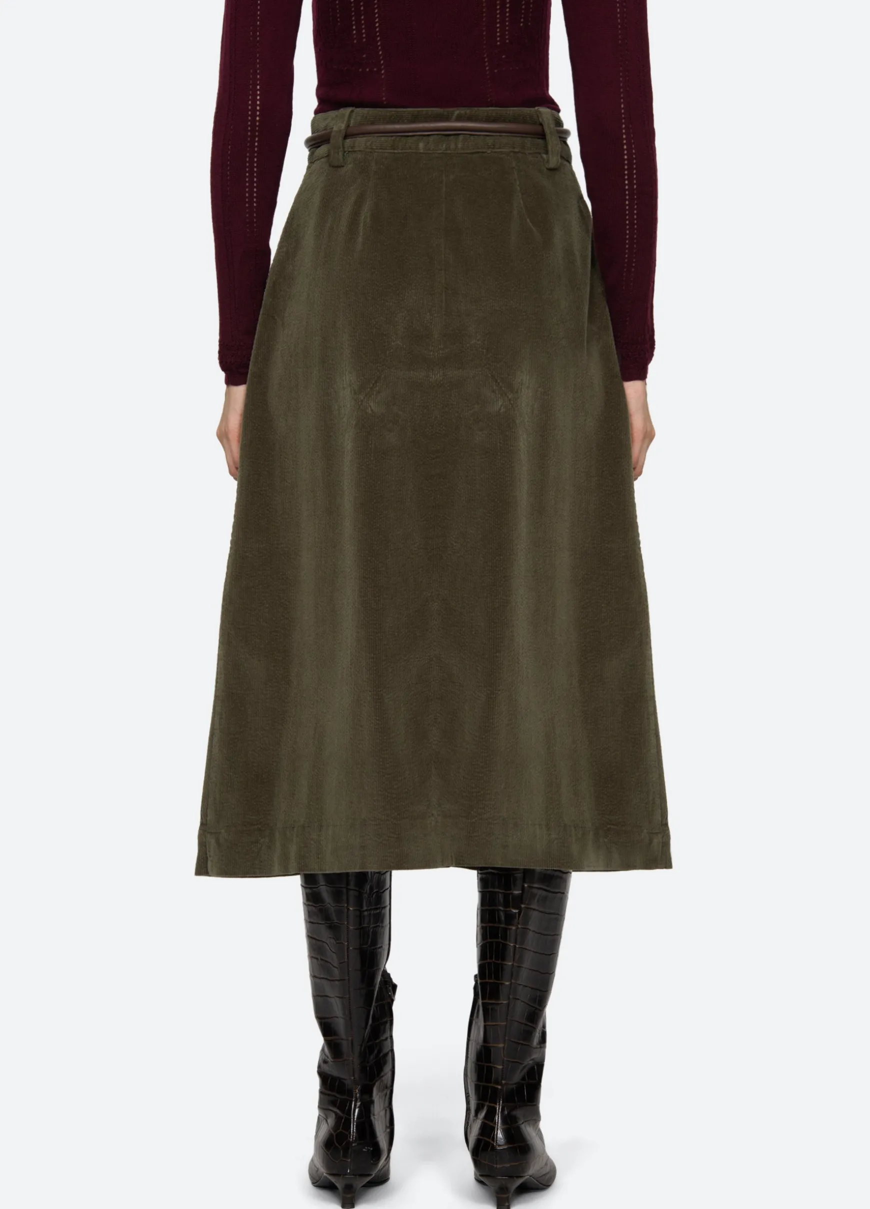 The Carine corduroy skirt features a high waisted and A-line silhouette and a removable belt.