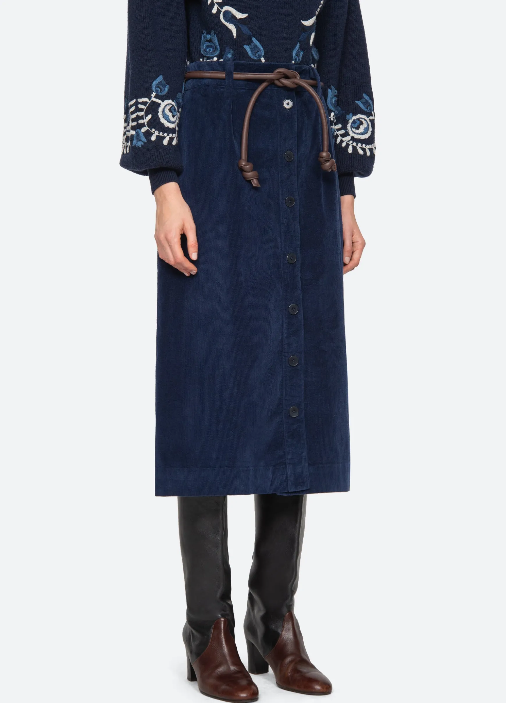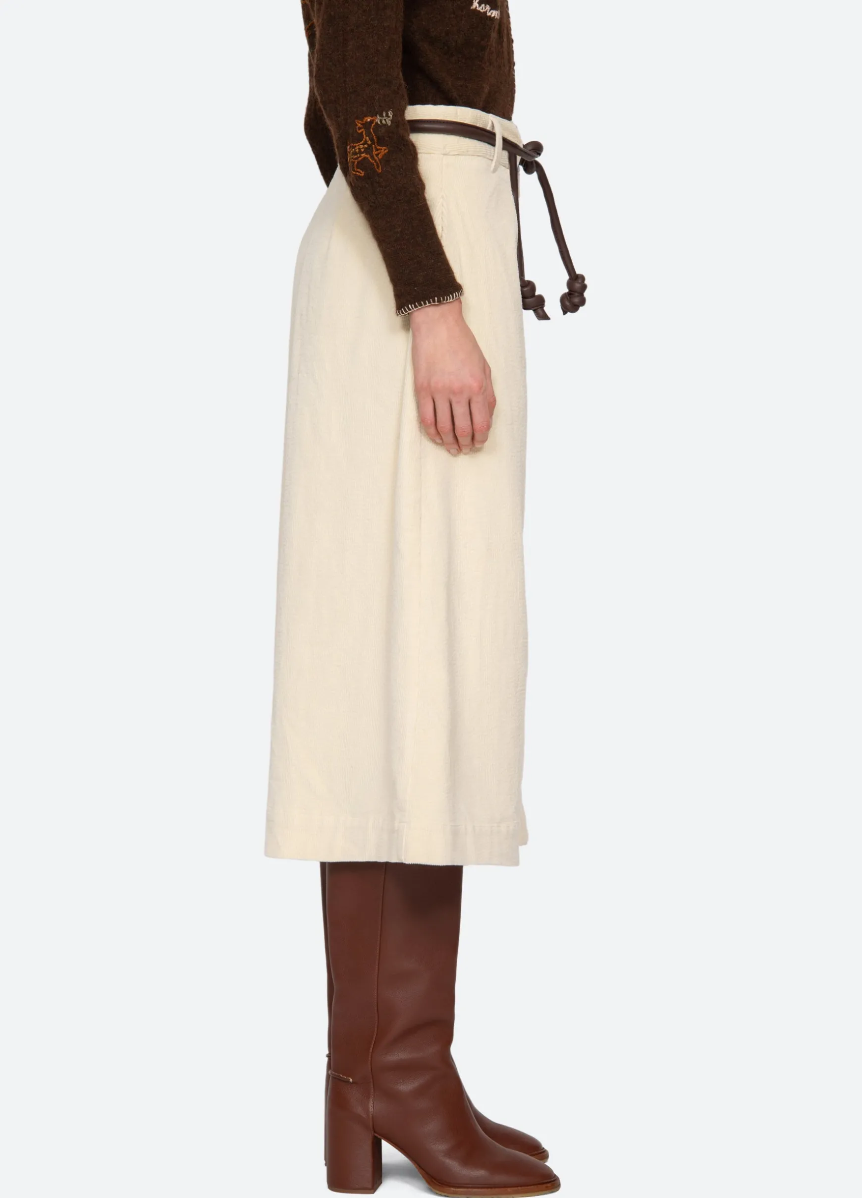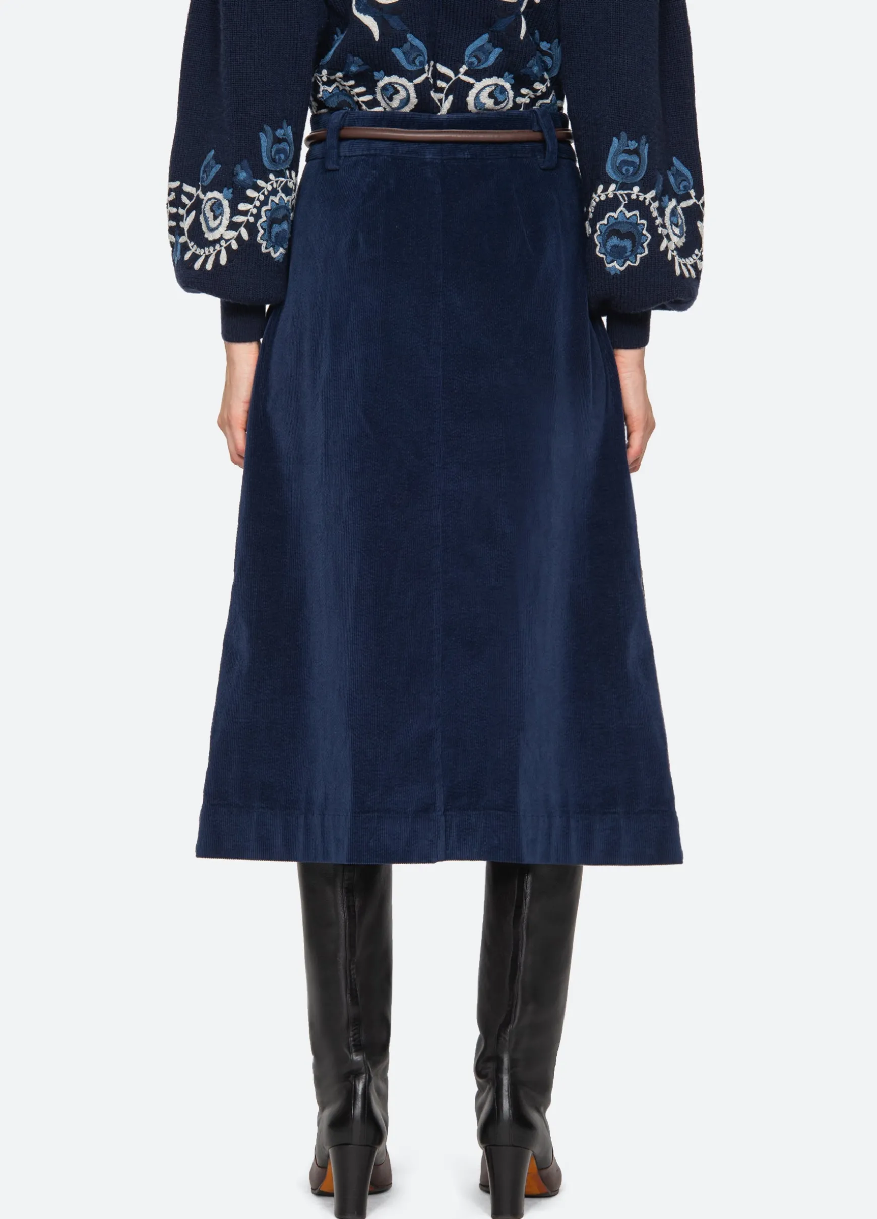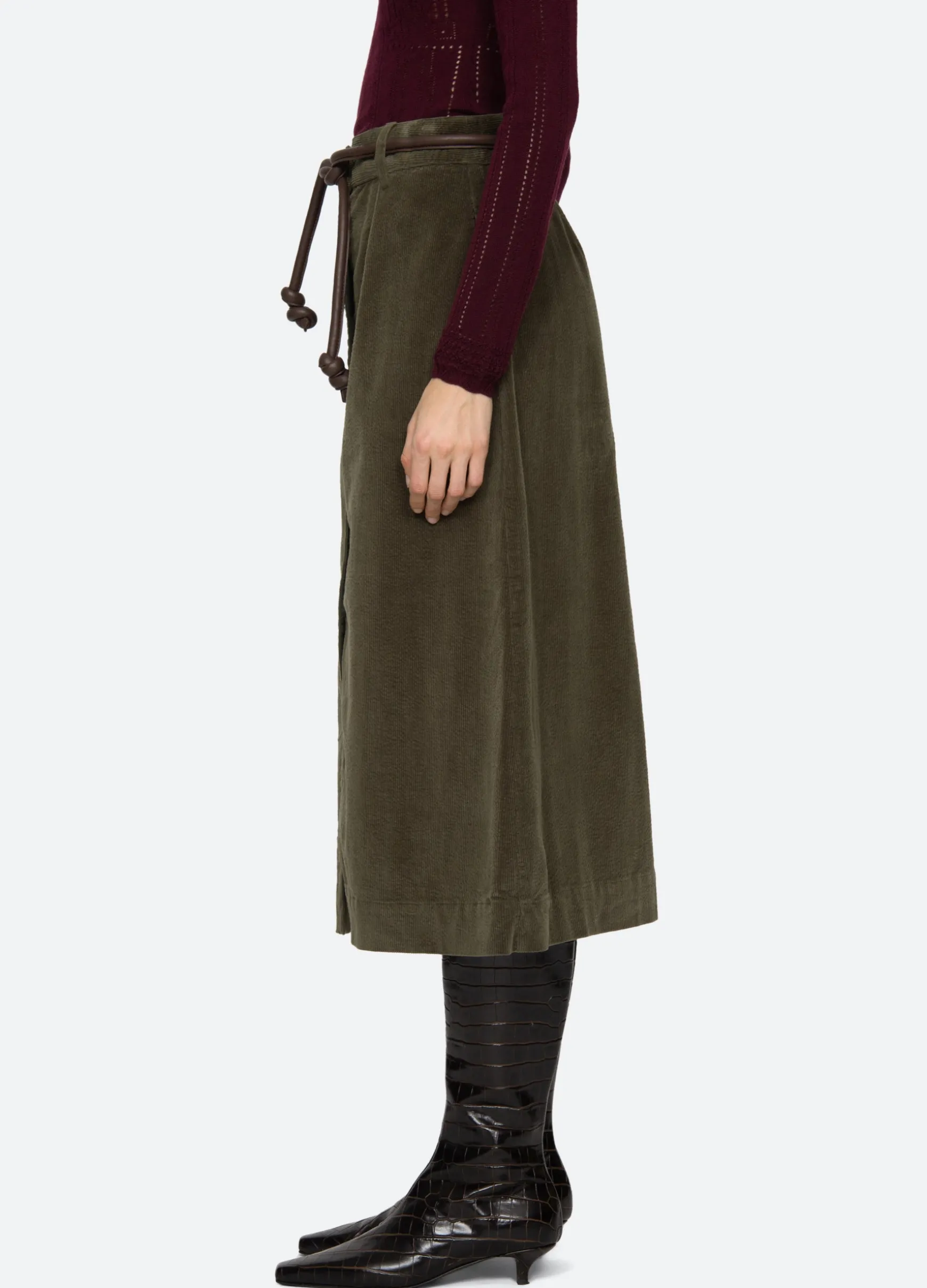 The Carine corduroy skirt features a high waisted and A-line silhouette and a removable belt.