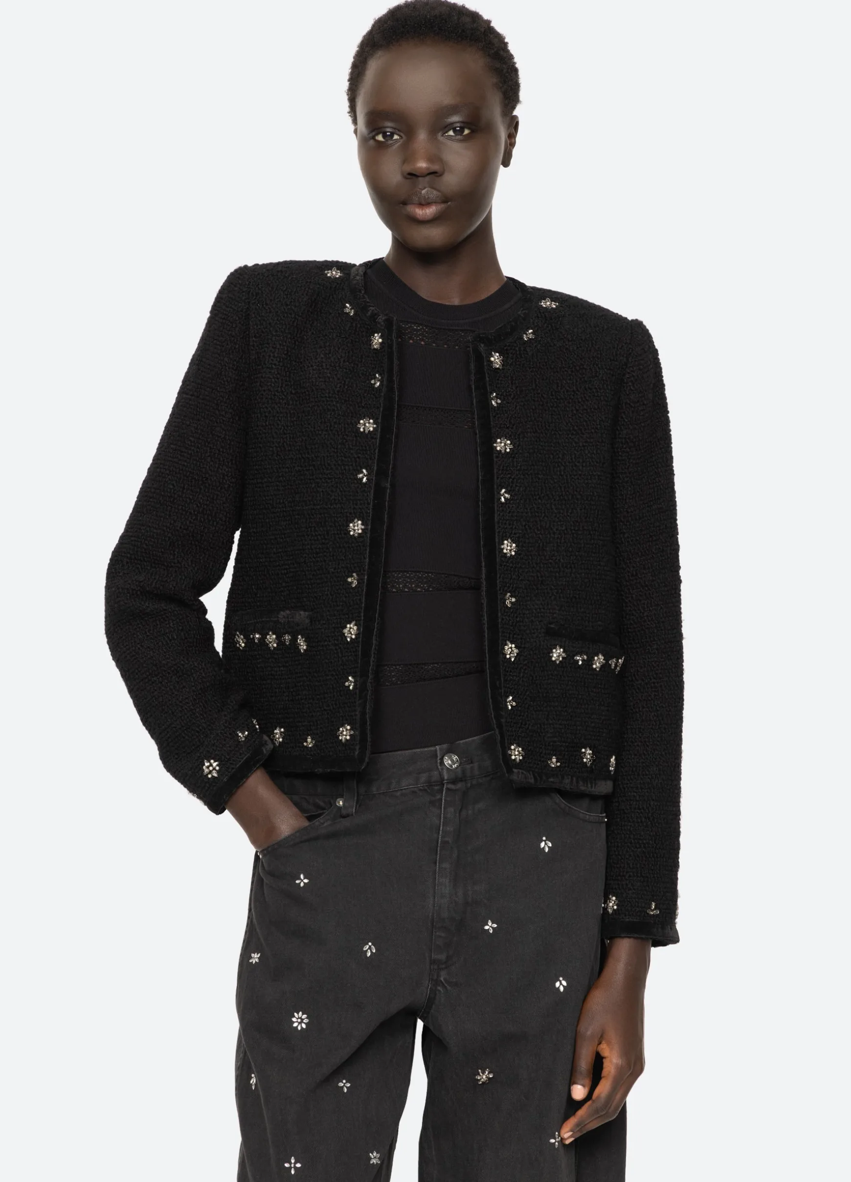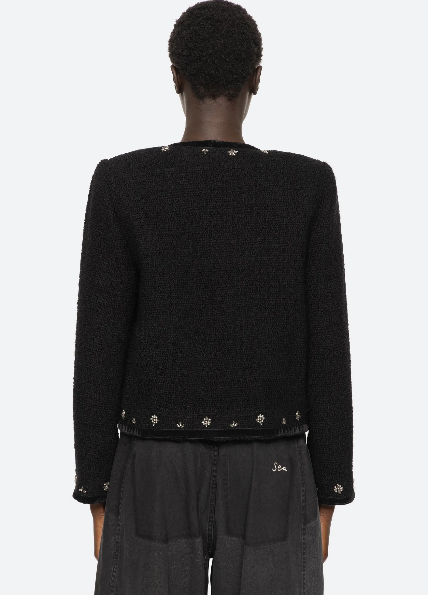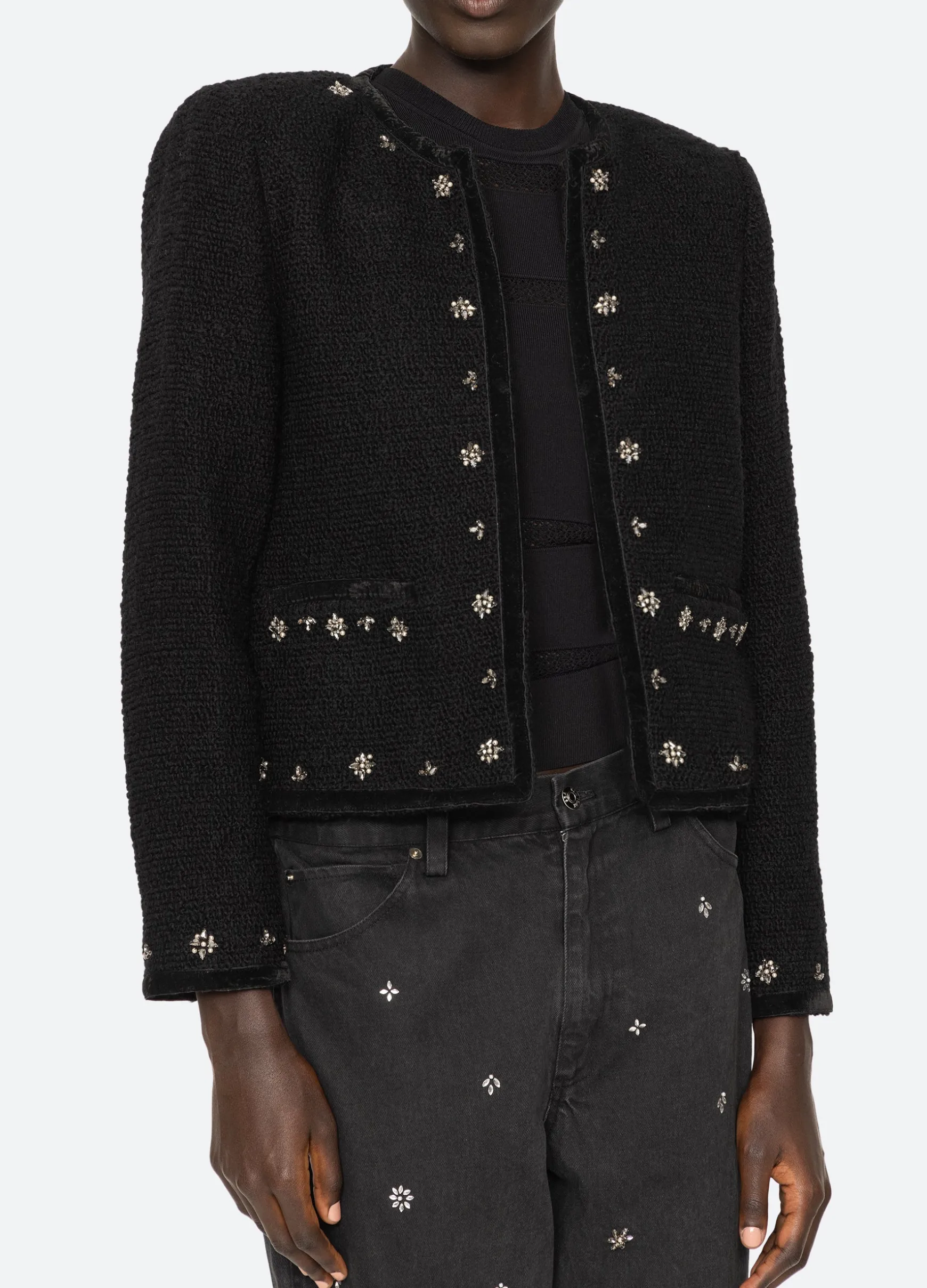 The Caryl beaded jacket is accented with rhinestones, pearls and velvet trim.