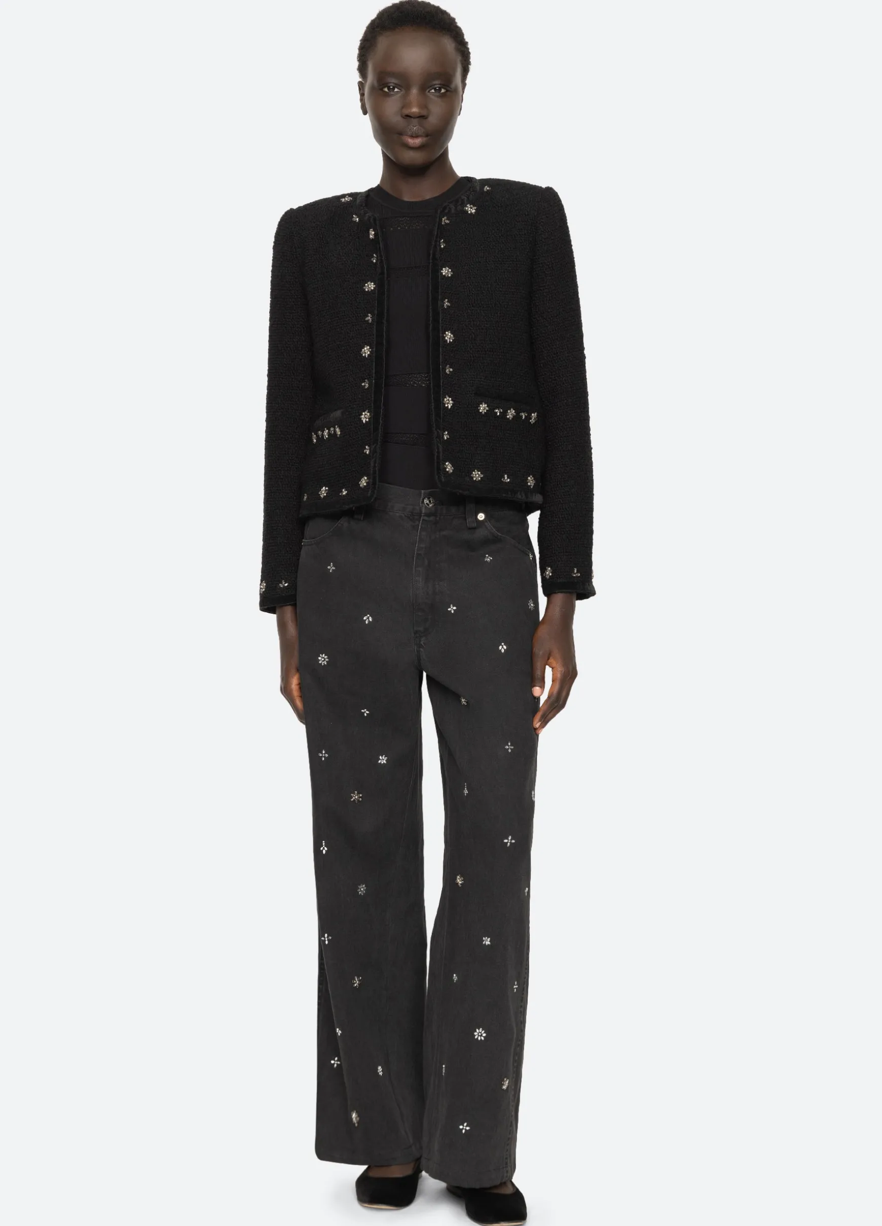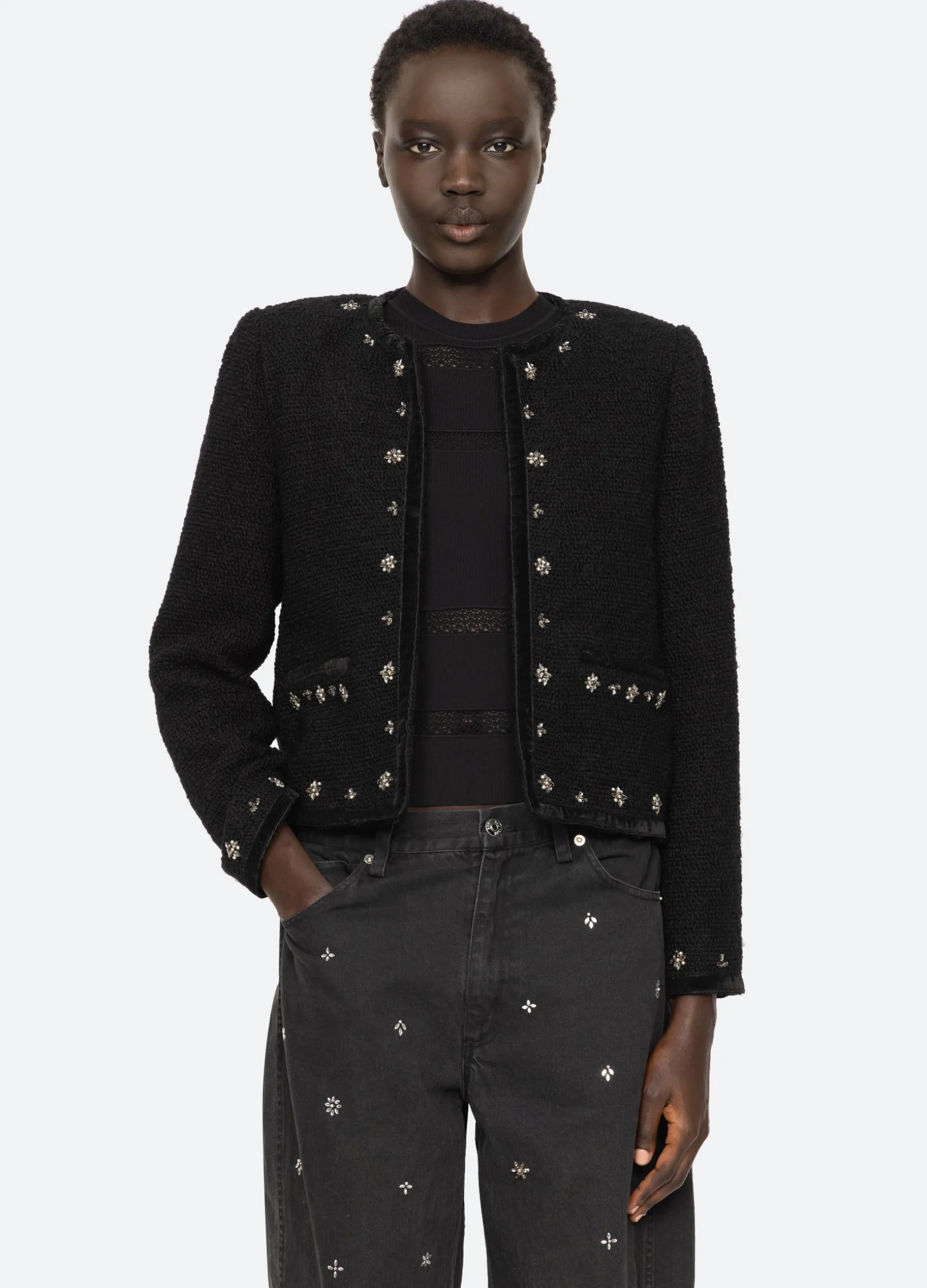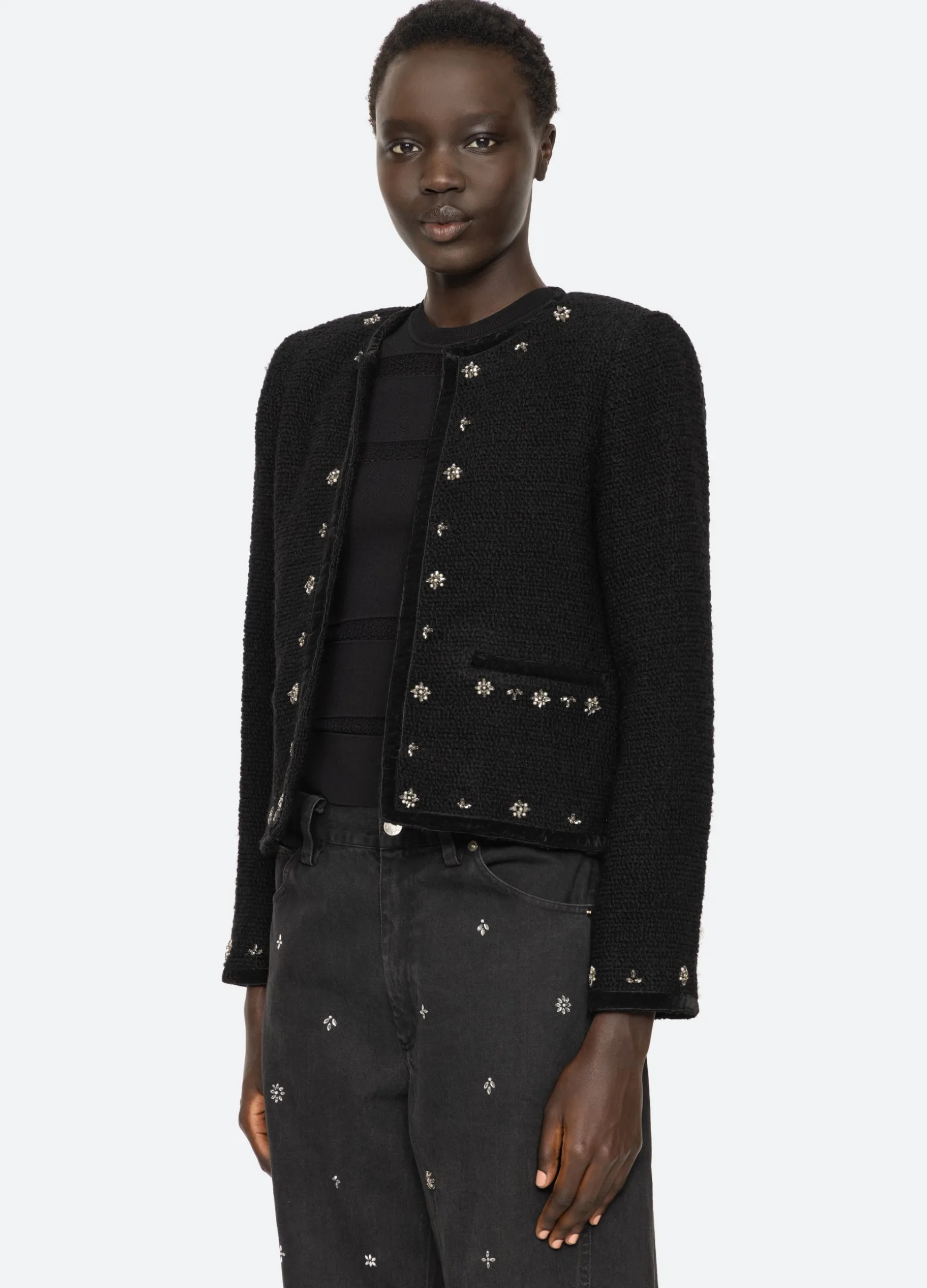 The Caryl beaded jacket is accented with rhinestones, pearls and velvet trim.