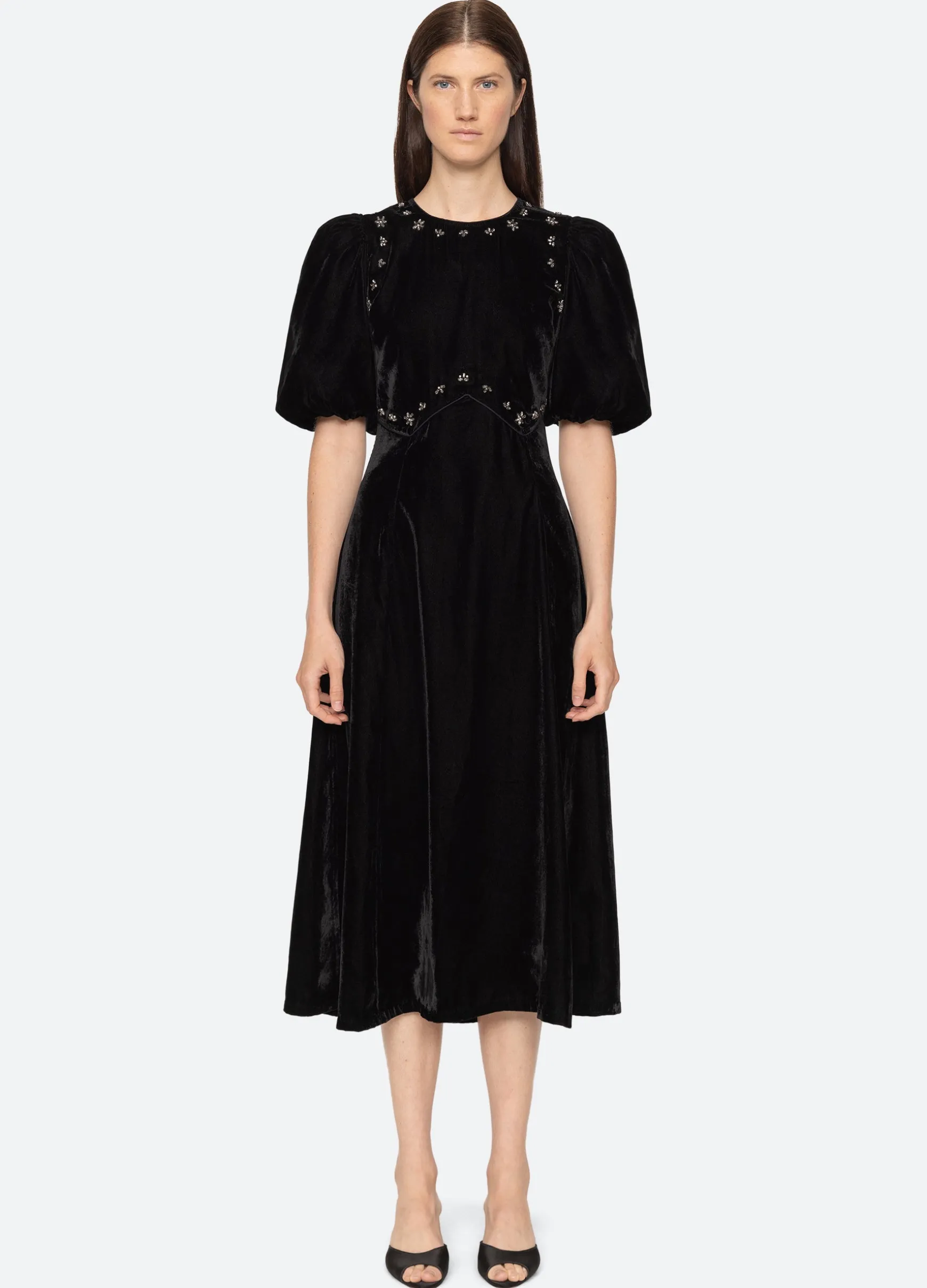 The Caryl beaded short sleeve velvet dressfeatures puff sleeves and rhinestone and pearl detailing.