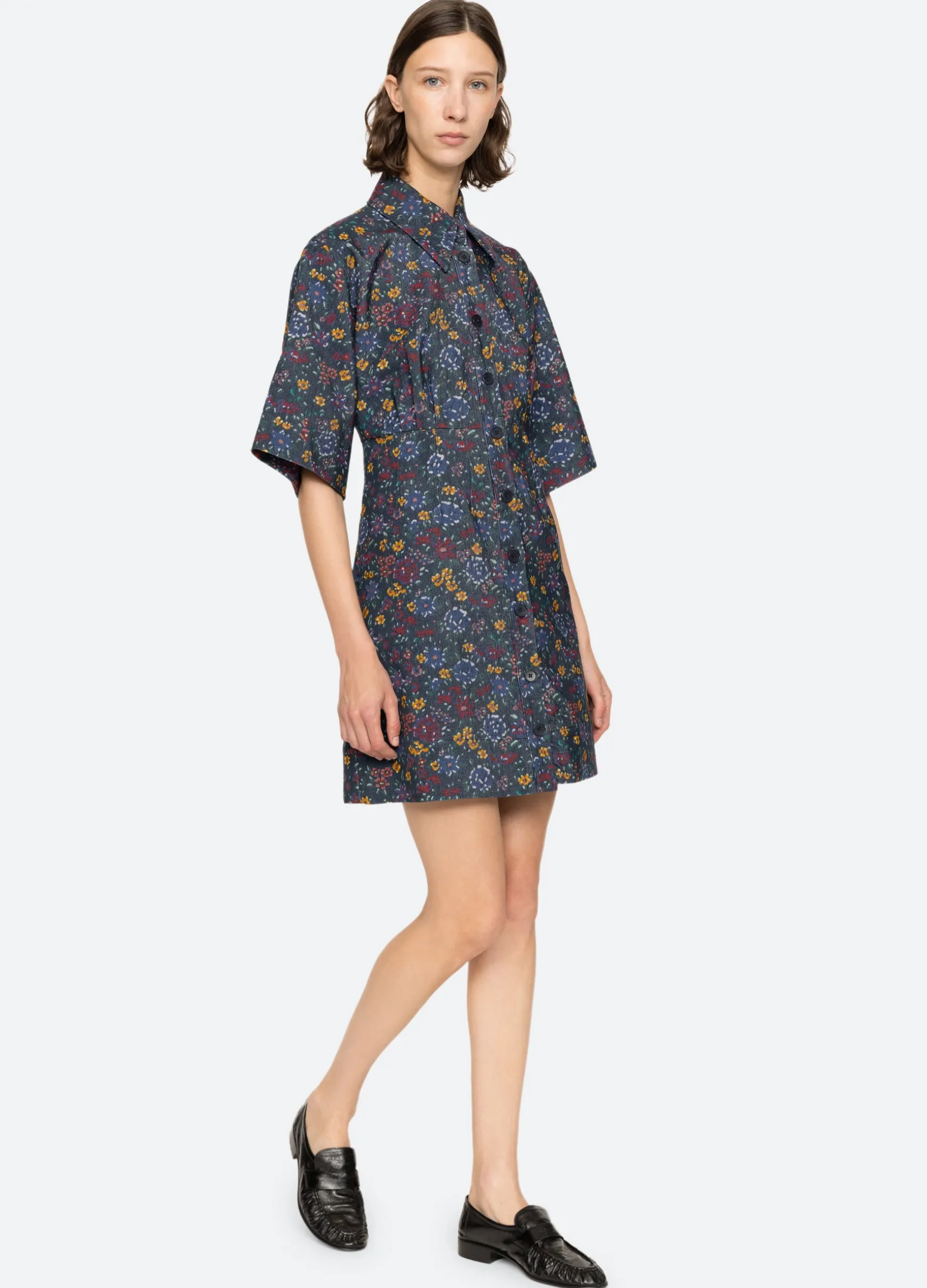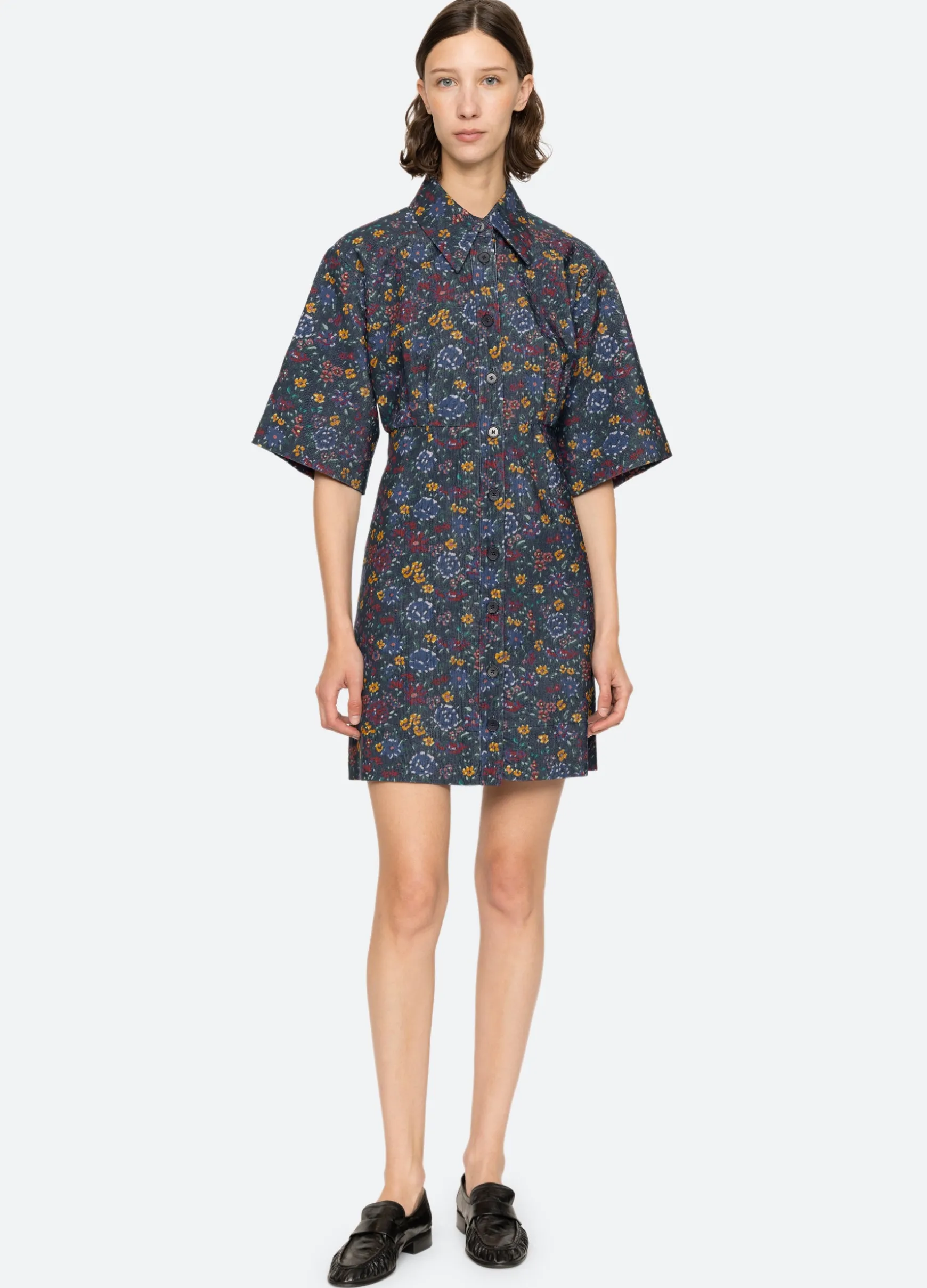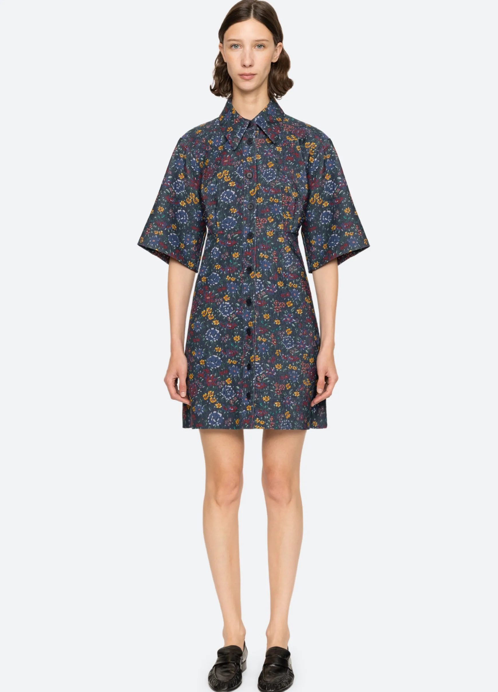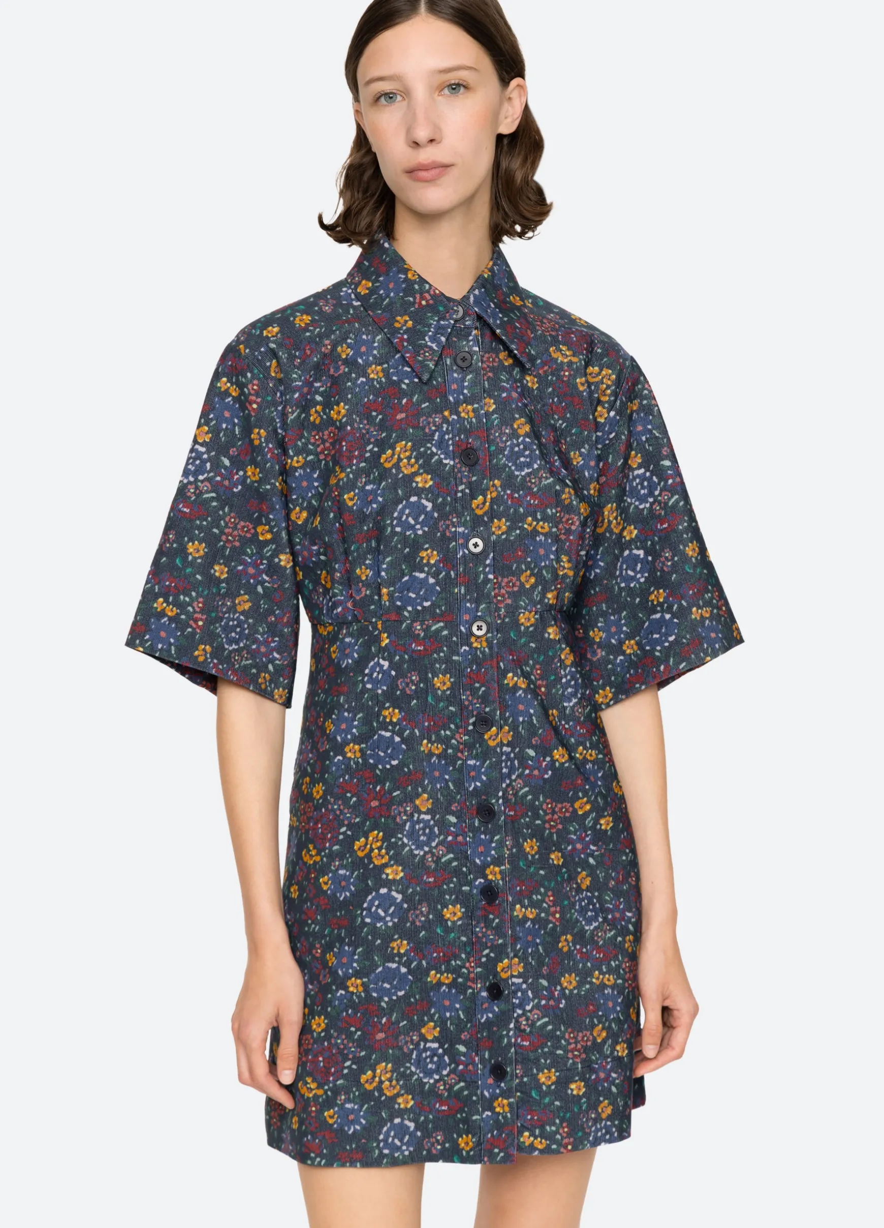 The Constance corduroy floral print dress features short sleeves, button front and mini silhouette.