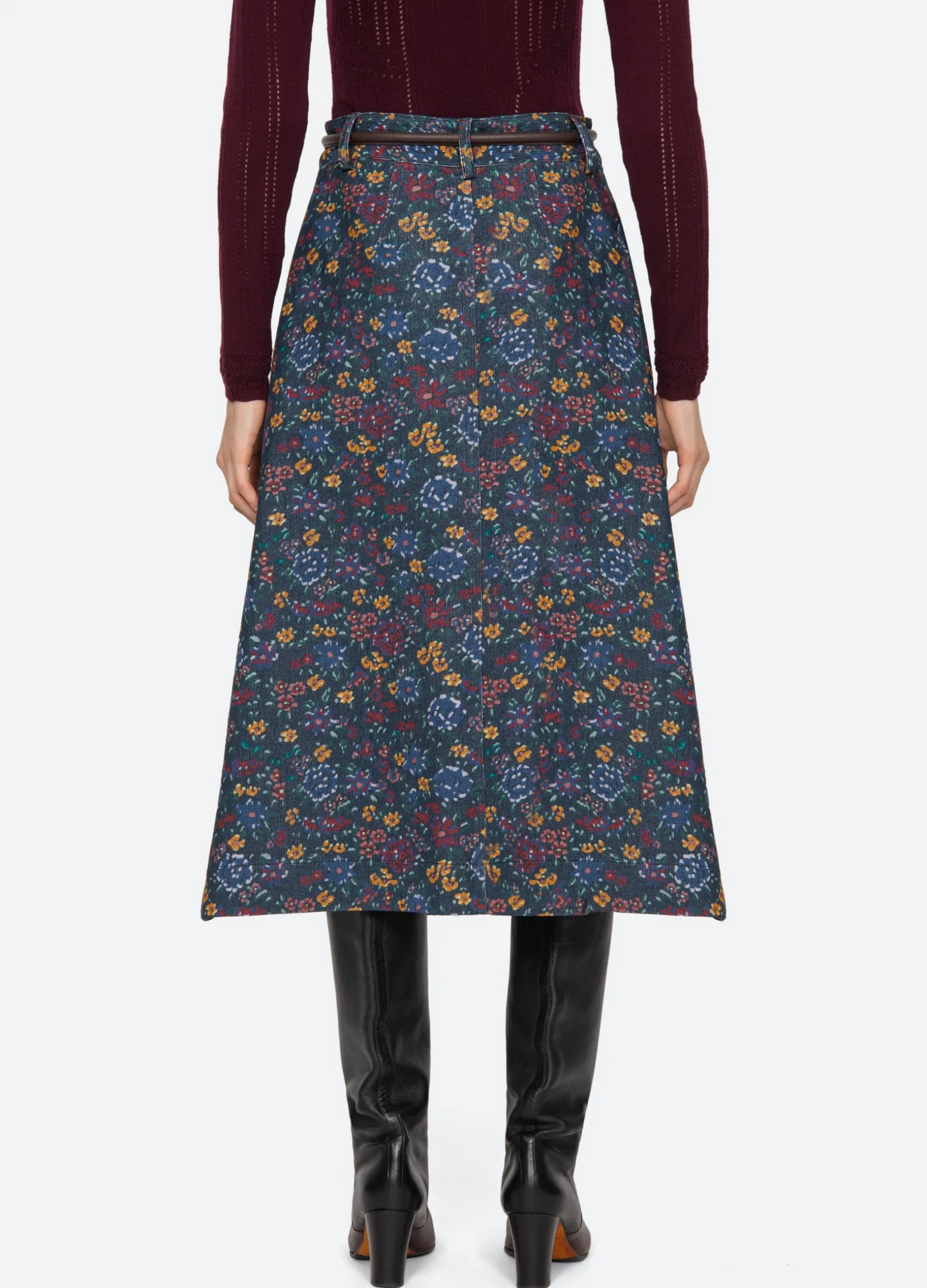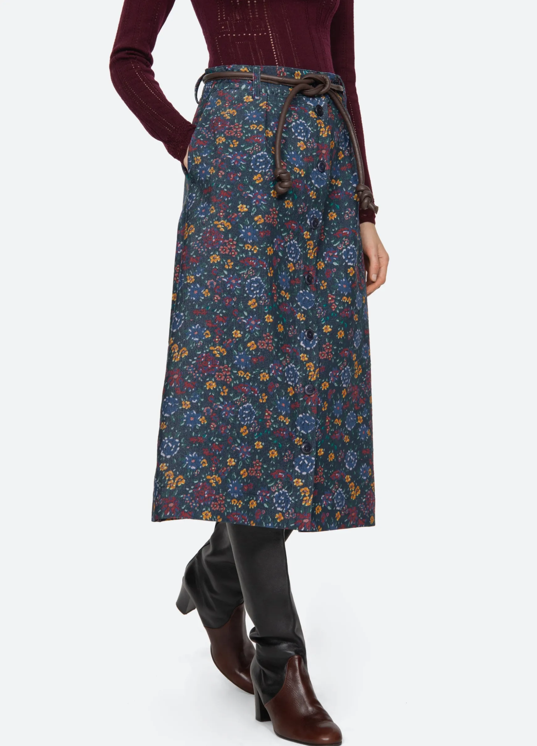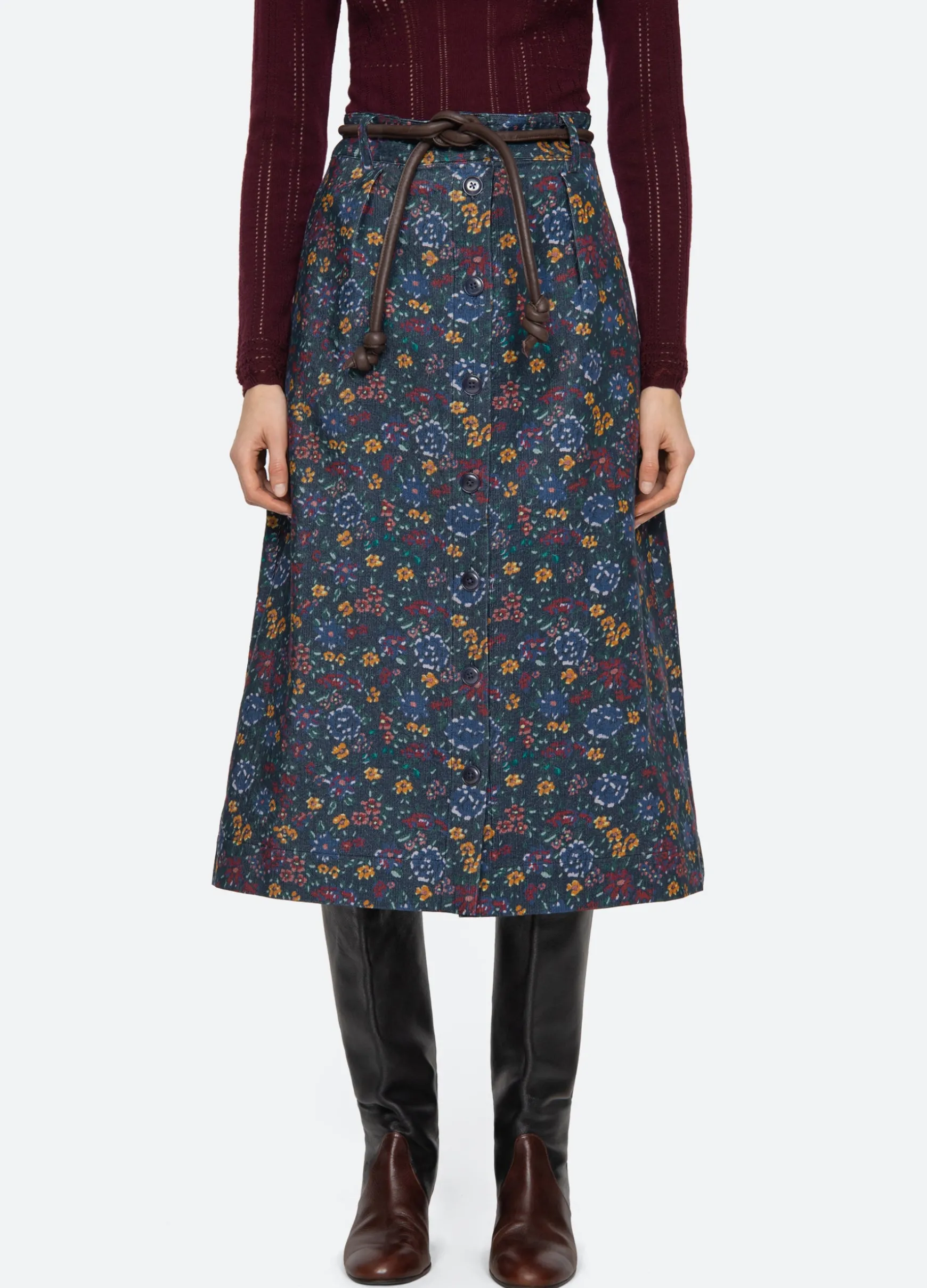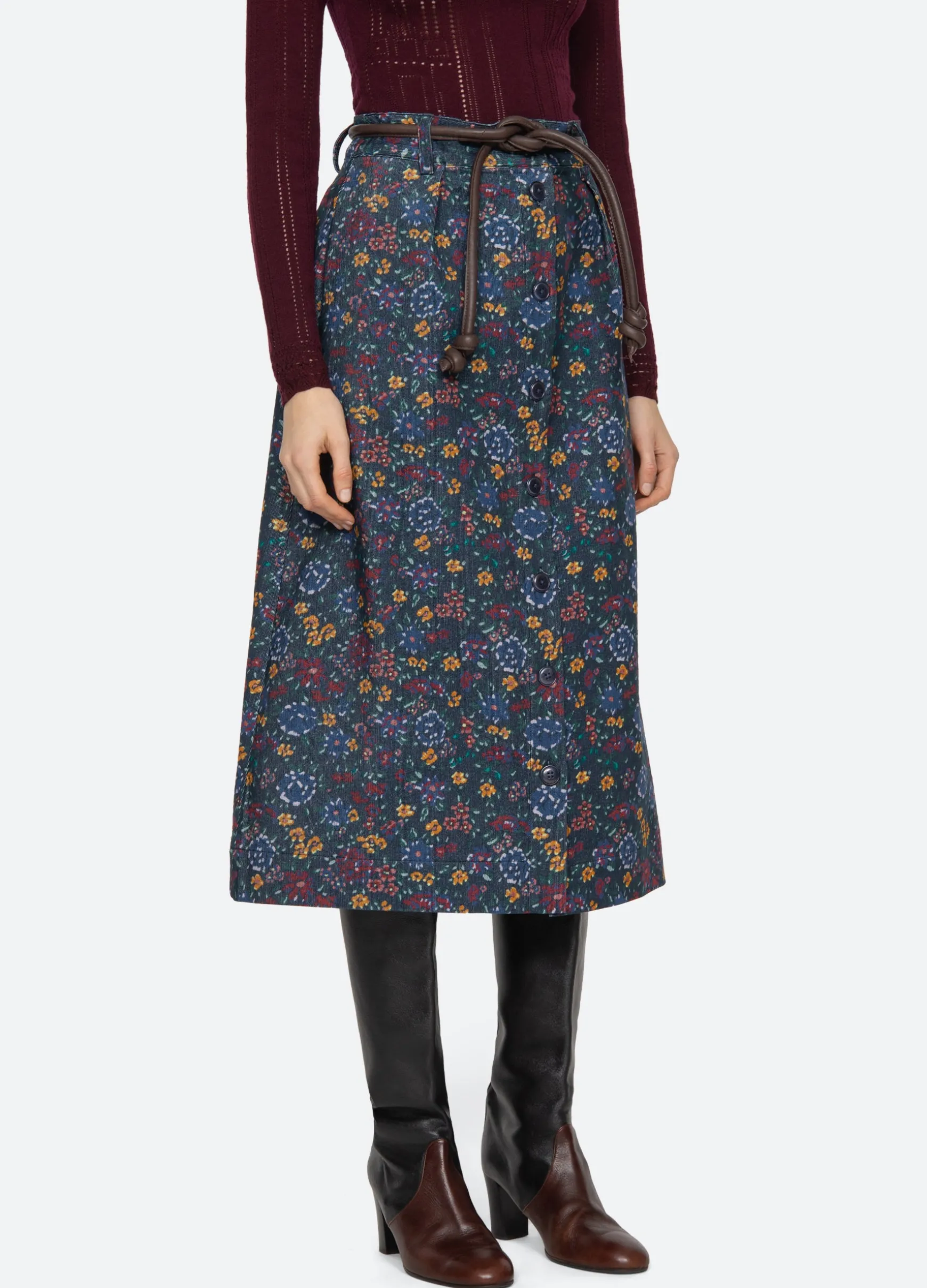 The Constance corduroy floral print skirt featuresan A-line silhouette, button front detailing and removable leather belt.