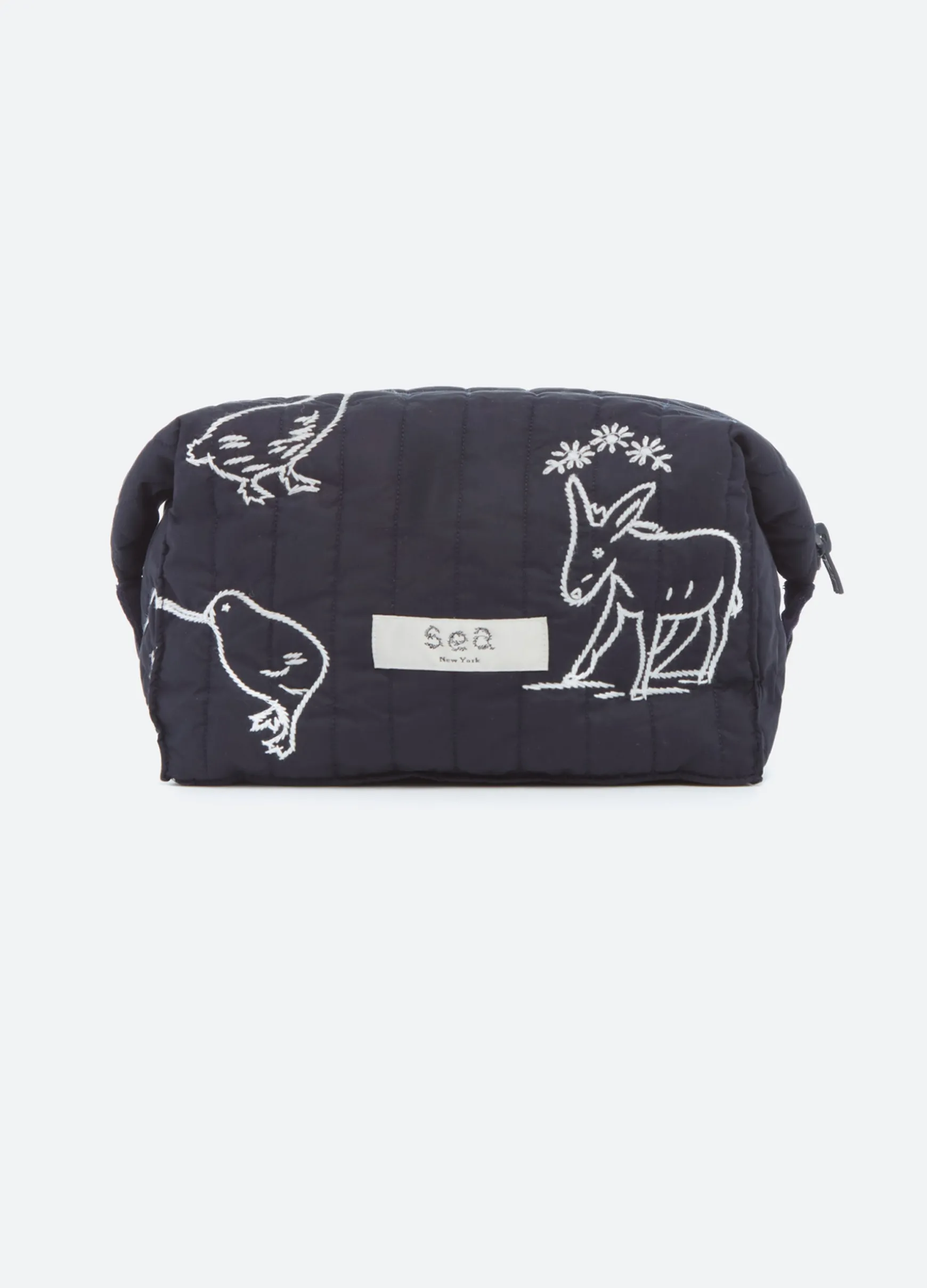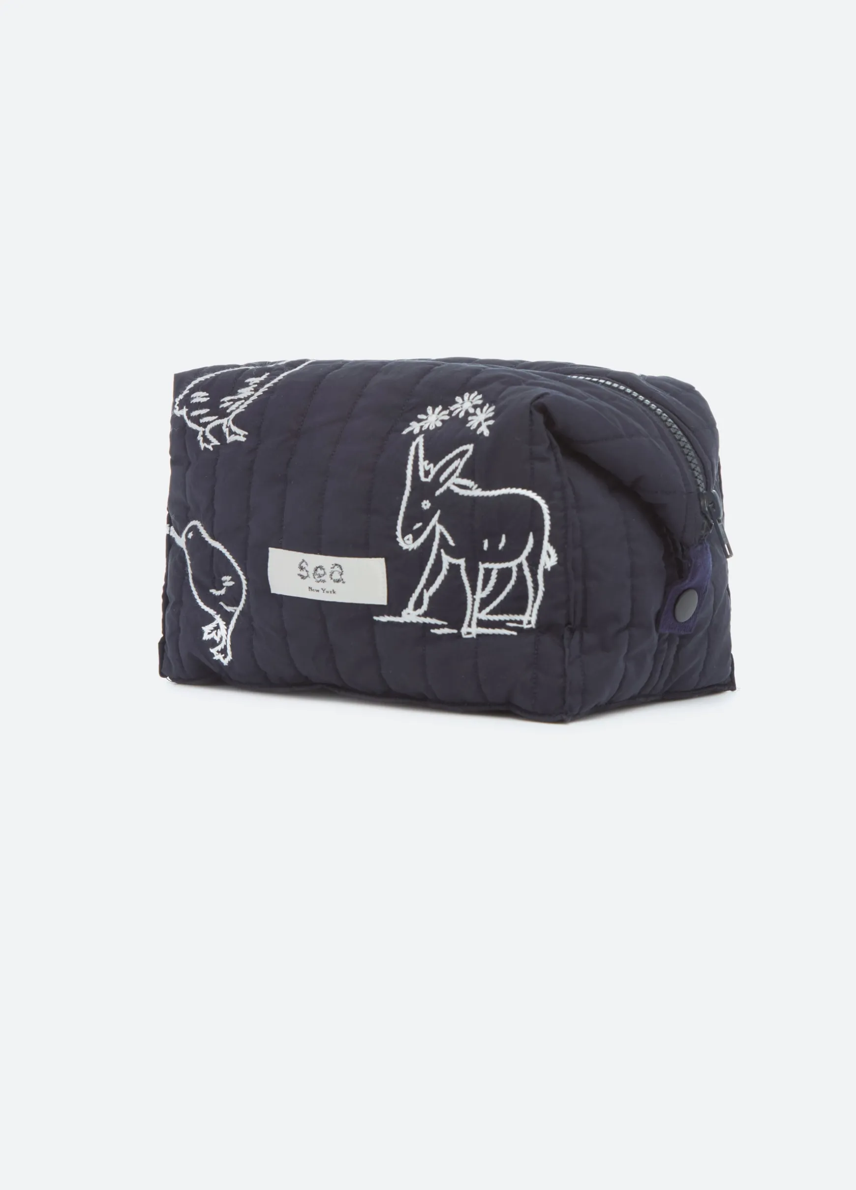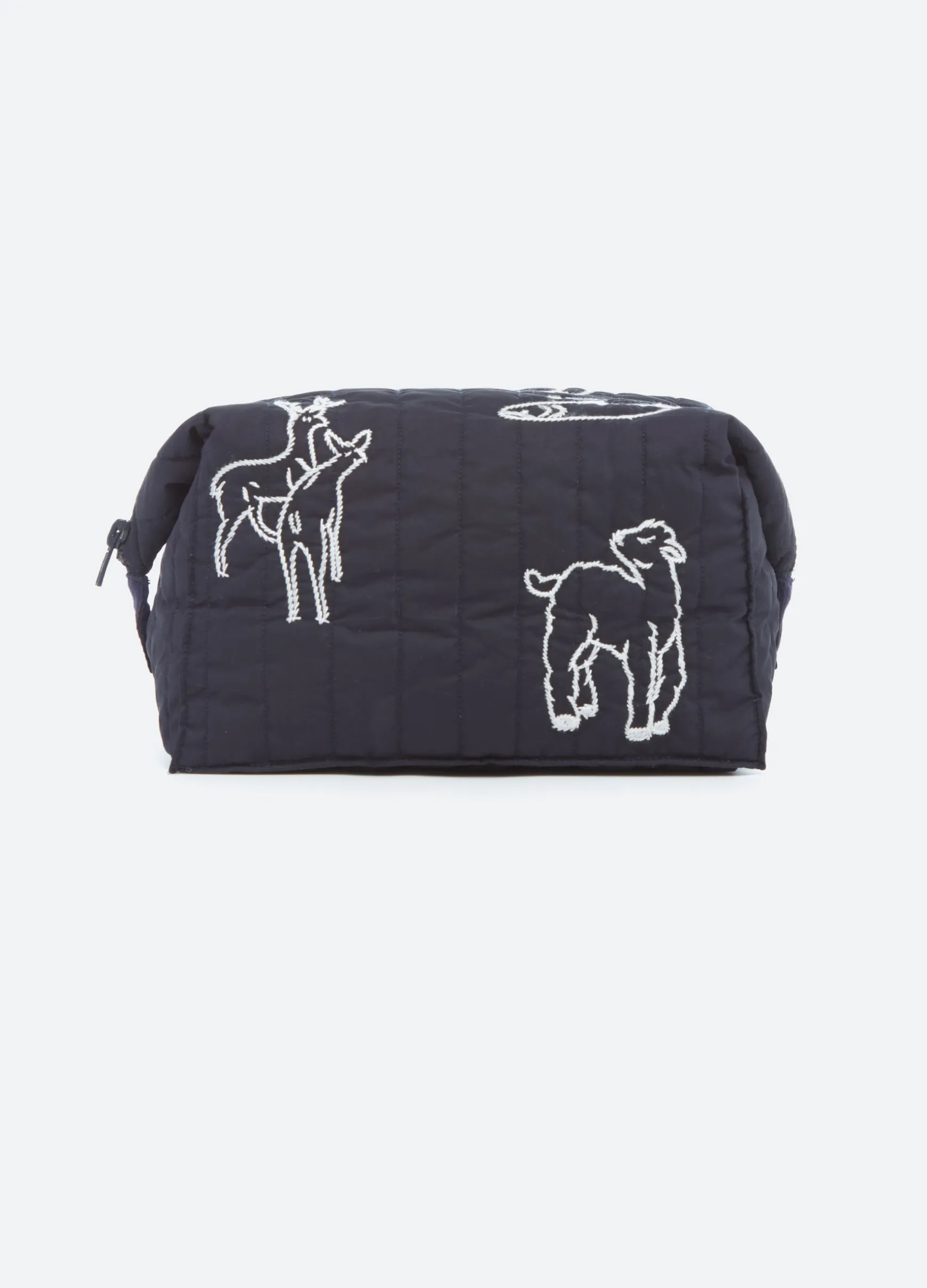 The Demi cosmetic bag features playful animal embroidered detailing throughout.