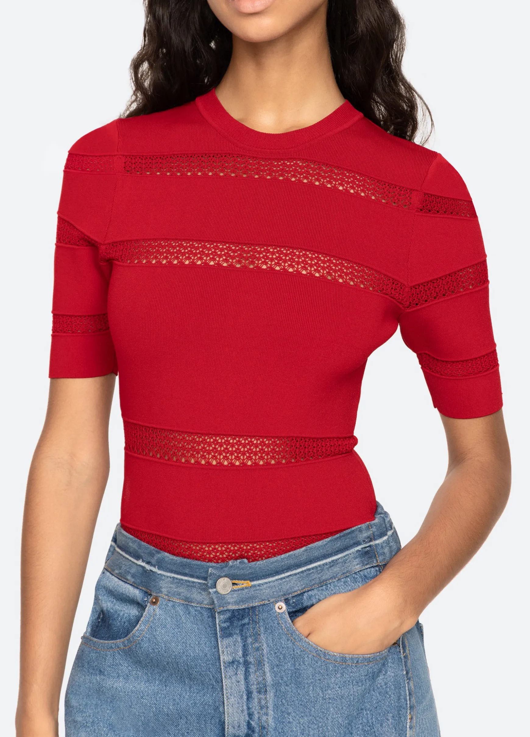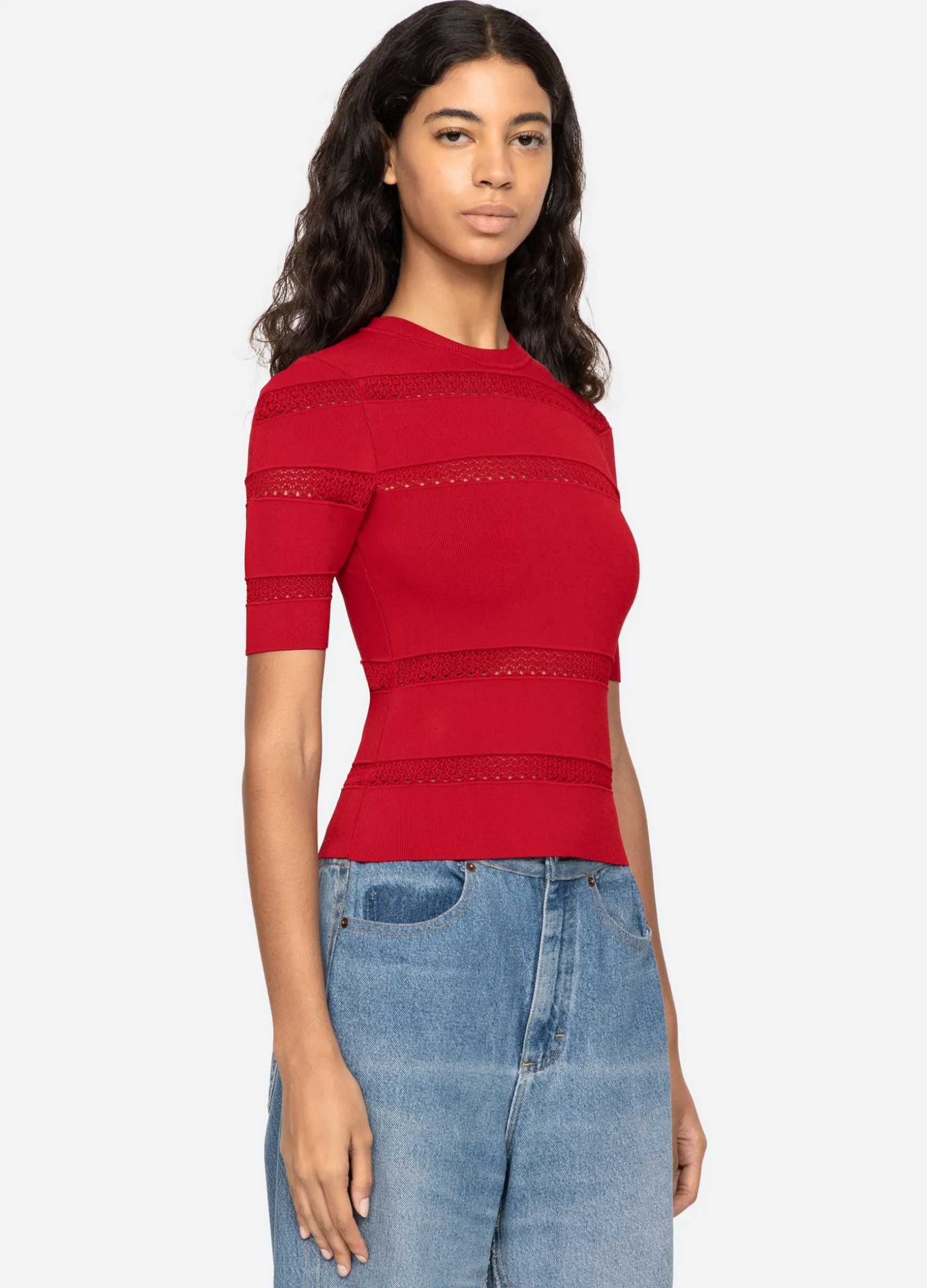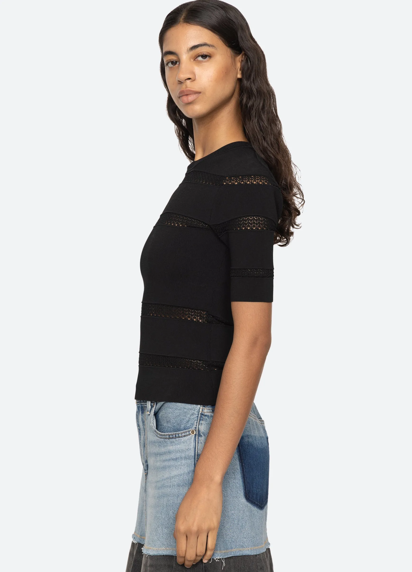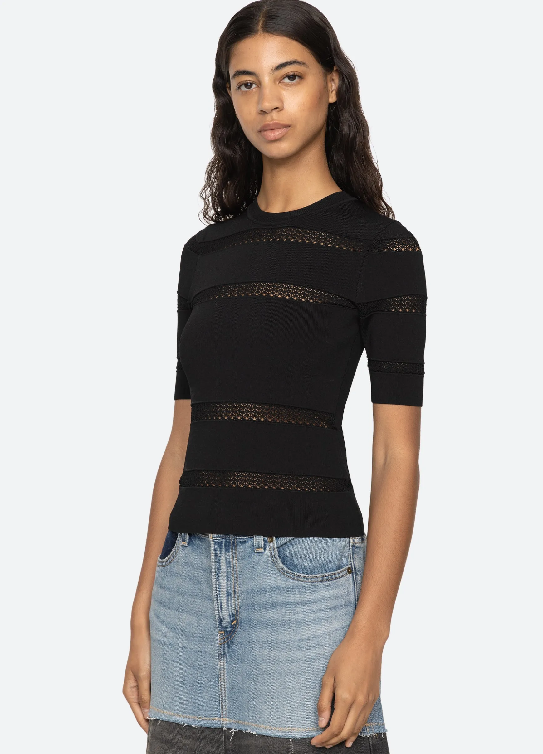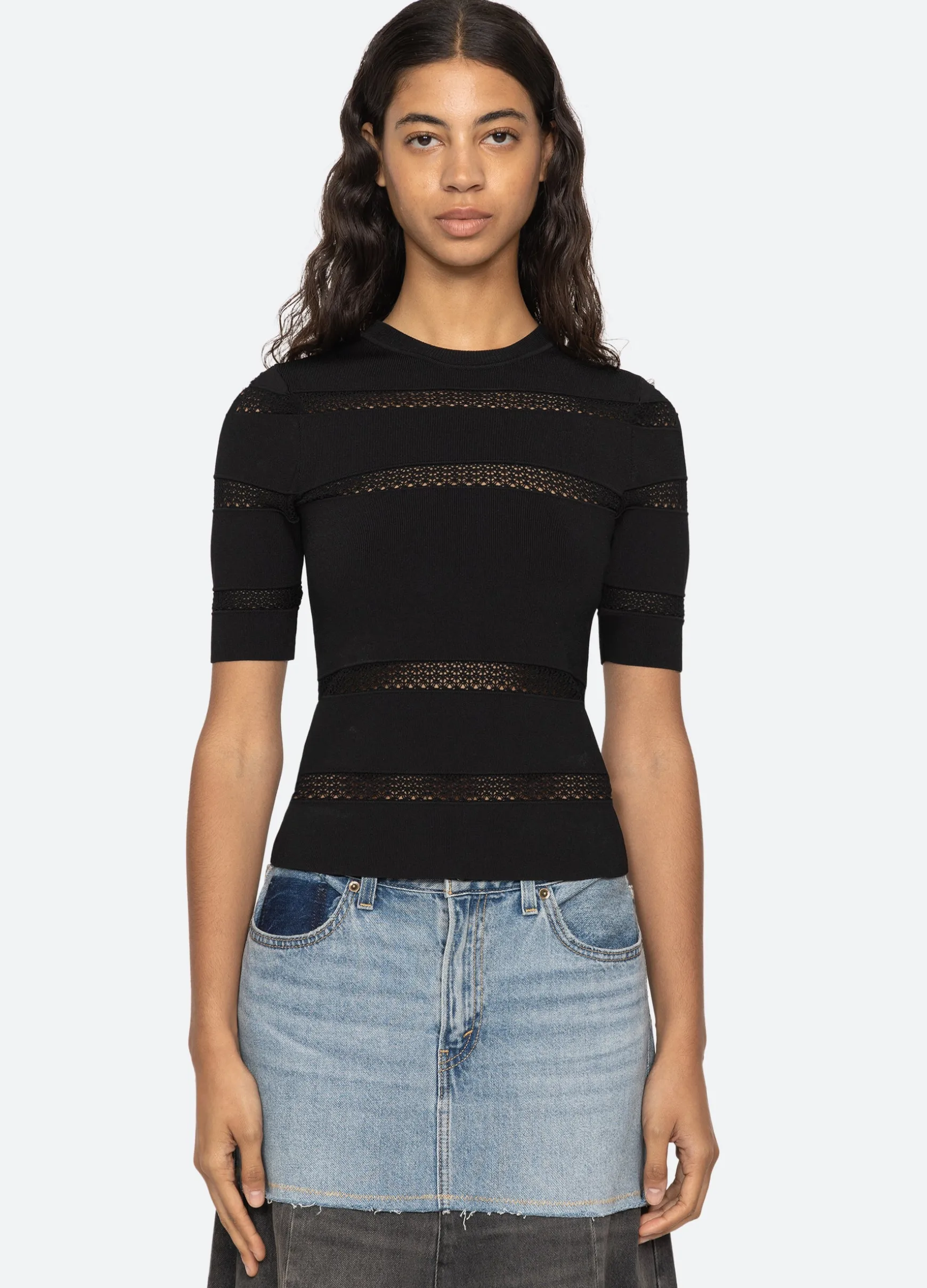 The Devon knit short sleeve top features sheer accents and is designed for a slim fit. The perfect layering piece.