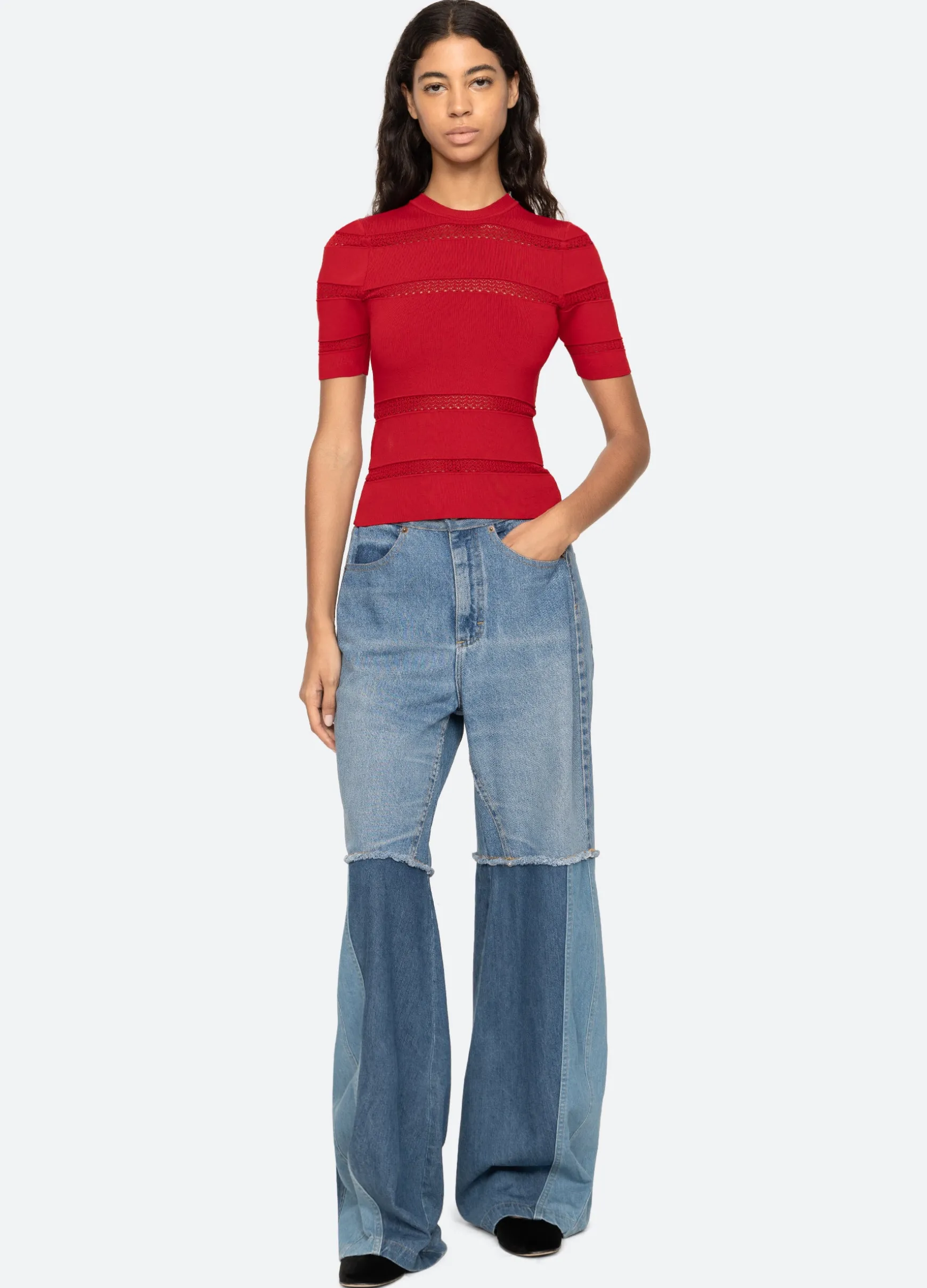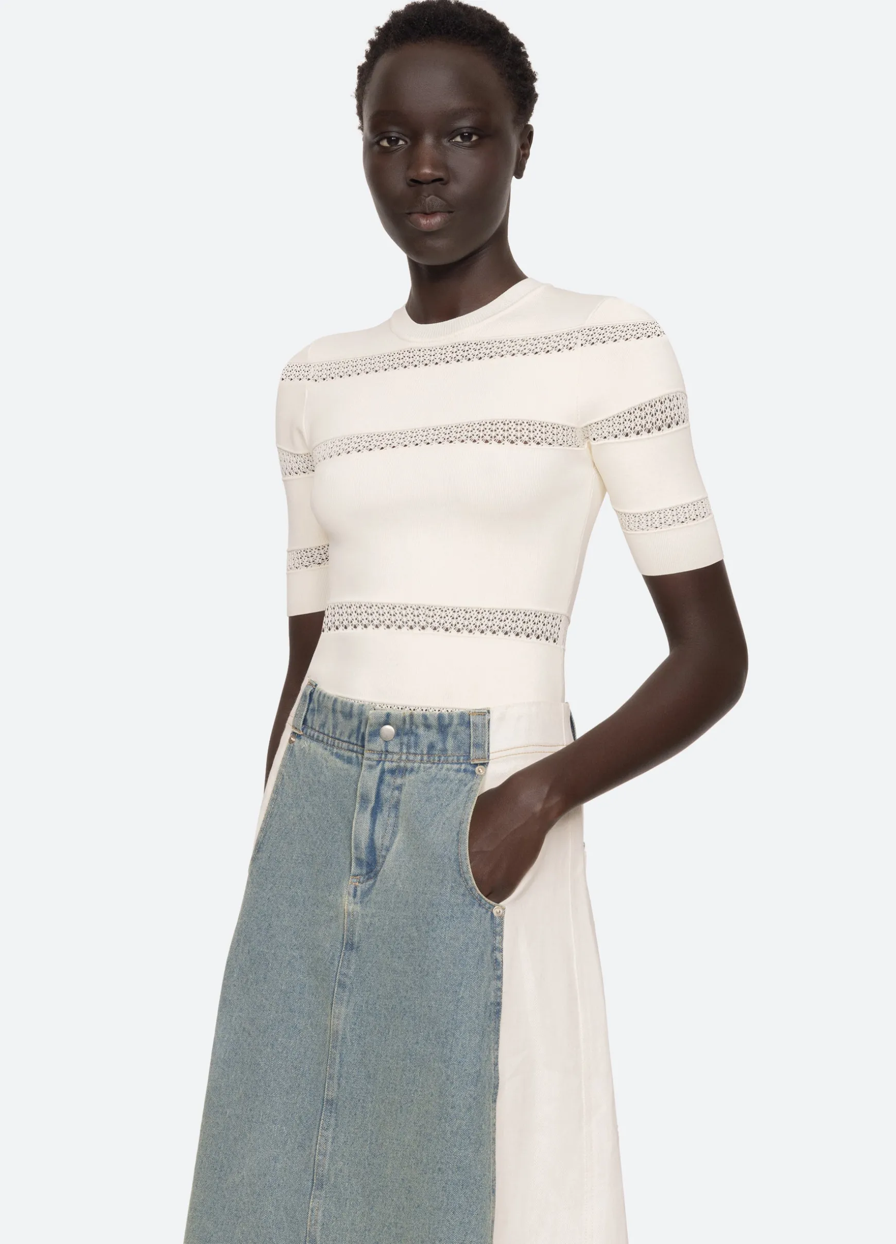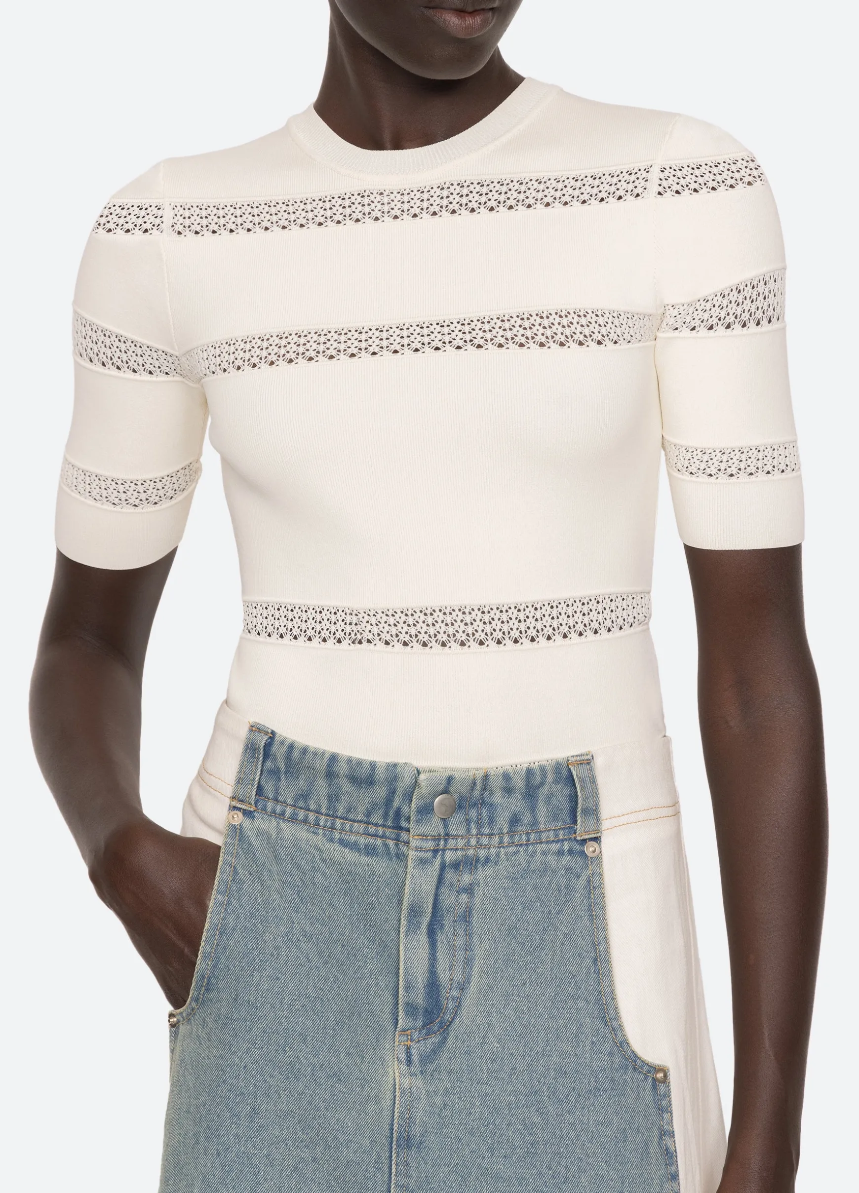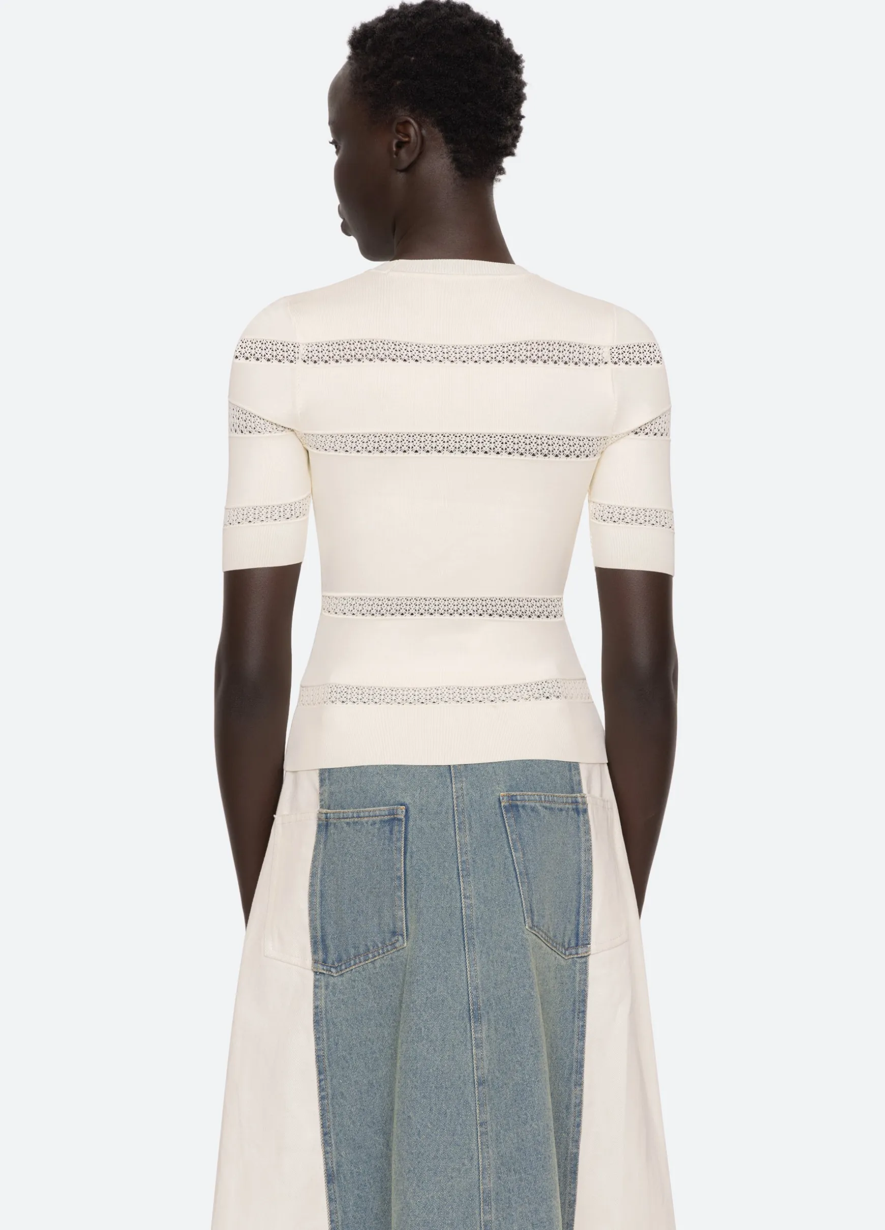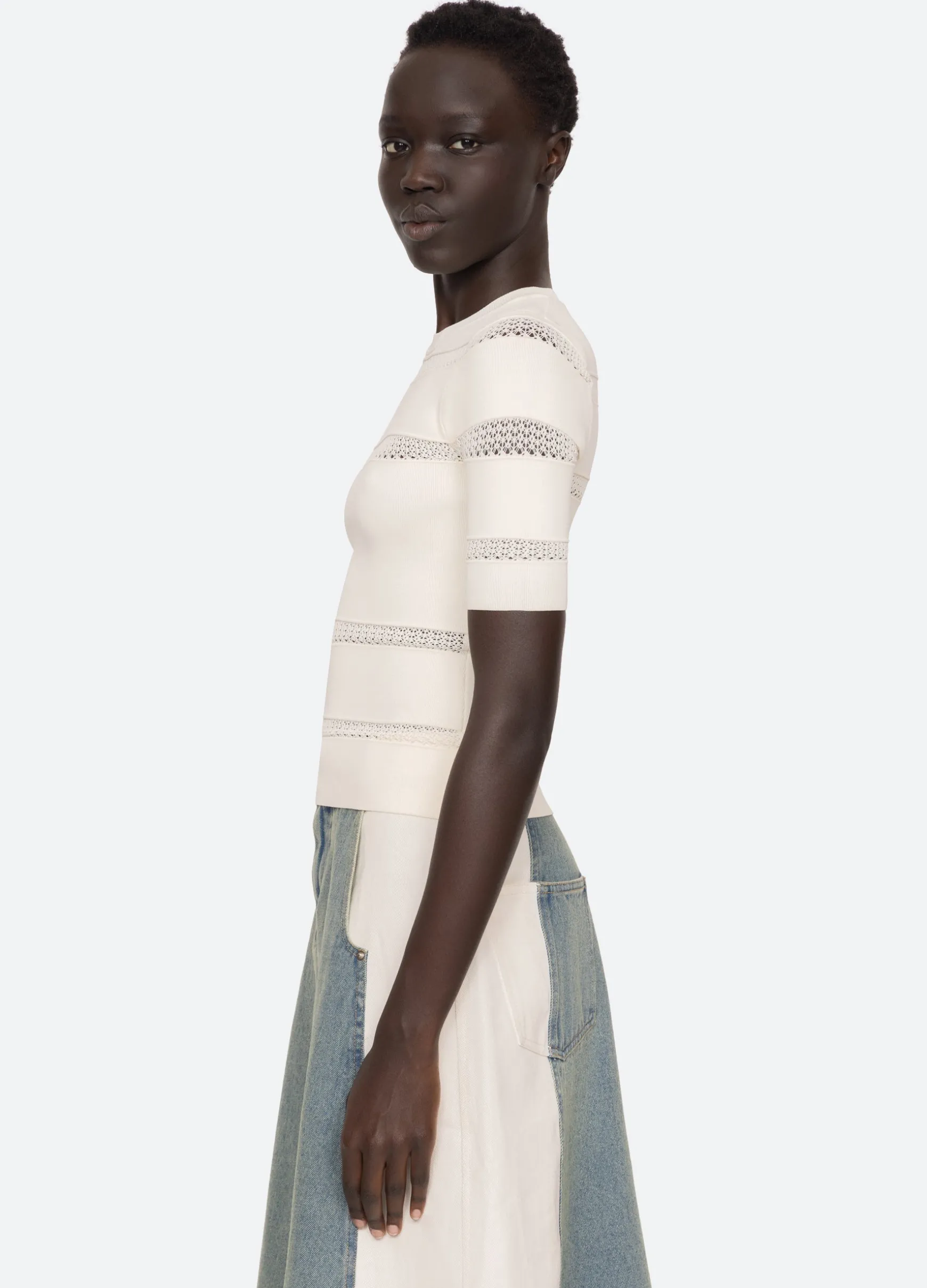 The Devon knit short sleeve top features sheer accents and is designed for a slim fit. The perfect layering piece.