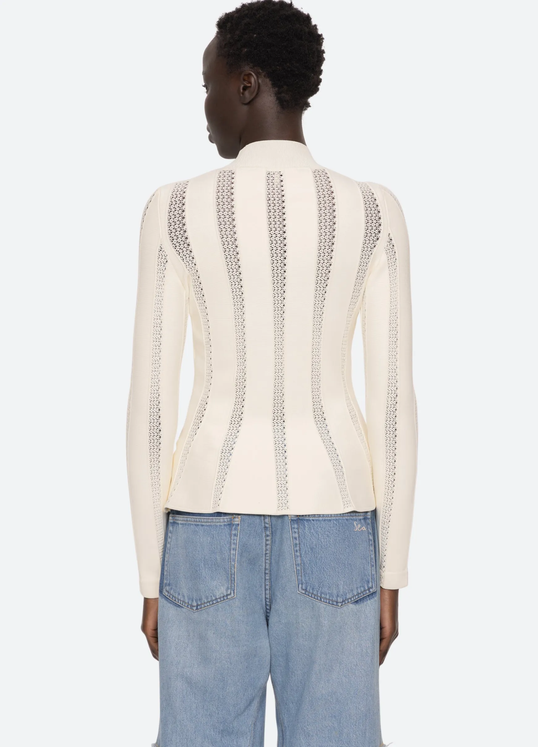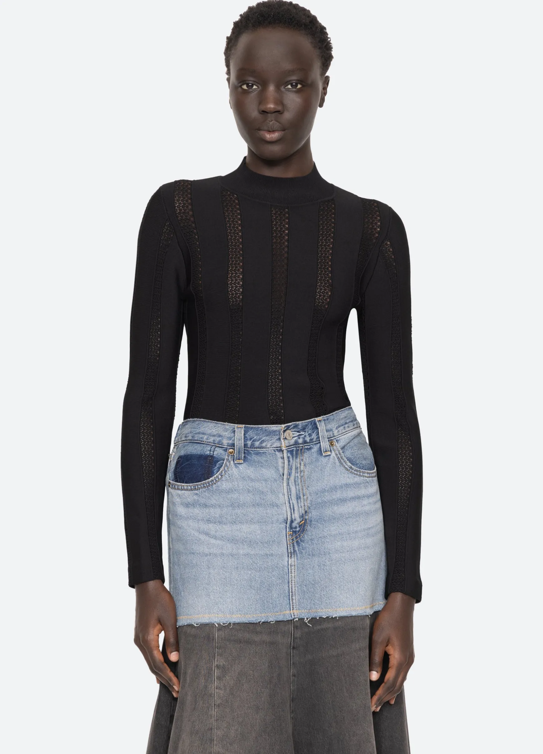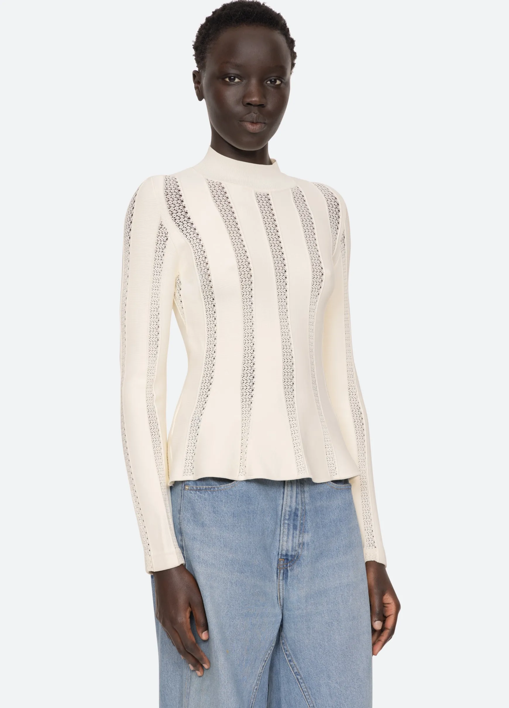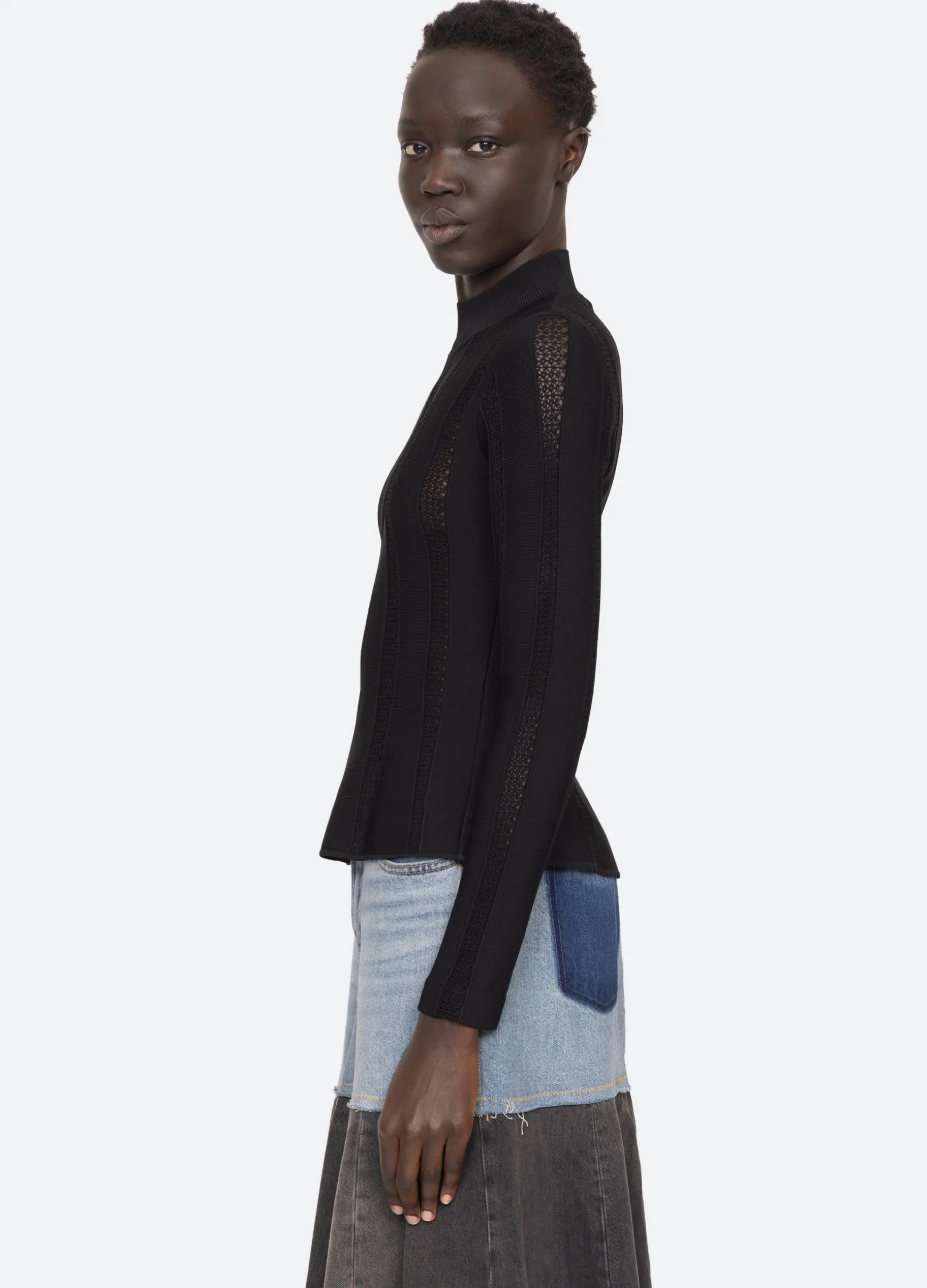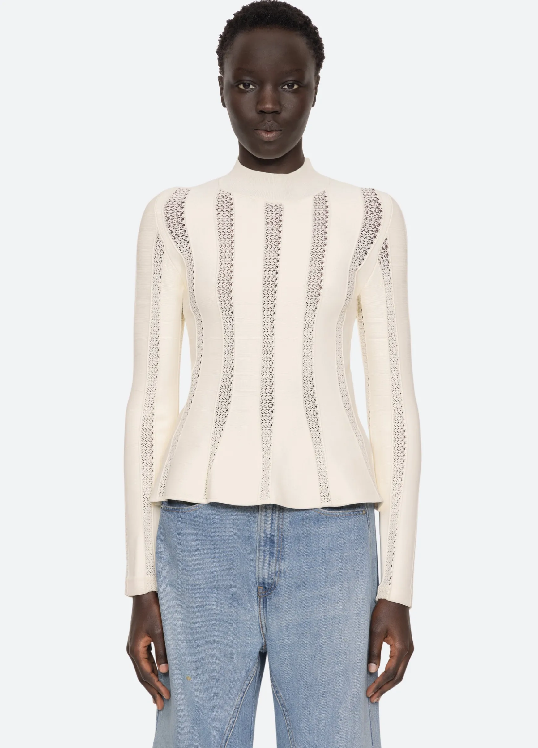 The Devon knit peplum top features a high neckline, sheer accents, and is designed for a slim fit.
