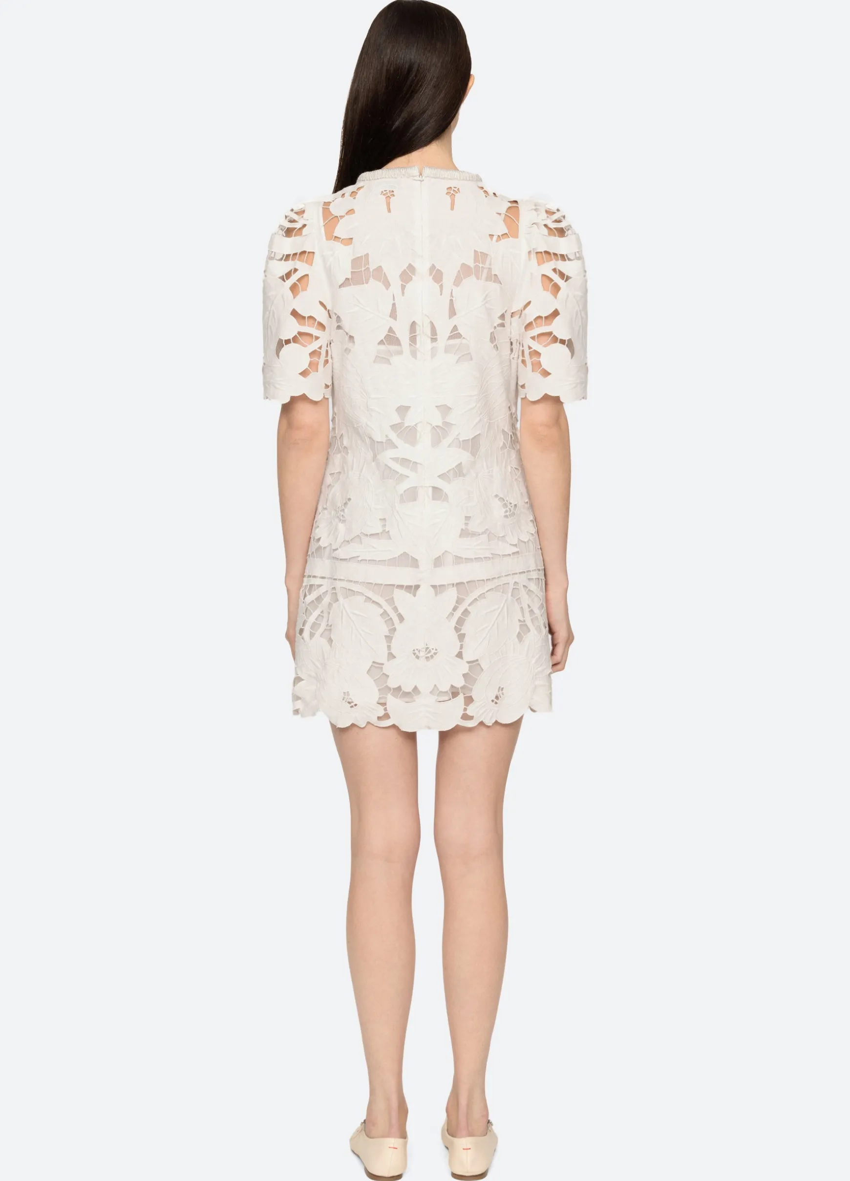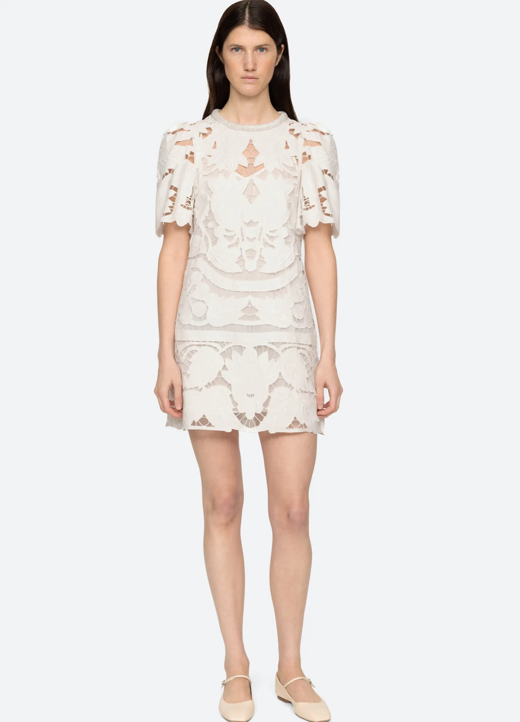 The Edith short sleeve dress features oversized embroidered detailing withcutout accents.