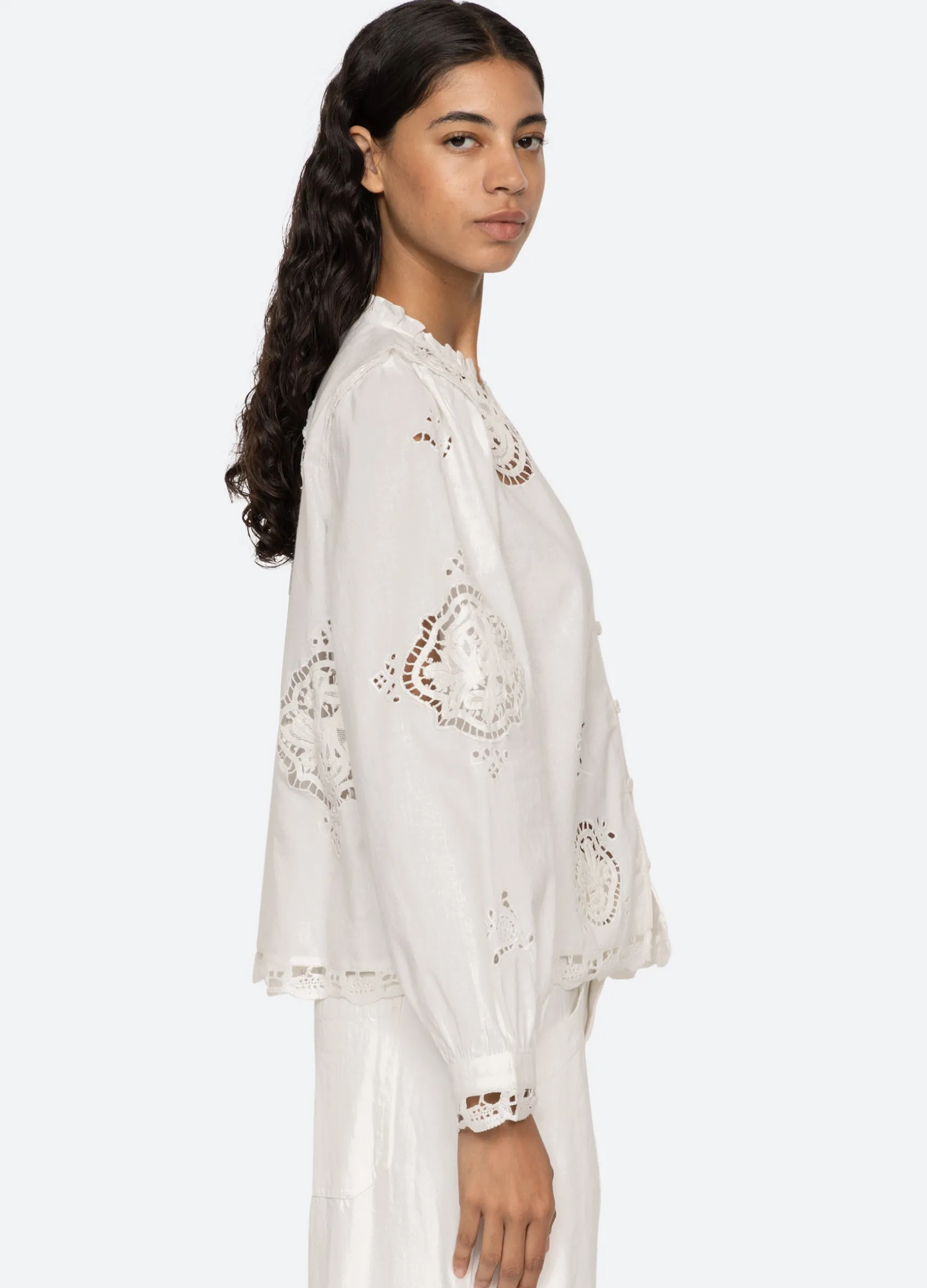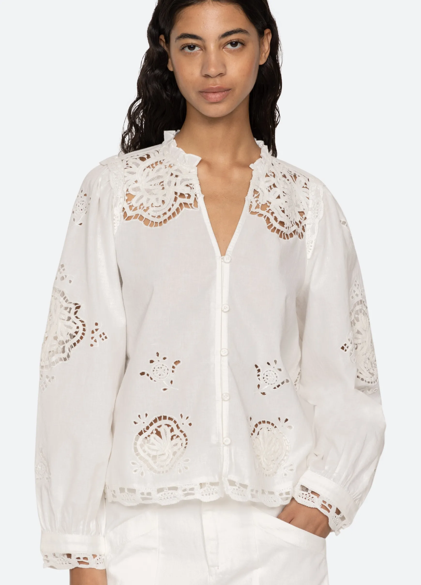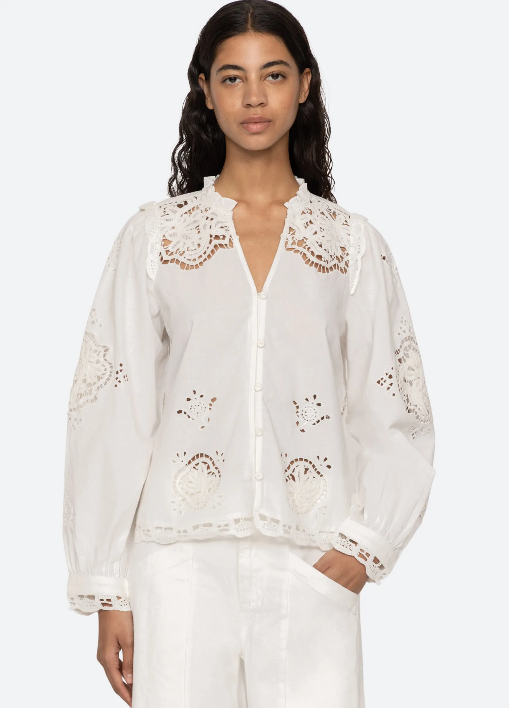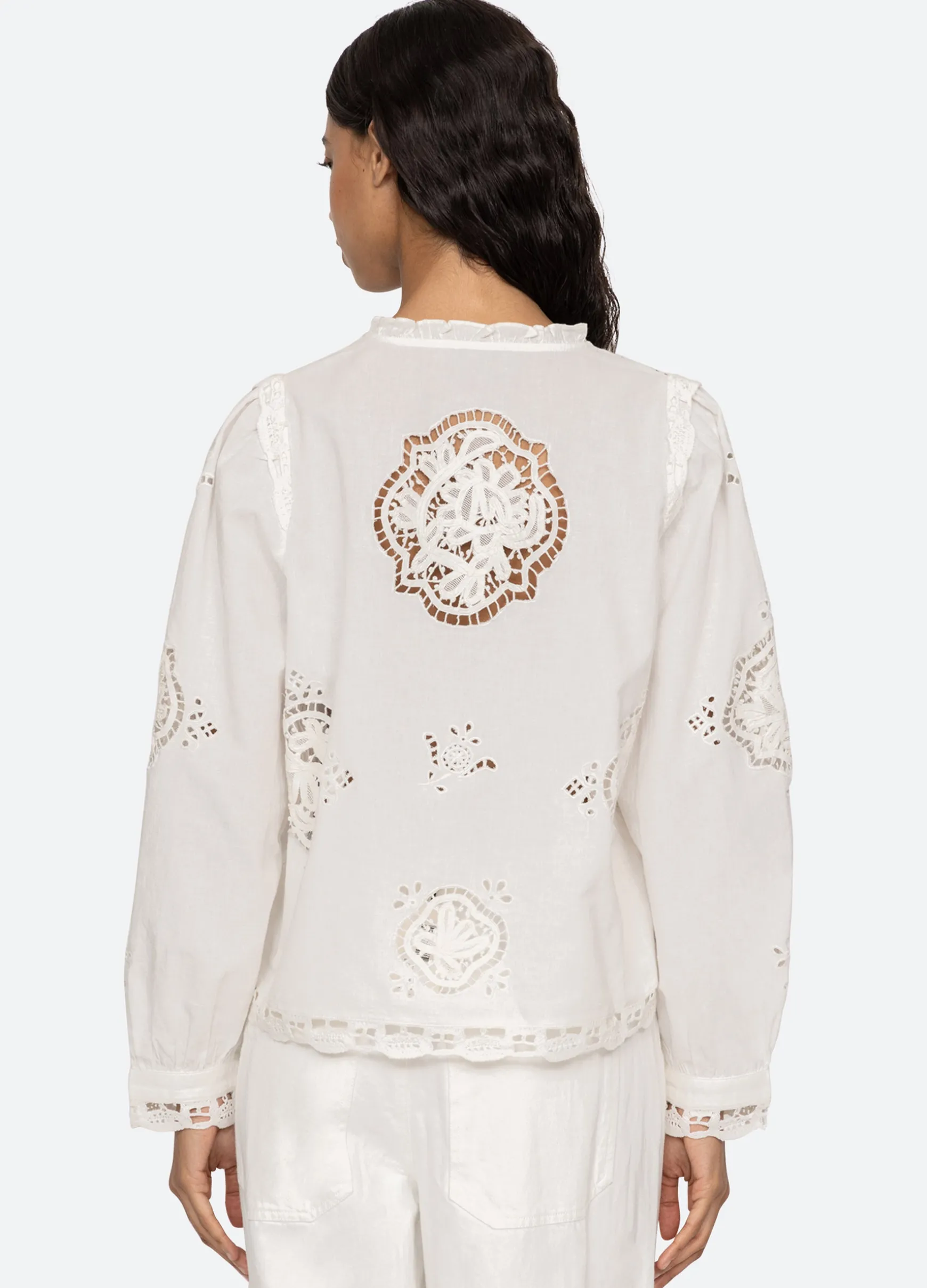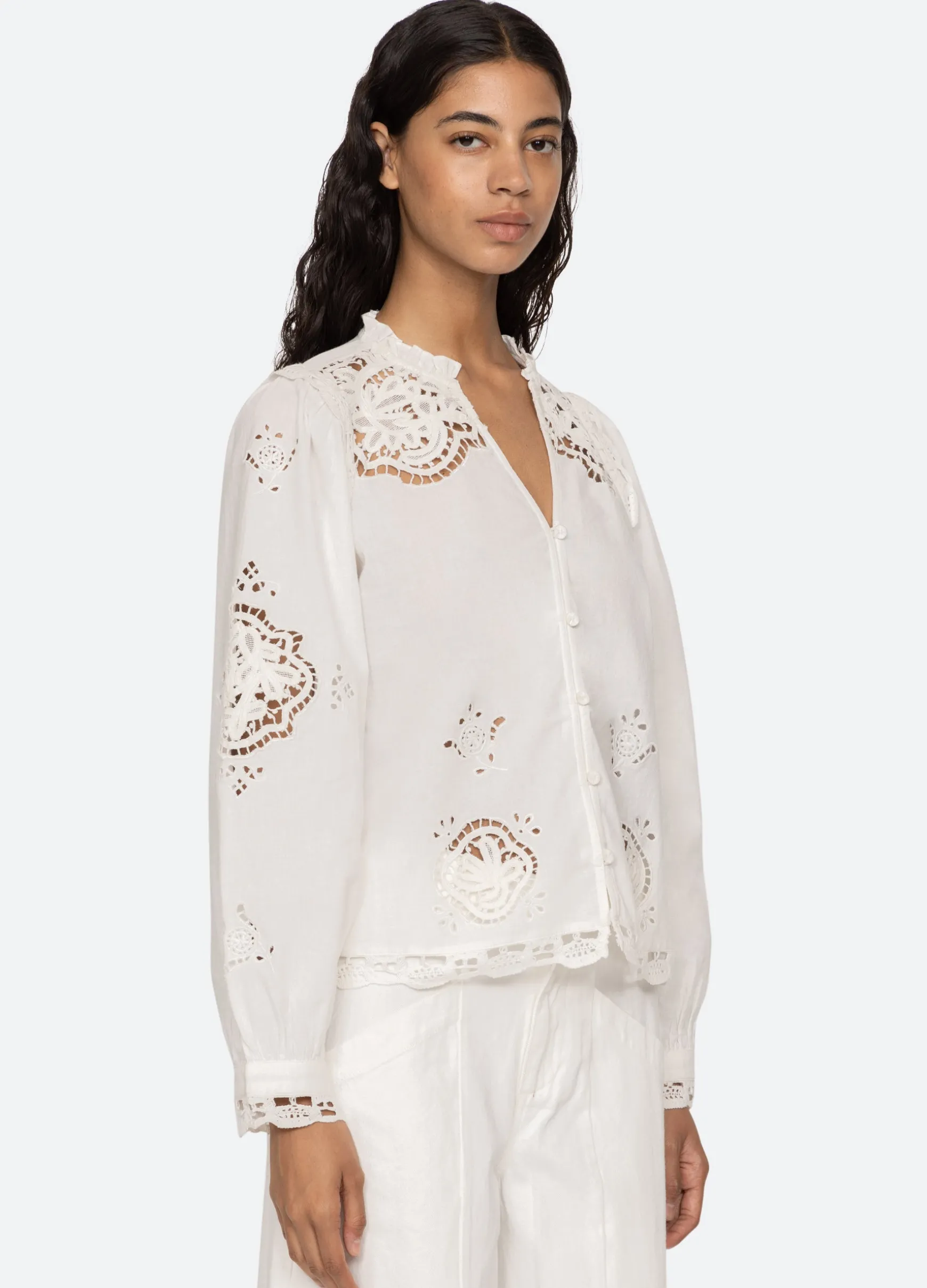 The Edith long sleeve top features a V-neckline, ruffle trim, and embroidered detailing throughout.Designed for an easy, relaxed fit.