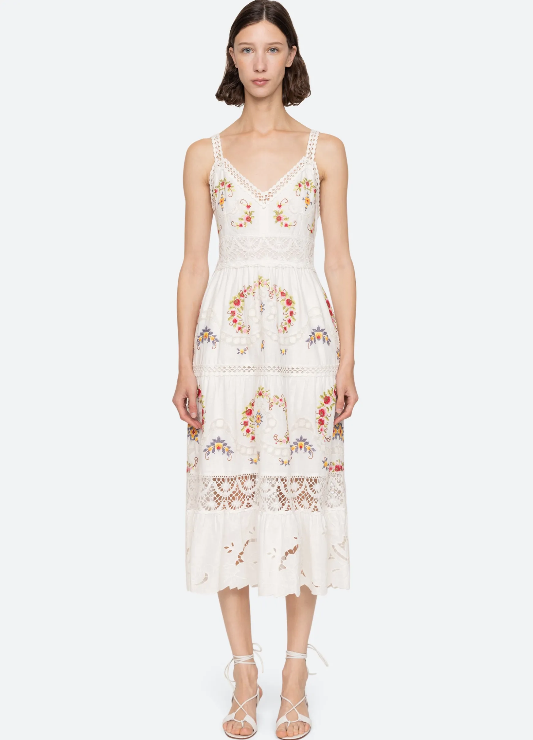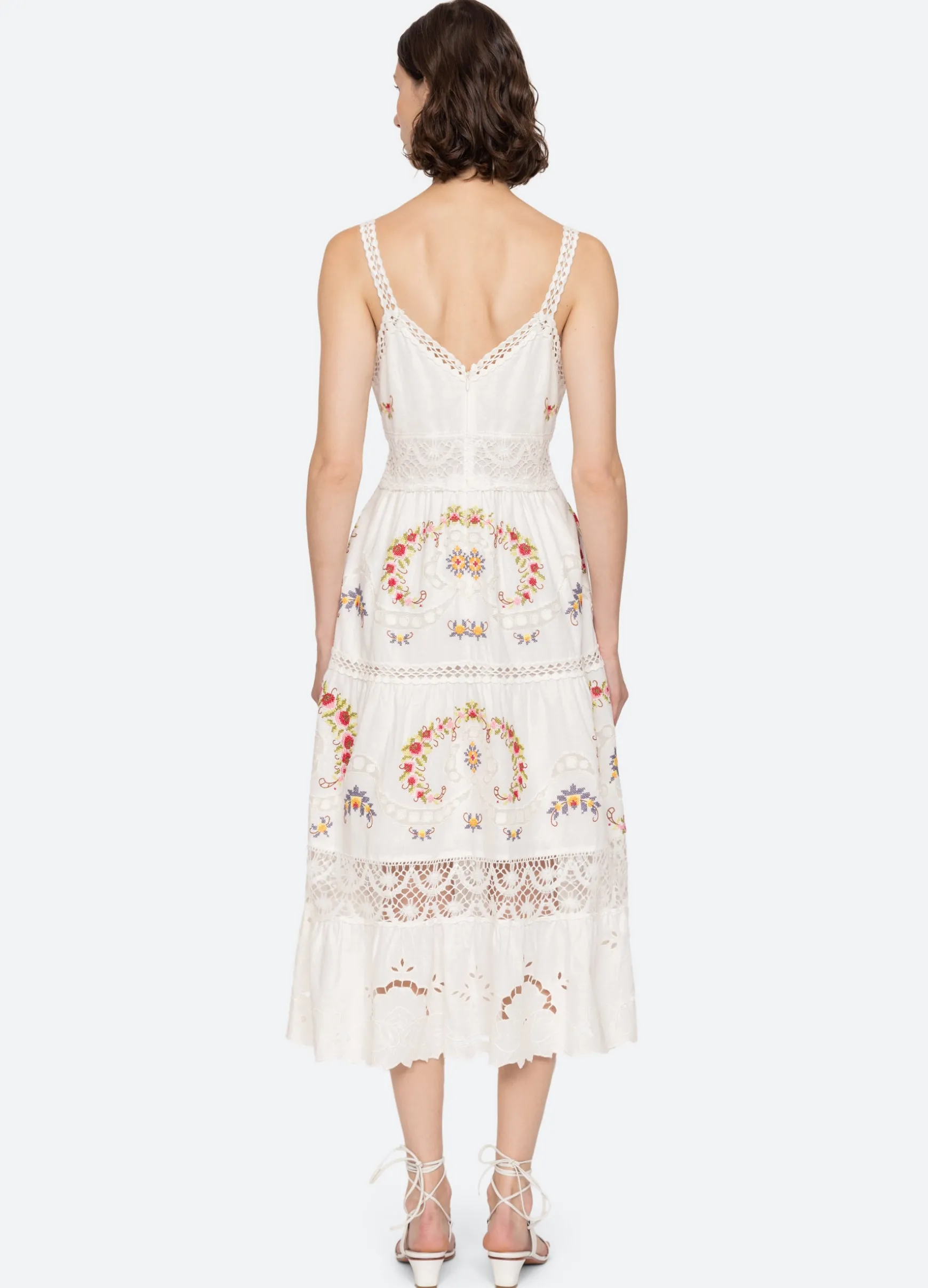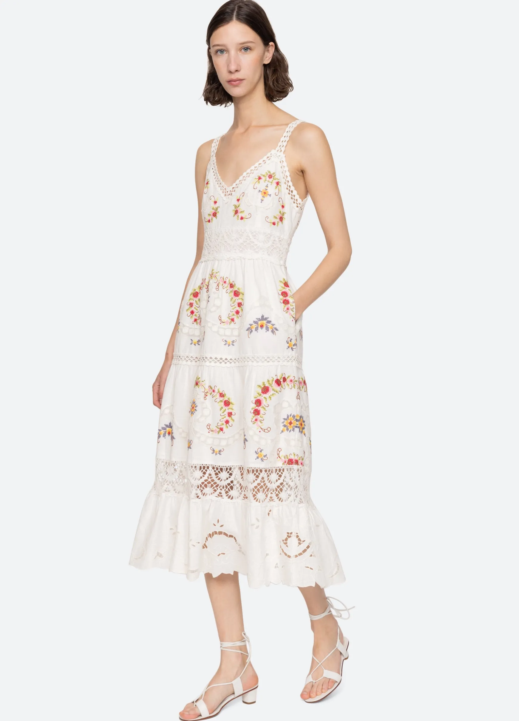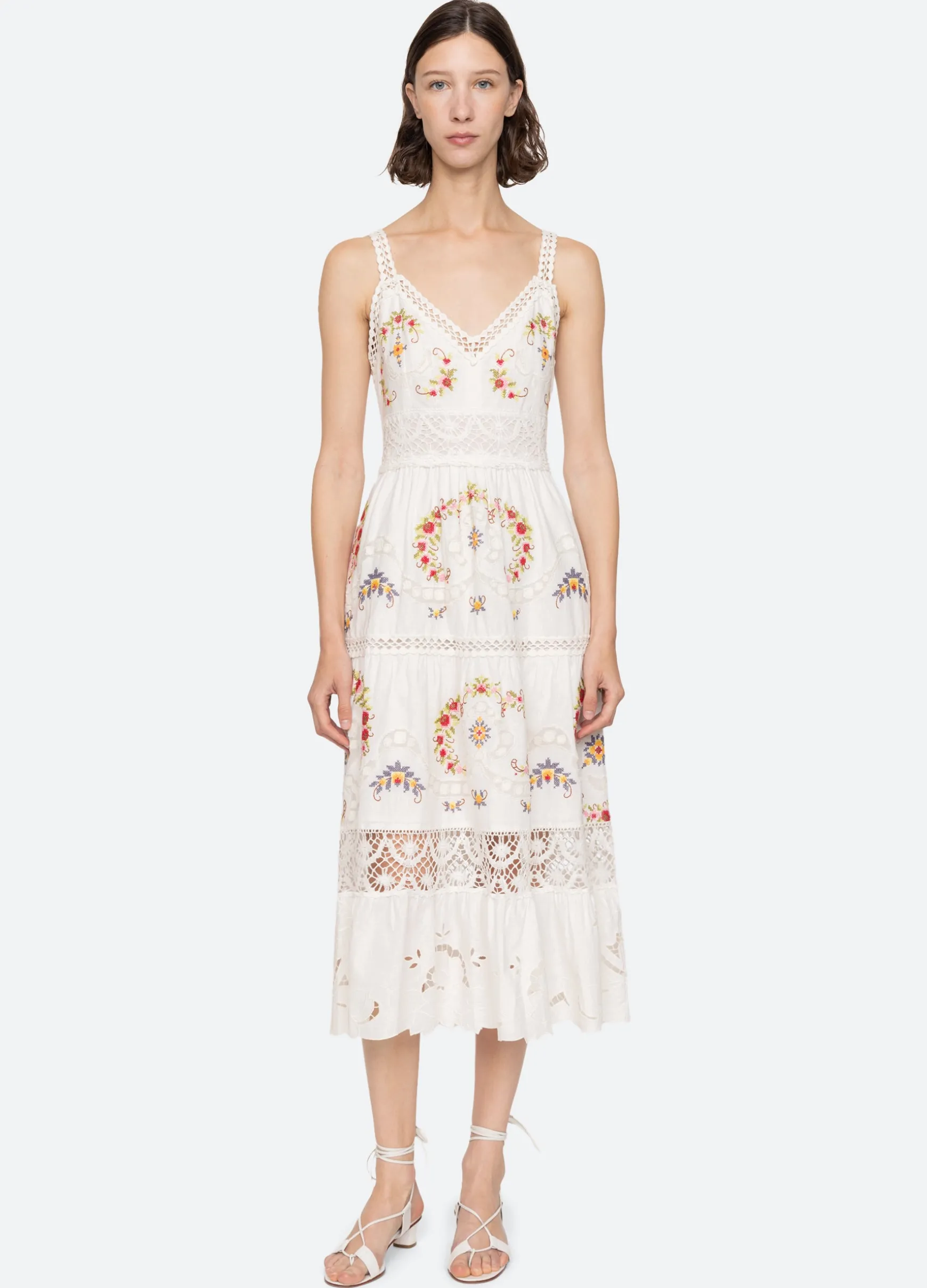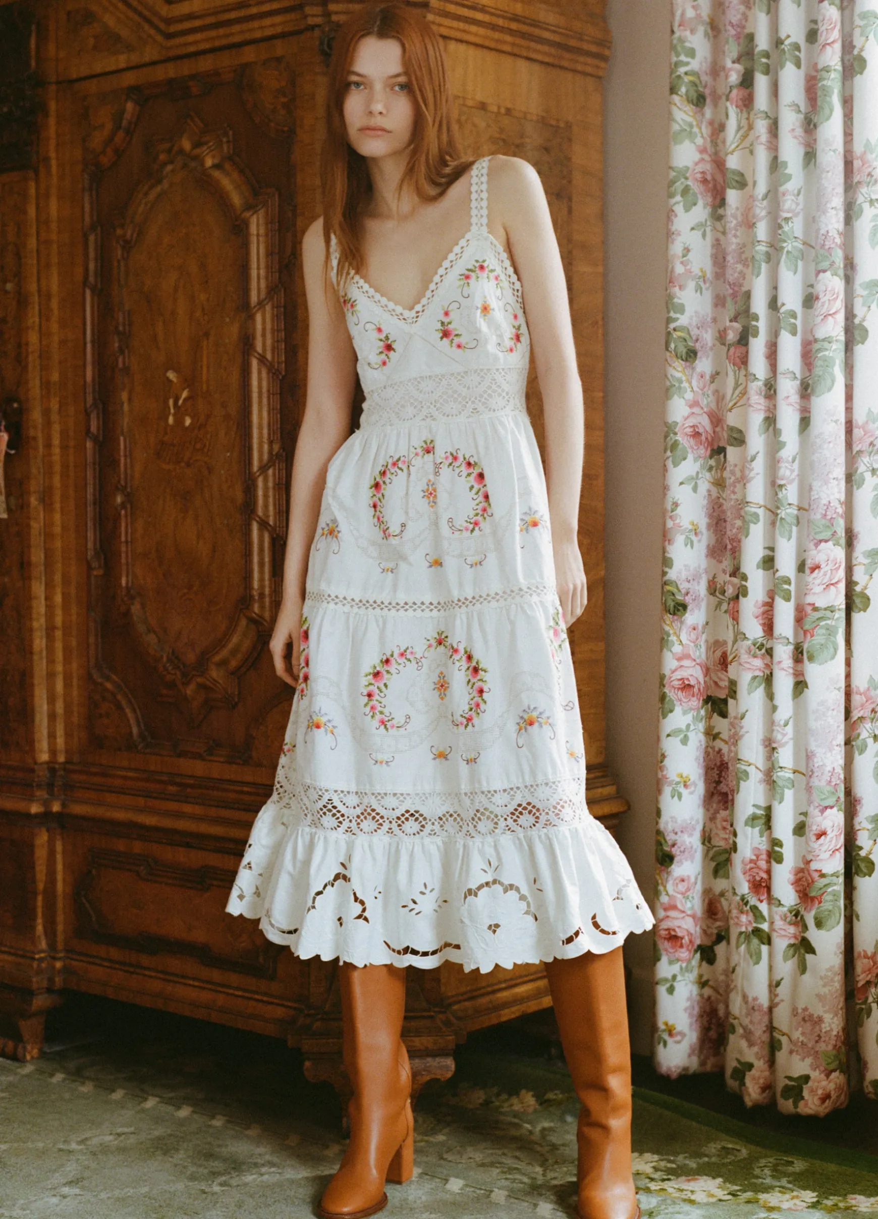 The Edwinadressfeaturescross stitch embroidery throughout and lace trim detailing.