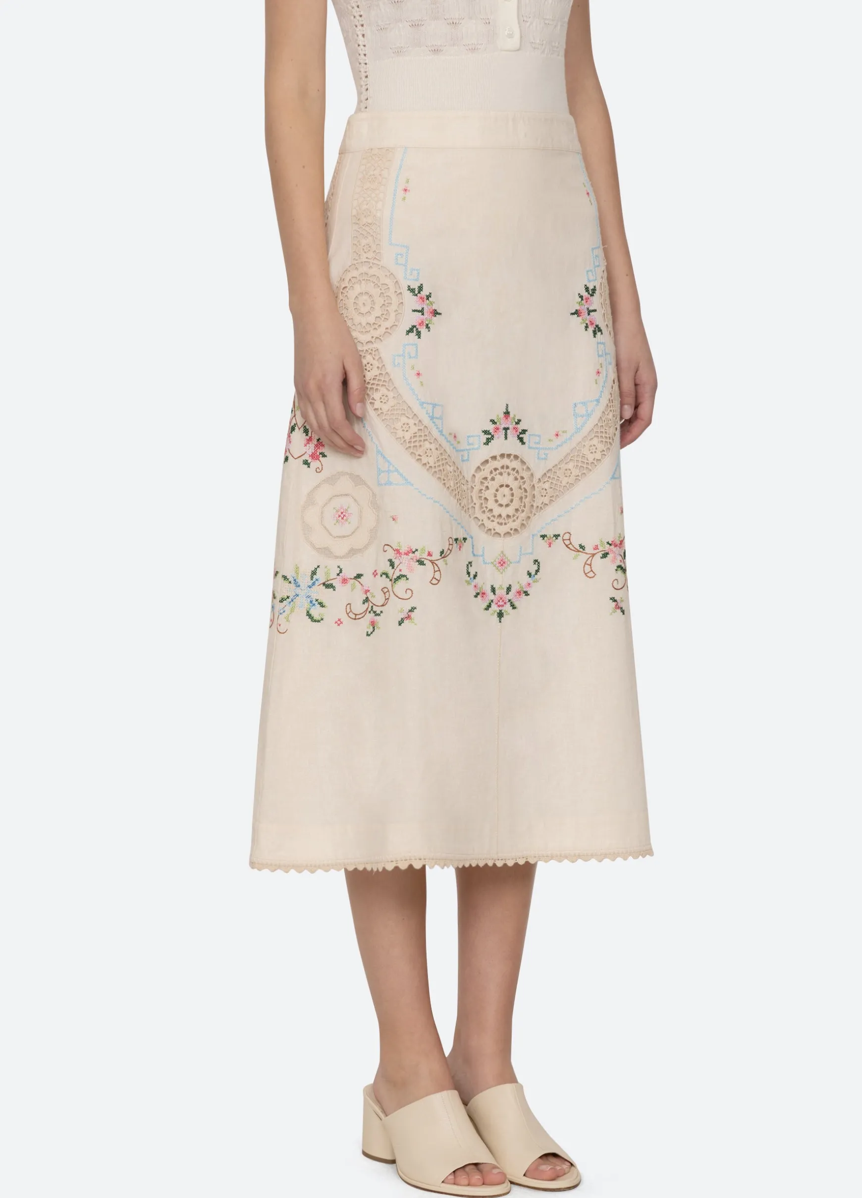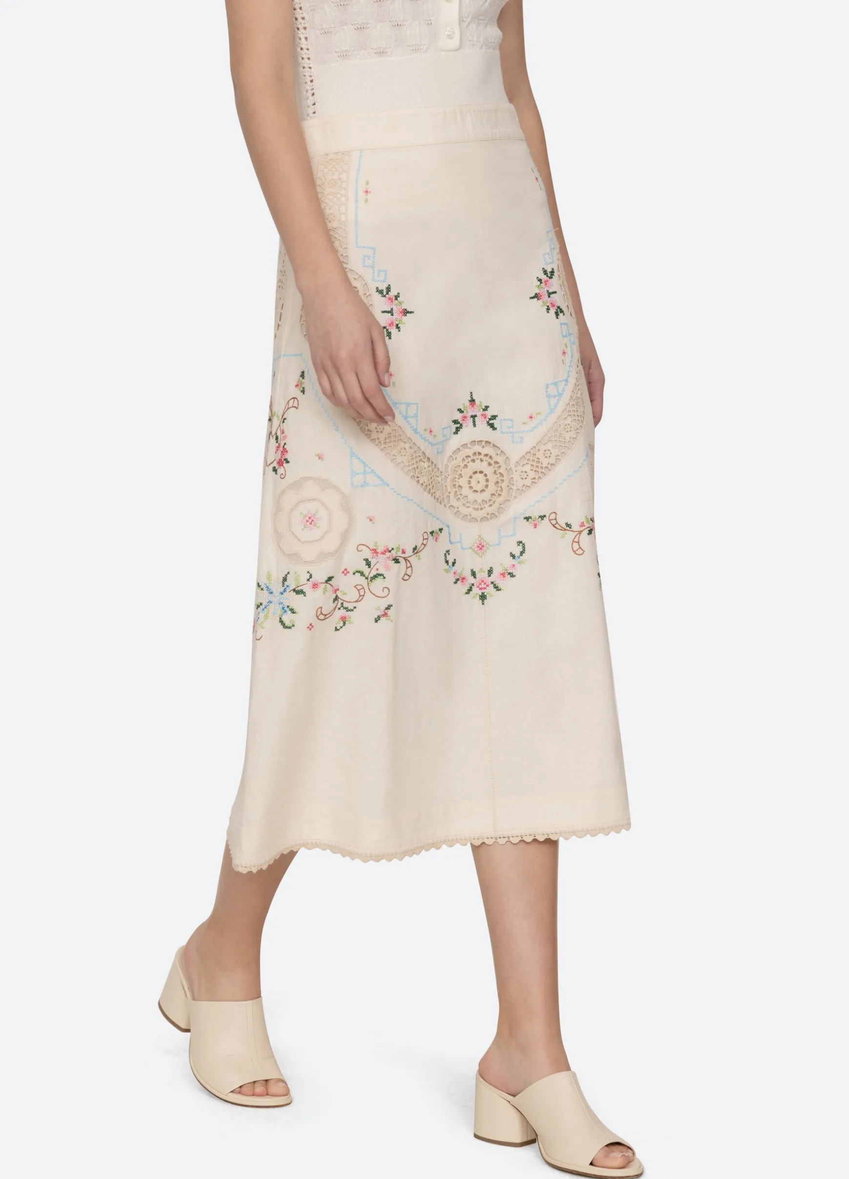 The Edwinaskirtfeaturescross stitch embroidery throughout andcrochet trim detailing.