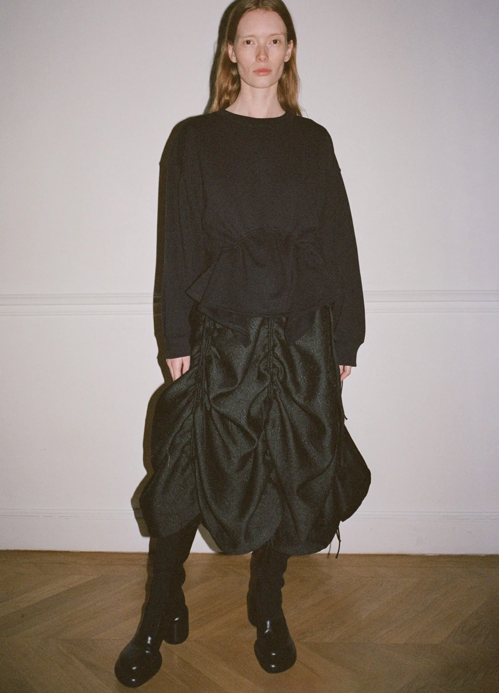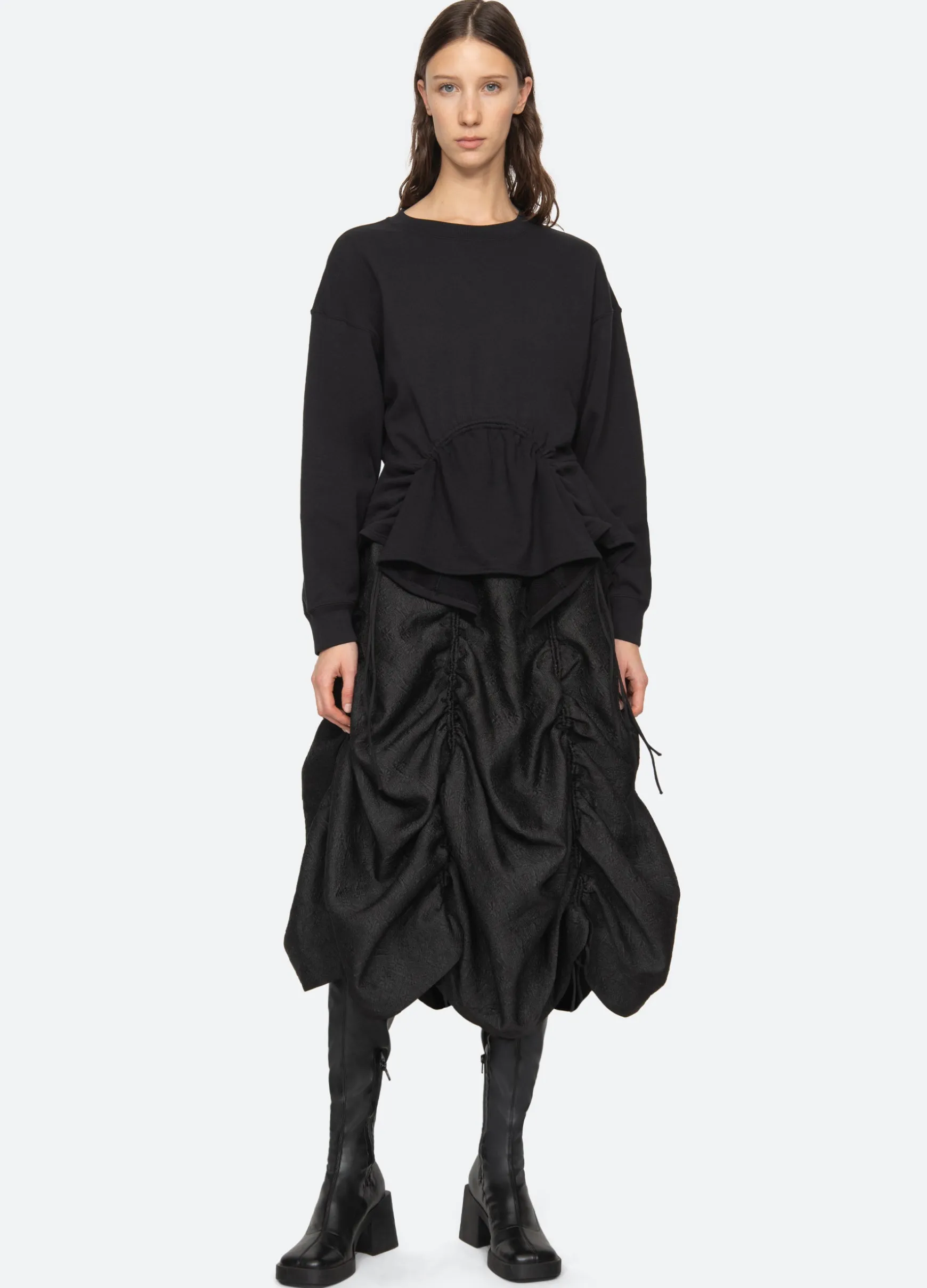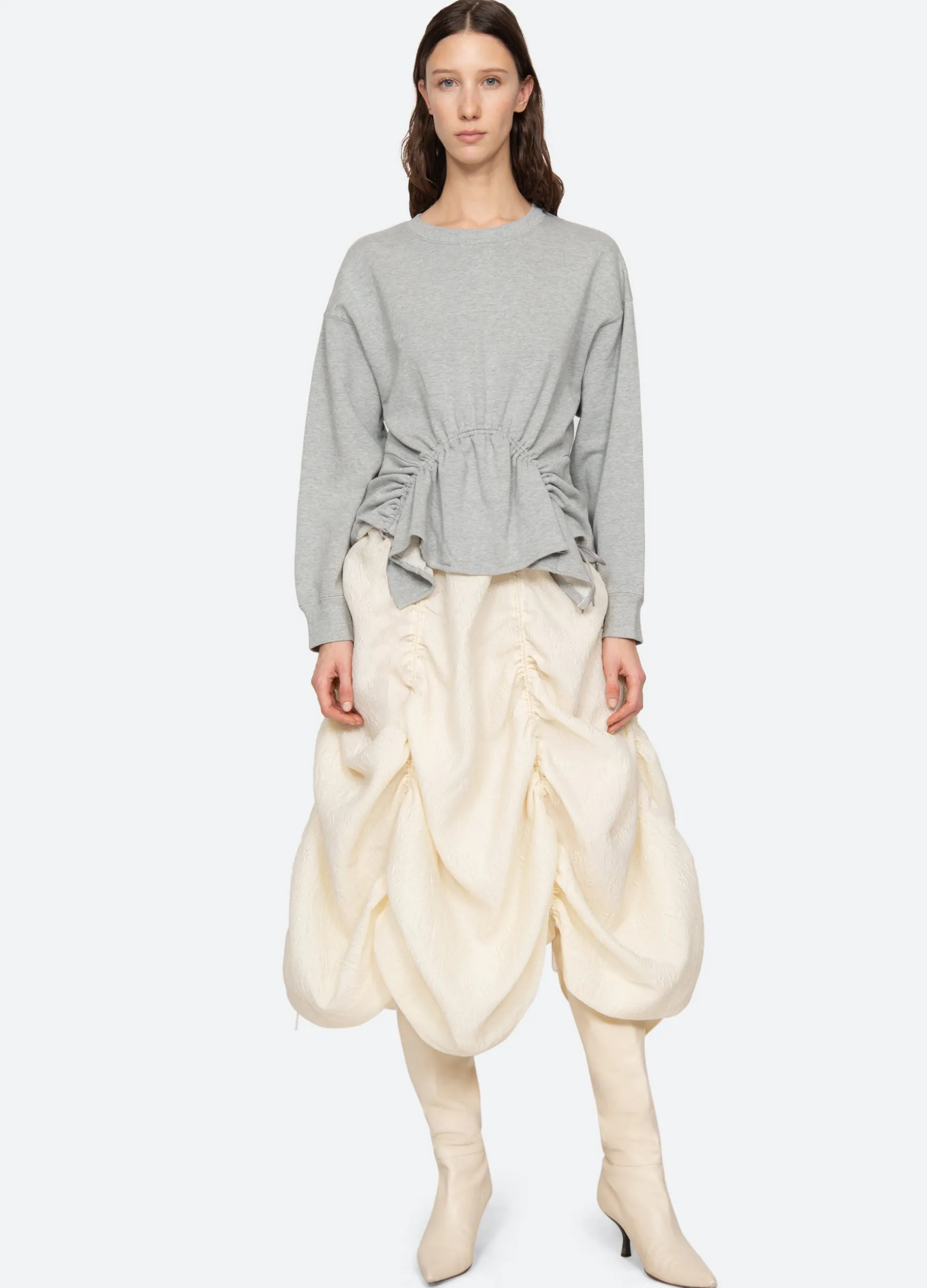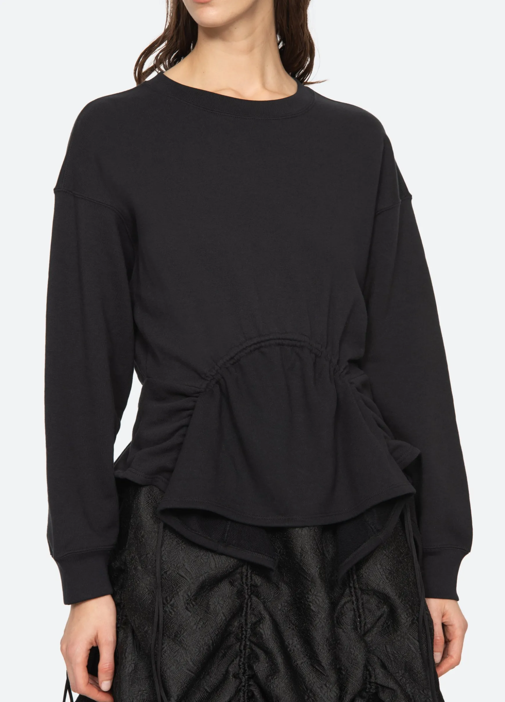 The Elegi sweatshirt features features an asymmetrical hem with adjustable drawstring cords.
