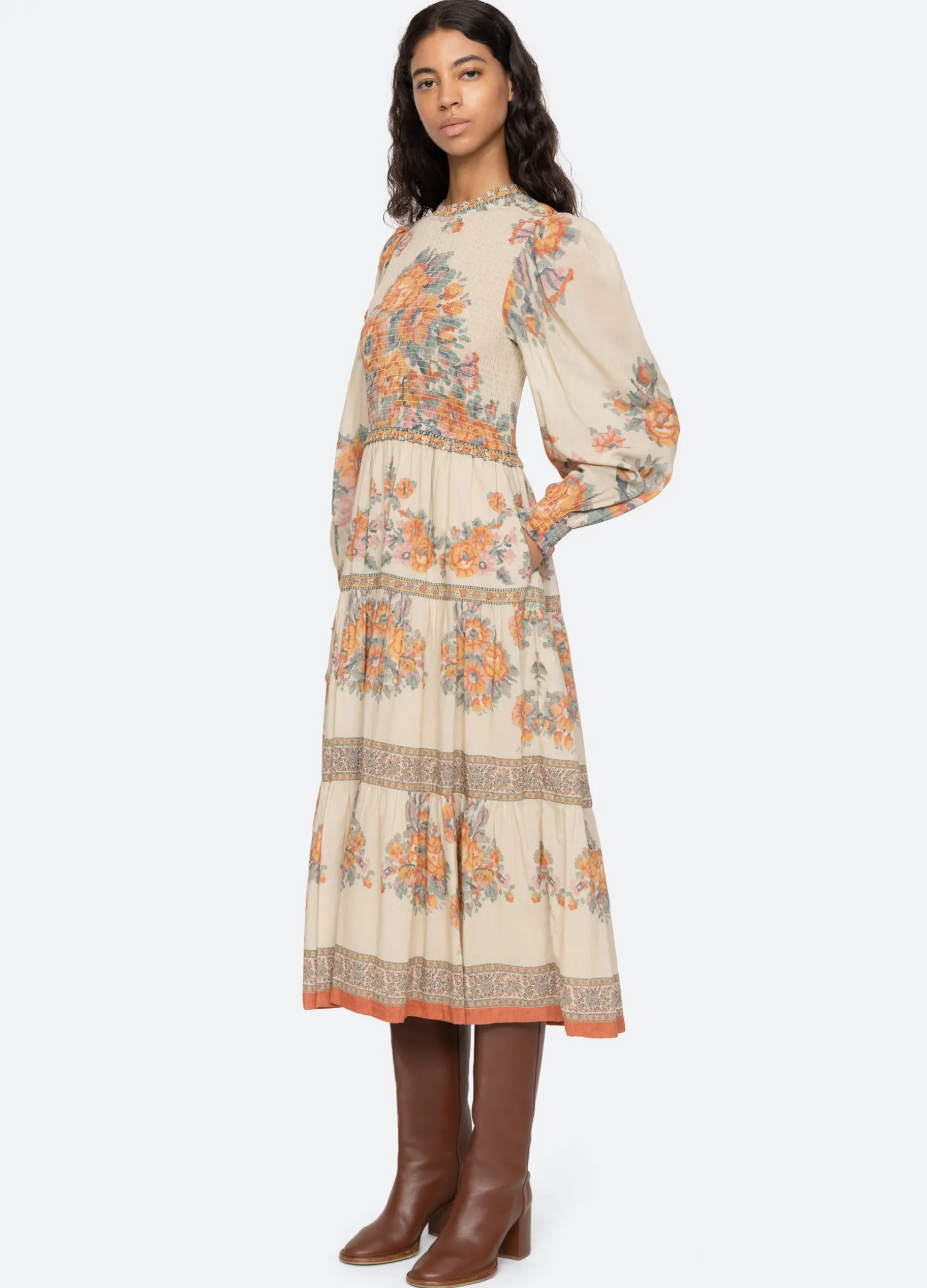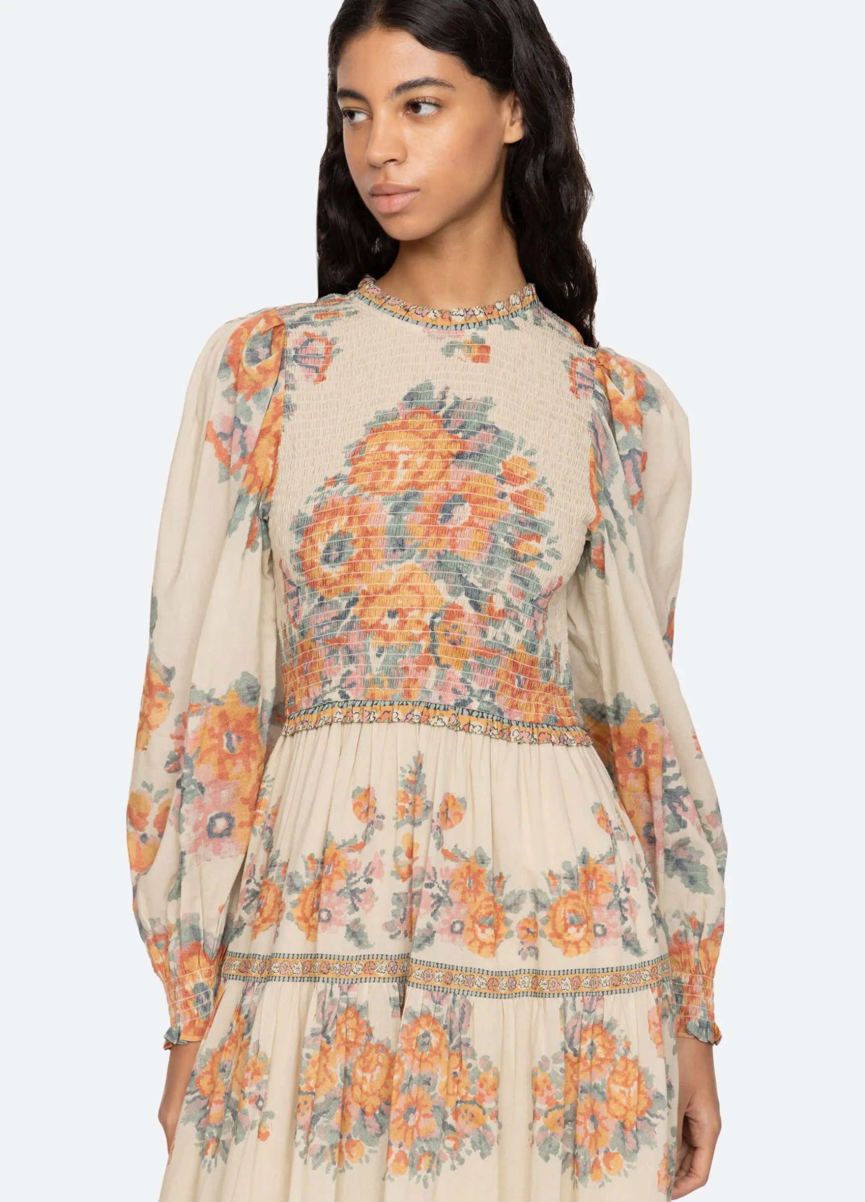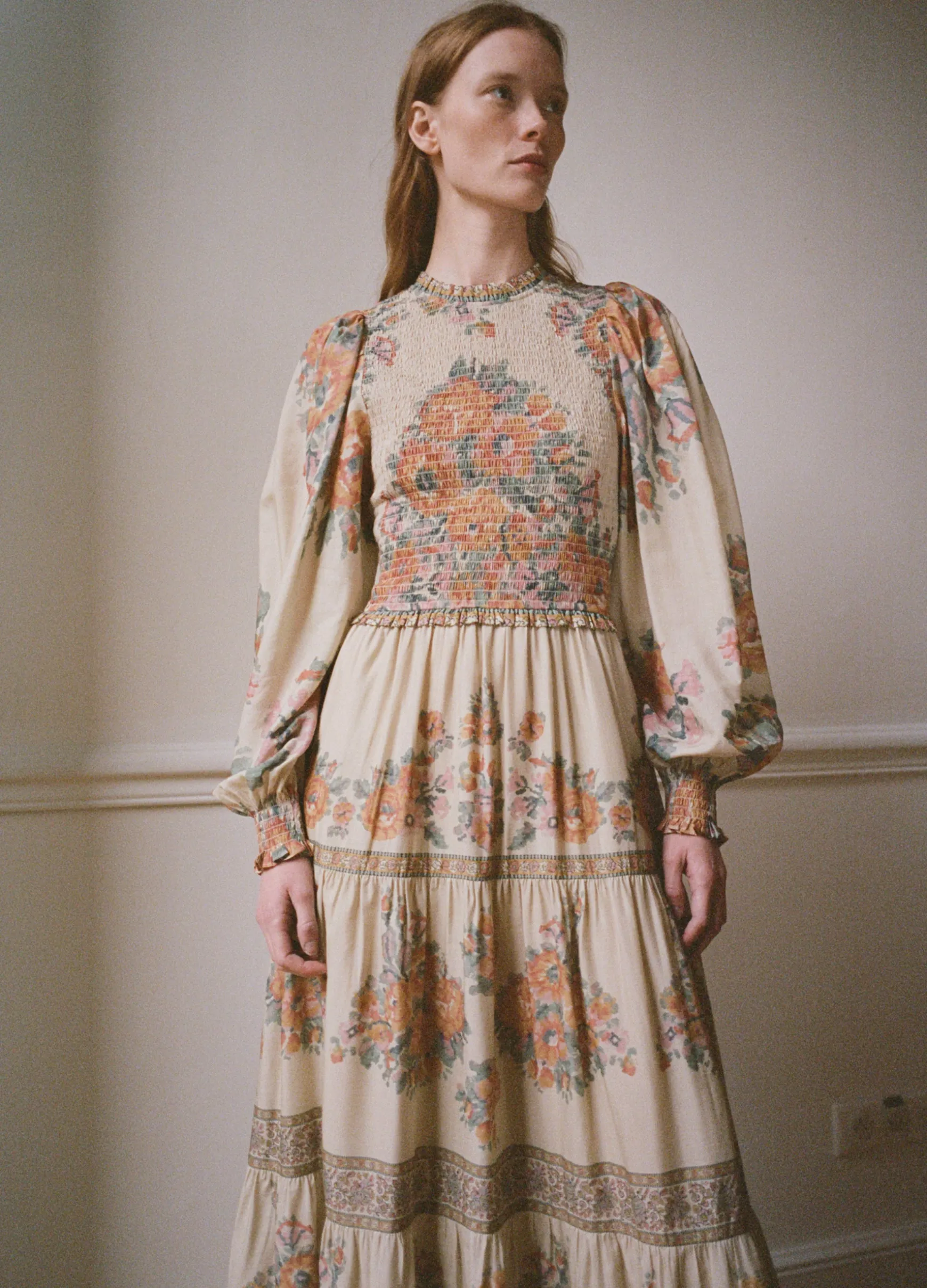 The Fiorella floral border print dress features a smocked bodice and voluminous long puff sleeves.