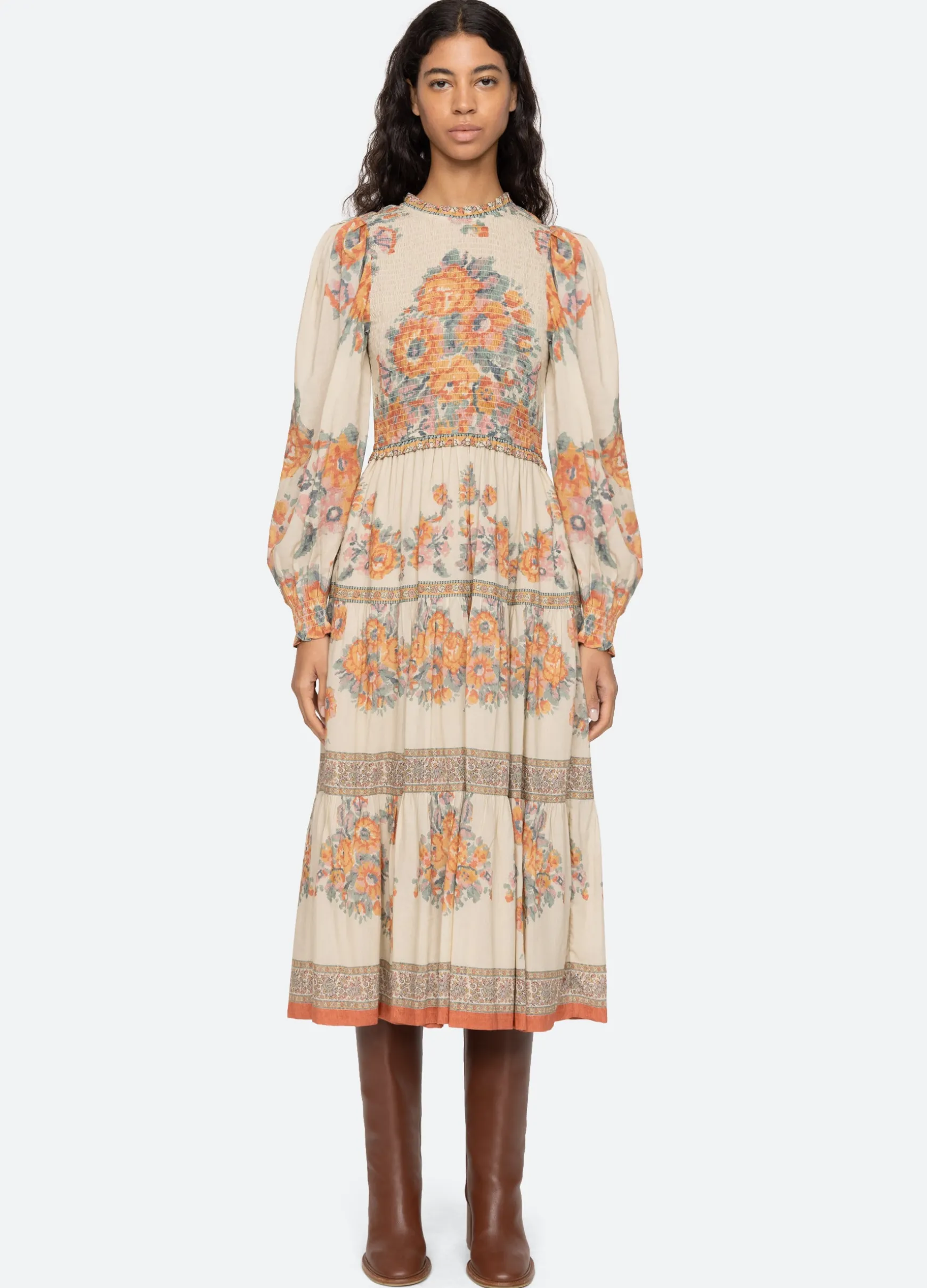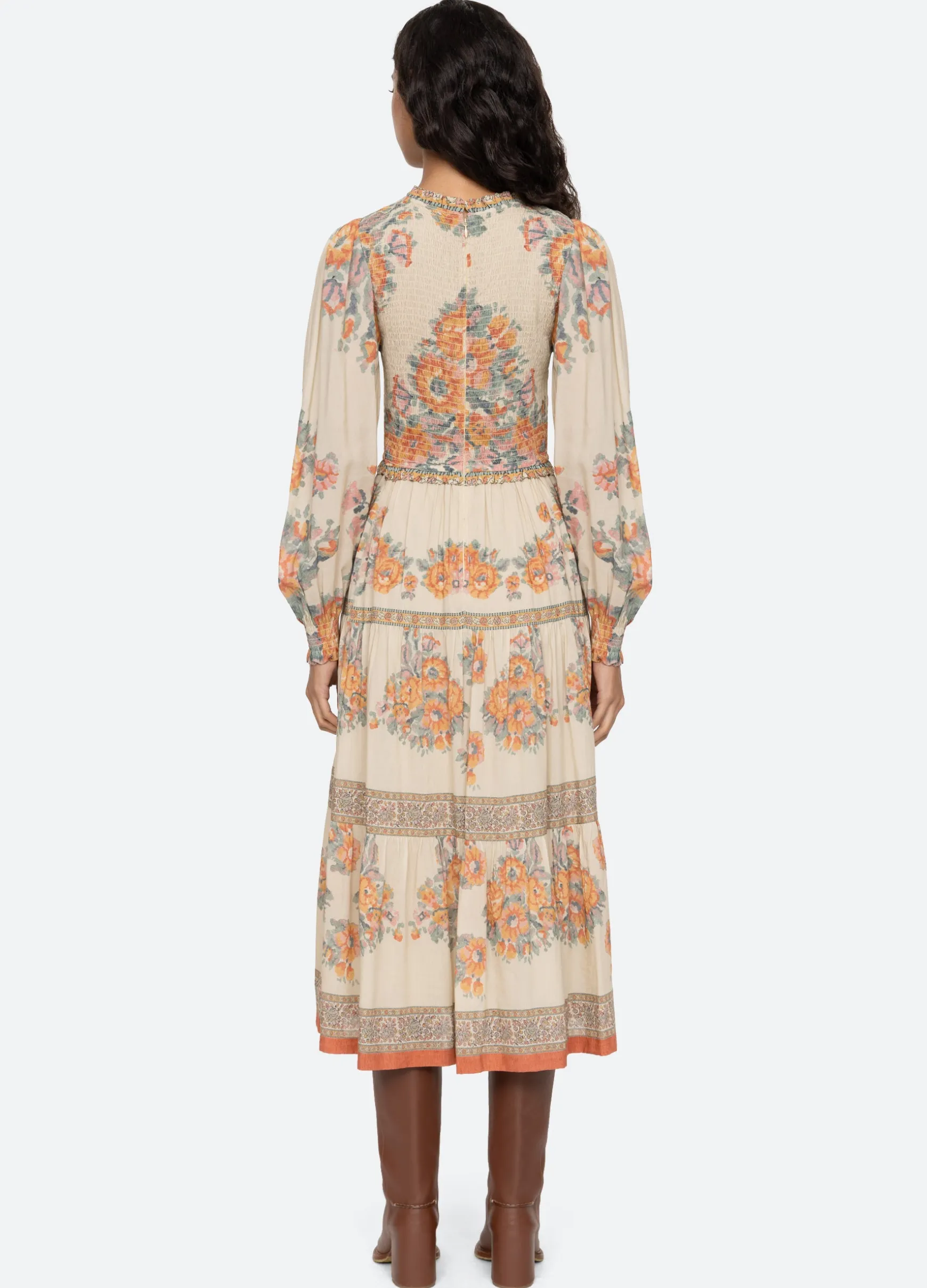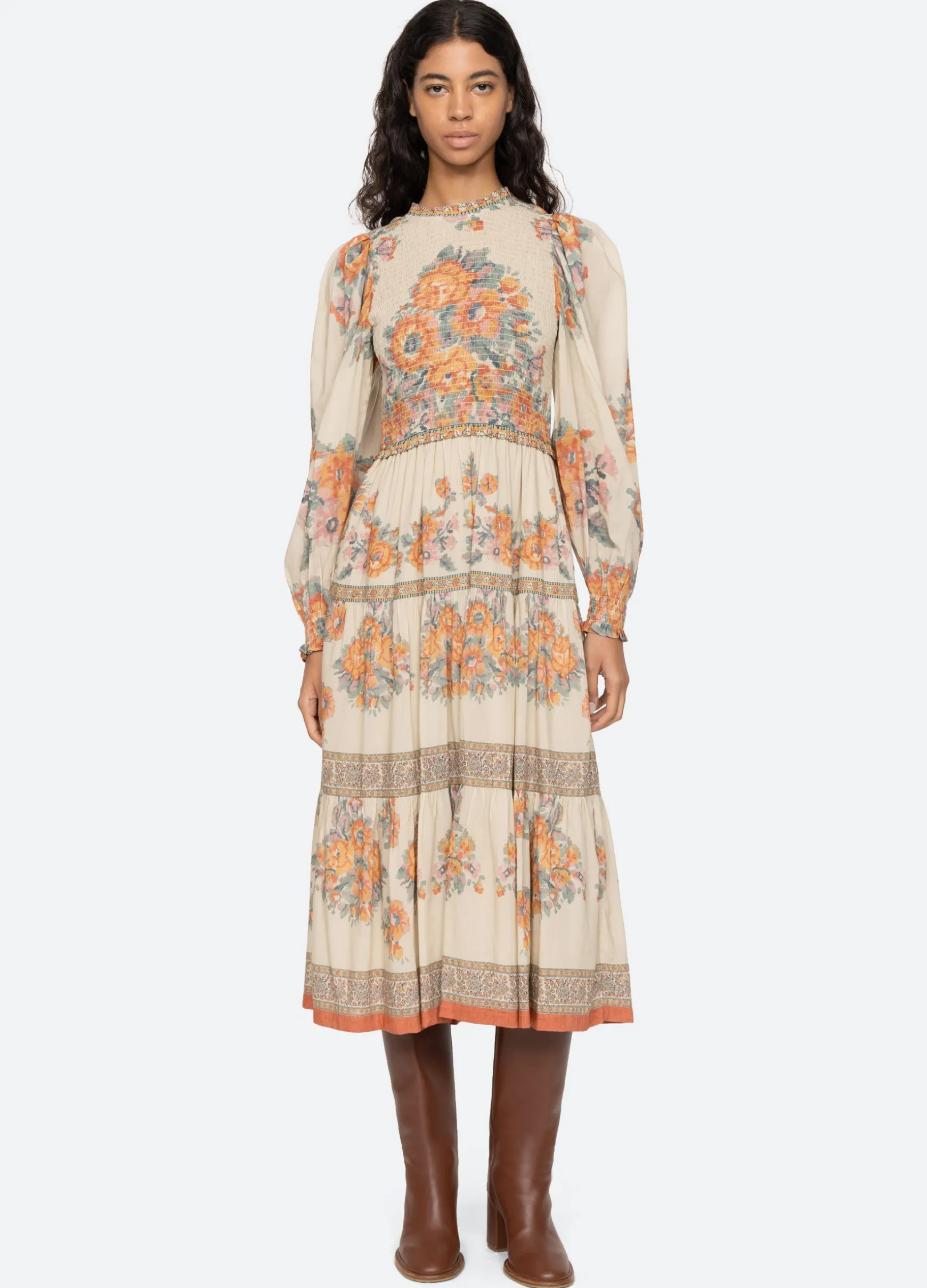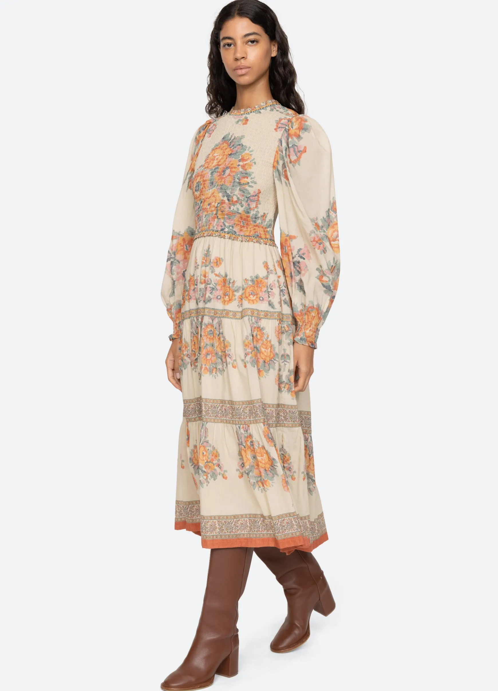 The Fiorella floral border print dress features a smocked bodice and voluminous long puff sleeves.