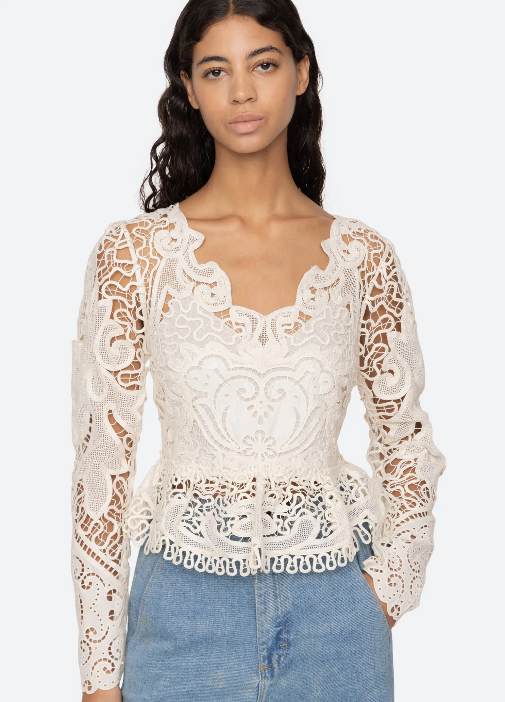 The Gianna lace long sleeve top features a peplum hem and intricate battenburg lace detailing throughout.