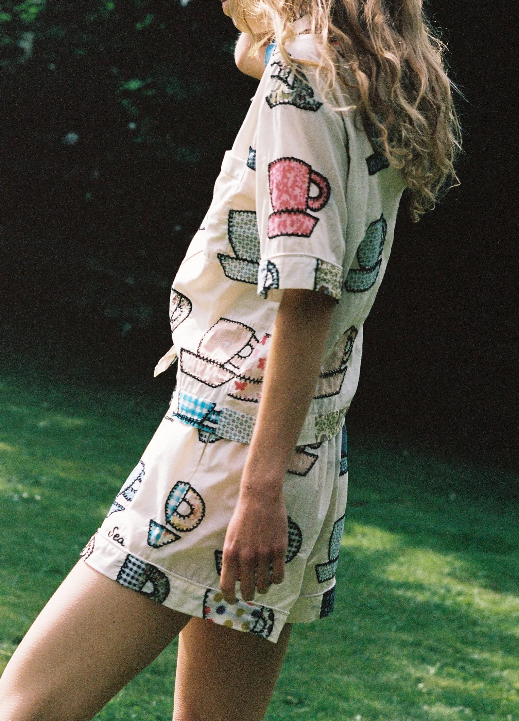The Karmen tea cup embroidered short pajama set features short sleeves, embroidered ‘Sea’ logo and playful tea cup print throughout. Designed for an easy, relaxed fit. Due to the handmade appliqué process, motif variations may occur form garment to garment. No two are exactly alike.