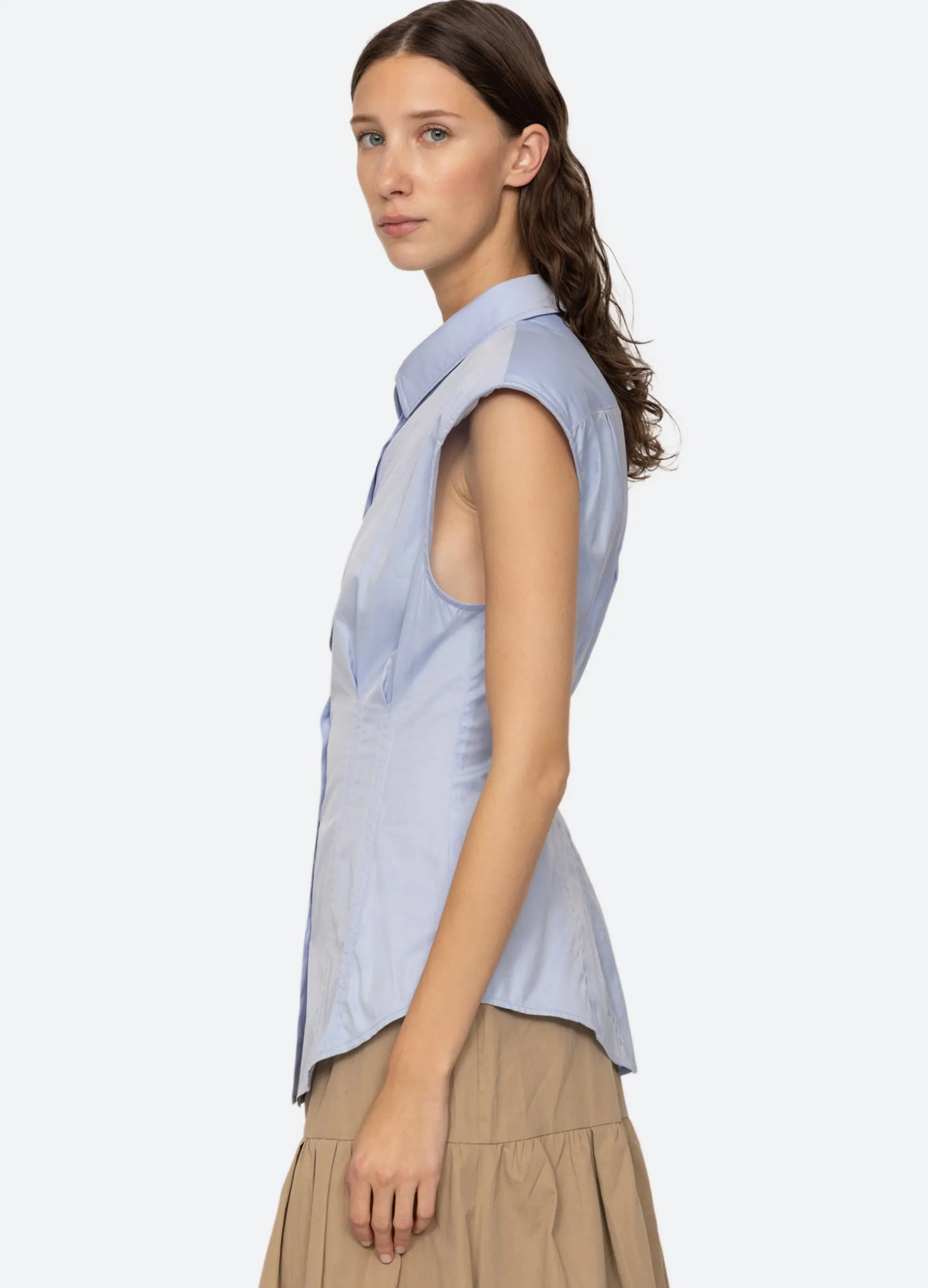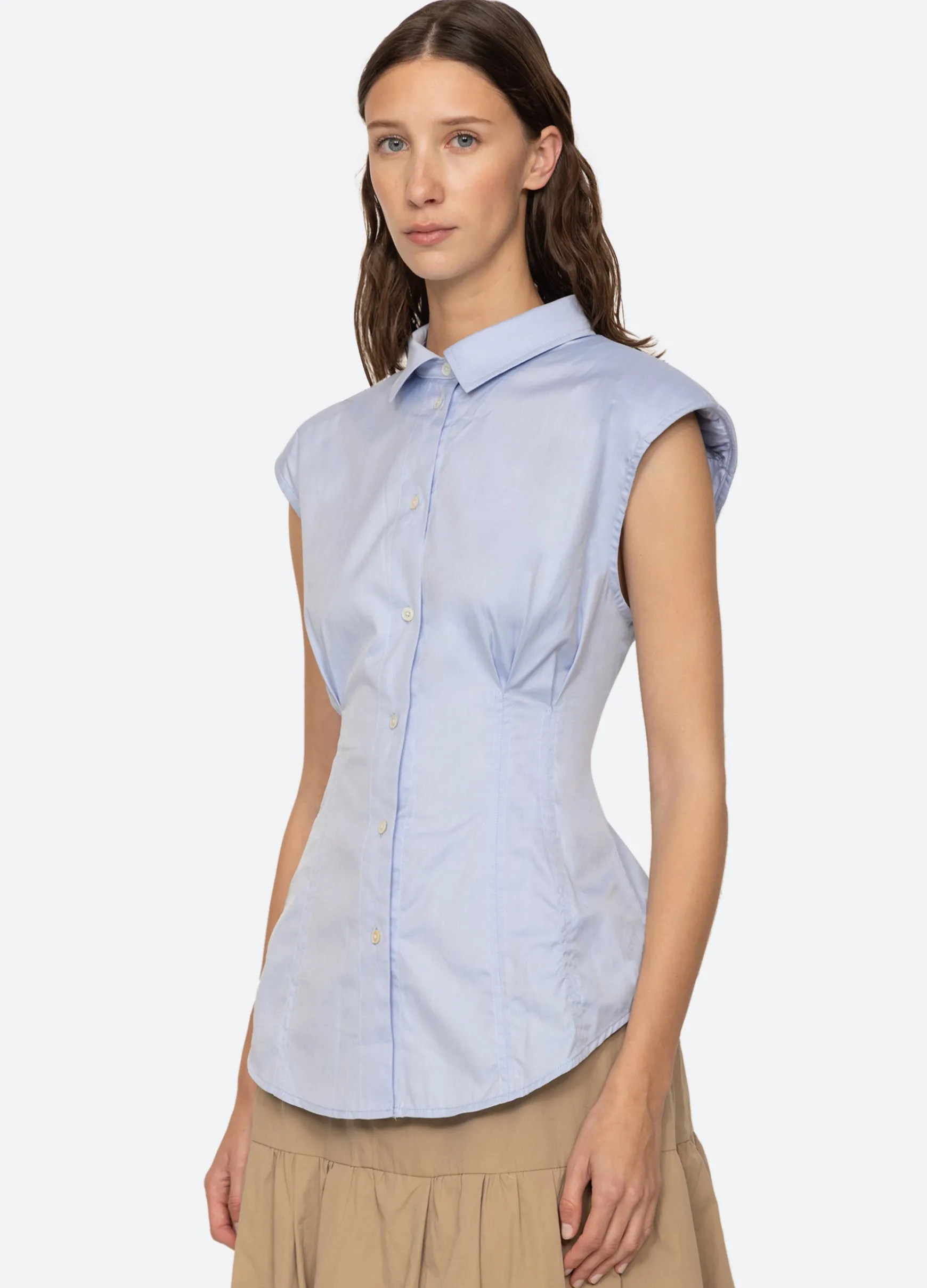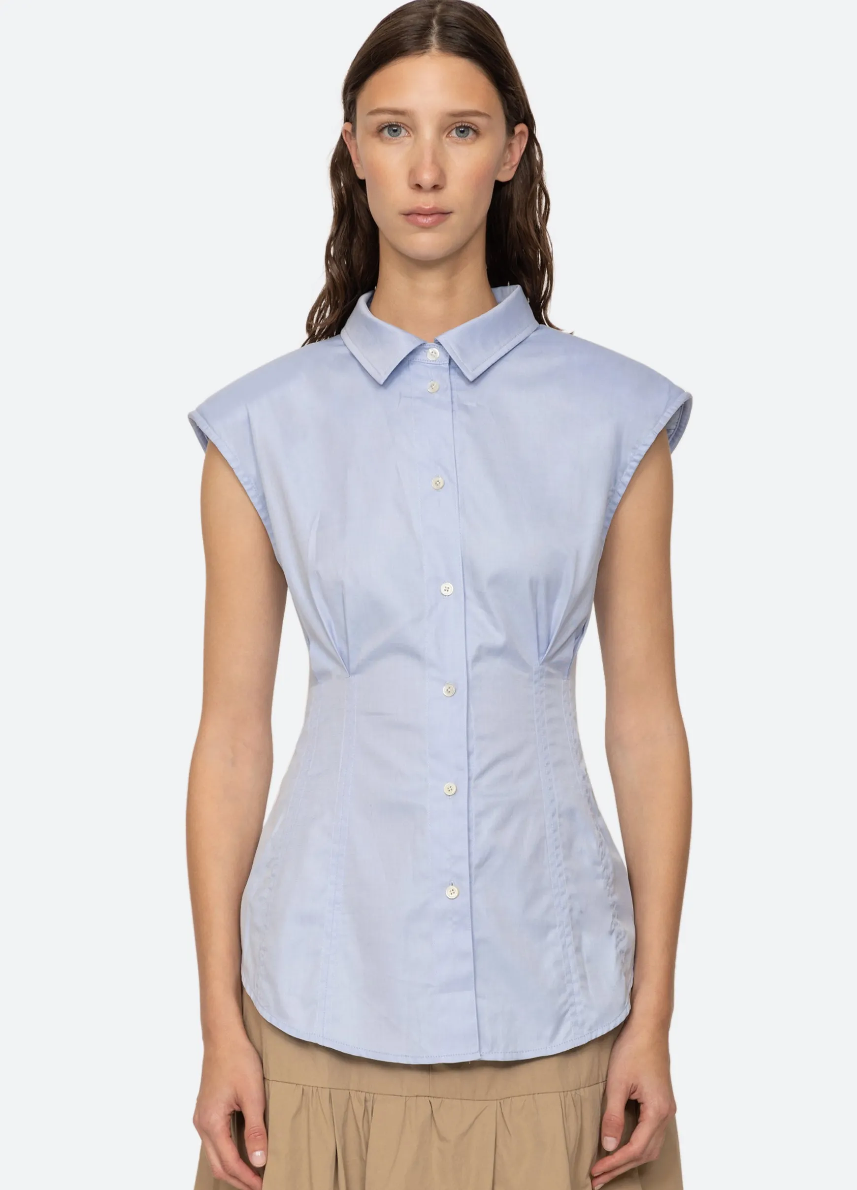 The Kendra sleeveless button down top featuresshoulder pads and is designed for a slim fit.
