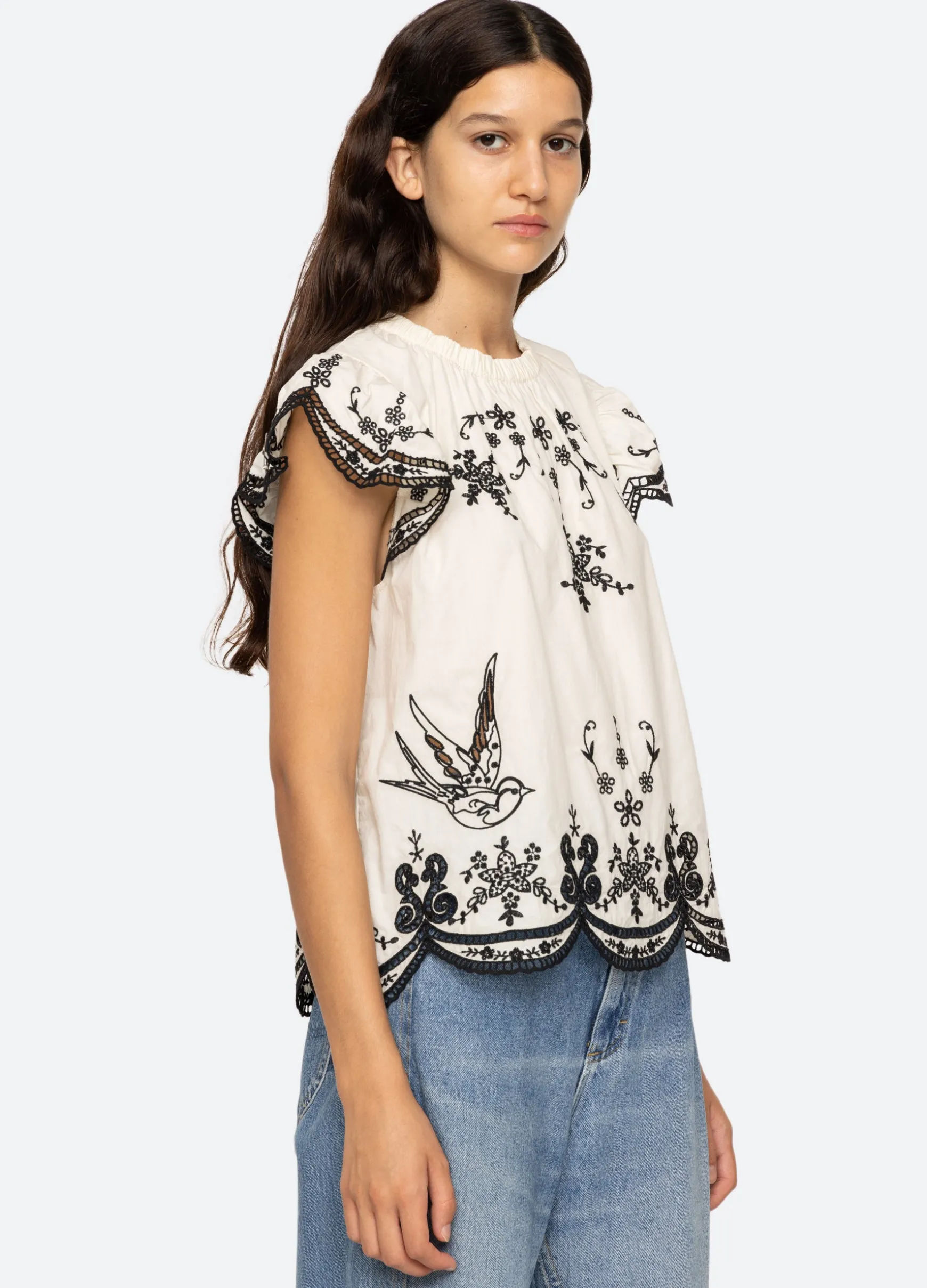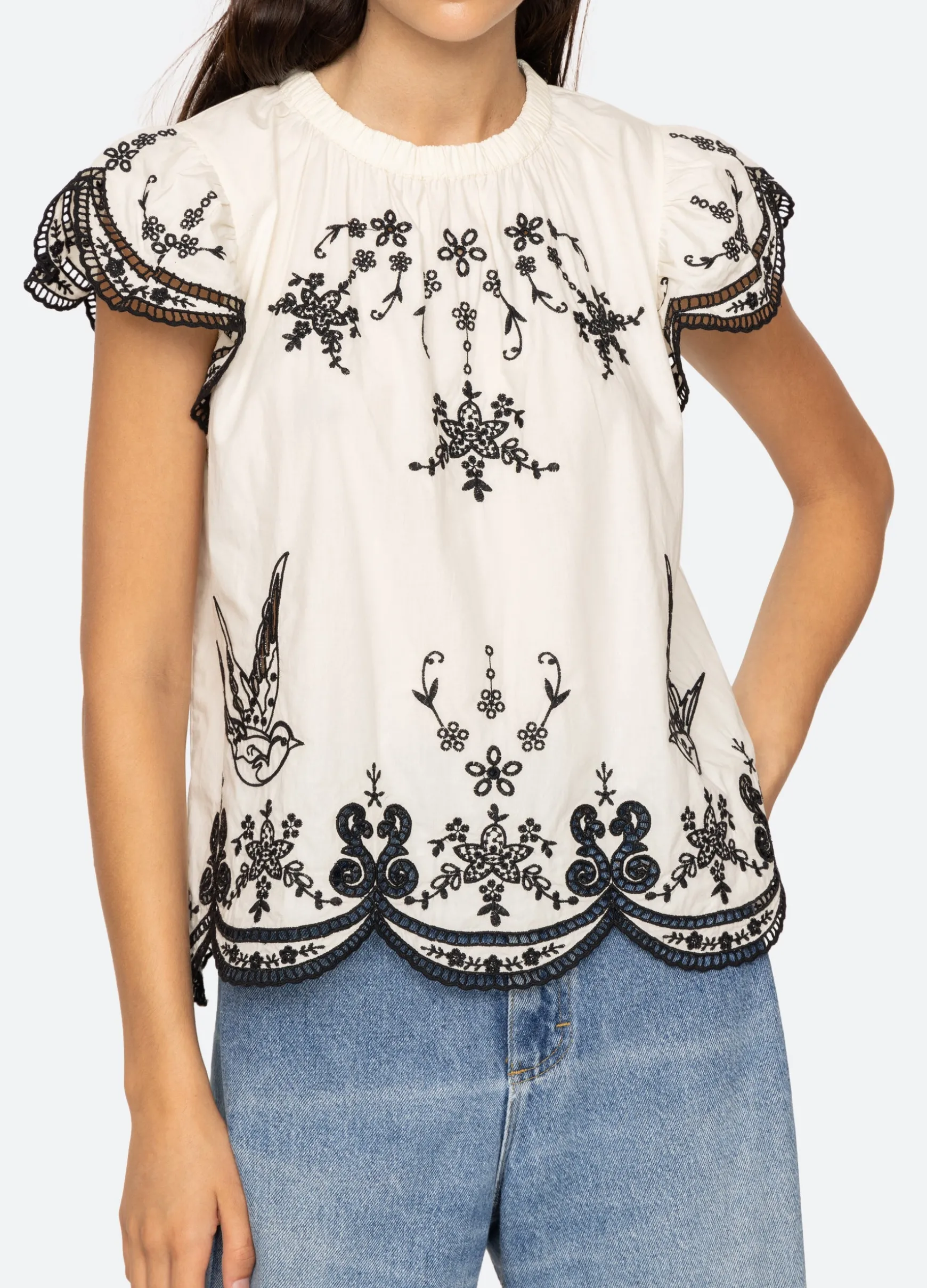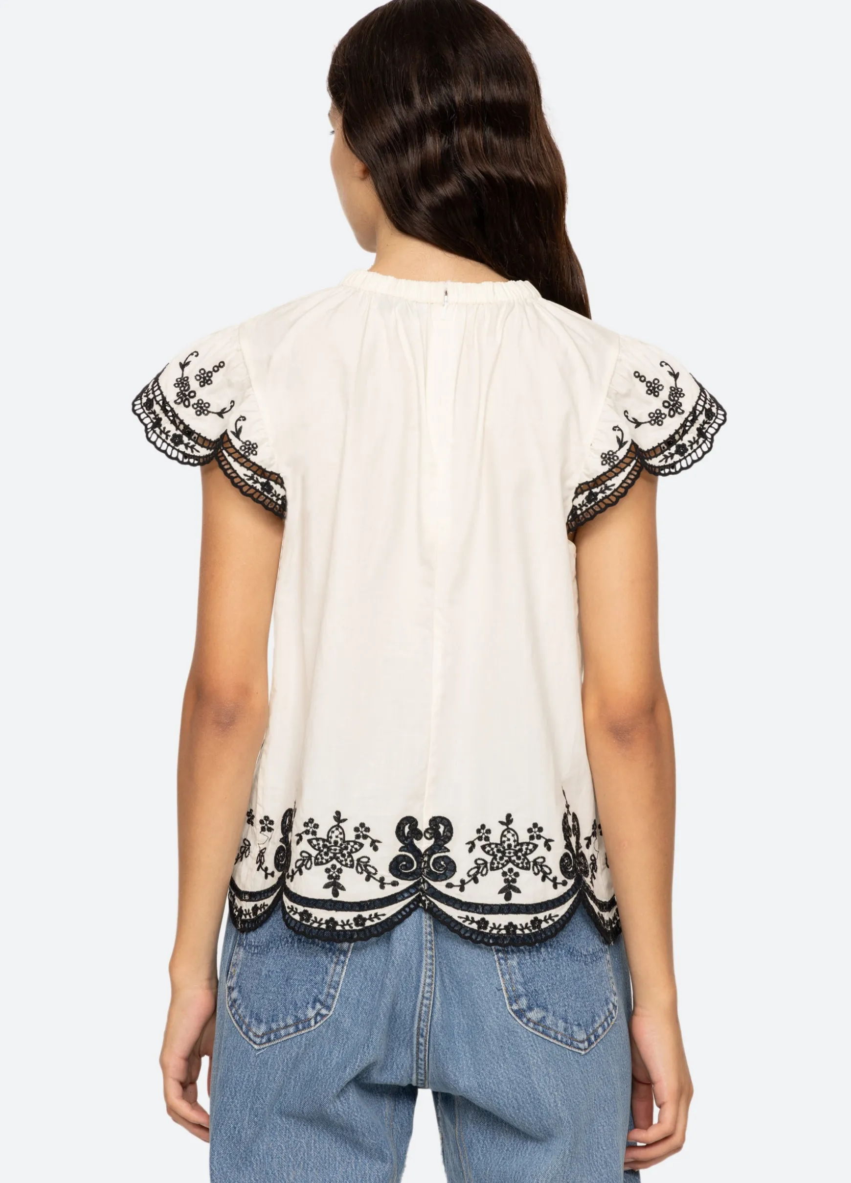 The Kingsley embroidered tank features flutter sleeves, scalloped hem and embroidered detailing throughout.