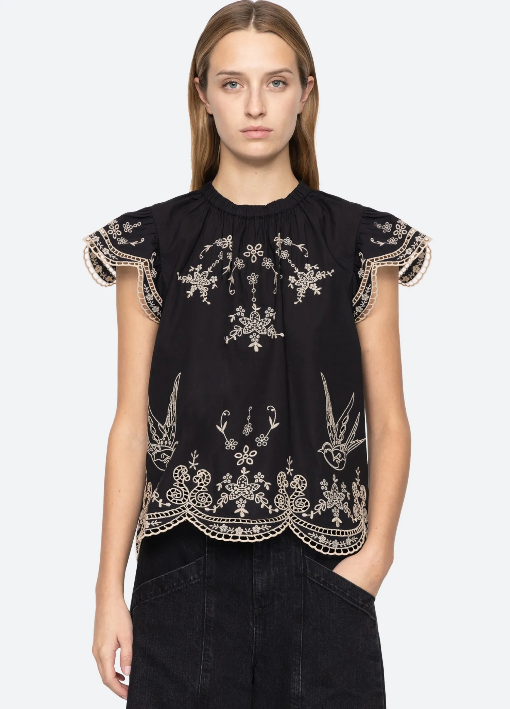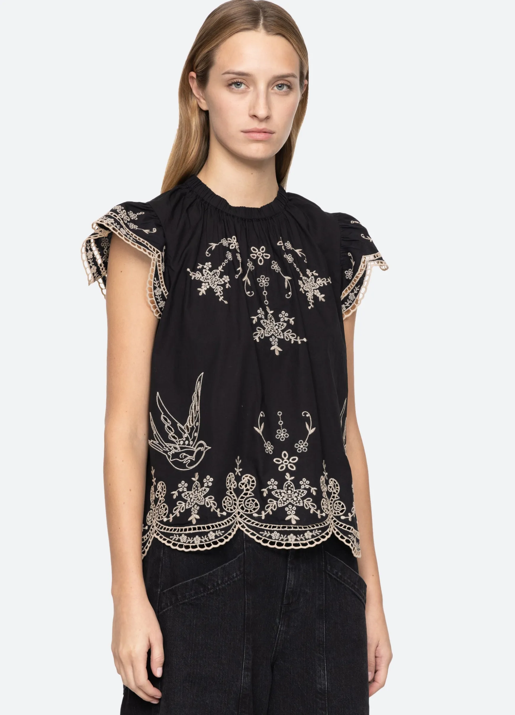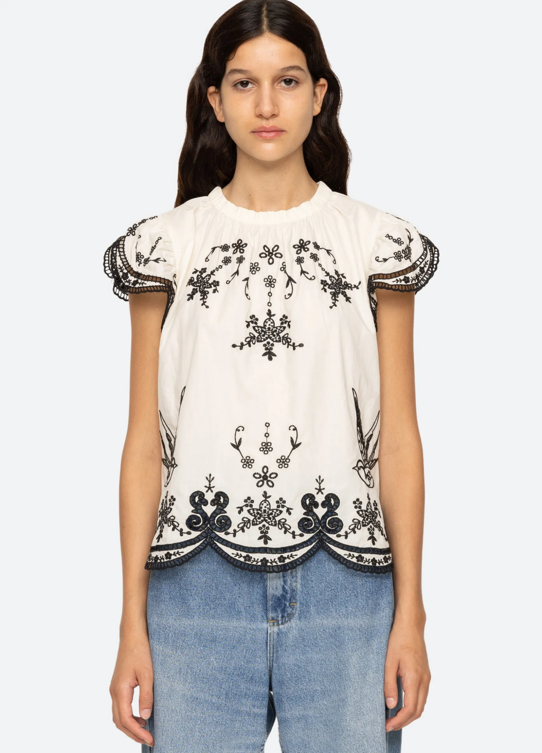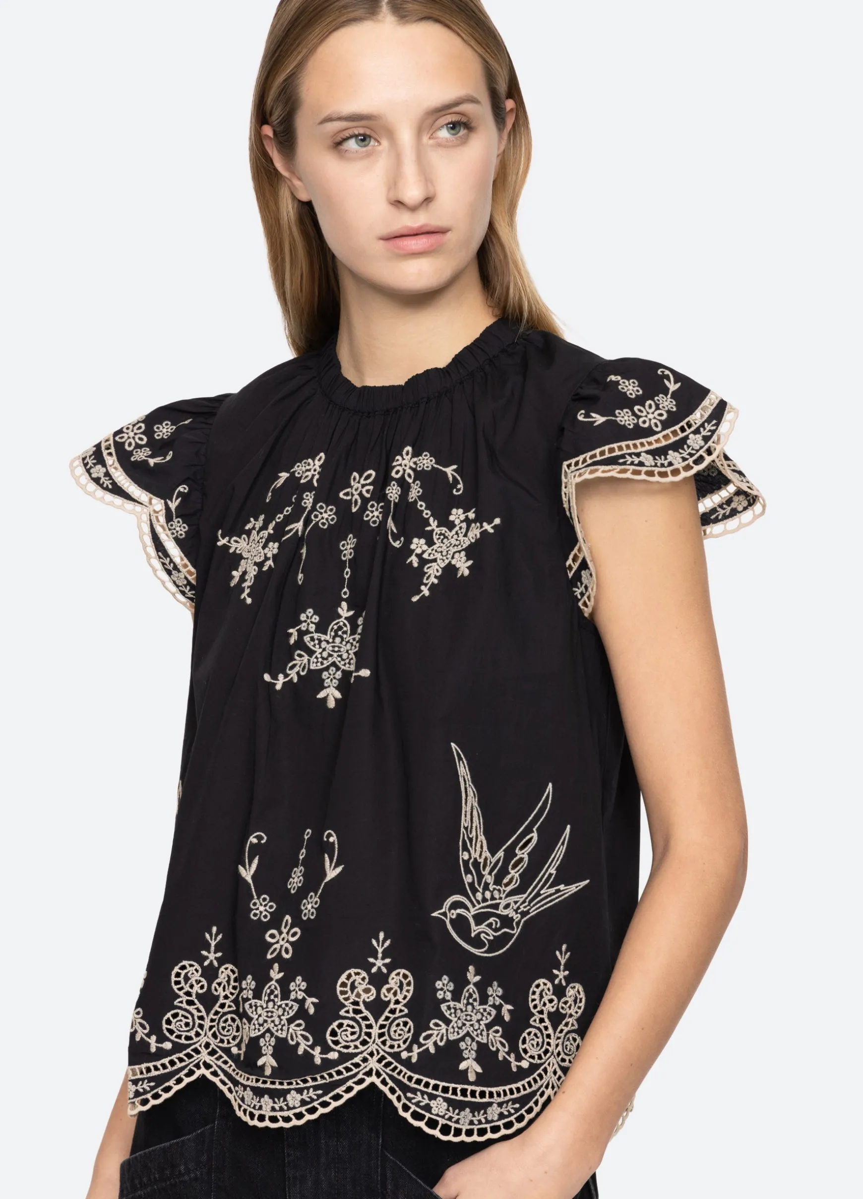 The Kingsley embroidered tank features flutter sleeves, scalloped hem and embroidered detailing throughout.