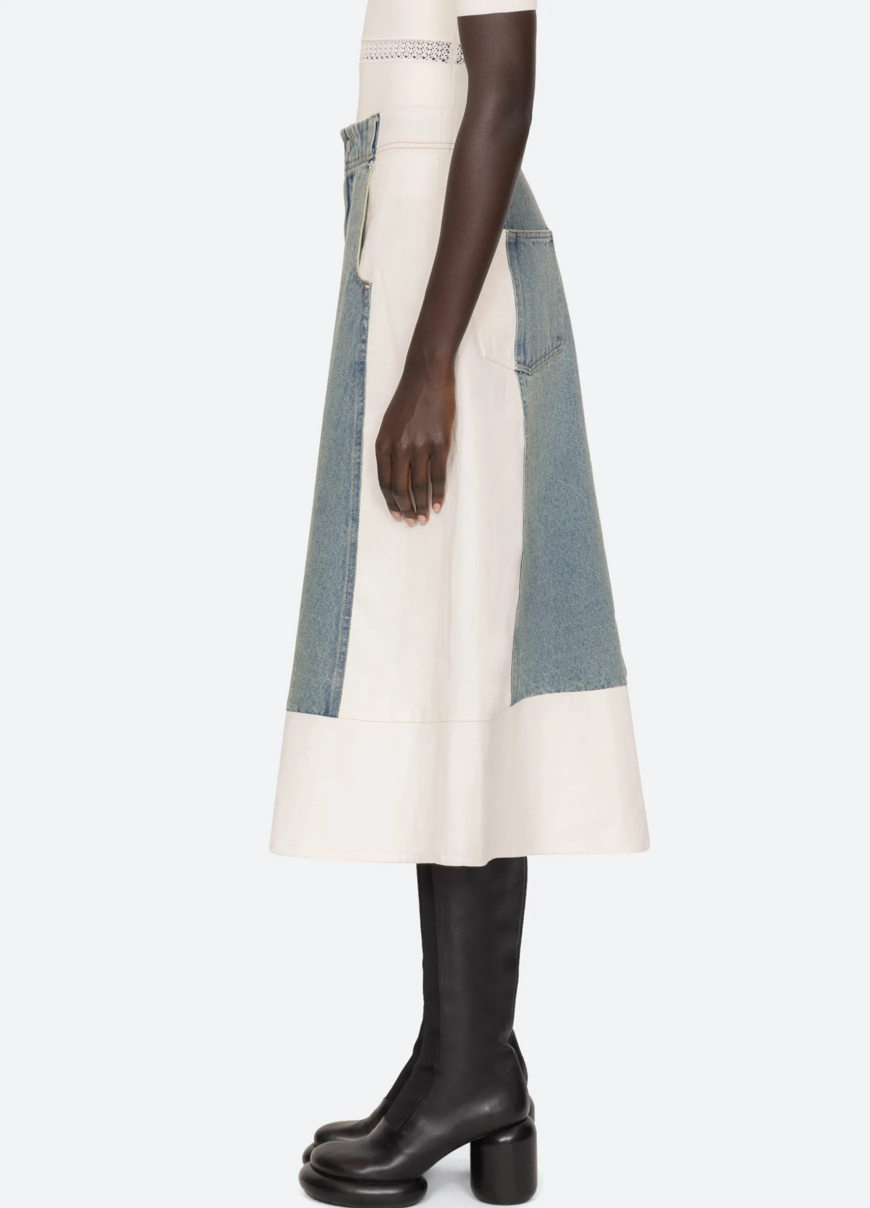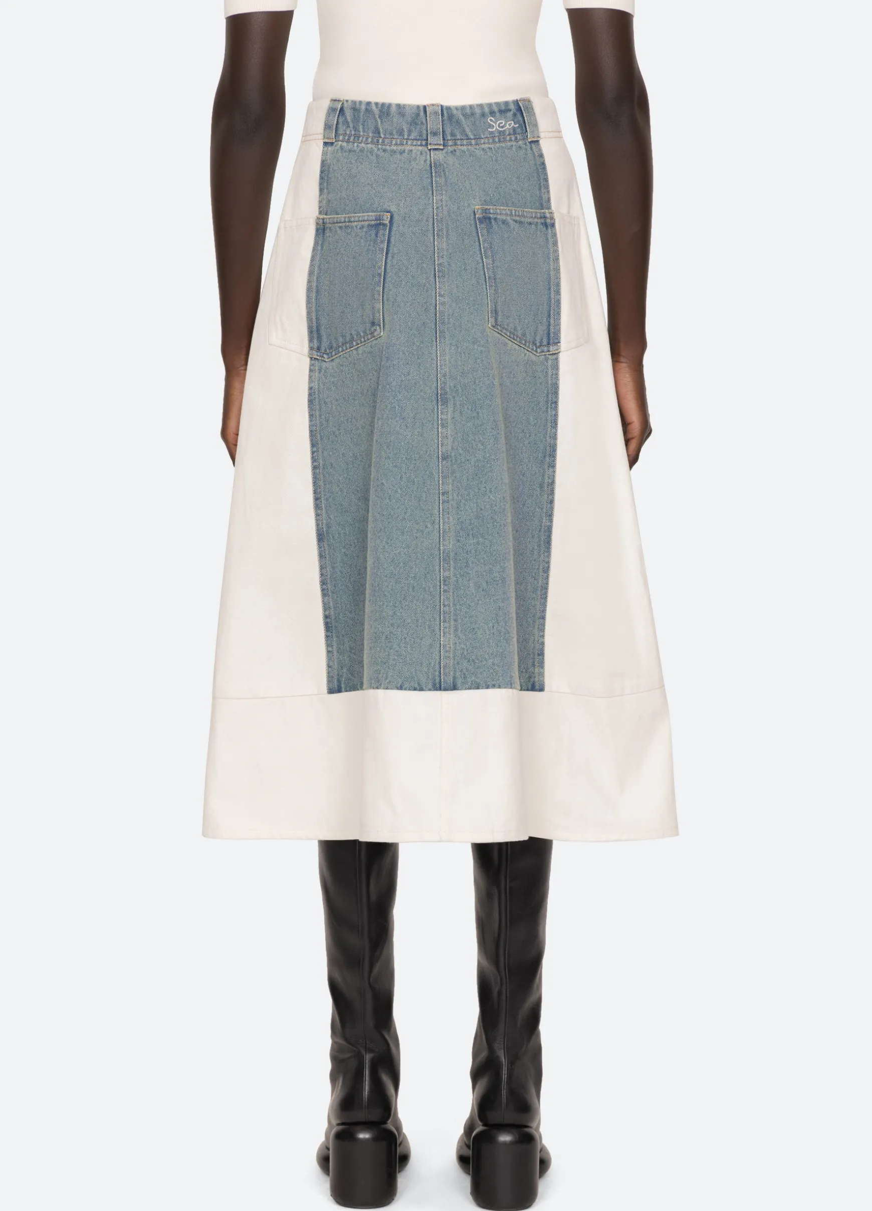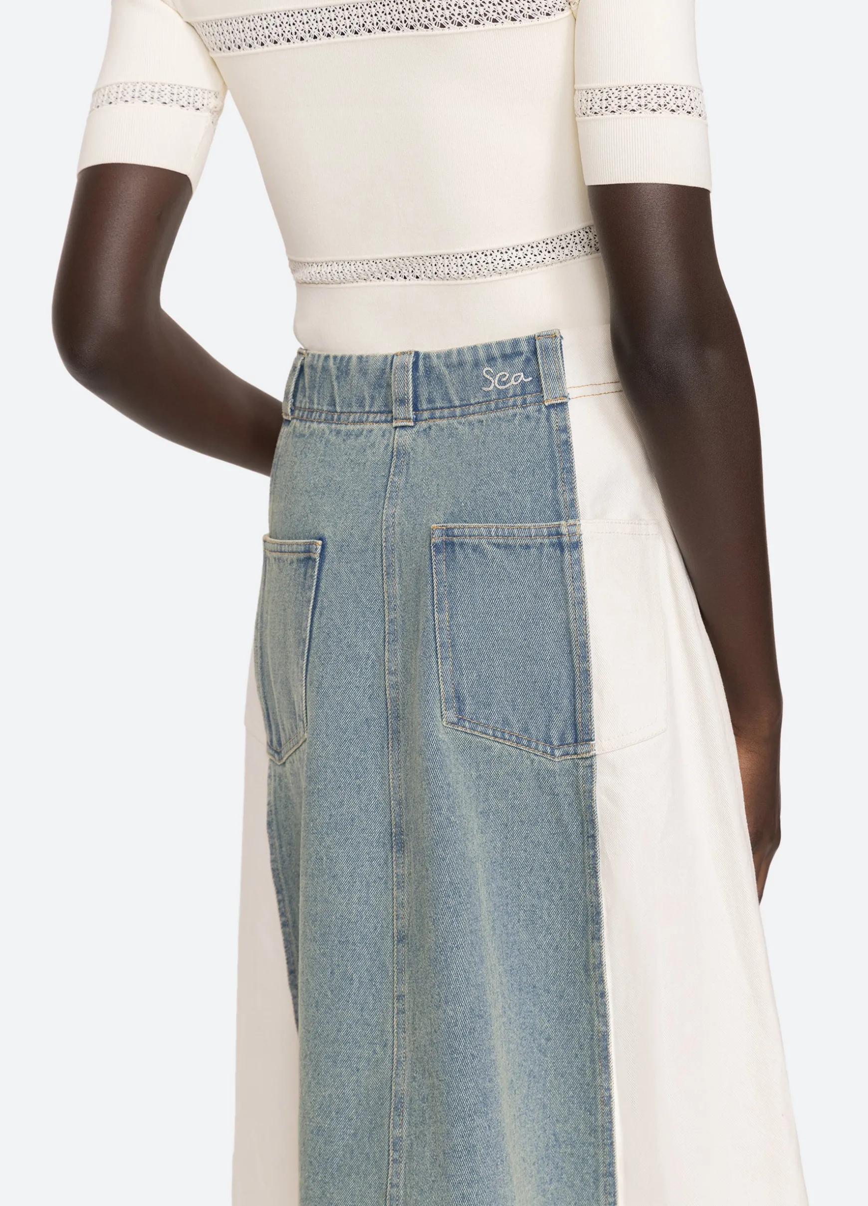 The Liam pieced denim skirt features contrasting two tone denim and embroidered ‘Sea’ logo.