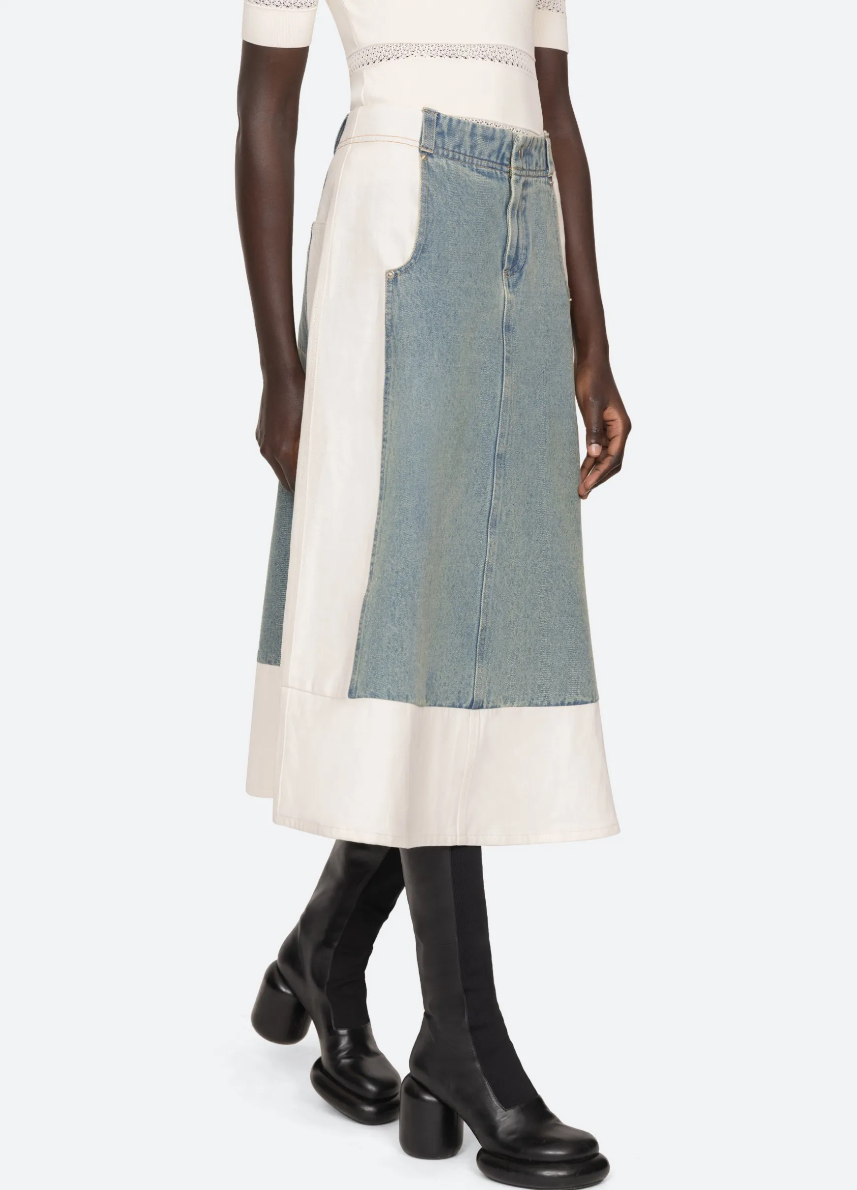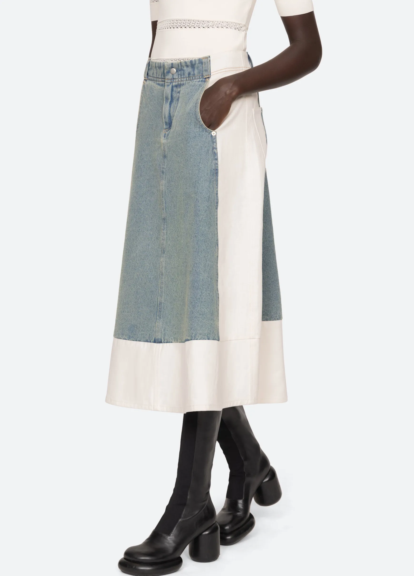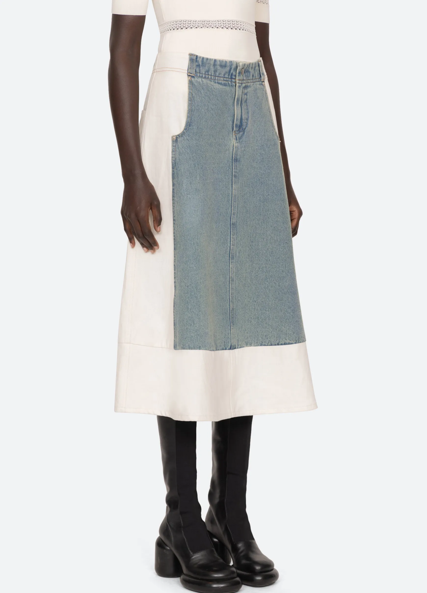 The Liam pieced denim skirt features contrasting two tone denim and embroidered ‘Sea’ logo.