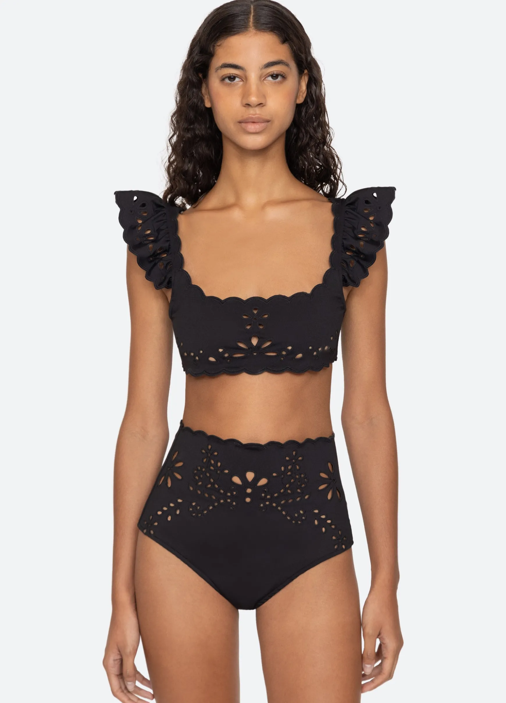 The Liat eyelet bikini bottom featuresa high waisted silhouetteand floral embroidered detailing.