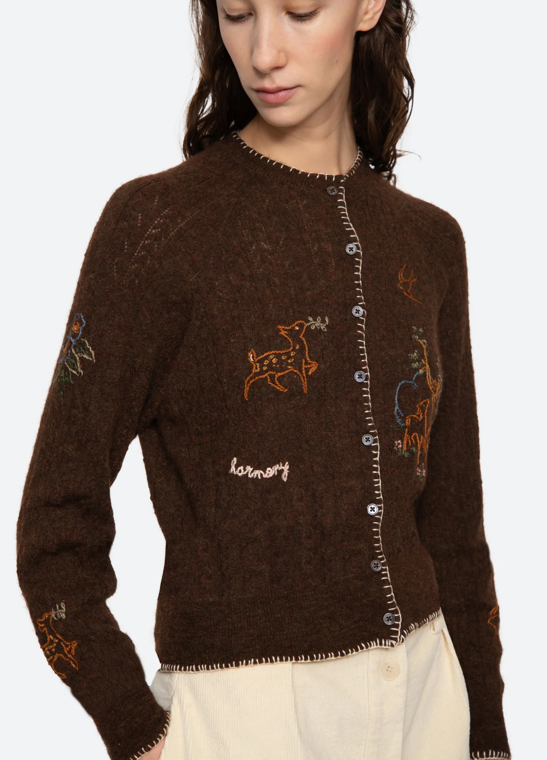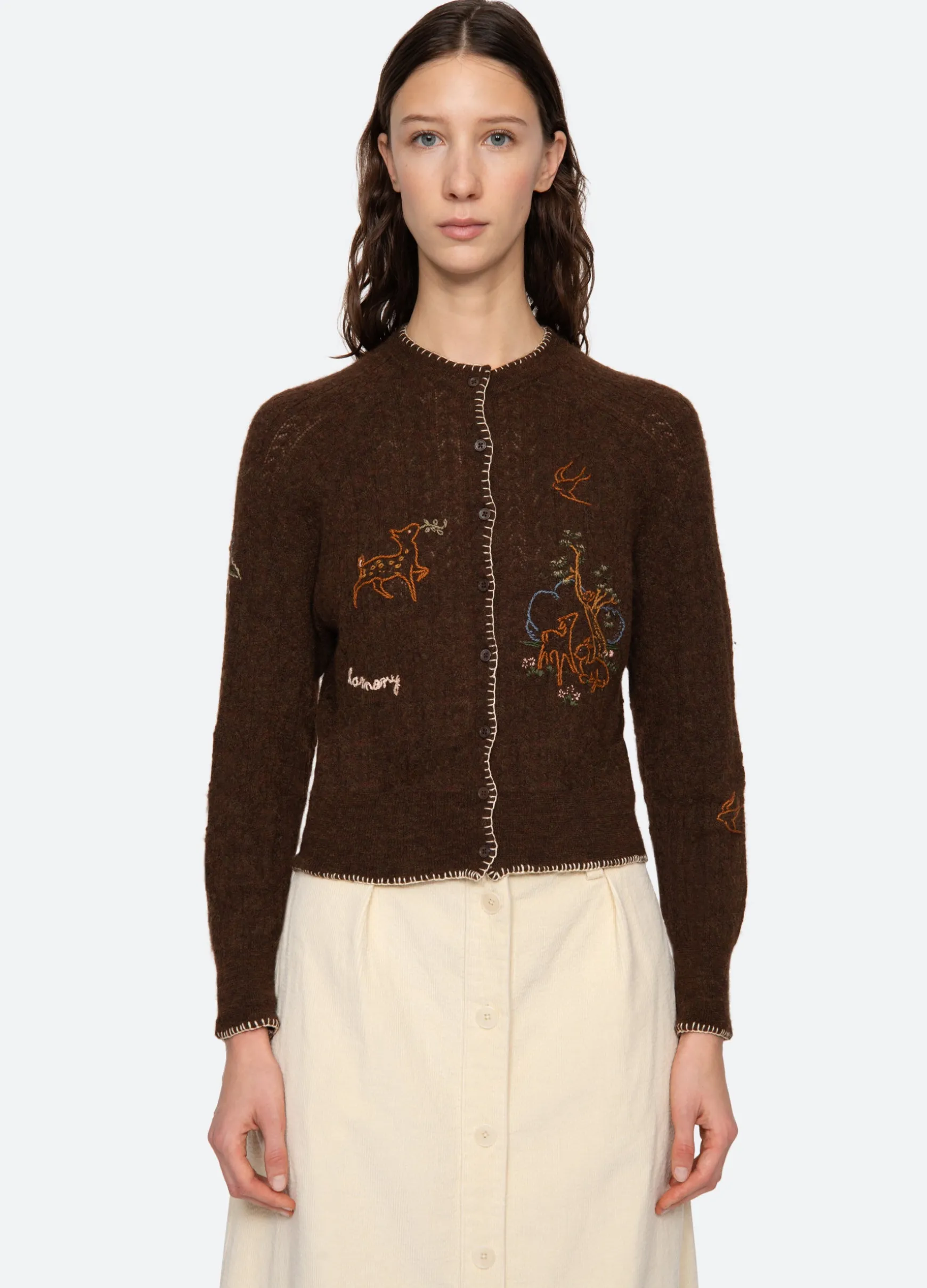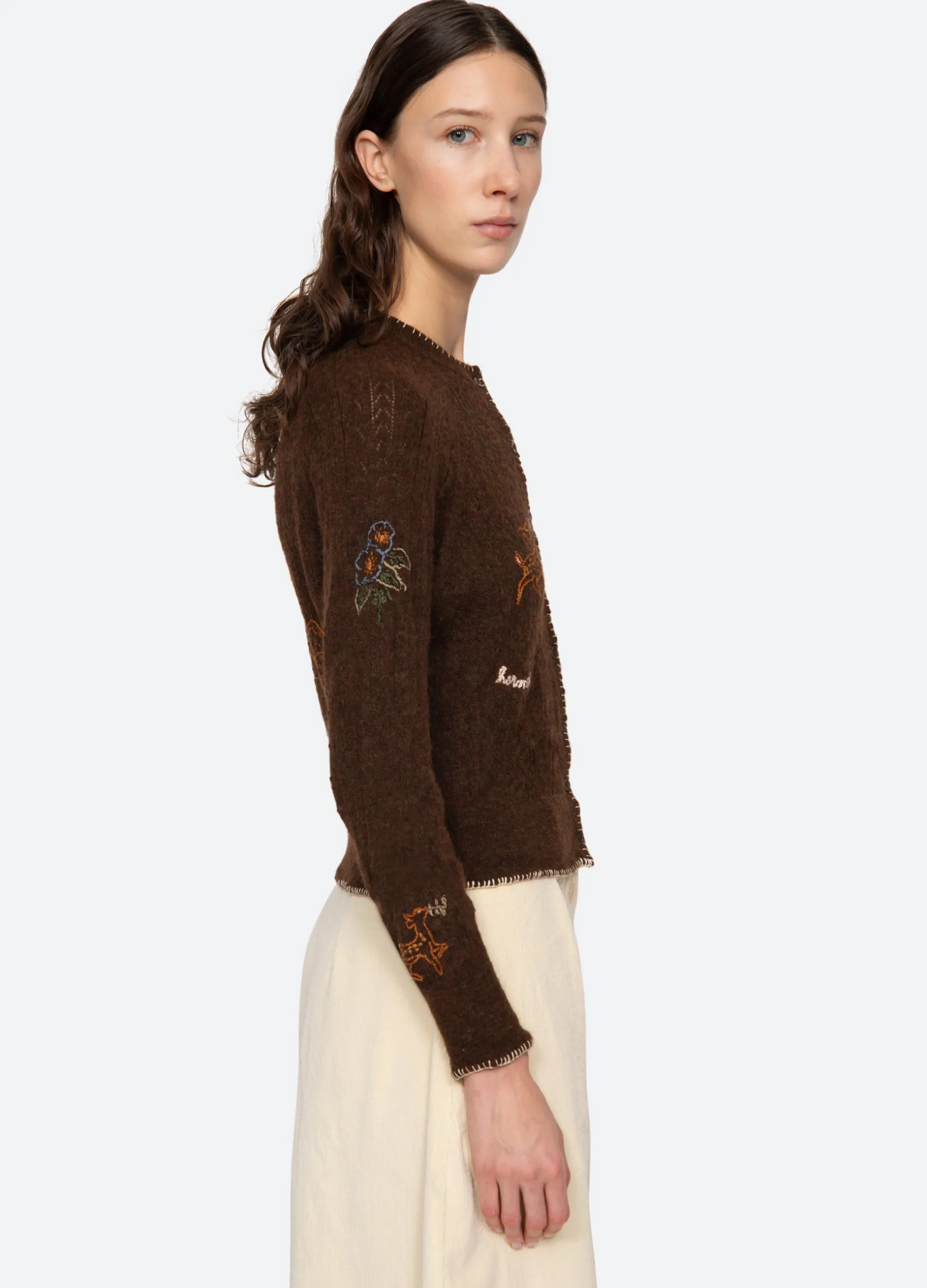 The Martha embroidered cardigan features colorful embroidery that includes florals and animals throughout.