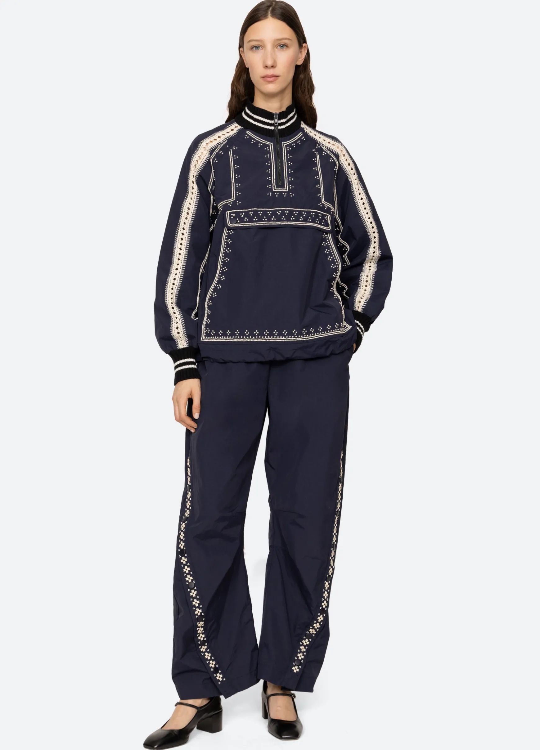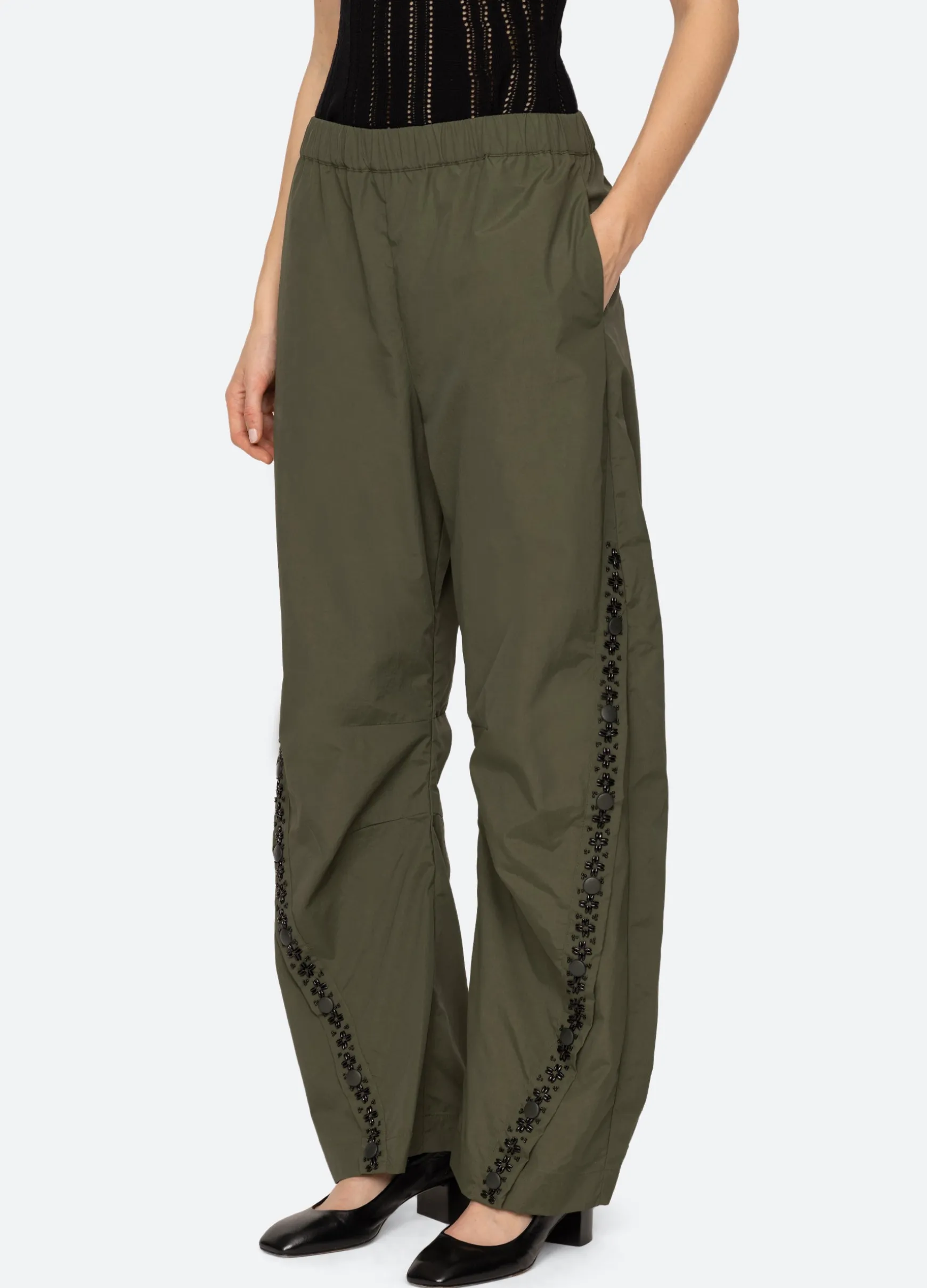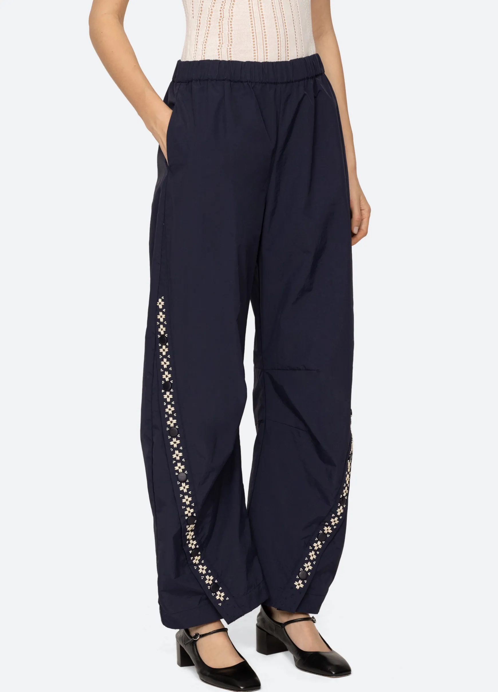 The Mille windbreaker pant features beading, french knot embroidery and an elasticized waist.