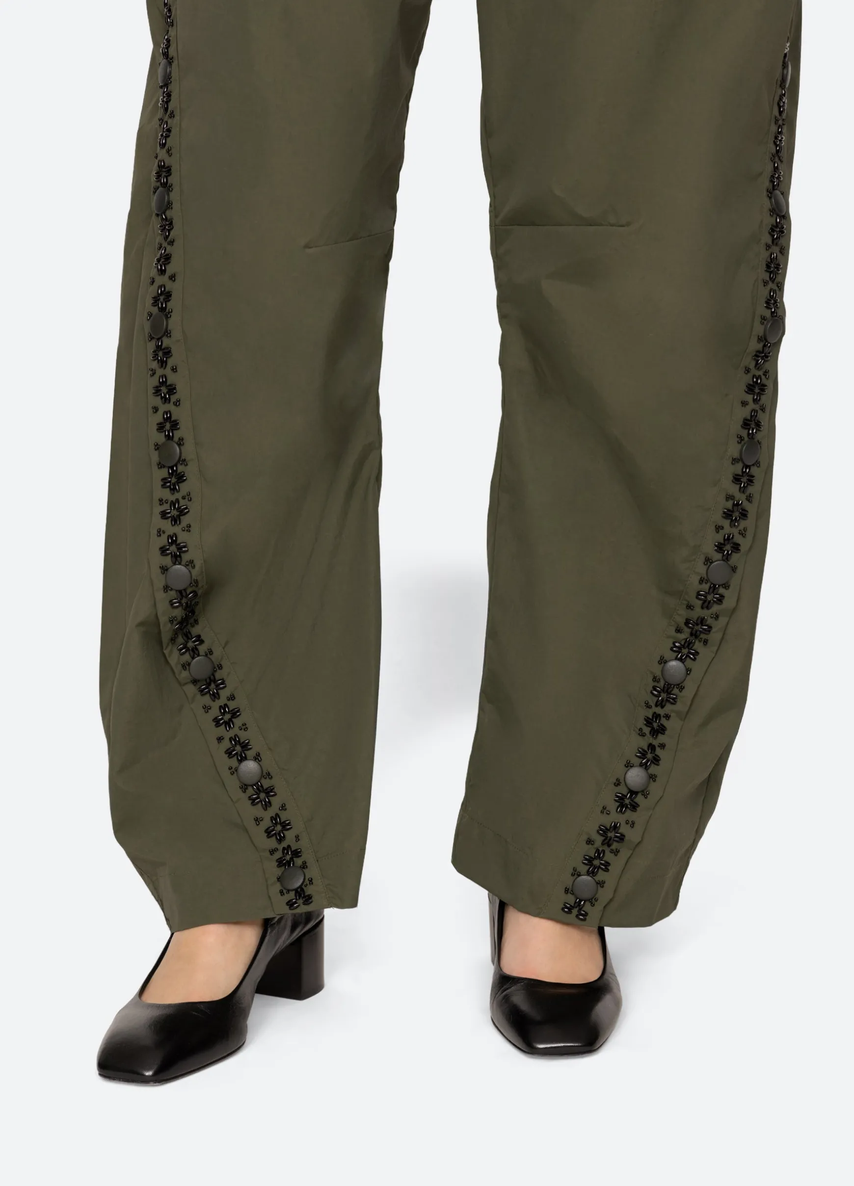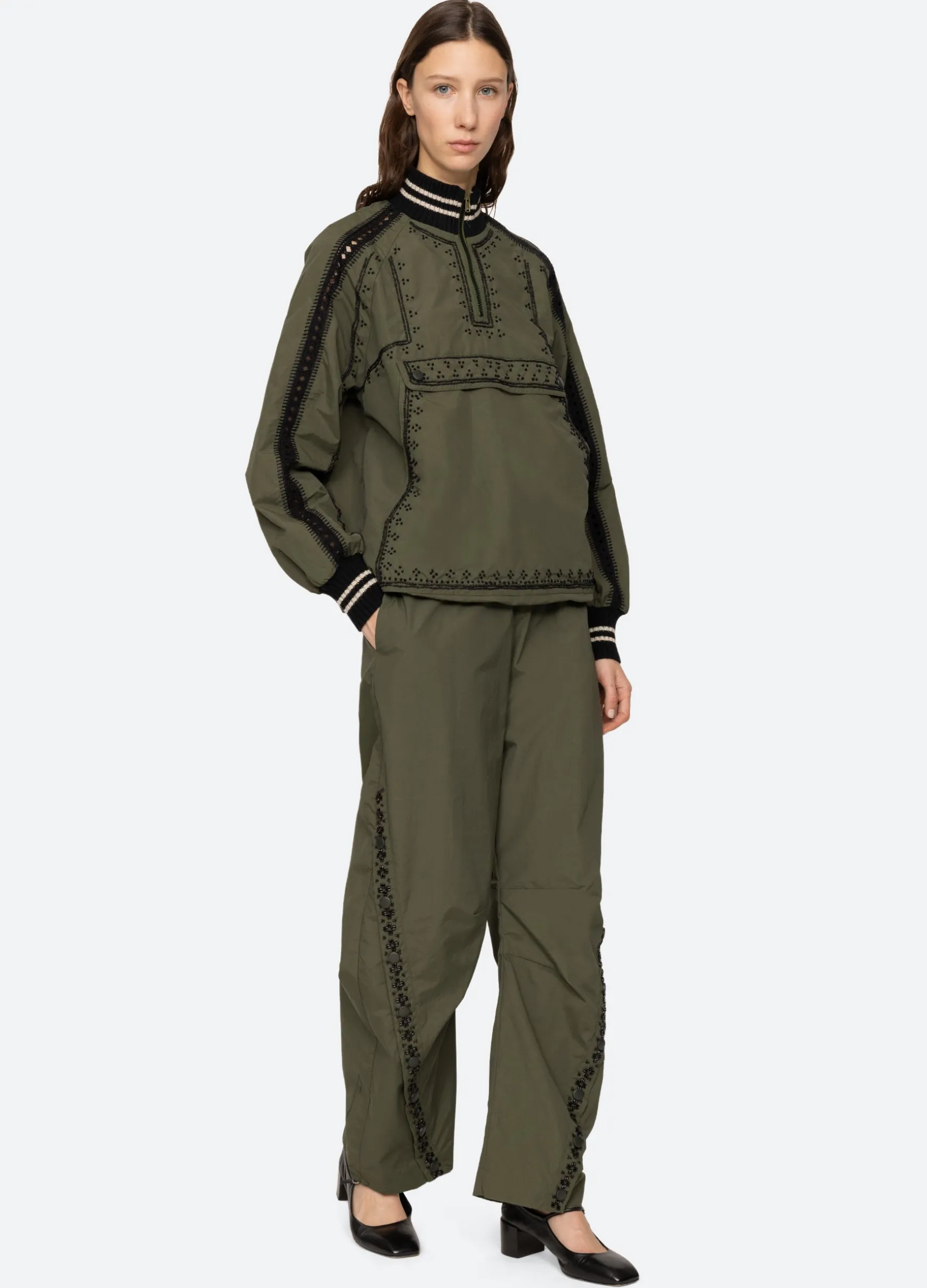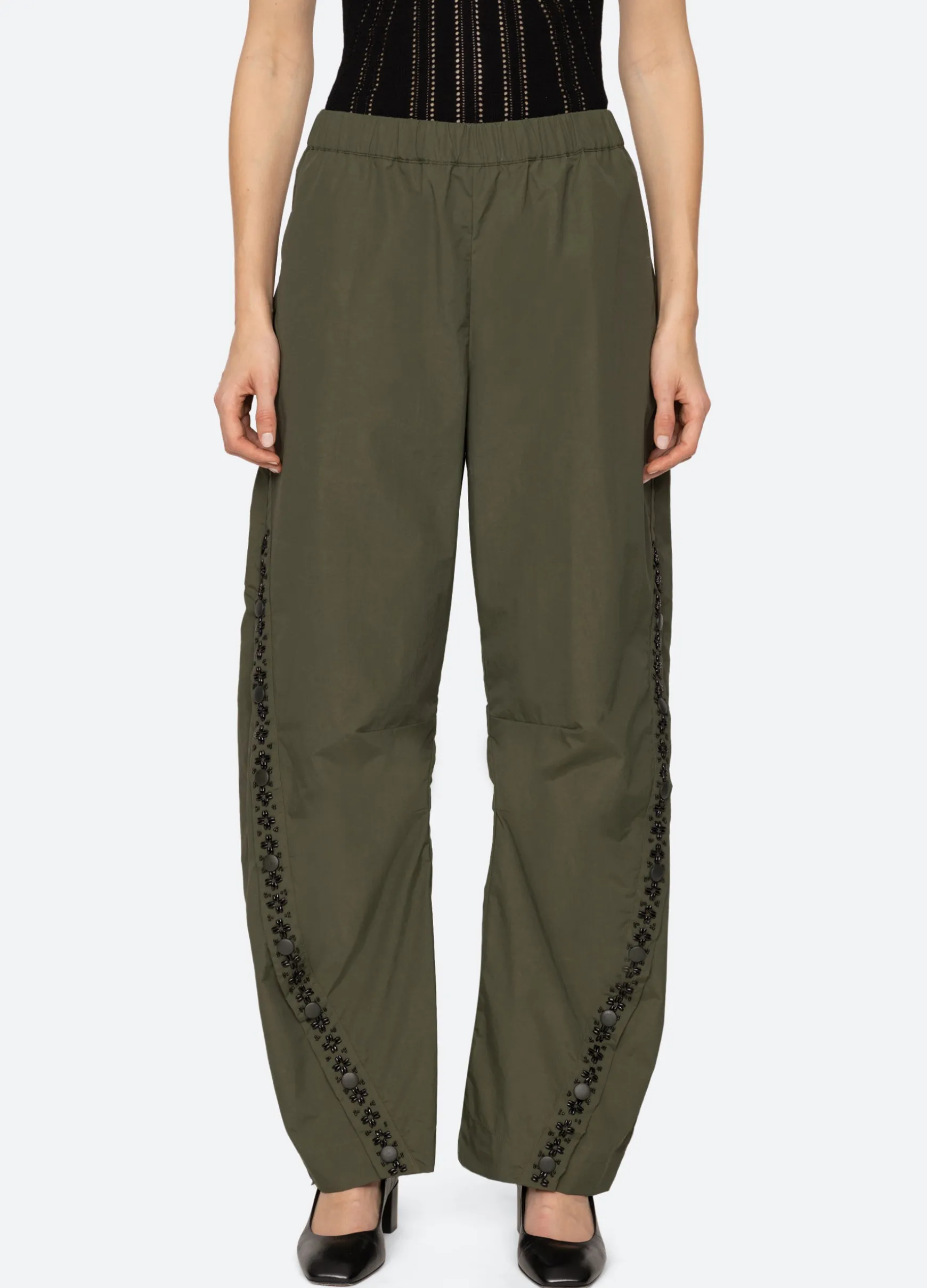 The Mille windbreaker pant features beading, french knot embroidery and an elasticized waist.