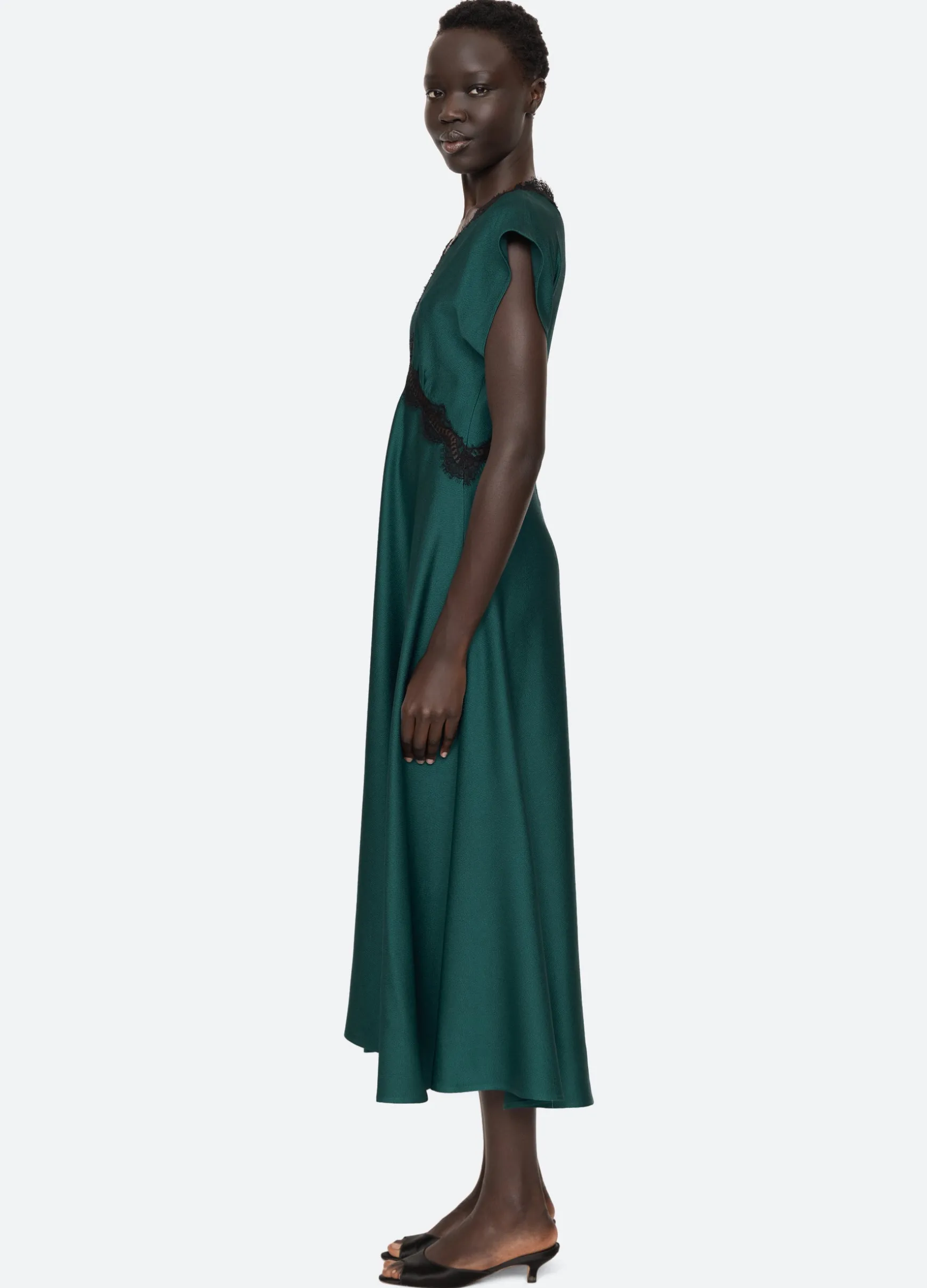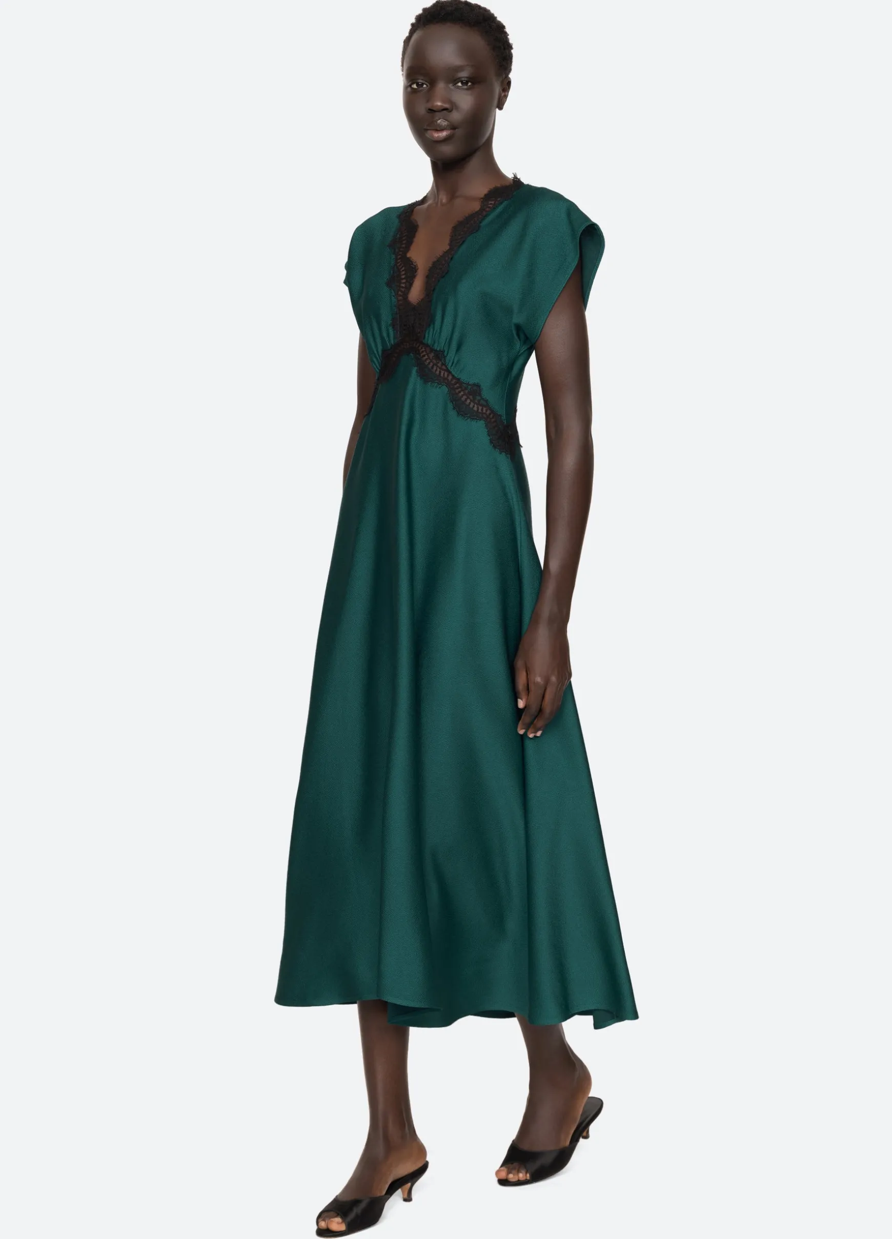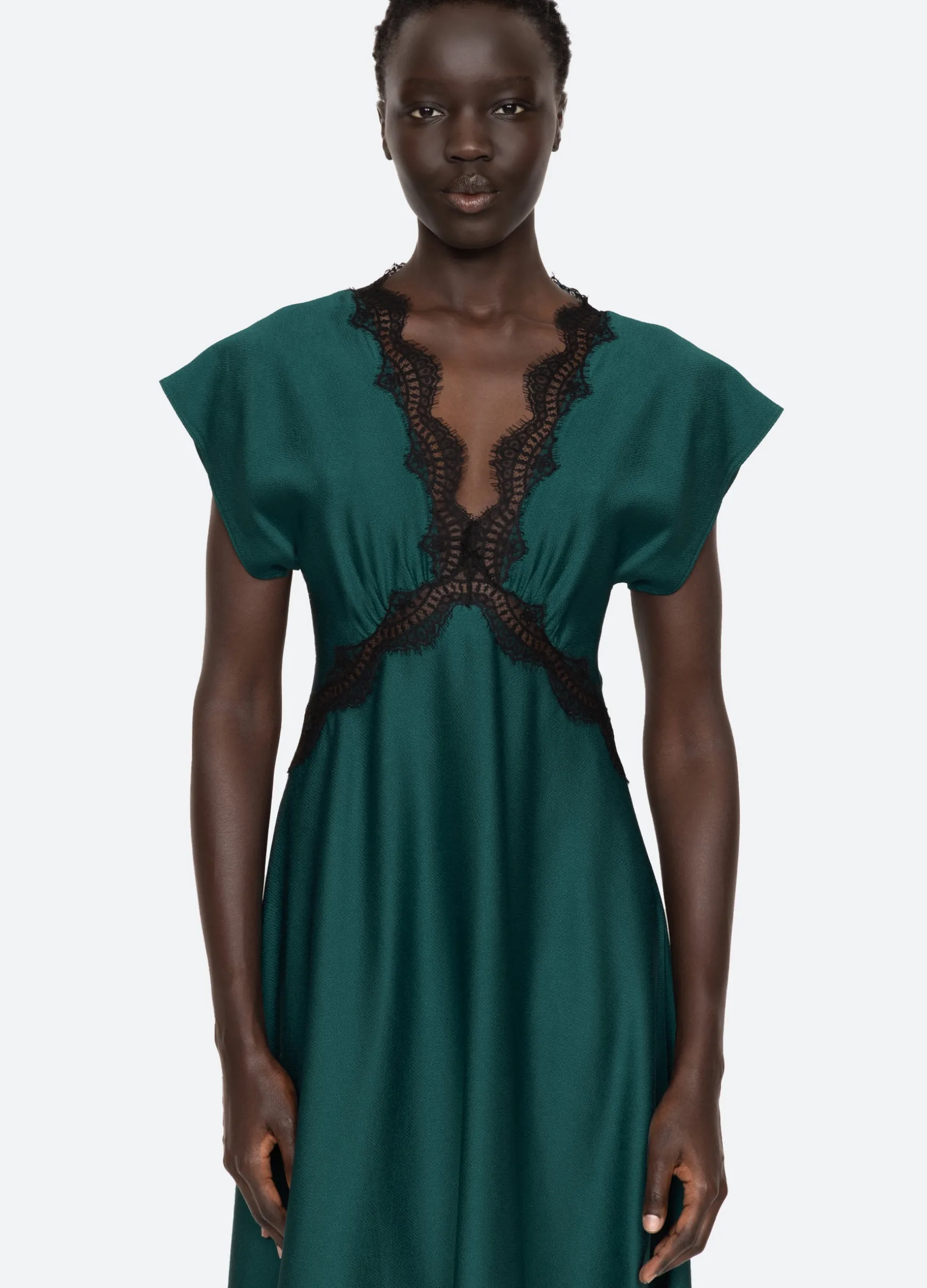 The Noa satin v-neck dress features short dolman sleeves, delicate lace trim detailing, and a midi silhouette.