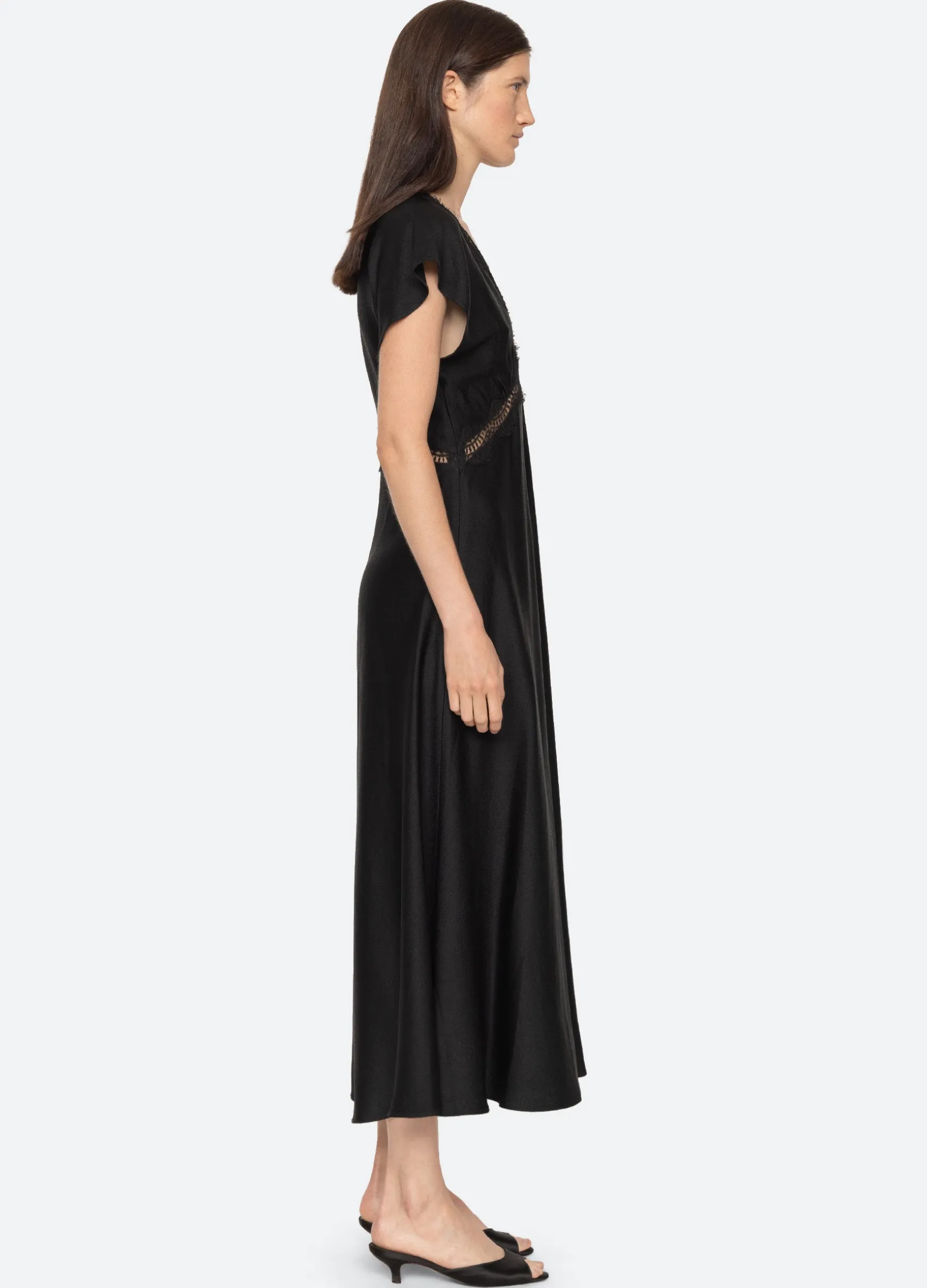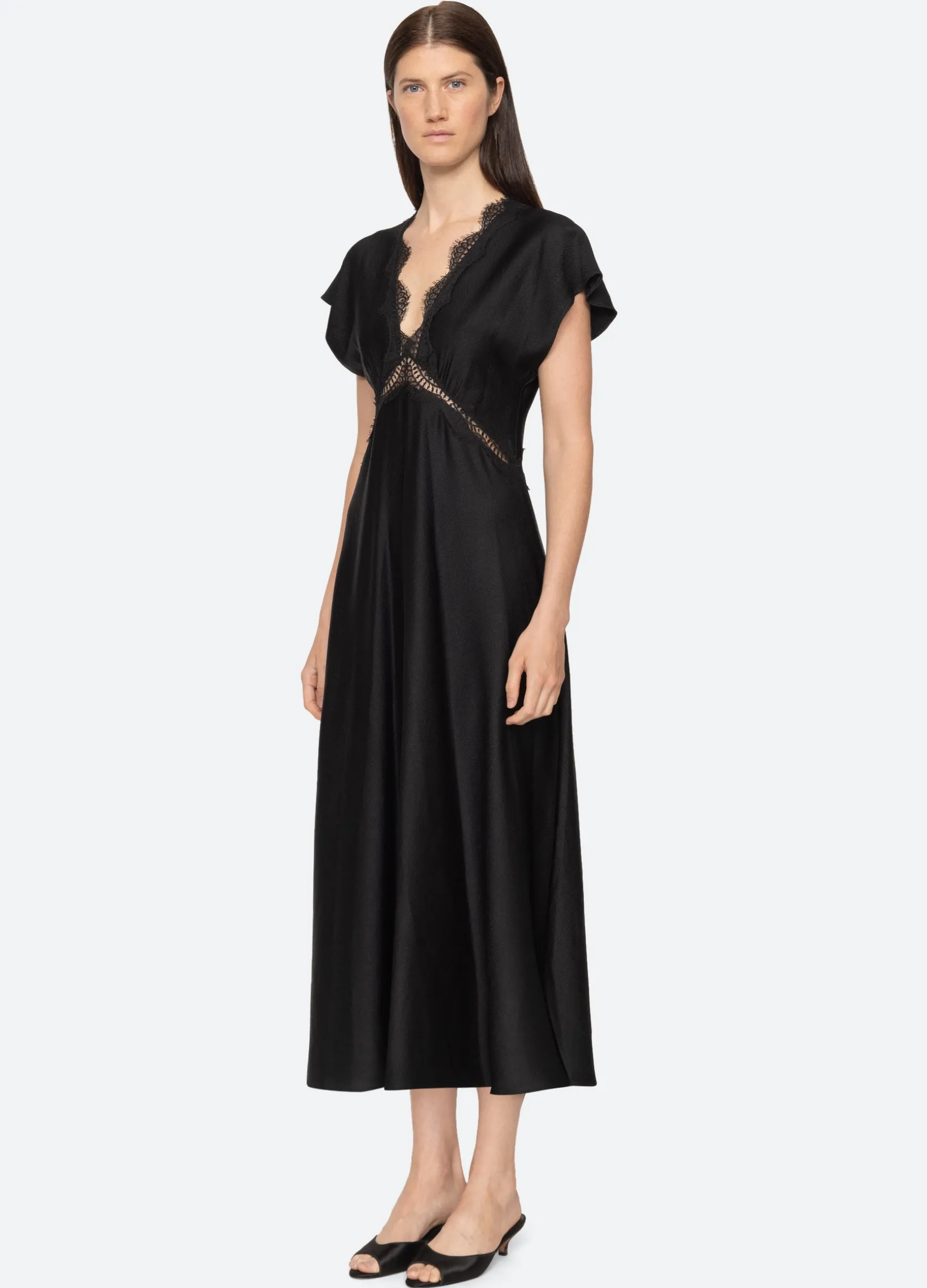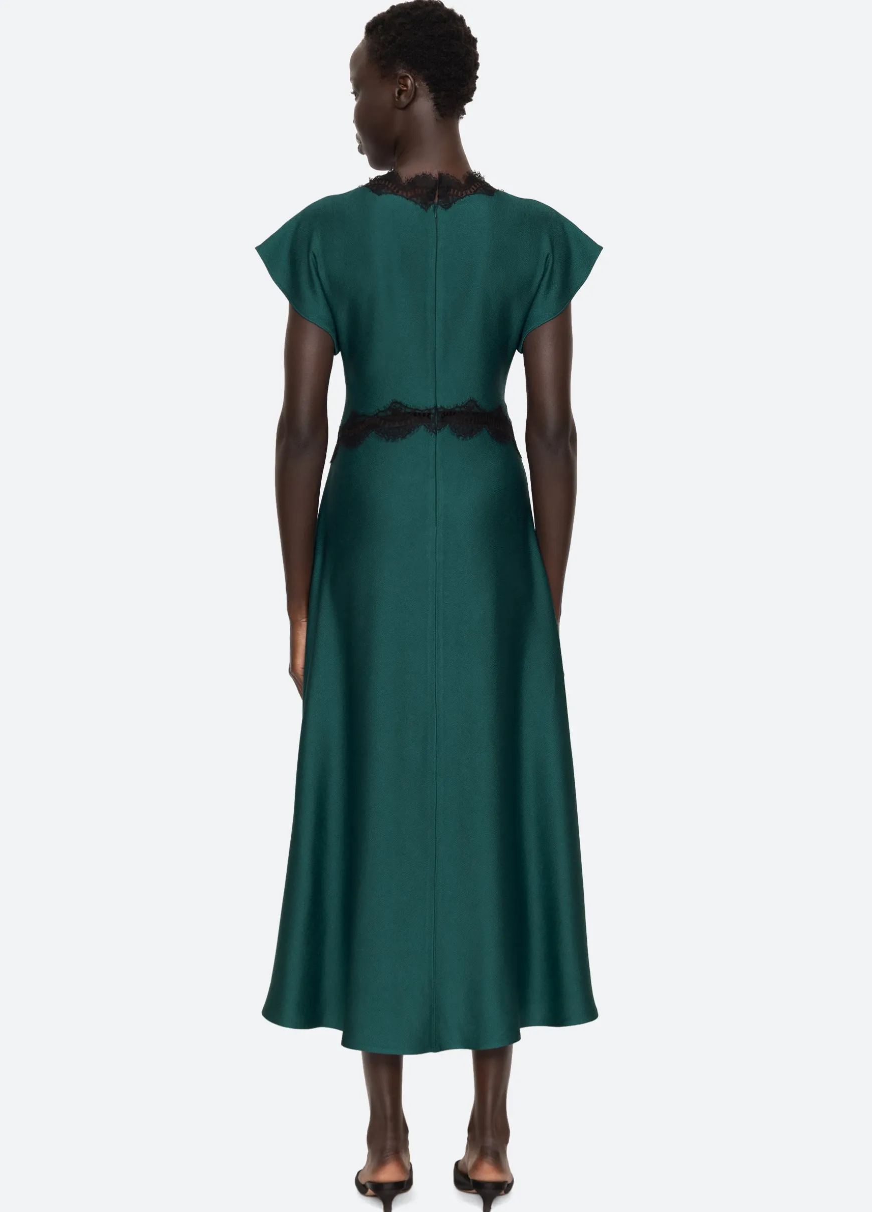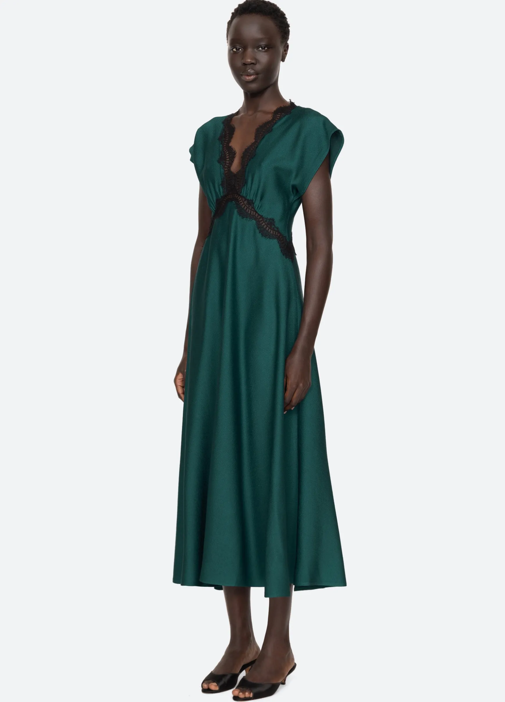 The Noa satin v-neck dress features short dolman sleeves, delicate lace trim detailing, and a midi silhouette.