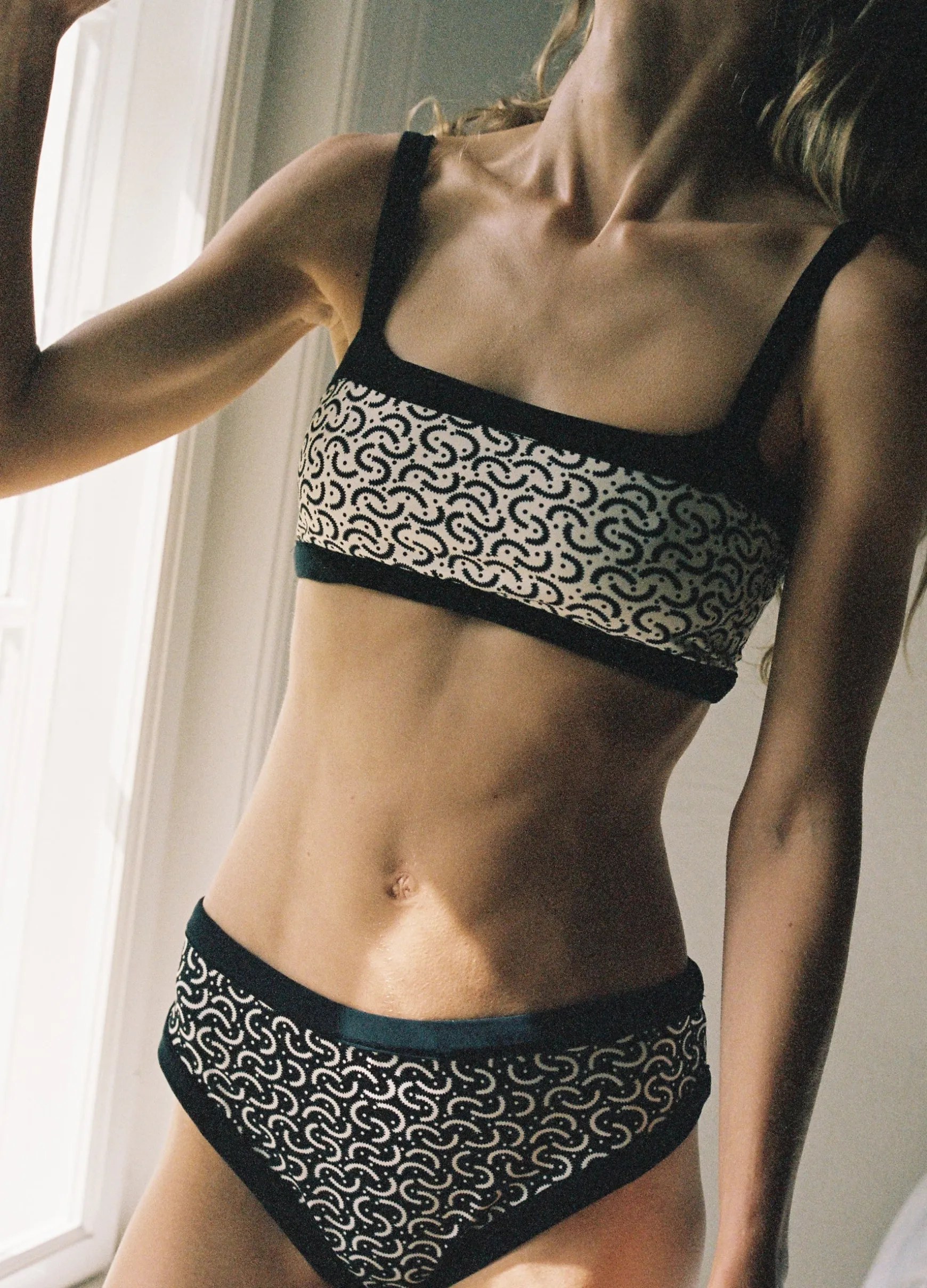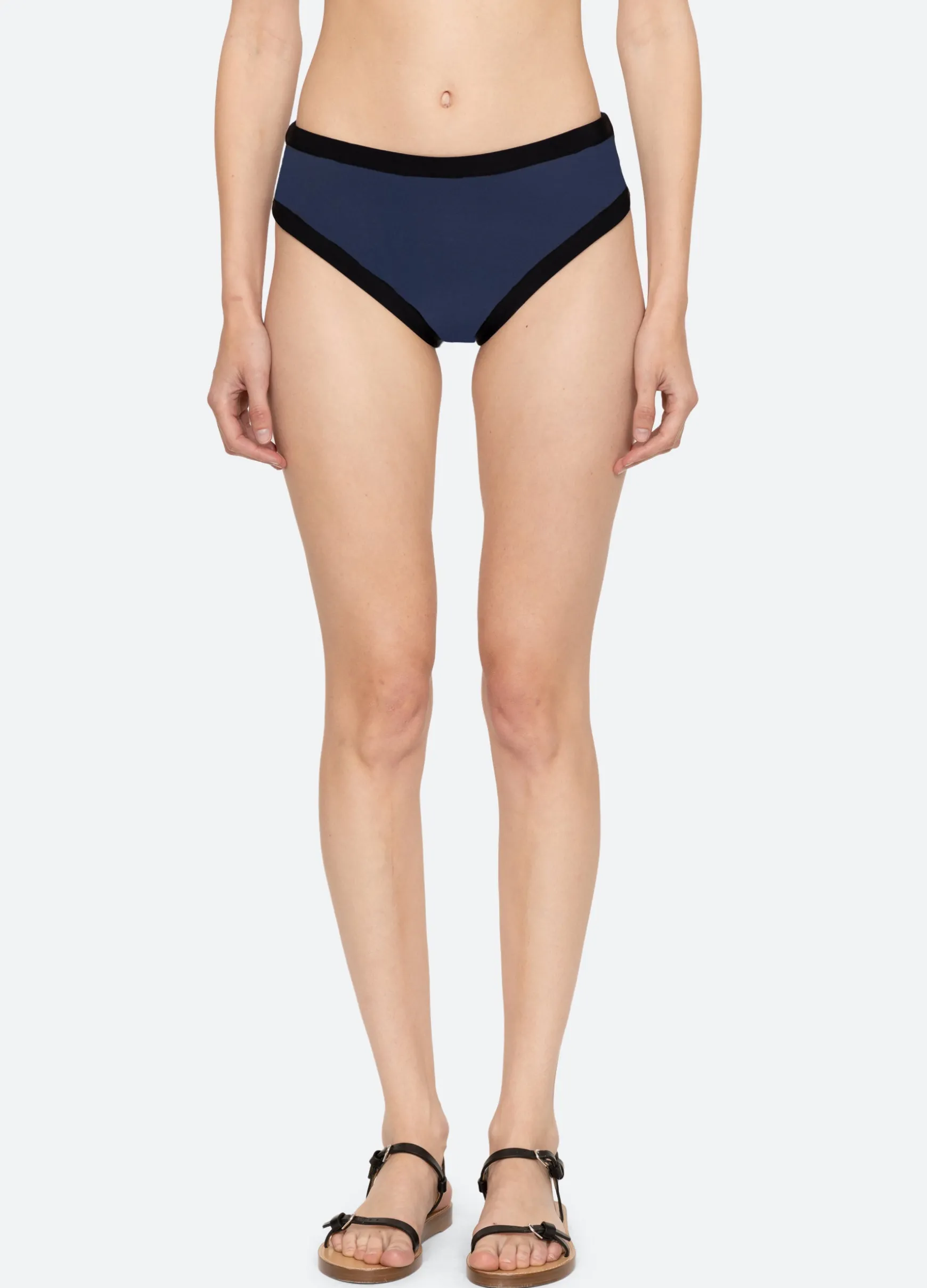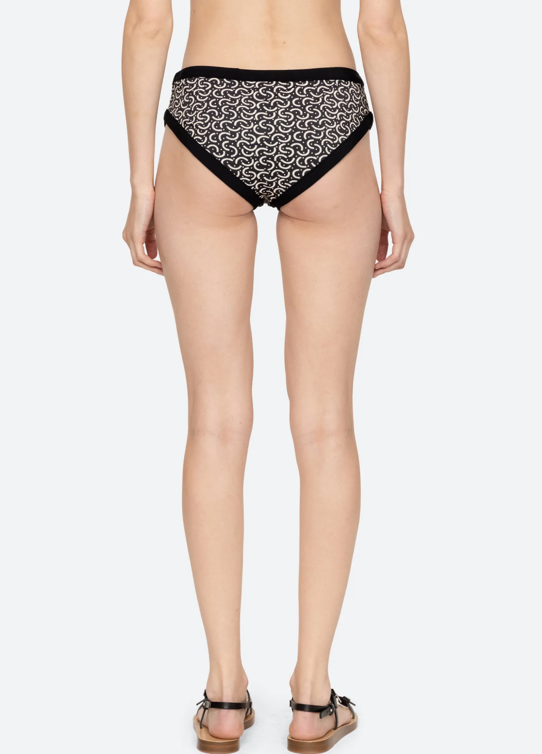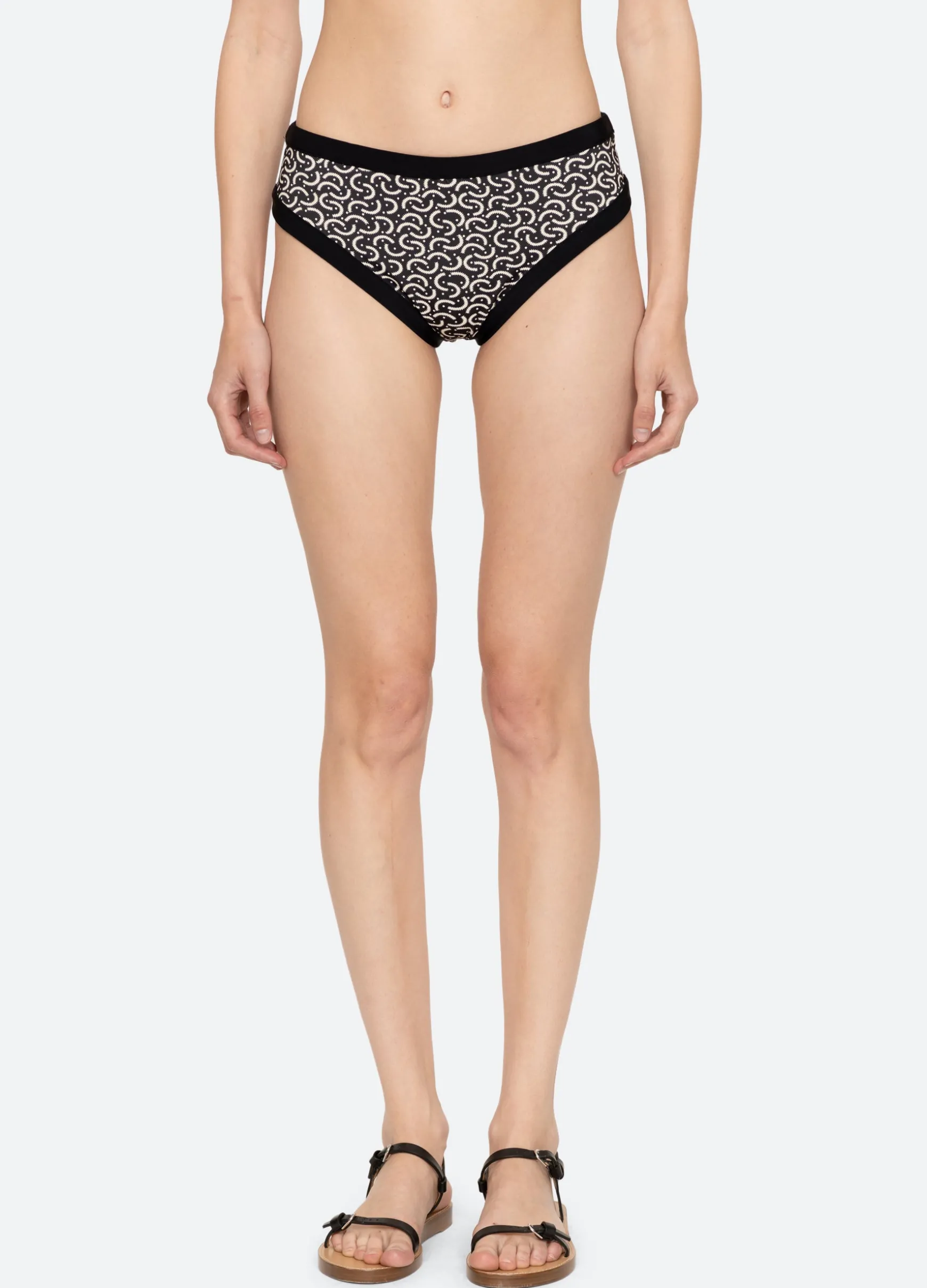 The Panna reversible bikini bottom features a contrasting border and a geometric print that reverses into a solid.