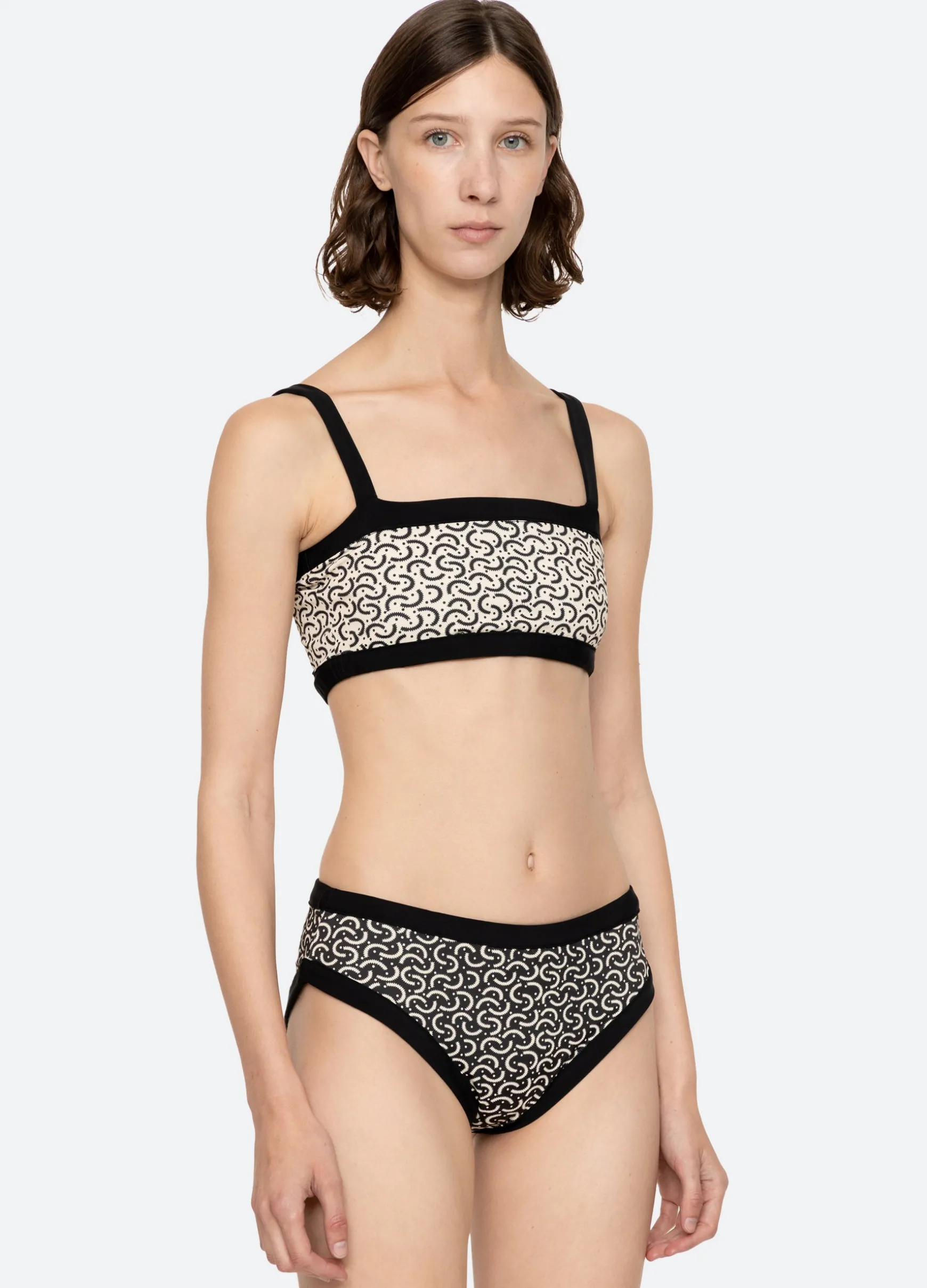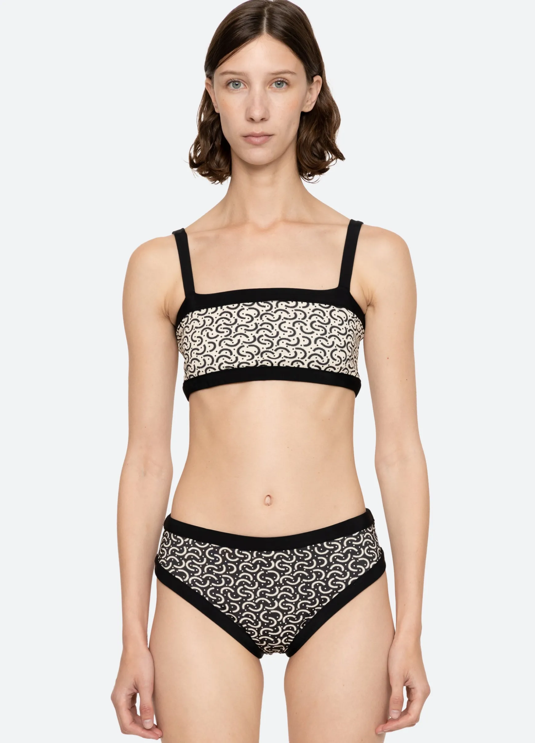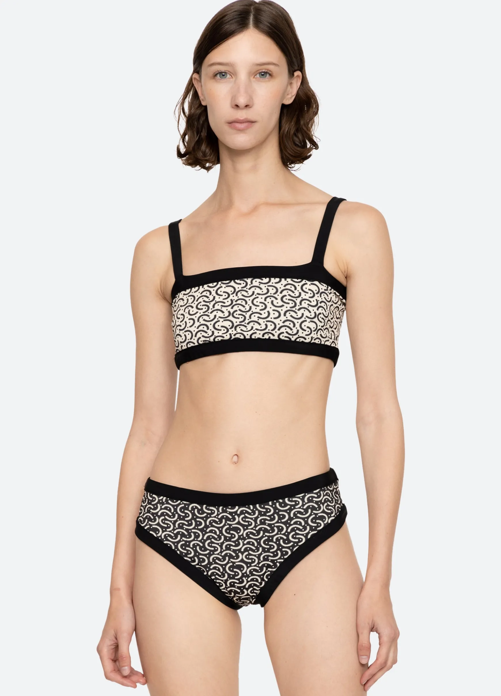 The Panna reversible bikini top features a contrasting border and a geometric print that reverses into a solid.